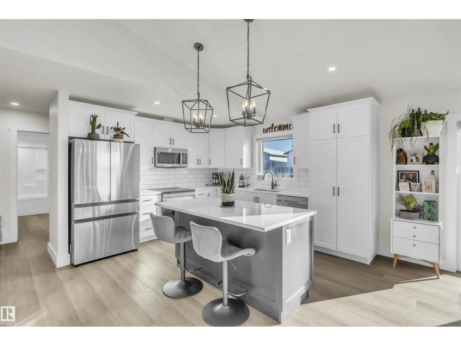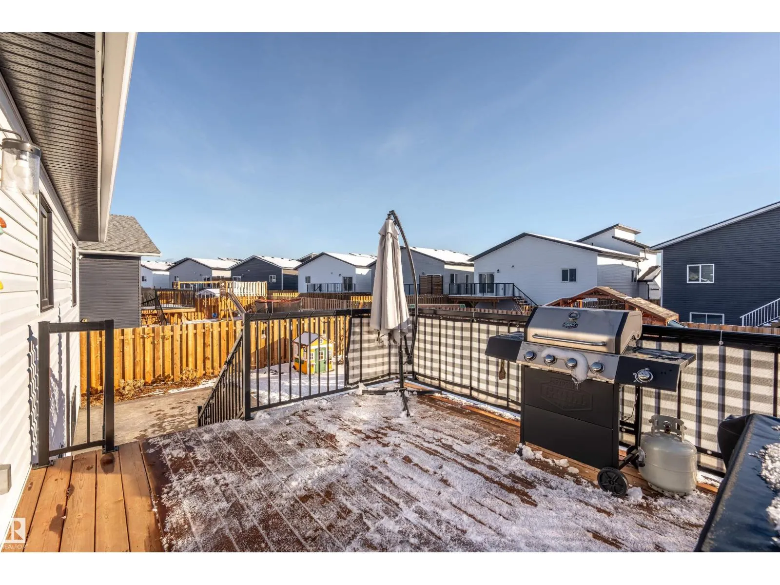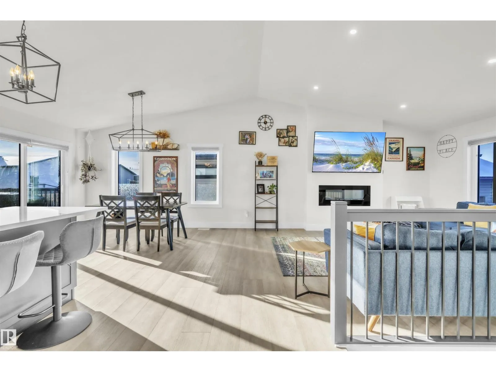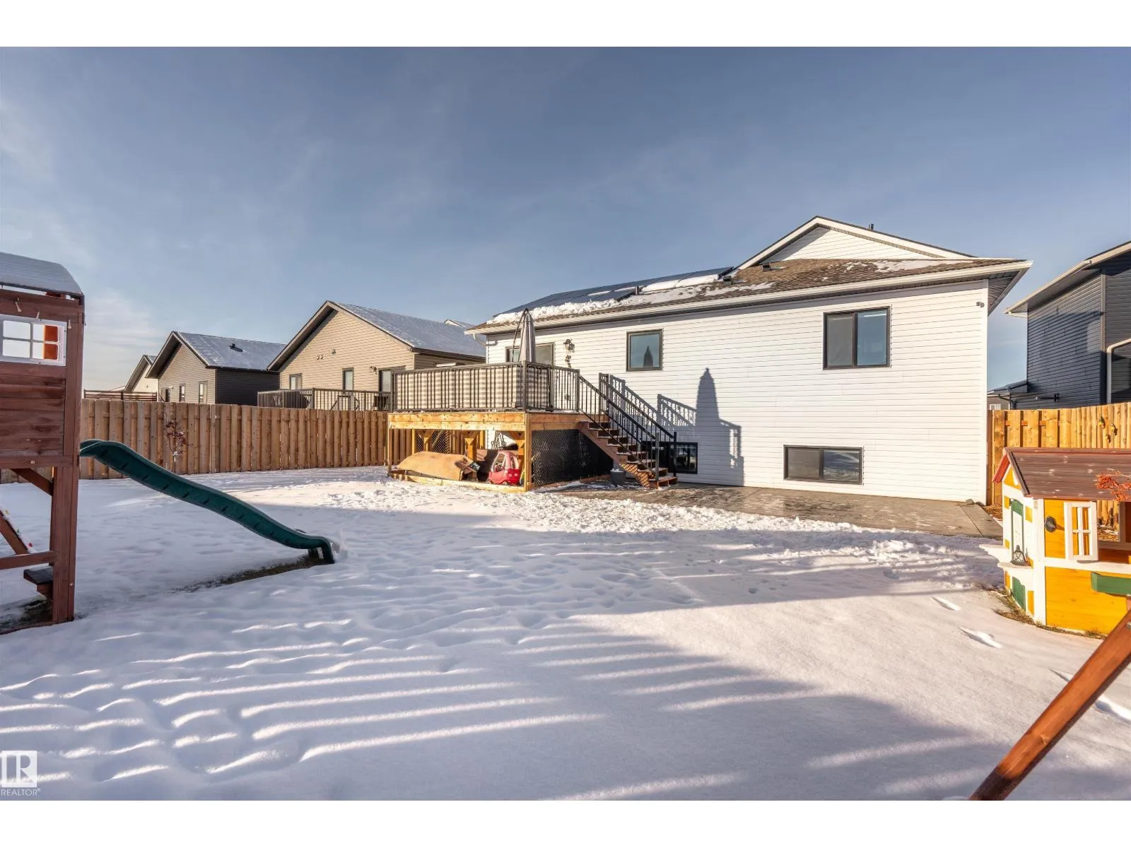 Fully finished 2023 homeâperfectly situated just a short walk from MD Park, the splash park, beach volleyball courts, and Kinosoo Beach. Step inside to the spacious foyer with a walk-in entry closet, then flow into an open-concept main floor featuring custom cabinetry, soft-close drawers, and a striking island. The living room is bright and inviting, anchored by an electric fireplace, while the dining area opens to a landscaped, fenced yard and deck.The primary suite is a true retreatâprivately located on the upper level with in-floor heat, substantial closet space, and a spa-like ensuite featuring his-and-hers sinks, a soaker tub, and a tiled shower. Downstairs, slab heat keeps things comfortable in the spacious family room, two additional bedrooms, and a full bath. This home is now equipped with a fully installed solar panel system, adding energy efficiency and long-term cost savings. A/C, custom blinds throughout, and a heated garage, this home offers high-end living just minutes from the lake! (id:27476)