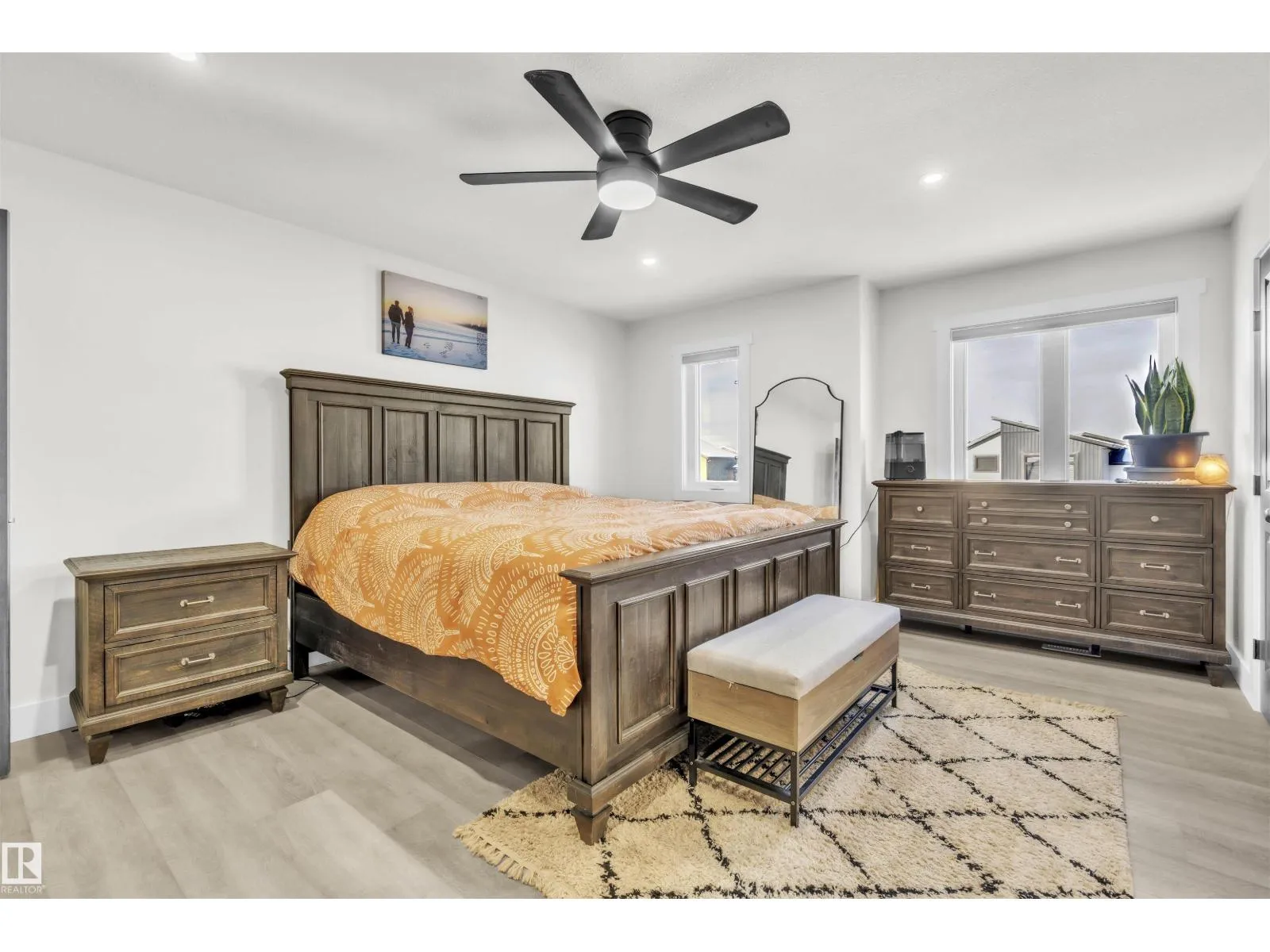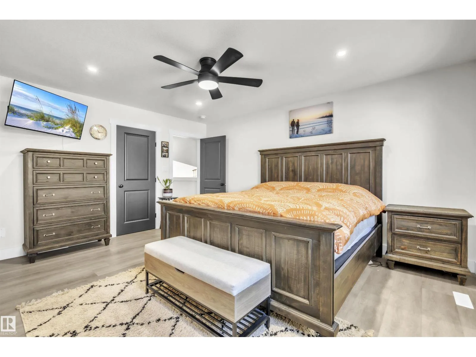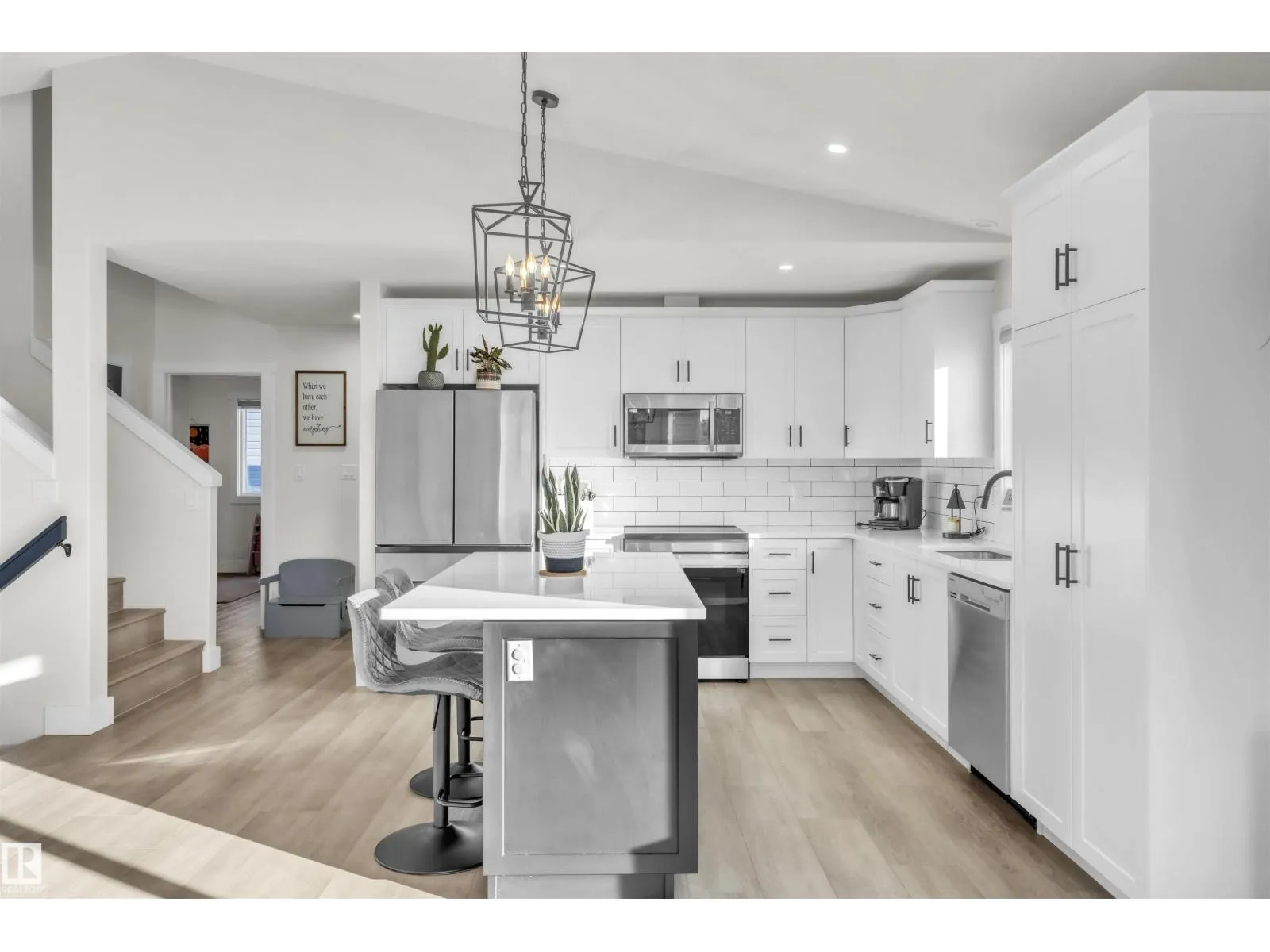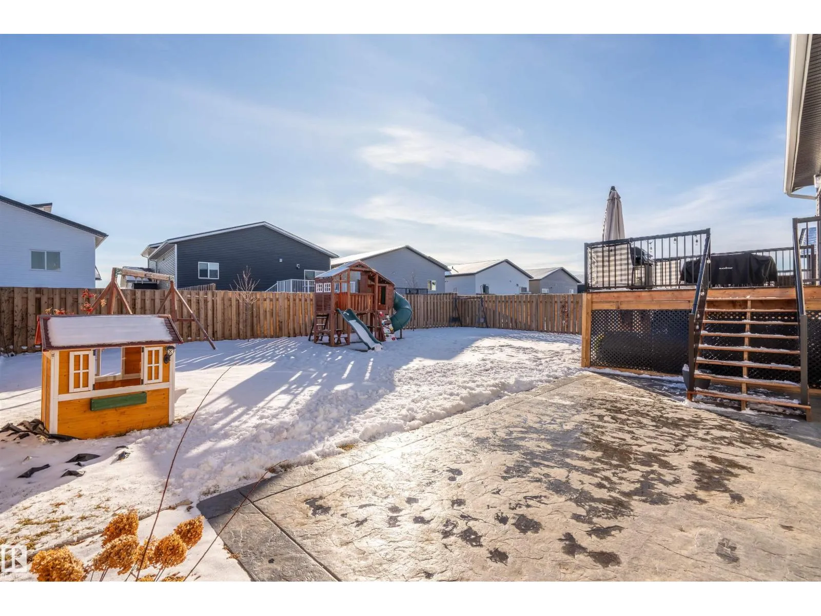 Fully finished 2023 homeâperfectly situated just a short walk from MD Park, the splash park, beach volleyball courts, and Kinosoo Beach. Step inside to the spacious foyer with a walk-in entry closet, then flow into an open-concept main floor featuring custom cabinetry, soft-close drawers, and a striking island. The living room is bright and inviting, anchored by an electric fireplace, while the dining area opens to a landscaped, fenced yard and deck.The primary suite is a true retreatâprivately located on the upper level with in-floor heat, substantial closet space, and a spa-like ensuite featuring his-and-hers sinks, a soaker tub, and a tiled shower. Downstairs, slab heat keeps things comfortable in the spacious family room, two additional bedrooms, and a full bath. This home is now equipped with a fully installed solar panel system, adding energy efficiency and long-term cost savings. A/C, custom blinds throughout, and a heated garage, this home offers high-end living just minutes from the lake! (id:27476)