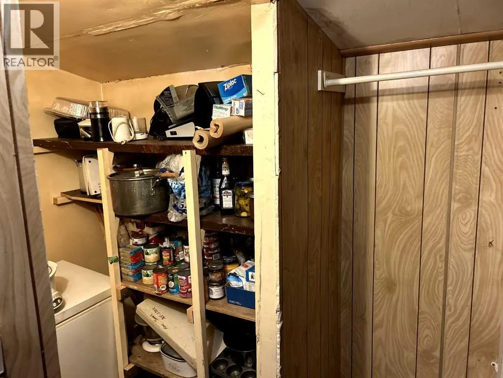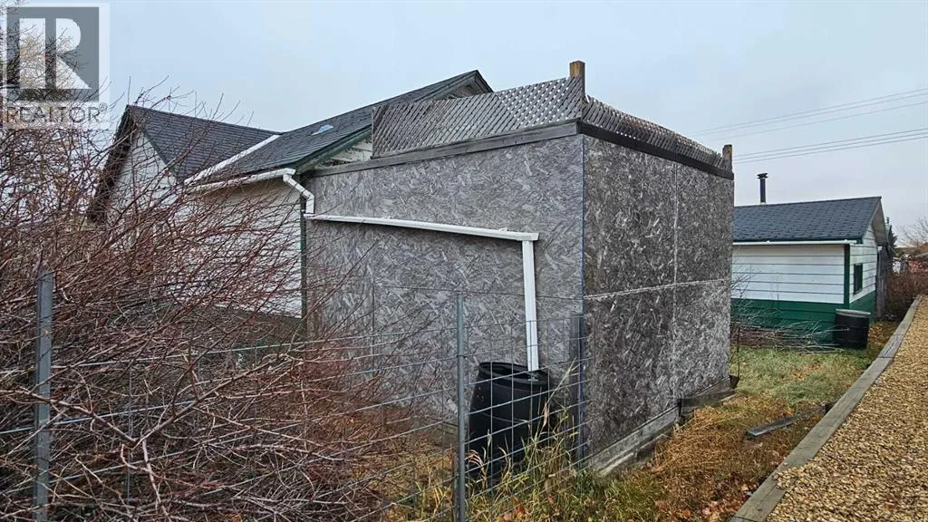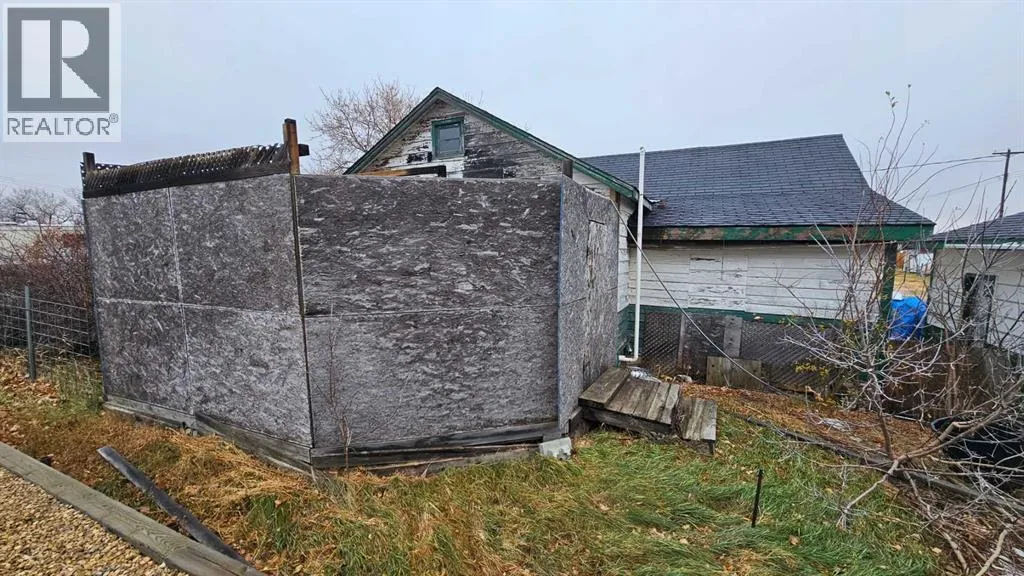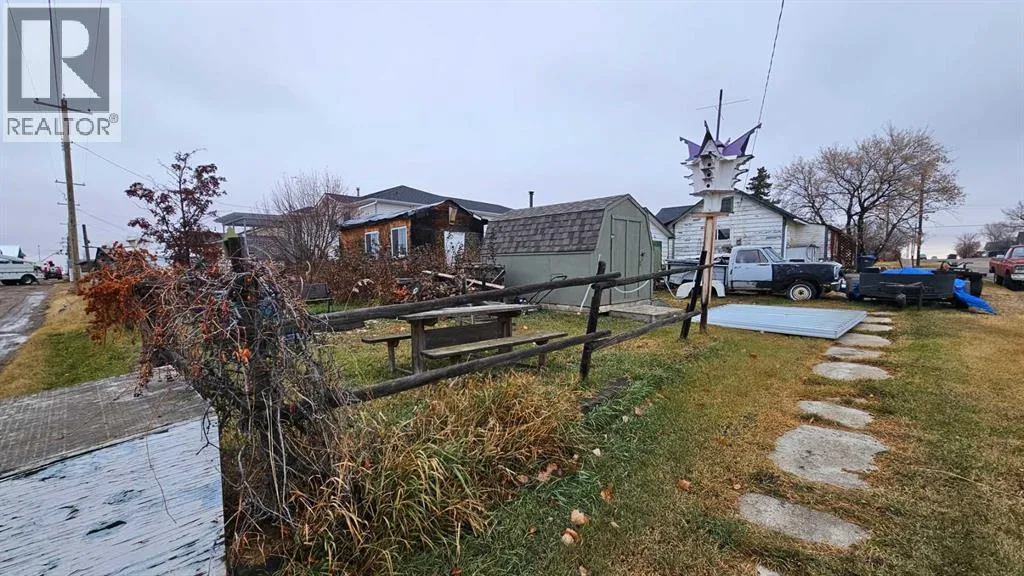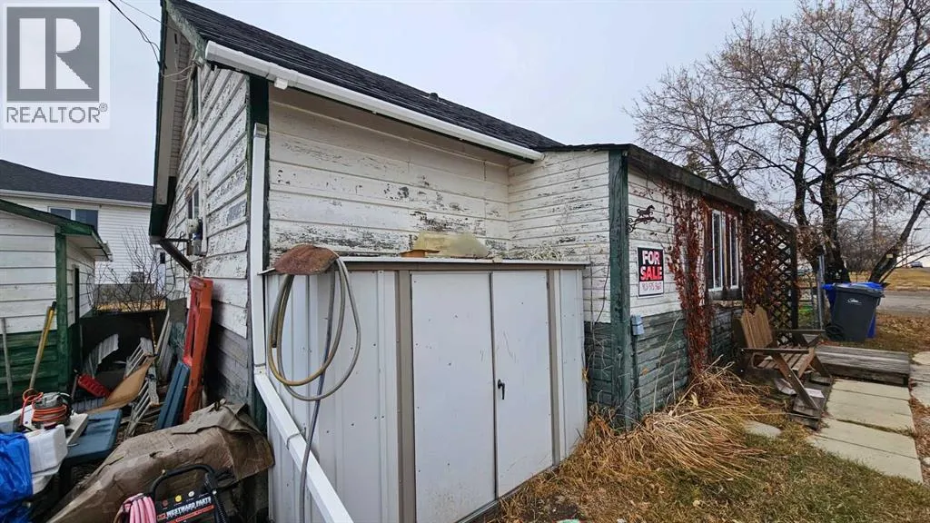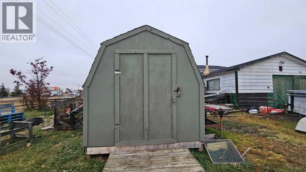 Cozy home on a corner lot with multiple sheds and a double detached garage, this 710 sq ft single bedroom with a newer window, along with an upgraded four piece bathroom, upgraded kitchen, main floor washer and dryer and has a comfortable living room with newer front window. A set of patio doors off the laundry area goes onto a deck that is surrounded by a windbreak to the west and north side. The interior has had some laminate flooring laid, but will need the rest of the house done. The outside is needing a good paint job, along with the sheds and garage. There is a partial basement that has a newer HE furnace and a newer on demand hot water system. There is a small cold porch to the east side . Shingles were done in approximate 2013 on the house. (id:27476)