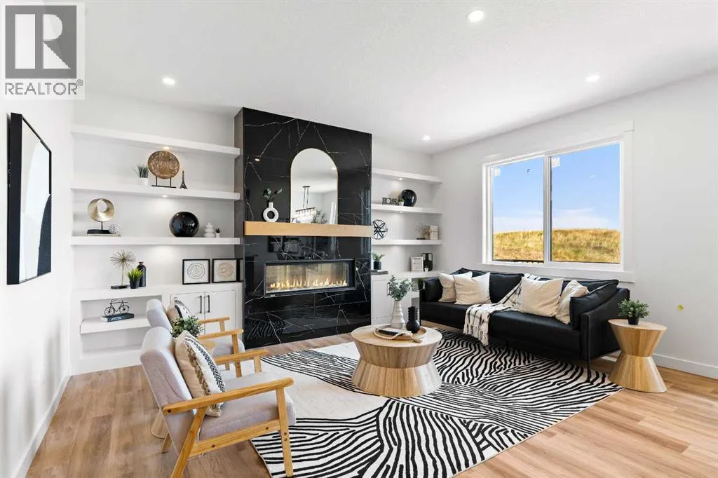 Take a look at this custom-built home in the family-friendly community of Crossfield. This brand-new bungalow offers a total of 2,353 square feet of well-designed living space, with 1,323 square feet on the main floor and 1,030 square feet in the finished basement.Inside, youâll find 10 foot ceilings on the main level and 9 foot ceilings in the basement, giving the home a bright and open feel. The main floor features a covered front porch, a large deck in the backyard, and an open concept layout thatâs perfect for both relaxing and entertaining.The kitchen comes fully loaded with a big island, quartz countertops, premium stainless steel appliances, black hardware, high end lighting, and solid plywood shaker cabinets. The living room has a modern Montigo gas fireplace, and the space is finished with durable luxury vinyl plank flooring, Maple wood touches, and black dual pane windows that give it a modern look.The exterior includes a mix of stucco and stone finishes, all part of the included upgrades.The primary bedroom is a great place to unwind. It comes with a five piece ensuite and a walk in closet. Thereâs also a second bedroom on the main floor, plus a full four piece bathroom and a laundry room with a sink.Head downstairs and youâll find even more space including a third bedroom with a walk in closet, a home office, a large rec room with a built in media center and shelving, a wet bar, and a fourth bedroom. Thereâs also a separate side entrance, perfect for privacy or future rental potential.Outside, thereâs a double detached garage, a fully landscaped yard, and plenty of room to enjoy the outdoors.This home is located in the growing Iron Landing area, close to parks, playgrounds, shopping, and schools like Crossfield Elementary and W G Murdoch School. Youâre also just a short drive from Airdrie (under 10 minutes), 25 minutes to Calgary, and close to Highway 2 for an easy commute.The home still have the chance to choose some of the finishes to make it your own. Photos shown are from a previous build. Visit our show home to get a feel for the quality and style.Reach out today to learn more or to book a visit. (id:27476)