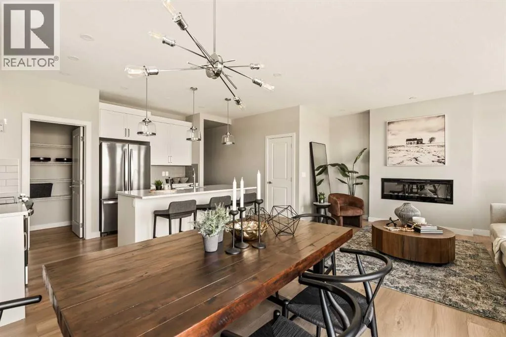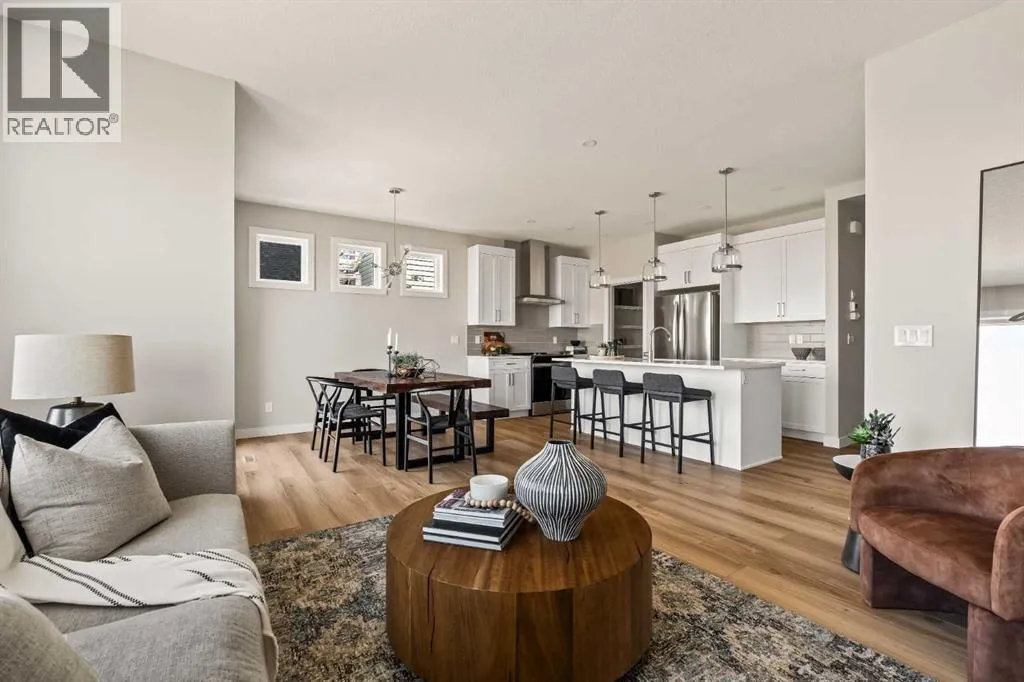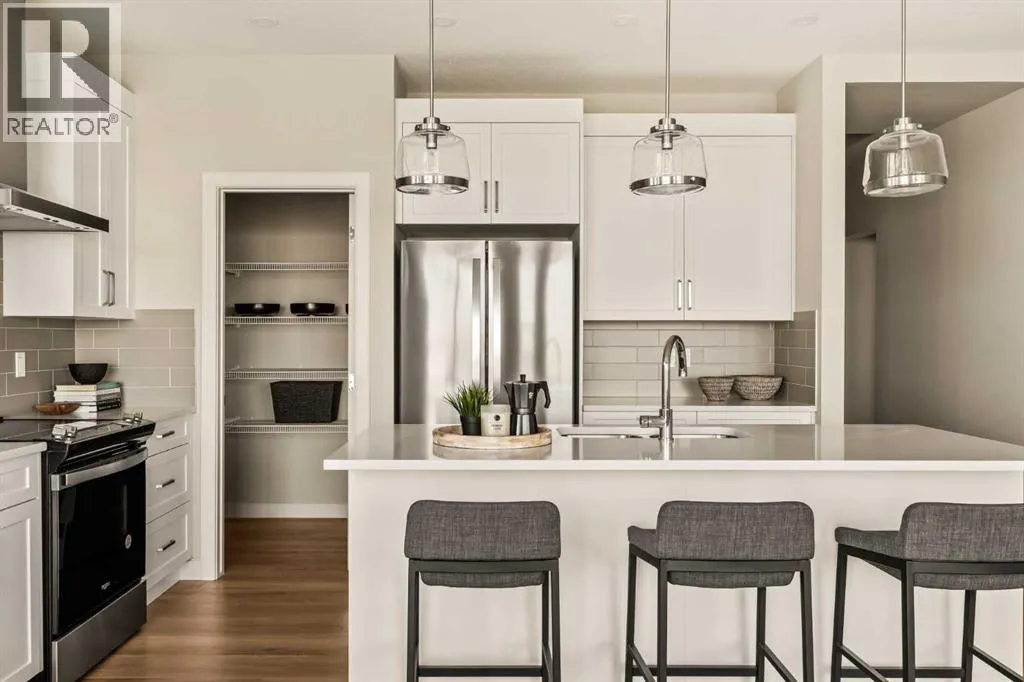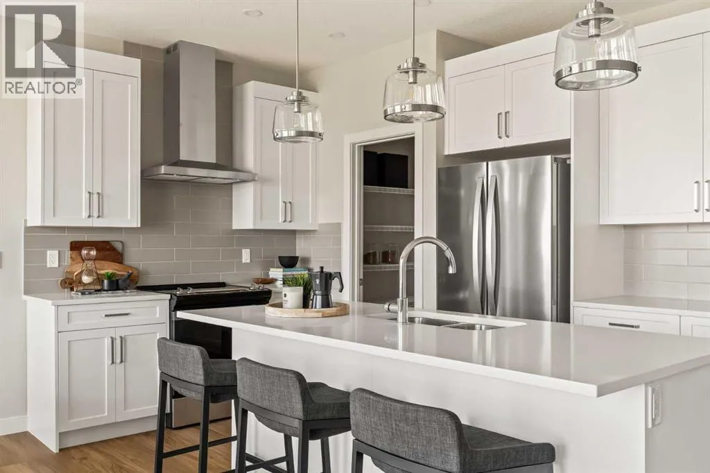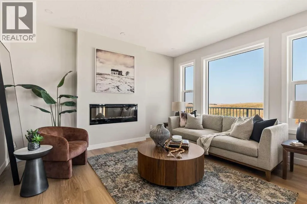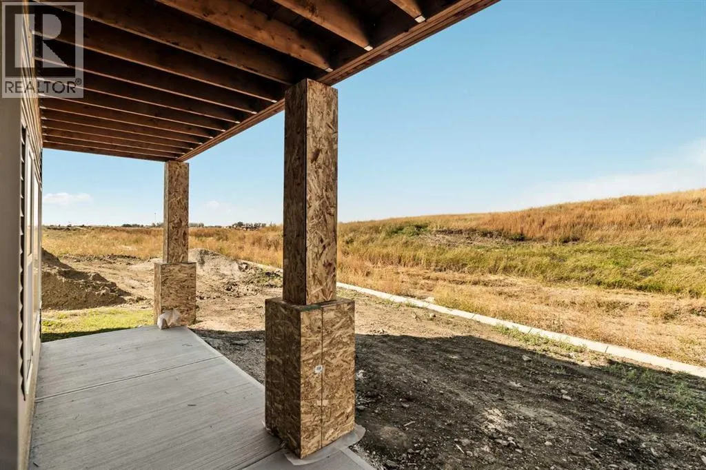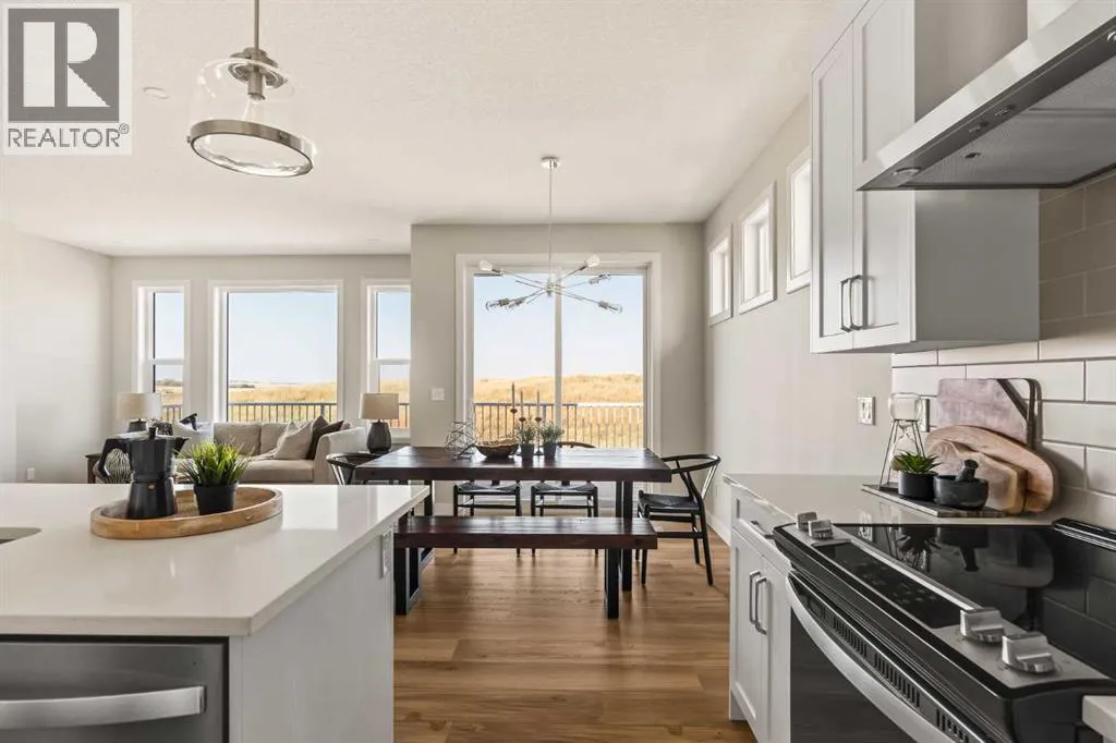 An incredible opportunity awaits in this brand new move-in ready Walkout Bungalow in the heart of Crossfield! Offering 2 living areas, 4 bedrooms, 2.5 bathrooms and nearly 2,200 square feet of developed space over two levels + an oversized double attached garage, this home is perfect for those looking to downsize without compromise or for a family! The bright and open main living area features a central kitchen that overlooks both living and dining spaces - making it the perfect space for entertaining. The expansive kitchen is complete with timeless white shaker cabinets accented by a subway tile backsplash. The light quartz countertops create a clean and seamless look while providing a bright and clean living space. The kitchen is complete with a large 5' deep corner pantry with endless storage, a slide-in range, chimney hood fan and suite of stainless steel appliances. The 9'x10' dining area has ample space for a large dining table and the kitchen island offers additional seating space. The main living area has a central fireplace, perfect for cozy winter nights, and a wall of windows across the back of the home allow natural light to flood the main living space all day long. Patio doors off of the main dining area provide access to the large 23' wide deck, with ample space for a cooking area and lounging space. The large primary suite has windows centering the bedframe with ample space for a king-sized bed and the intelligently designed niche is the perfect space for a wardrobe - providing a comfortable primary suite that can accommodate a full bedroom set. The primary suite is complete with a 5pc en suite including dual undermount sinks with quartz countertop, a soaker tub, walk-in shower and a large walk-in closet. The main level is completed with a full second bedroom, which could be a home office space, and a full bathroom - providing the ideal layout for multi-generational living or the perfect bedroom for a younger child. Laundry is located on the main leve l, providing added convenience to everyday living. The lower level has been professionally developed to mirror the same design aesthetic throughout. With 9' ceilings and a wall of windows on the walkout basement, the expansive ~27'x17' rec room offers ample space for a TV area, games space and home gym if desired! The basement is complete with two more bedrooms, a full bathroom and endless storage! A covered patio on the lower level walkout basement is the perfect space to relax while overlooking your fully private backyard. Ideal for those wanting a lower-maintenance lifestyle and single level-living, this beautiful new home is move-in ready in the charming small town of Crossfield! With the endless amenities of Airdrie and Calgary just minutes away, this property offers a tranquil lifestyle without compromise! This home comes with full Builder Warranty + Alberta New Home Warranty allow you to purchase with peace of mind. (id:27476)
