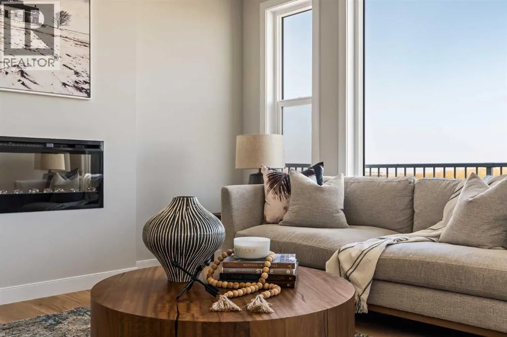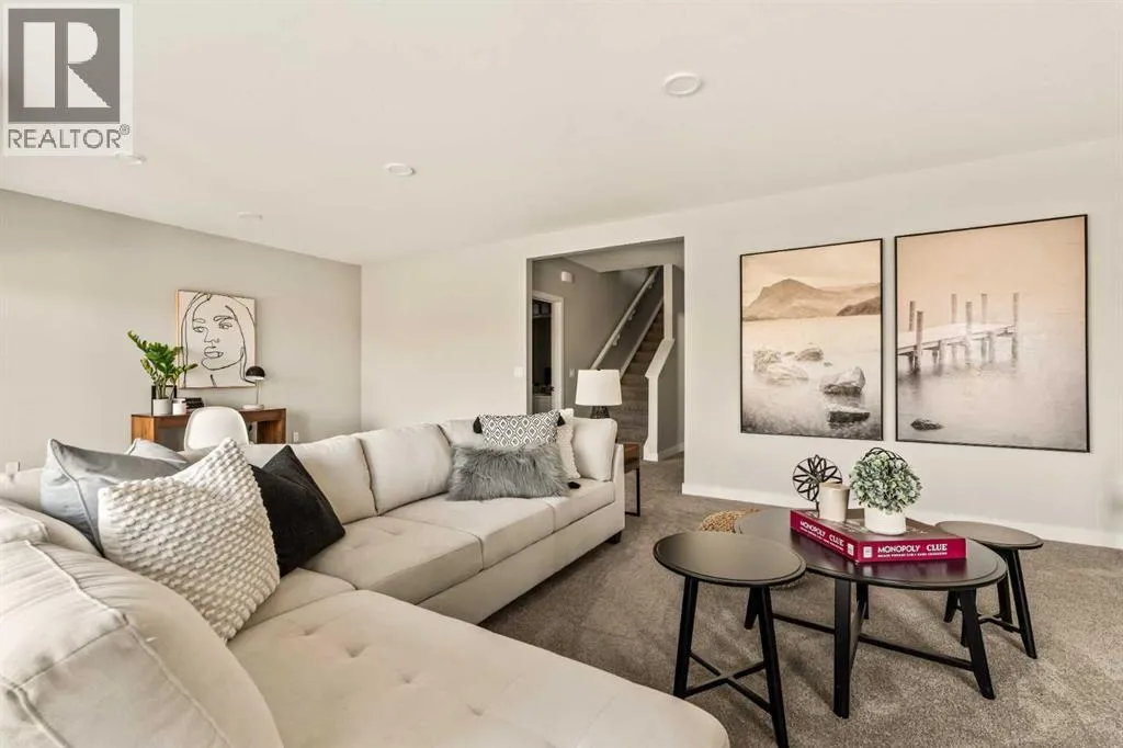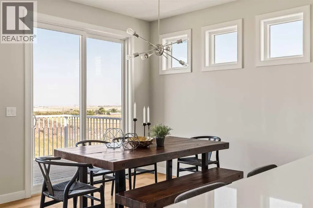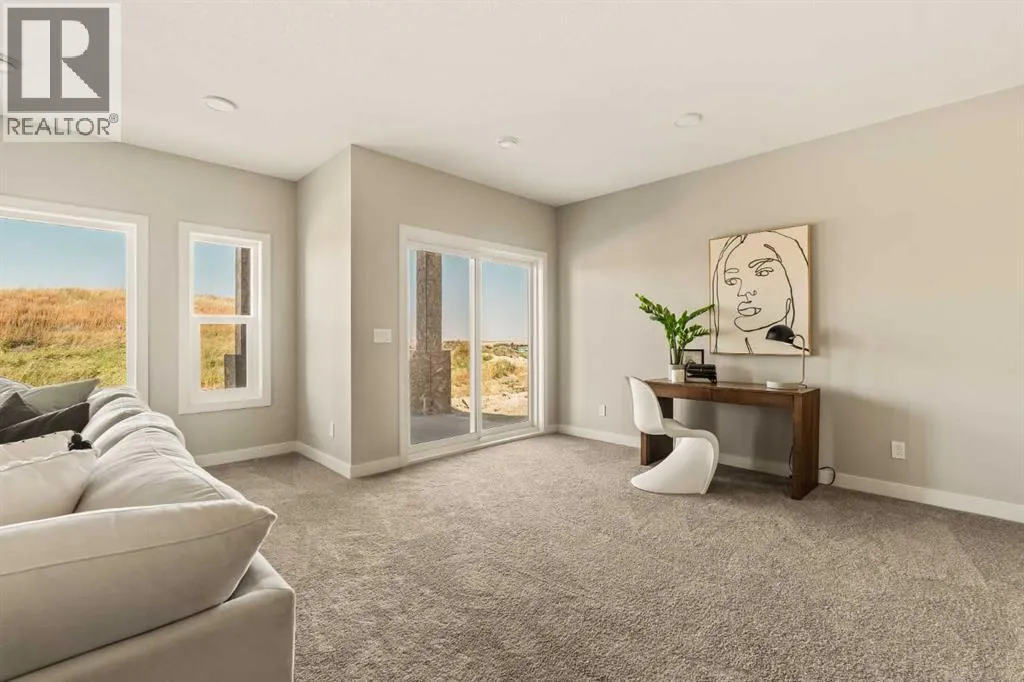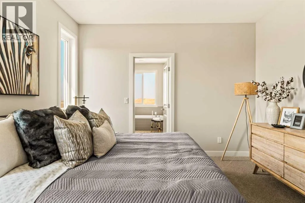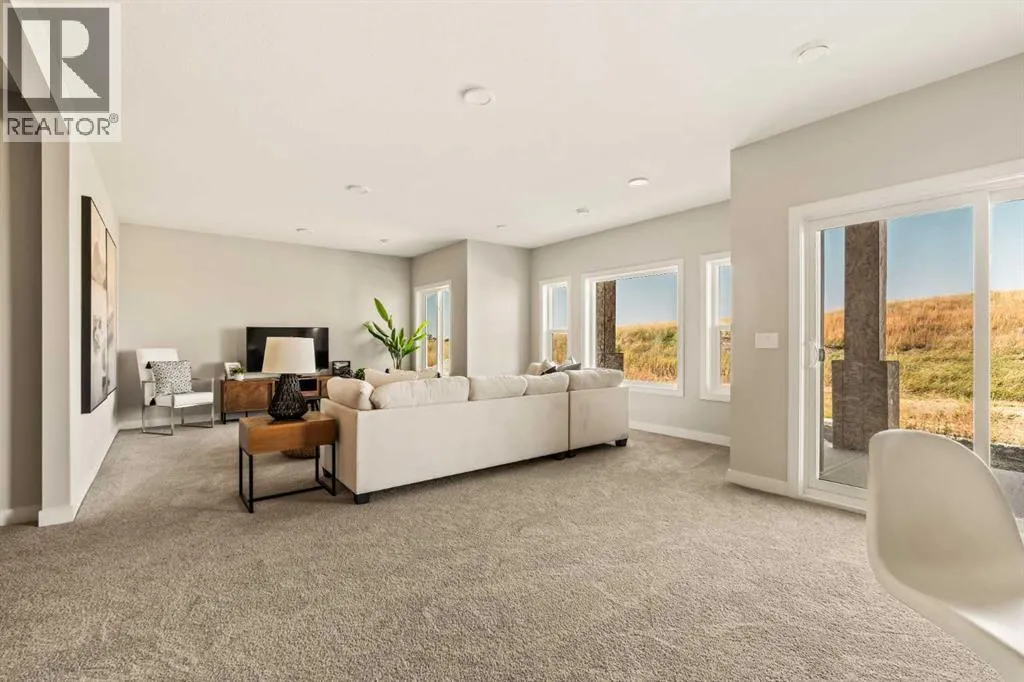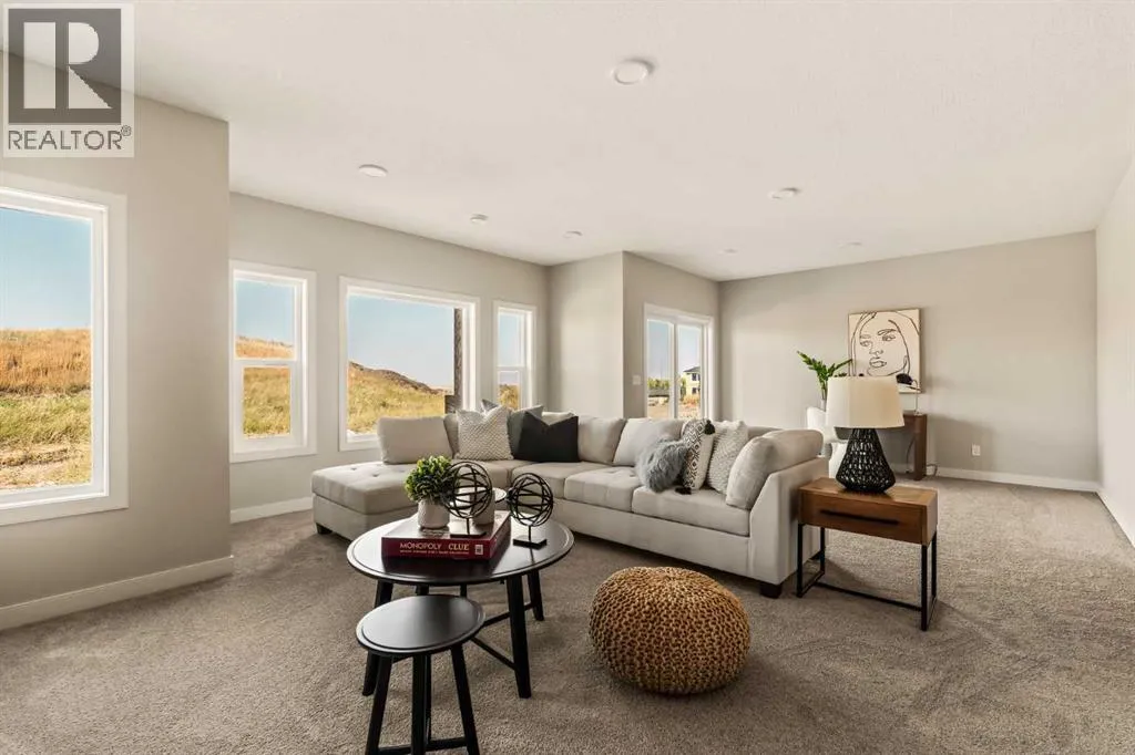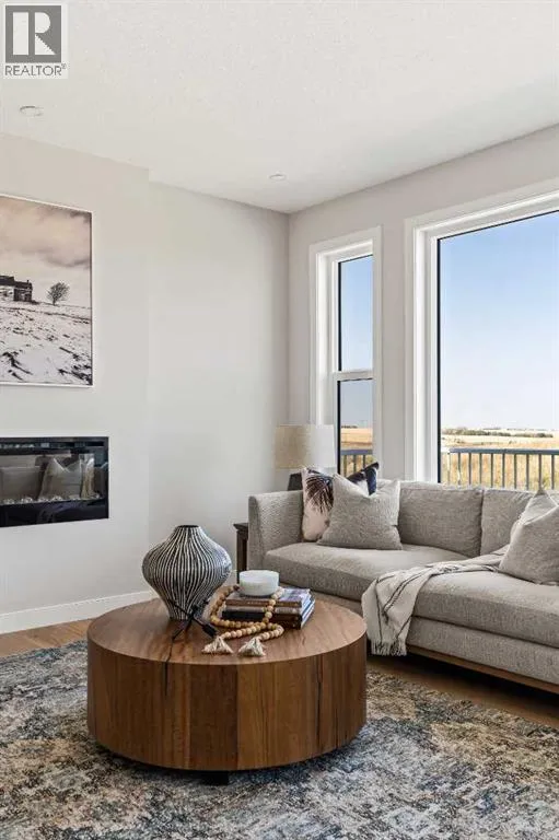 An incredible opportunity awaits in this brand new move-in ready Walkout Bungalow in the heart of Crossfield! Offering 2 living areas, 4 bedrooms, 2.5 bathrooms and nearly 2,200 square feet of developed space over two levels + an oversized double attached garage, this home is perfect for those looking to downsize without compromise or for a family! The bright and open main living area features a central kitchen that overlooks both living and dining spaces - making it the perfect space for entertaining. The expansive kitchen is complete with timeless white shaker cabinets accented by a subway tile backsplash. The light quartz countertops create a clean and seamless look while providing a bright and clean living space. The kitchen is complete with a large 5' deep corner pantry with endless storage, a slide-in range, chimney hood fan and suite of stainless steel appliances. The 9'x10' dining area has ample space for a large dining table and the kitchen island offers additional seating space. The main living area has a central fireplace, perfect for cozy winter nights, and a wall of windows across the back of the home allow natural light to flood the main living space all day long. Patio doors off of the main dining area provide access to the large 23' wide deck, with ample space for a cooking area and lounging space. The large primary suite has windows centering the bedframe with ample space for a king-sized bed and the intelligently designed niche is the perfect space for a wardrobe - providing a comfortable primary suite that can accommodate a full bedroom set. The primary suite is complete with a 5pc en suite including dual undermount sinks with quartz countertop, a soaker tub, walk-in shower and a large walk-in closet. The main level is completed with a full second bedroom, which could be a home office space, and a full bathroom - providing the ideal layout for multi-generational living or the perfect bedroom for a younger child. Laundry is located on the main leve l, providing added convenience to everyday living. The lower level has been professionally developed to mirror the same design aesthetic throughout. With 9' ceilings and a wall of windows on the walkout basement, the expansive ~27'x17' rec room offers ample space for a TV area, games space and home gym if desired! The basement is complete with two more bedrooms, a full bathroom and endless storage! A covered patio on the lower level walkout basement is the perfect space to relax while overlooking your fully private backyard. Ideal for those wanting a lower-maintenance lifestyle and single level-living, this beautiful new home is move-in ready in the charming small town of Crossfield! With the endless amenities of Airdrie and Calgary just minutes away, this property offers a tranquil lifestyle without compromise! This home comes with full Builder Warranty + Alberta New Home Warranty allow you to purchase with peace of mind. (id:27476)
