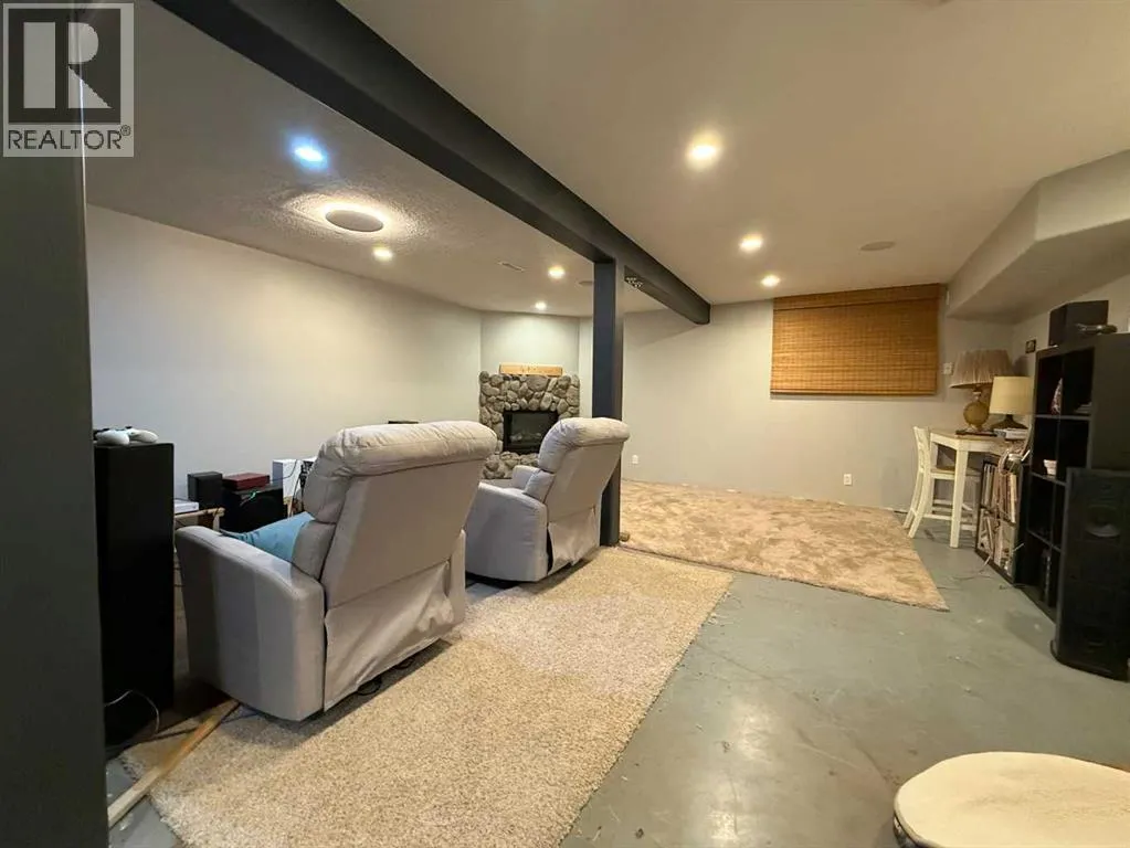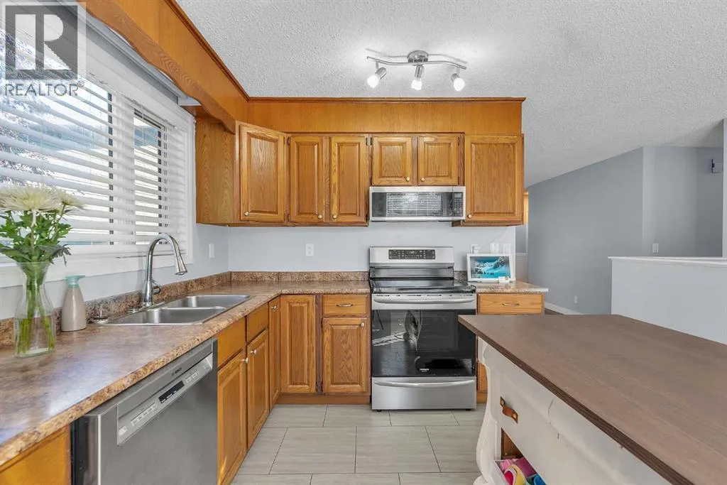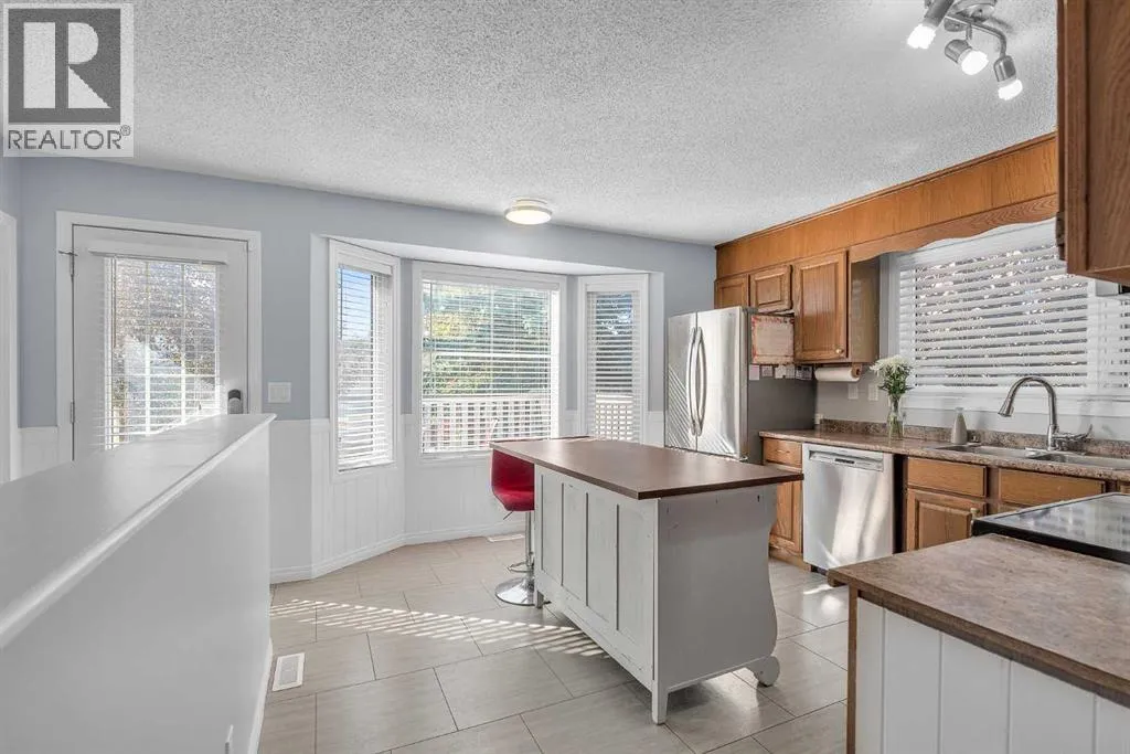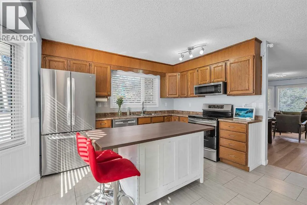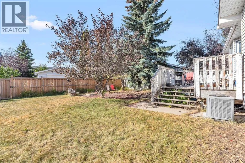 Welcome to this spacious and well-maintained bungalow located in the heart of Crossfield, close to schools, shopping, transportation, and recreational facilities. This home features a total of five bedrooms and three full bathrooms, offering plenty of space for a growing family. The main floor includes a generous living room, dining area, and a bright eat-in kitchen with a large window overlooking the sunny south-facing deck and backyard. The primary bedroom includes a private three-piece ensuite and convenient laundry chute, while two additional bedrooms and a four-piece main bathroom complete the main level. The partially finished basement, with roughed in plumbing for a wet bar, offers two more large bedrooms, (not egress windows), a recreation room with a charming stone-faced fireplace, a four-piece bathroom, and a laundry area, ready for your finishing touches. Outside, enjoy the exterior with a heated double attached garage, spacious deck, rear alley access, and a fully fenced backyard. Newer appliances, furnace replaced &and new A/C installed in 2020 along with a new Hot Water Tank this year. This is a wonderful opportunity to own a beautiful home in a friendly and welcoming communityâbook your private viewing today! (id:27476)
