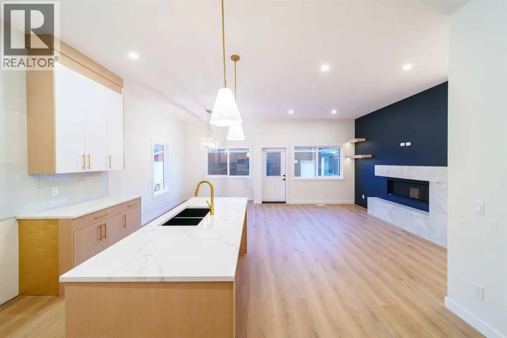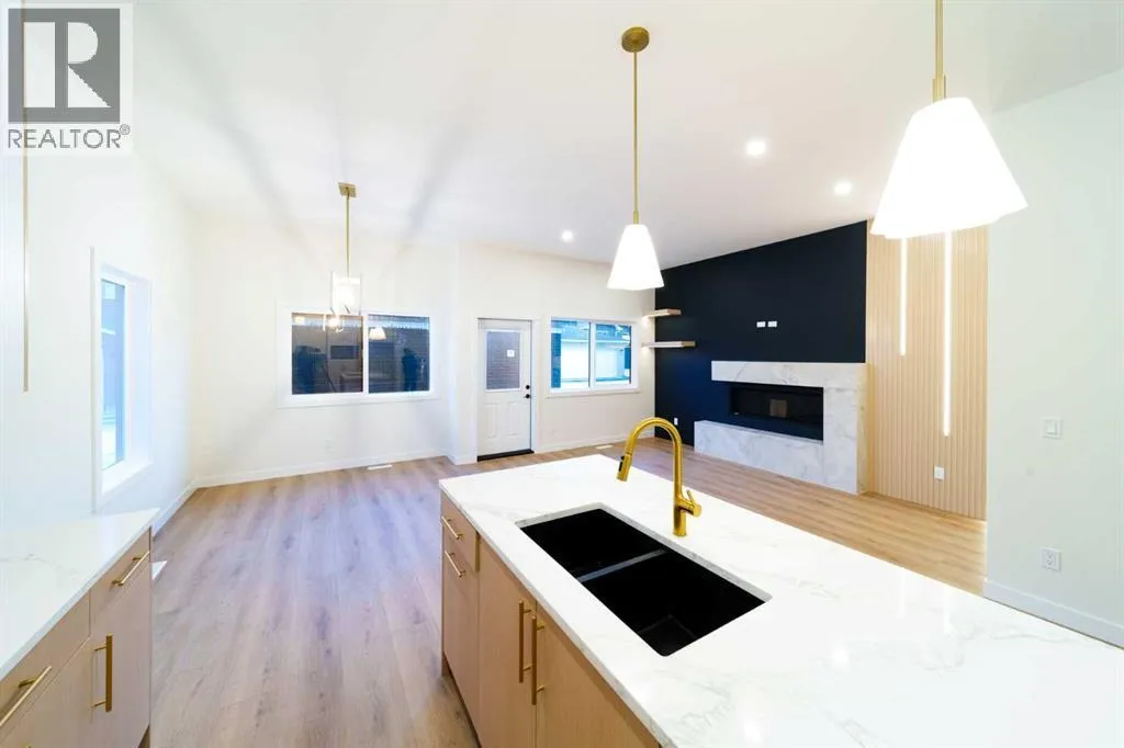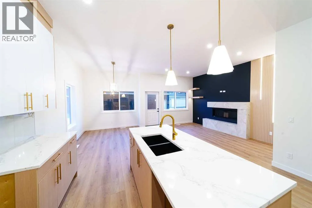 Take a look at this custom-built home in the family-friendly community of Crossfield. This brand-new bungalow offers a total of 2,353 square feet of well-designed living space, with 1,323 square feet on the main floor and 1,030 square feet in the finished basement.Inside, youâll find 10 foot ceilings on the main level and 9 foot ceilings in the basement, giving the home a bright and open feel. The main floor features a covered front porch, a large deck in the backyard, and an open concept layout thatâs perfect for both relaxing and entertaining.The kitchen comes fully loaded with a big island, quartz countertops, premium stainless steel appliances, black hardware, high end lighting, and solid plywood shaker cabinets. The living room has a modern Montigo gas fireplace, and the space is finished with durable luxury vinyl plank flooring, Maple wood touches, and black dual pane windows that give it a modern look.The exterior includes a mix of stucco and stone finishes, all part of the included upgrades.The primary bedroom is a great place to unwind. It comes with a five piece ensuite and a walk in closet. Thereâs also a second bedroom on the main floor, plus a full four piece bathroom and a laundry room with a sink.Head downstairs and youâll find even more space including a third bedroom with a walk in closet, a home office, a large rec room with a built in media center and shelving, a wet bar, and a fourth bedroom. Thereâs also a separate side entrance, perfect for privacy or future rental potential.Outside, thereâs a double detached garage, a fully landscaped yard, and plenty of room to enjoy the outdoors.This home is located in the growing Iron Landing area, close to parks, playgrounds, shopping, and schools like Crossfield Elementary and W G Murdoch School. Youâre also just a short drive from Airdrie (under 10 minutes), 25 minutes to Calgary, and close to Highway 2 for an easy commute.The home still have the chance to choose some of the finishes to make it your own. Photos shown are from a previous build. Visit our show home to get a feel for the quality and style.Reach out today to learn more or to book a visit. (id:27476)