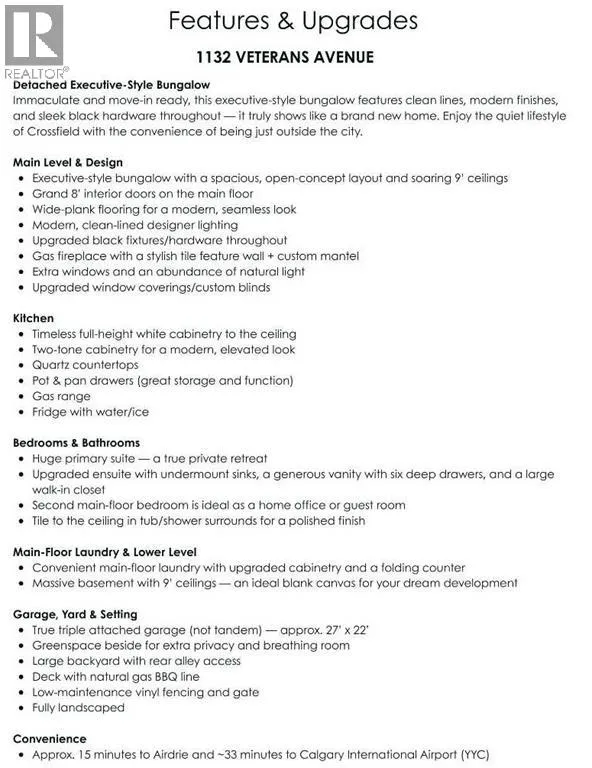 $25,000 PRICE DROP - NOW EVEN BETTER VALUE!! GORGEOUS BUNGALOW WITH ATTACHED TRIPLE GARAGE and 9-foot ceilings on BOTH LEVELS â a combination that is seldom available! From the moment you enter, the elevated ceiling height and upgraded 8-foot doors create an immediate sense of space and quality. Knockdown ceilings and modern, cohesive finishes carry that refined feel throughout the home. The kitchen is timeless and well-appointed with classic white cabinetry, quartz countertops, black hardware, and contemporary lighting accented with subtle gold details. A generous dining area flows seamlessly to the rear deck, complete with a gas line for BBQs, along with a lower patio for additional outdoor living space. Space for an RV as well. The vinyl-fenced yard offers back-alley access and a quiet setting where you can step outside and enjoy a touch of nature. The living room is warm and inviting, anchored by a custom mantle fireplace and large windows that bring in excellent natural light. The HUGE primary suite is designed as a true retreat and features a spa-like ensuite with an oversized shower that has tile finished to the ceiling, double undermount sinks with QUARTZ countertops, six functional drawers for storage, and a large walk-in closet. The secondary bathroom also showcases tile to the ceiling, reinforcing the upgraded finishes throughout. A second bedroom completes the main level. The main-floor laundry room has been thoughtfully upgraded with custom cabinetry and additional space for drying racks and organization. Downstairs, the massive basement mirrors the main floor with 9-foot ceilings and offers three large windows, a bathroom rough-in already in place, and utilities neatly positioned in one corner â creating an ideal and flexible layout for future development. Create the perfect space for a media room, home gym, pool table, or whatever you can dream up. Immaculately maintained and lightly lived in, this bungalow offers rare garage space, elevated ceiling h eight, and quality upgrades in a peaceful location. Book your showing today! (id:27476)