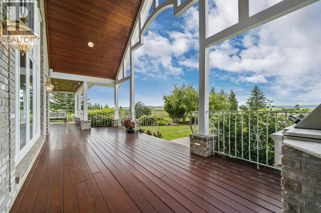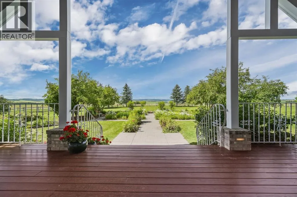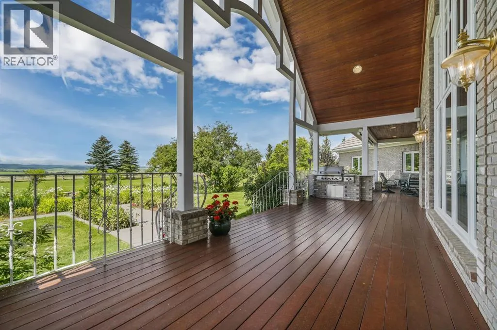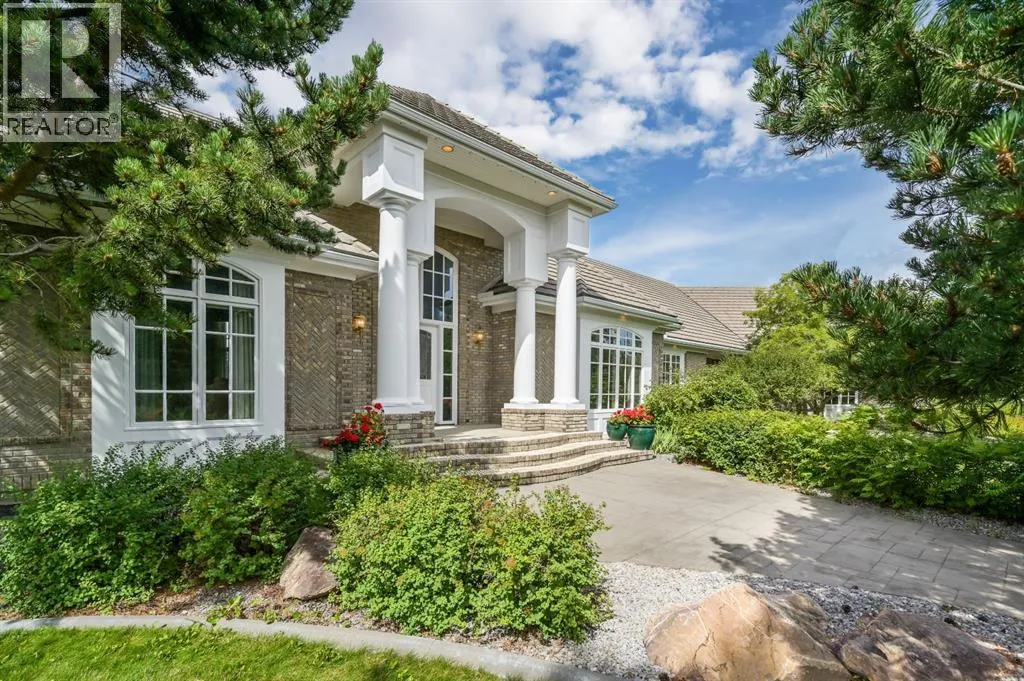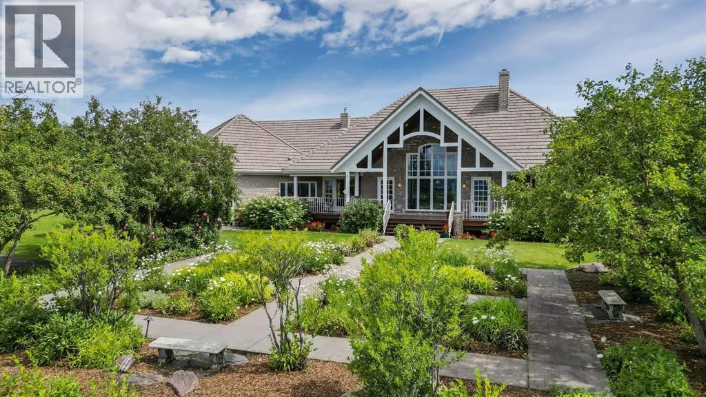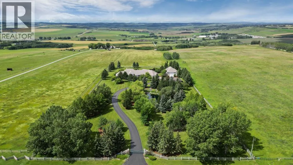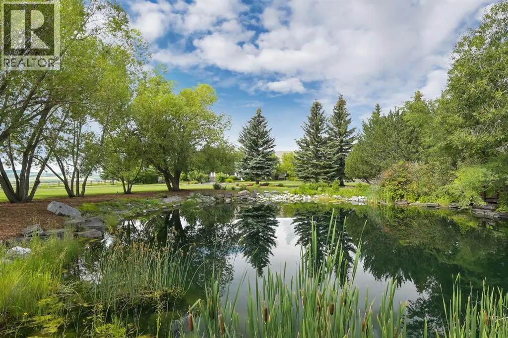 Set on 4.94 acres in the scenic beauty of Rural Foothills County, this impeccably maintained bungalow offers over 9,500 square feet of living spaceâproviding the peace and privacy of a country estate just a short drive from Calgaryâs downtown core. From the moment you arrive, the stately brick exterior, durable clay tile roof, and manicured landscaping hint at the exceptional quality within. A serene pond with a cascading waterfall sets a tranquil tone, while a beautifully landscaped courtyard adds to the propertyâs charm. Inside, a grand marble-floored entryway opens into the expansive living room, where a wood-burning fireplace and large west-facing windows frame spectacular mountain views. Rich hardwood floors flow throughout the main level, complementing the timeless design. The chefâs kitchen, crafted by Empire Kitchen and Bath, features Gaggenau and Sub-Zero appliances, custom cabinetry, and generous prep space. A den and an office with custom built-ins offer quiet retreats, while the massive primary suite boasts a walk-in closet and a spa-inspired ensuite with a soaker tub. Two additional bedrooms and a well-appointed mud/laundry room off the heated triple-car garage complete the main level. Outdoor living is elevated with a massive west-facing deck, complete with a built-in BBQ that steps down into a beautifully landscaped garden with stone walkway. The lower level includes a fully built-out legal nanny suite with kitchen, living room, and bedroom, thoughtfully tucked away for privacy. Additional spaces include a games room, billiards room, recreation area, exercise space, full wet bar, a fourth bedroom, and two more wood-burning fireplaces. An extraordinary 2,300 square feet RV garage/workshop offers endless possibilities for collectors, hobbyists, or large-scale projects. Blending elegance, functionality, and an enviable location, this estate is just minutes from Calgaryâs city limits, Strathcona-Tweedsmuir School, the Calgary Polo Club, and Spruce Meadows âdelivering a rare combination of luxury, privacy, and convenience. (id:27476)