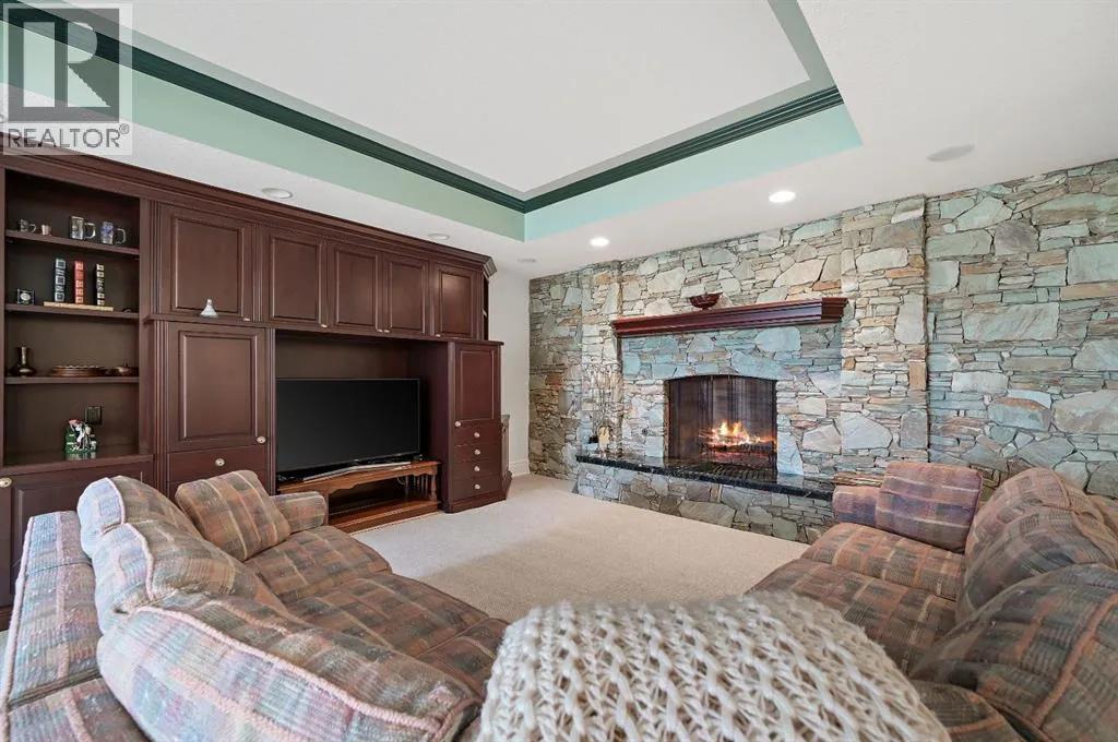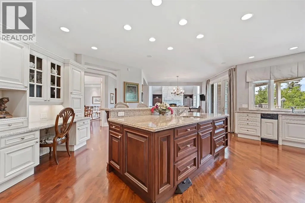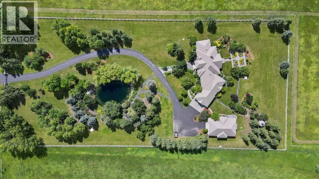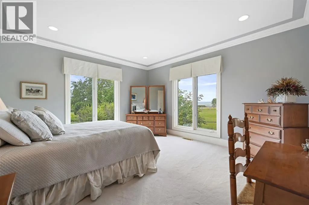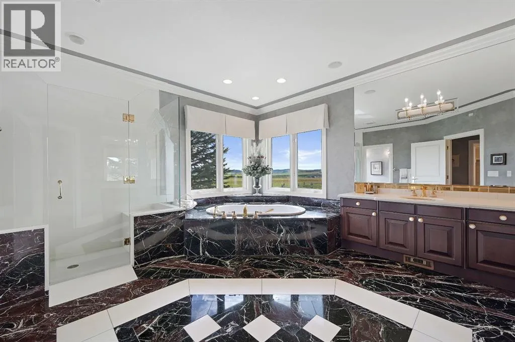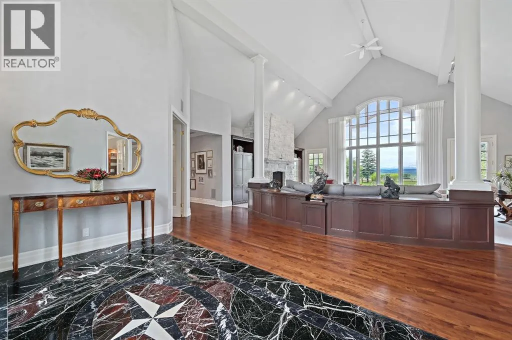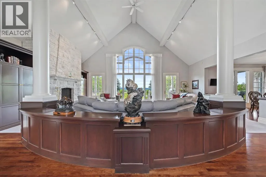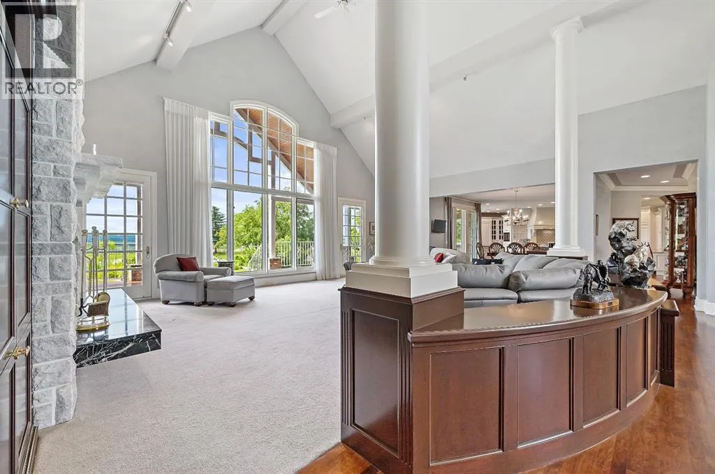 Set on 4.94 acres in the scenic beauty of Rural Foothills County, this impeccably maintained bungalow offers over 9,500 square feet of living spaceâproviding the peace and privacy of a country estate just a short drive from Calgaryâs downtown core. From the moment you arrive, the stately brick exterior, durable clay tile roof, and manicured landscaping hint at the exceptional quality within. A serene pond with a cascading waterfall sets a tranquil tone, while a beautifully landscaped courtyard adds to the propertyâs charm. Inside, a grand marble-floored entryway opens into the expansive living room, where a wood-burning fireplace and large west-facing windows frame spectacular mountain views. Rich hardwood floors flow throughout the main level, complementing the timeless design. The chefâs kitchen, crafted by Empire Kitchen and Bath, features Gaggenau and Sub-Zero appliances, custom cabinetry, and generous prep space. A den and an office with custom built-ins offer quiet retreats, while the massive primary suite boasts a walk-in closet and a spa-inspired ensuite with a soaker tub. Two additional bedrooms and a well-appointed mud/laundry room off the heated triple-car garage complete the main level. Outdoor living is elevated with a massive west-facing deck, complete with a built-in BBQ that steps down into a beautifully landscaped garden with stone walkway. The lower level includes a fully built-out legal nanny suite with kitchen, living room, and bedroom, thoughtfully tucked away for privacy. Additional spaces include a games room, billiards room, recreation area, exercise space, full wet bar, a fourth bedroom, and two more wood-burning fireplaces. An extraordinary 2,300 square feet RV garage/workshop offers endless possibilities for collectors, hobbyists, or large-scale projects. Blending elegance, functionality, and an enviable location, this estate is just minutes from Calgaryâs city limits, Strathcona-Tweedsmuir School, the Calgary Polo Club, and Spruce Meadows âdelivering a rare combination of luxury, privacy, and convenience. (id:27476)