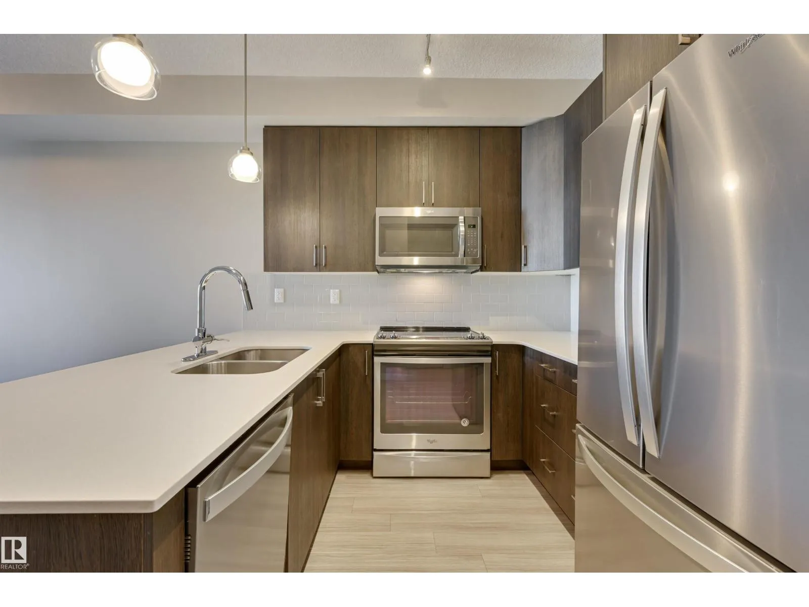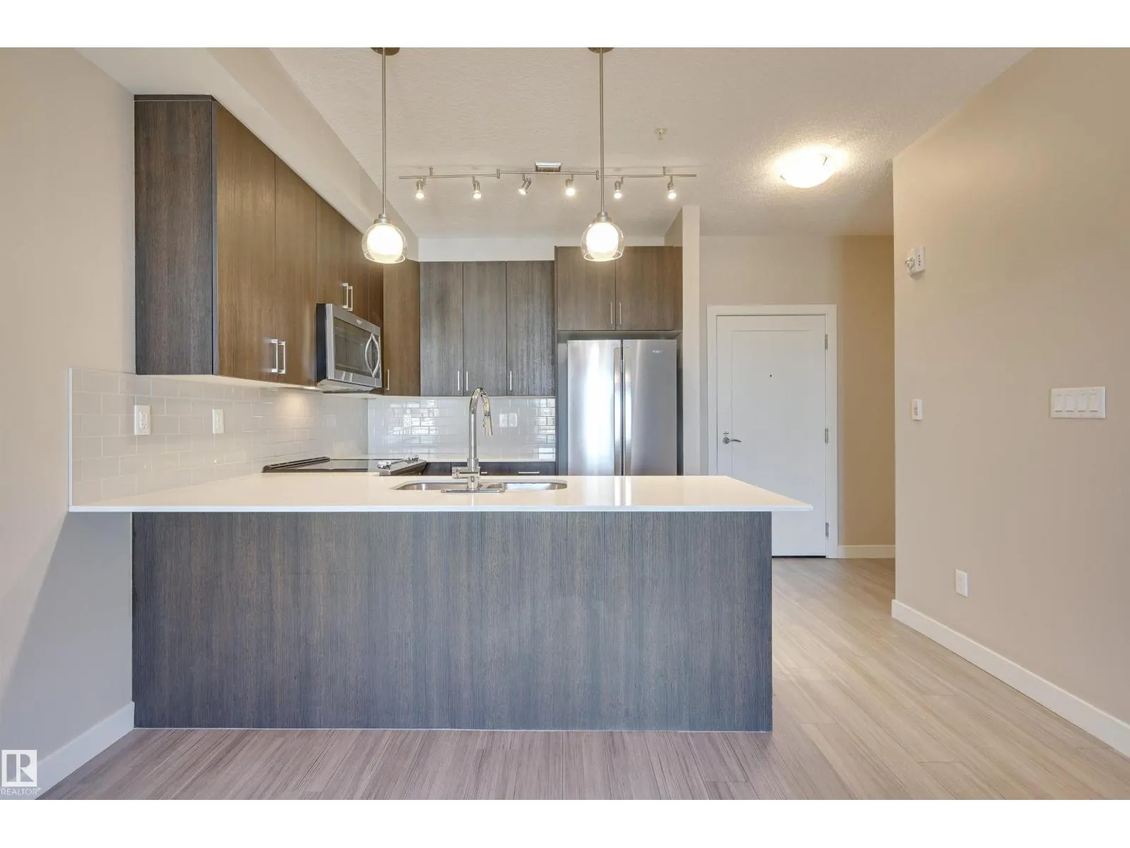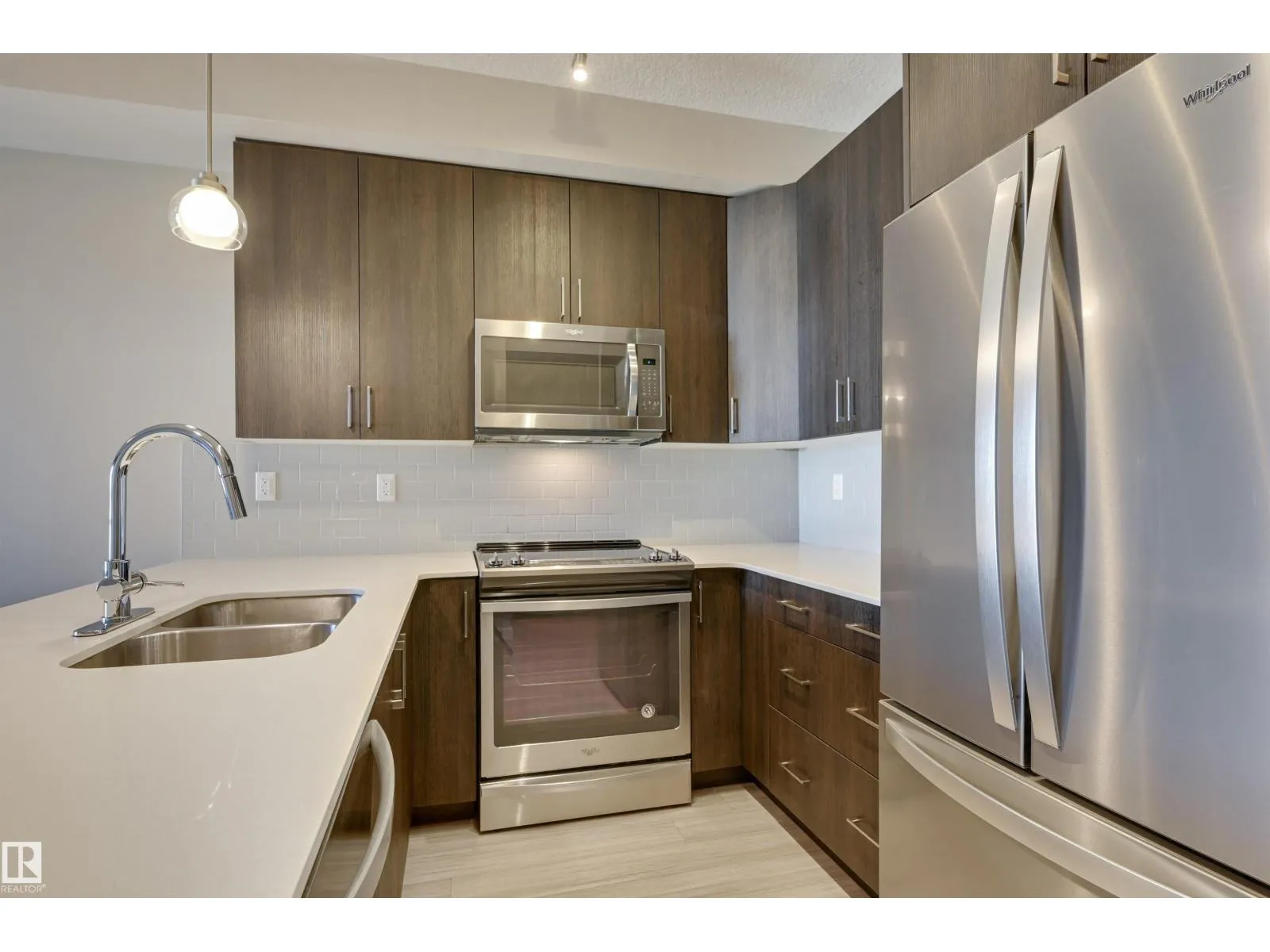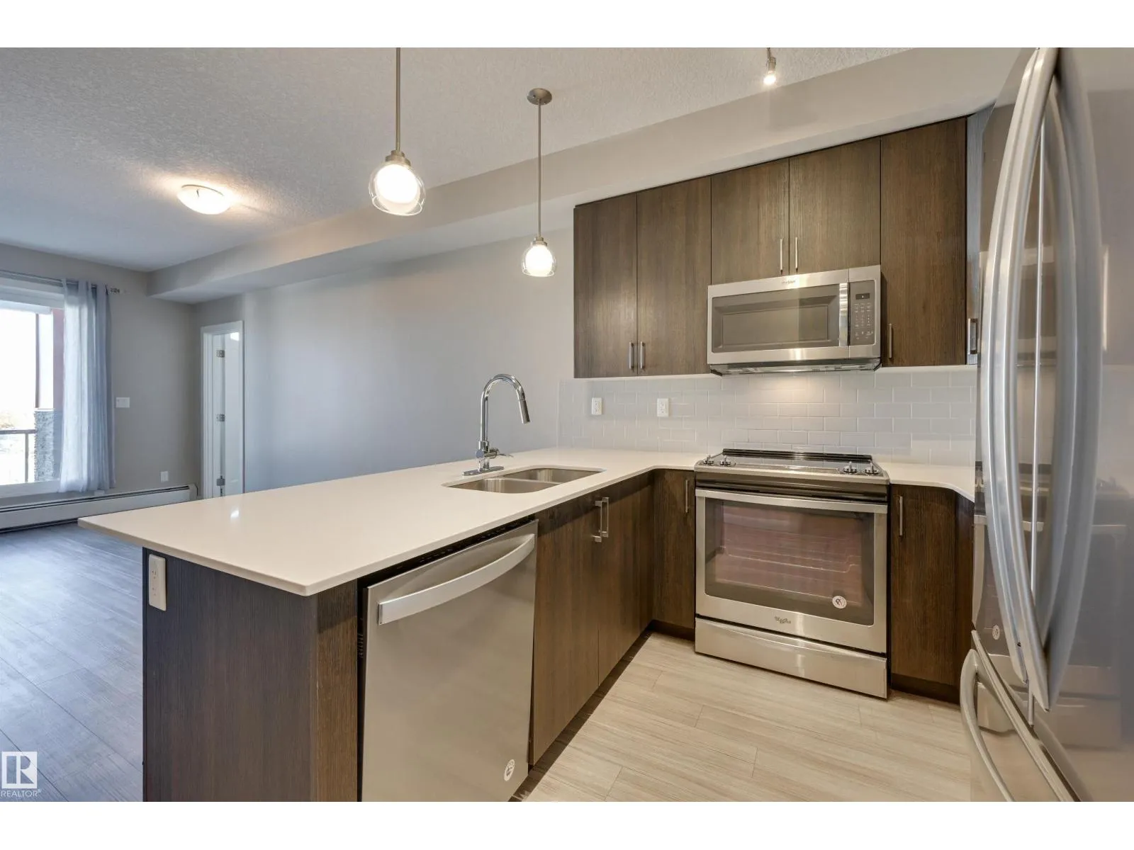 Welcome home to this spacious 708 sq.ft. modern 2 bedroom condo in THE RIDGE located in the heart of DEVON within walking distance to schools, parks, groceries, restaurants, outdoor pool, arena and river valley walking/biking trails. This unit has an open concept floor plan with 9' ceilings offering premium finishings throughout. The kitchen has an eating island, quartz countertops, espresso color cabinetry, with soft close and stainless steel appliances. The bedrooms are at opposite ends of the living area. The spacious north facing deck has a gas BBQ outlet. Vinyl plank flooring throughout except for tile in the bathroom. Roughed in for A/C. Included is the fridge, glass top stove, microwave hood fan, dishwasher, INSUITE WASHER AND DRYER and TITLED UNDERGROUND PARKING Unit 44 (Actual #12) with a storage cage. Shows very well! A great place to call home! (id:27476)