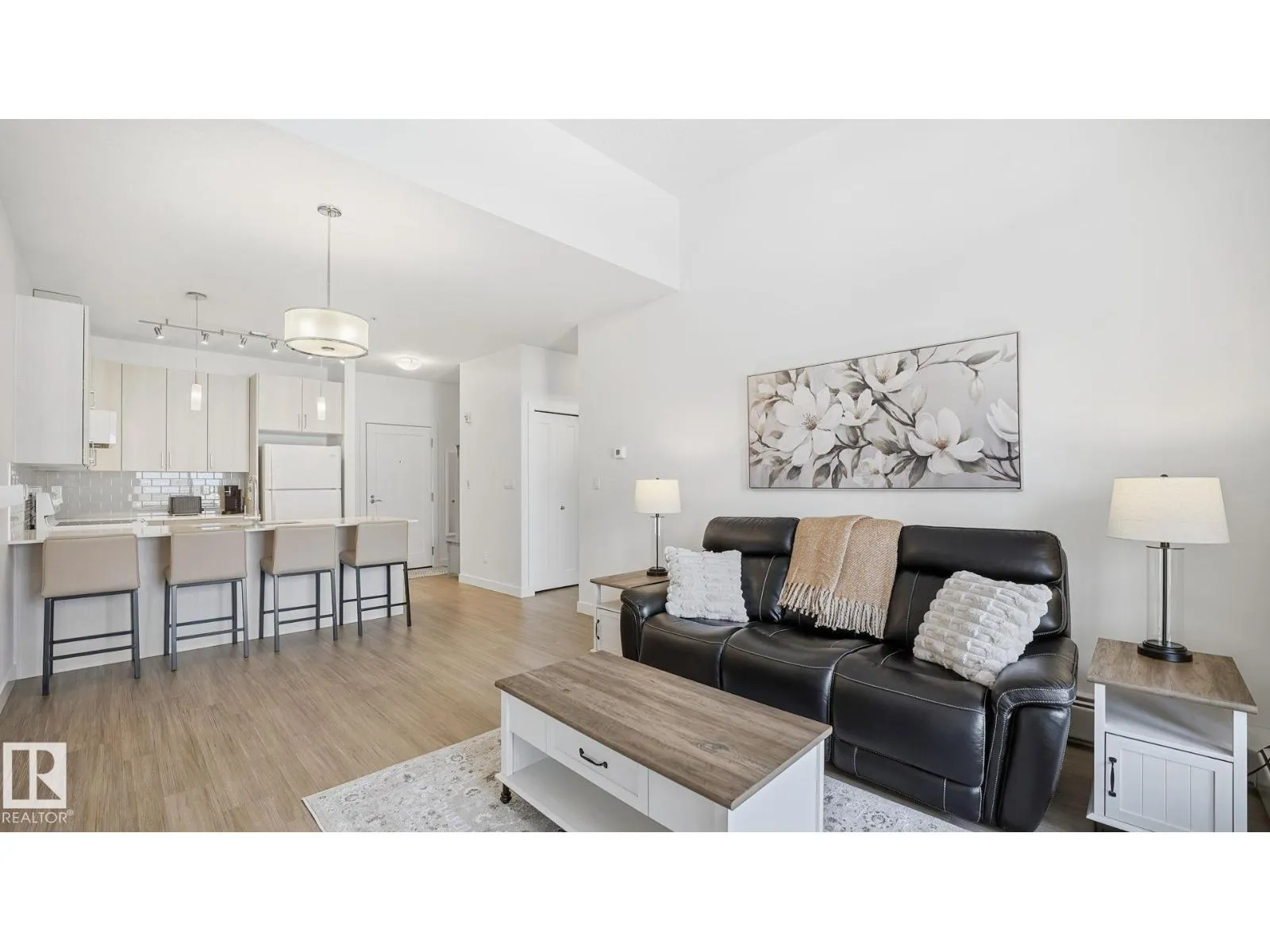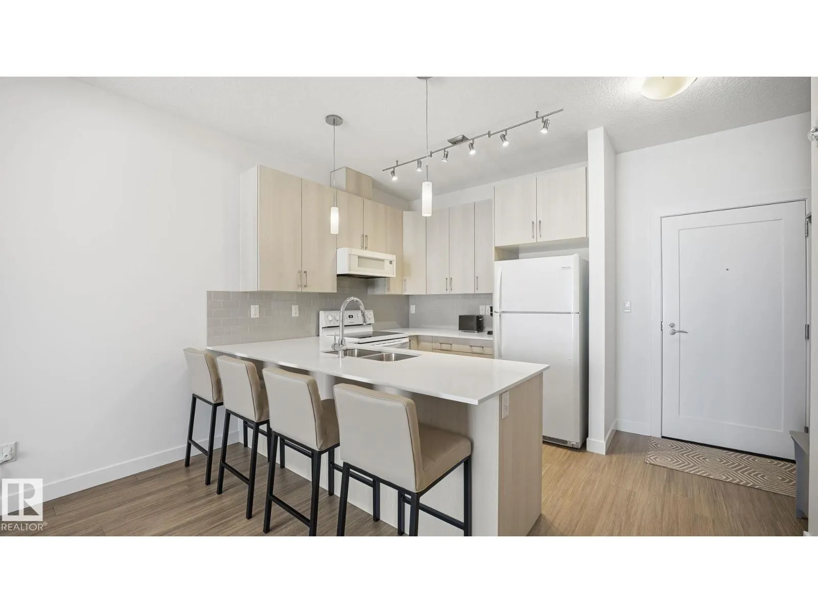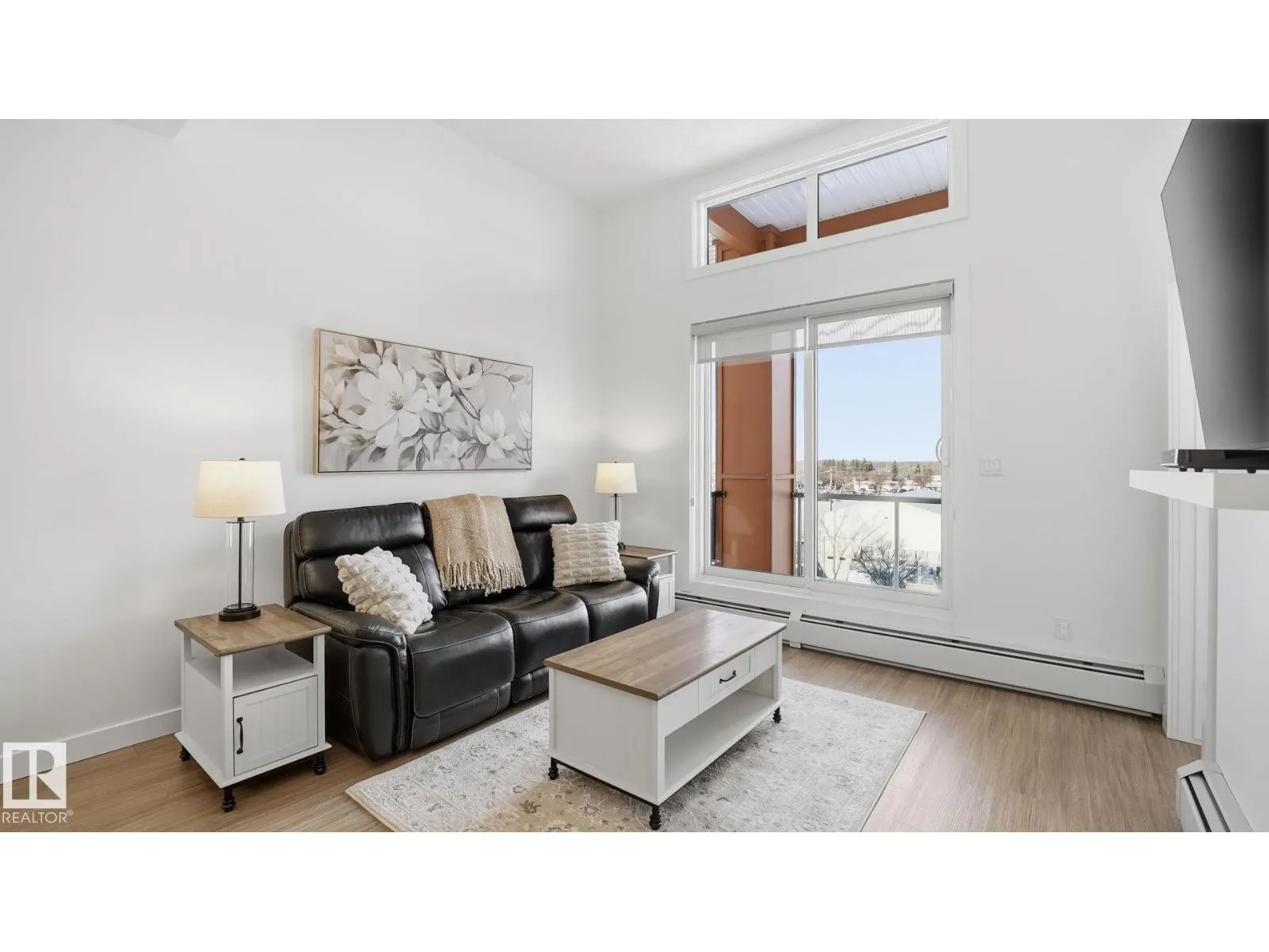 Welcome to The Ridge! Fantastic views in a highly central location this IMMACULATE, freshly painted TOP-FLOOR 2 bedroom/1 bathroom condo blends comfort w/modern elegance in the heart of Devonâsteps from schools, parks, shops, restaurants, outdoor pool, arena, & Devon's scenic river valley trail system. Light & bright, this unit offers an open-concept layout complete w/9' ceilings & 12' vaulted sections, vinyl plank flooring, quartz countertops, featuring a crisp light toned kitchen w/tile backsplash, all appliances & peninsula w/eating bar. 4 pce bathroom conveniently located directly off primary suite. In-suite laundry room w/stackable washer/dryer & plenty of extra storage space. Enjoy a spacious north-facing covered balcony w/N.Gas BBQ hookup. Unit is roughed-in for A/C, includes heat/water & comes w/TITLED underground parking stall #10 complete w/secure storage cage. Truly a RARE find! Don't miss your opportunity to view this beautiful home! (id:27476)