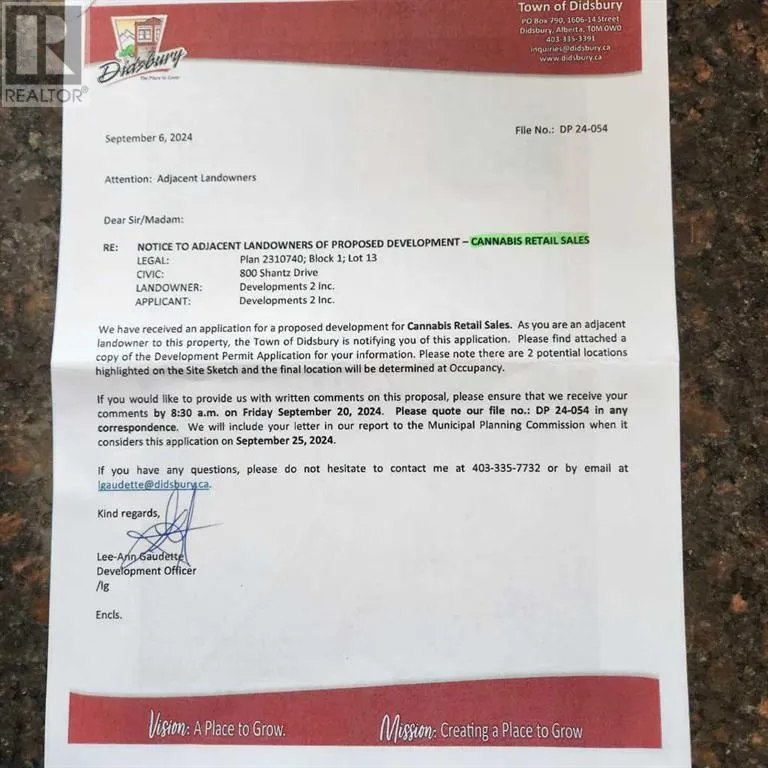 Three commercial lots for sale in Shantz Village Phase 2 totalling 5.98 Acres. Asking price is $299,000 per Acre. Lot 4 (400 Shantz Village 2024 tax: $8,340.00 | Size: 3.010 AC | LINC: 0035569277). Lot 5 (500 Shantz Village 2024 tax: $4,239.44 | Size: 1.530 AC | LINC: 0035569285) Lot 6 (600 Shantz Village 2024 tax: $3,990.09 | Size: 1.440 AC | LINC: 0035569293). Land Use: C-1 General Commercial. Anchored By Buy-Low Foods, Dollarama & Pet Valu. Retail stores, walking paths, mixed use commercial. Proposed LIquor store and Cannabis outlet. Didsbury is located just off of QEII Highway, approx 70 km from the Calgary International Airport, or 47 minutes drive. There is a 9-hole golf course, aquatic centre, two ice rinks, softball/baseball diamonds, parks and playgrounds. There is also a hospital, an RCMP detachment as well as the Olds-Didsbury Airport, primarily for small aircraft, general aviation, and a helipad for STARS air ambulance to land. (id:27476)
