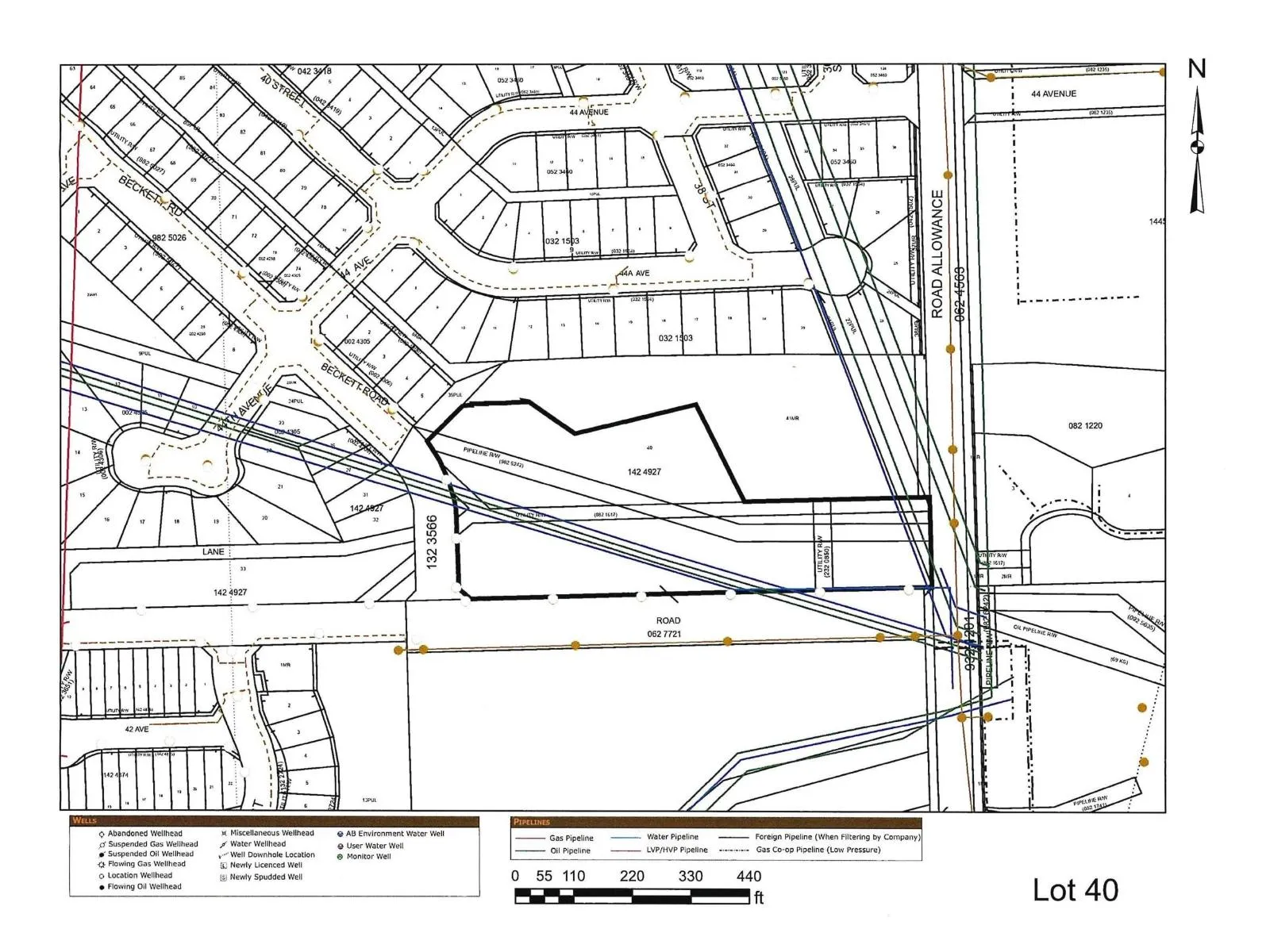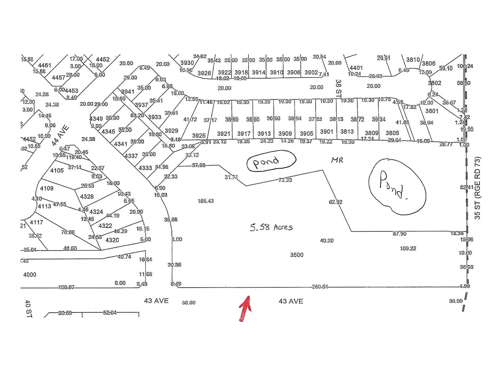 OPPORTUNITY KNOCKING! 5.58 ACRES along the Ring Road and 43 Ave. that takes you close to the schools. It is a corner lot with pavement on three sides. It is zoned as R-Low district. It could be subdivided into 2 parcels or more if you wish. The sewer line runes through the property, water is under the road, and the power is on the property line. The property boarders a municipal reserve which has 2 natural ponds. A beautiful spot to sit and watch and listen to the birds, enjoy the wildlife and have the privacy to enjoy. ANOTHER ADVANTAGE IS THE SURFACE LEASE REVENUE OF $4,000.00 PER YEAR WITH RICOCHET. The pipeline has been abandoned but is still being paid annually unless at some point they reclaim it. CAN'T BEAT THIS PRICE AND SIZE AND LOCATION OF THIS LOT! (id:27476)