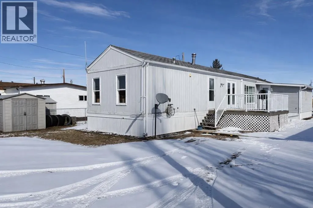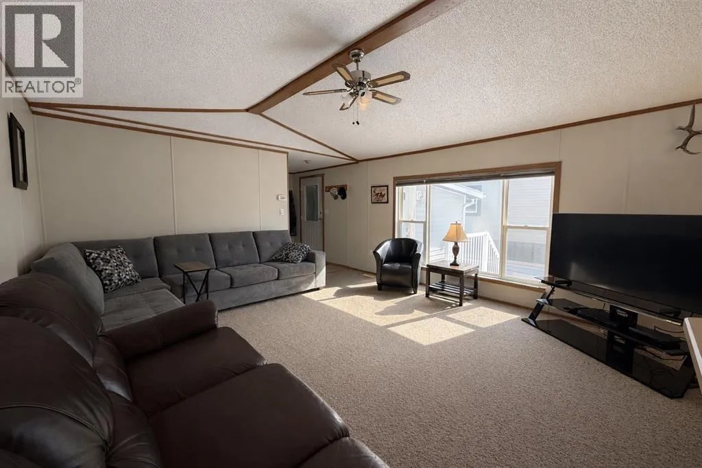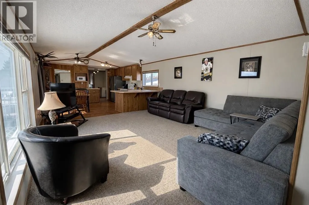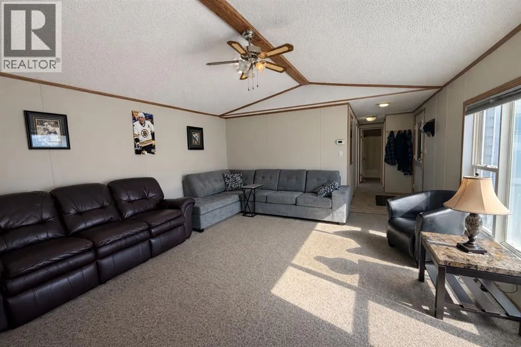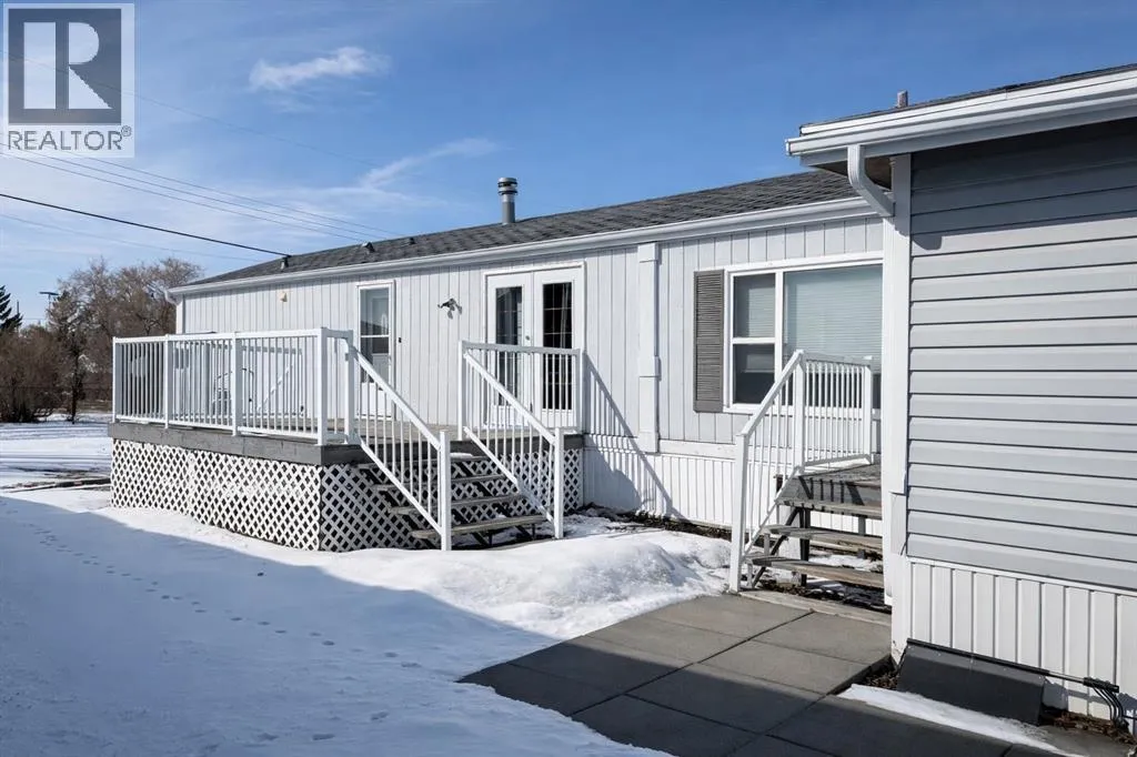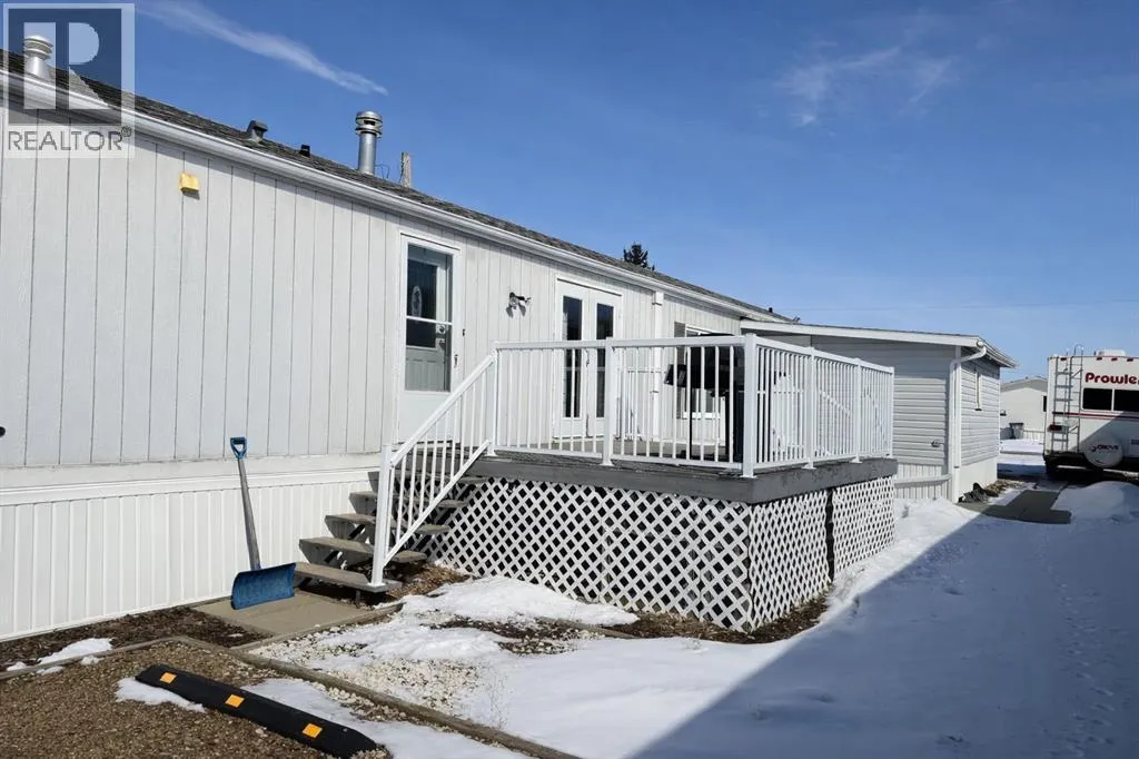 Welcome to this well-maintained mobile home in the quiet community of Edgerton, ideally located directly across from a park and playground with convenient sidewalks right out front. This property offers excellent functionality with a spacious heated front addition that serves as a dual-entry porchâperfect for coats, boots, and extra storage, keeping your main living space clean and organized year-round. Step inside to an inviting open-concept layout featuring vaulted ceilings that create a bright and airy feel throughout. The large living room is filled with natural light from a generous south-facing window and flows seamlessly into the dining area and kitchen, where youâll find ample cupboard and counter space for everyday living. Patio doors off the dinning room provide direct access to the deck, making it easy to enjoy outdoor living. The home features a thoughtful layout with a rear entry that includes laundry and access to the back deck. The primary bedroom is privately situated and offers convenient access to a four-piece bathroomâcreating a semi-ensuite feelâalong with two windows that bring in plenty of natural light. Two additional bedrooms provide flexibility for family, guests, or a home office, including one with an oversized window that enhances the bright and welcoming atmosphere. A second four-piece bathroom serves as the main/guest bath. Outside, youâll appreciate the aluminum-railed decks for low-maintenance enjoyment, as well as a rear parking pad with alley access for added convenience. A great opportunity for affordable living in a family-friendly locationâjust steps from green space and outdoor amenities. (id:27476)