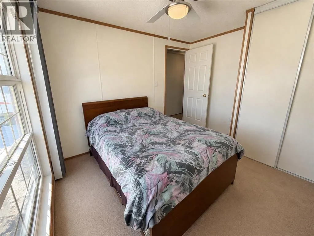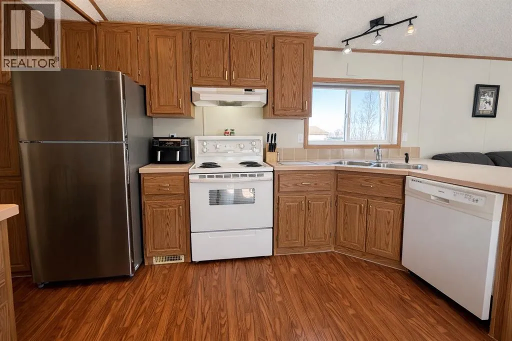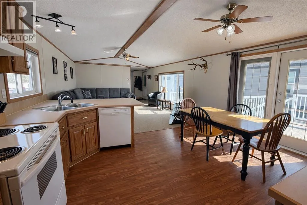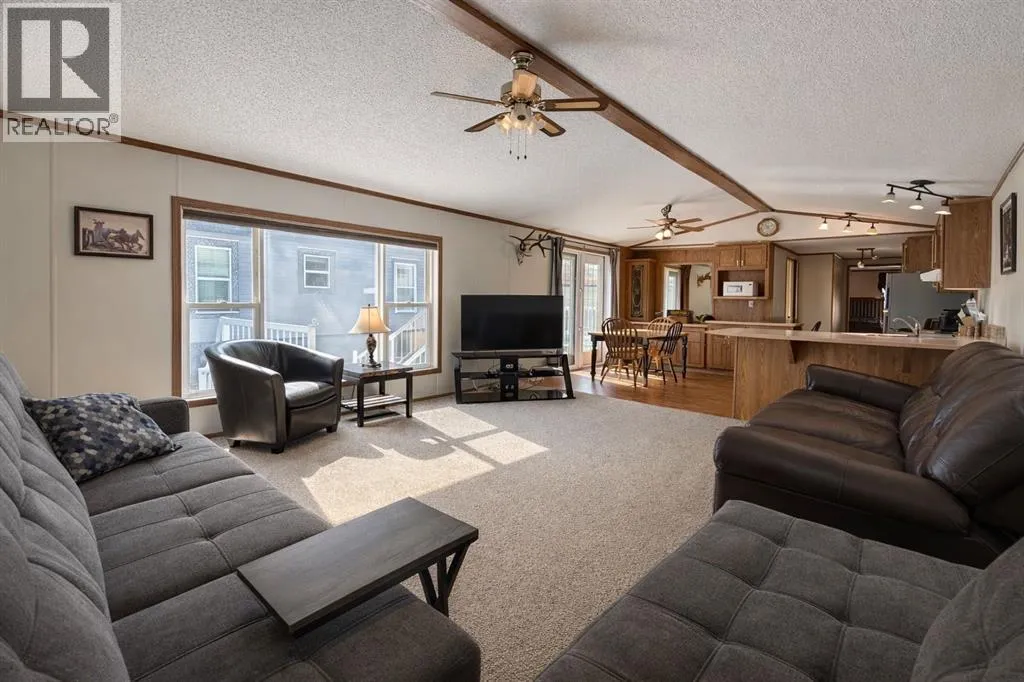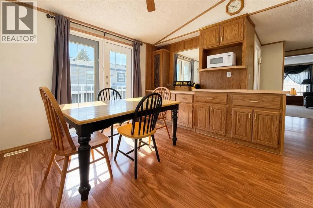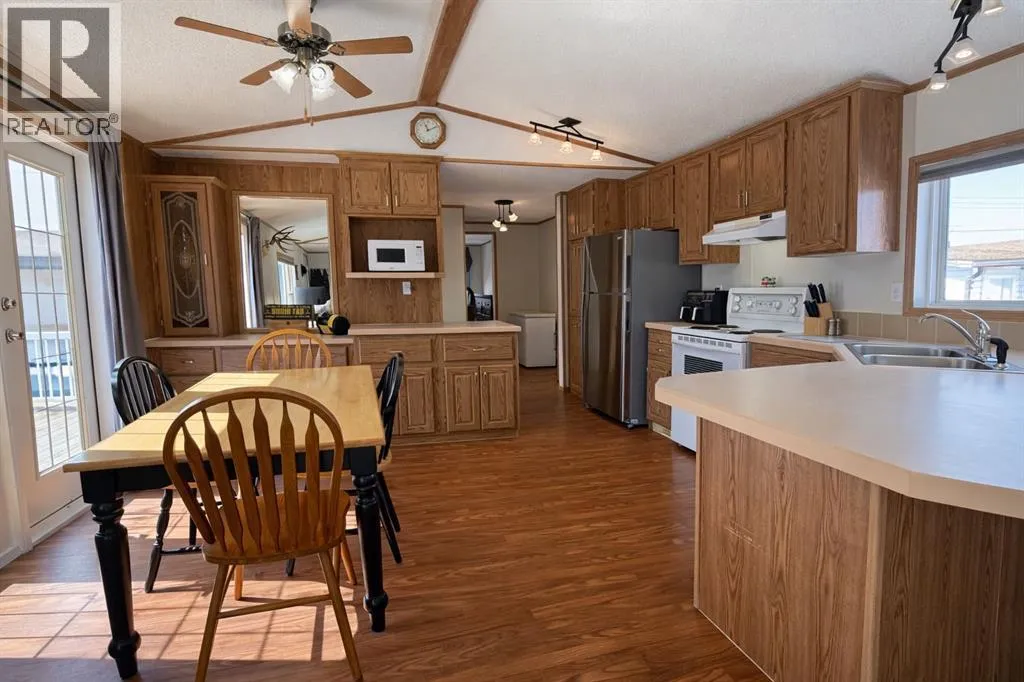 Welcome to this well-maintained mobile home in the quiet community of Edgerton, ideally located directly across from a park and playground with convenient sidewalks right out front. This property offers excellent functionality with a spacious heated front addition that serves as a dual-entry porchâperfect for coats, boots, and extra storage, keeping your main living space clean and organized year-round. Step inside to an inviting open-concept layout featuring vaulted ceilings that create a bright and airy feel throughout. The large living room is filled with natural light from a generous south-facing window and flows seamlessly into the dining area and kitchen, where youâll find ample cupboard and counter space for everyday living. Patio doors off the dinning room provide direct access to the deck, making it easy to enjoy outdoor living. The home features a thoughtful layout with a rear entry that includes laundry and access to the back deck. The primary bedroom is privately situated and offers convenient access to a four-piece bathroomâcreating a semi-ensuite feelâalong with two windows that bring in plenty of natural light. Two additional bedrooms provide flexibility for family, guests, or a home office, including one with an oversized window that enhances the bright and welcoming atmosphere. A second four-piece bathroom serves as the main/guest bath. Outside, youâll appreciate the aluminum-railed decks for low-maintenance enjoyment, as well as a rear parking pad with alley access for added convenience. A great opportunity for affordable living in a family-friendly locationâjust steps from green space and outdoor amenities. (id:27476)