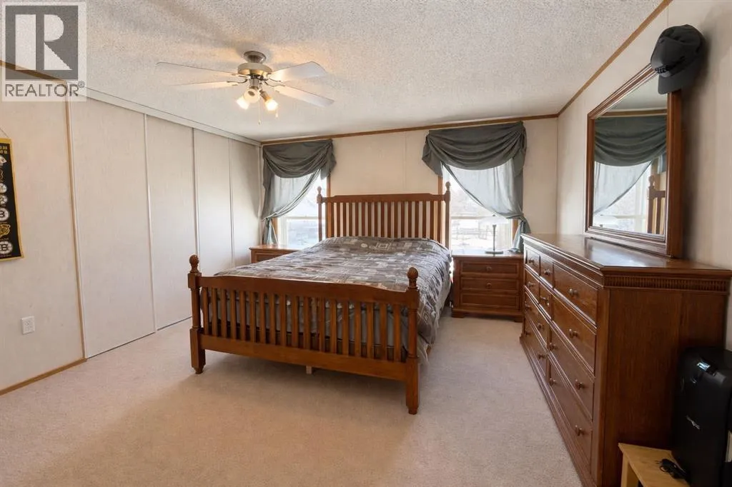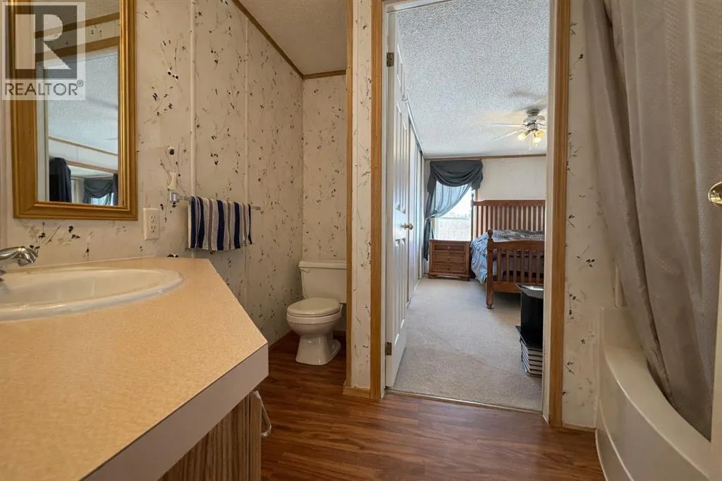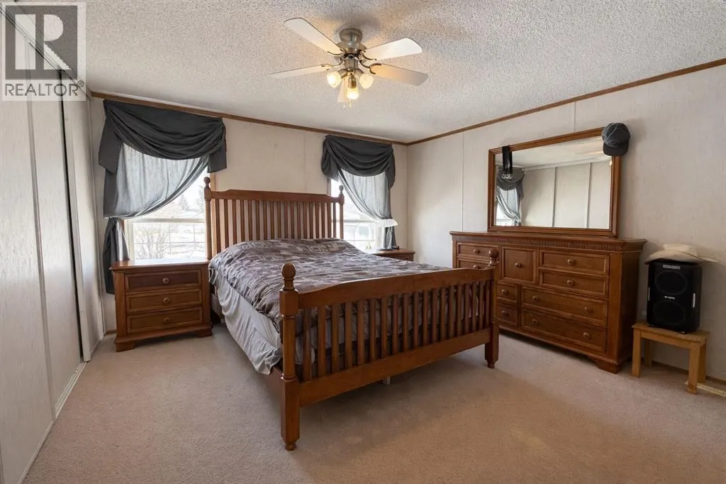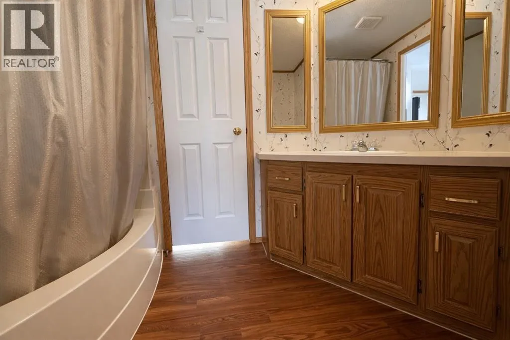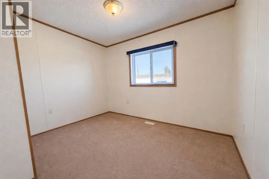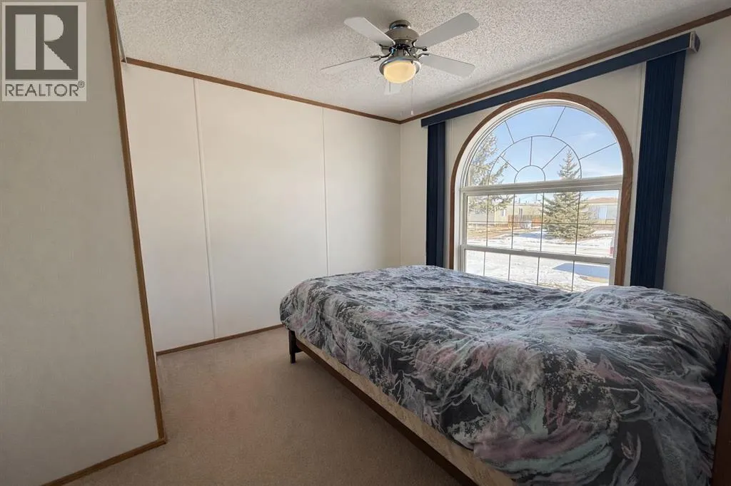 Welcome to this well-maintained mobile home in the quiet community of Edgerton, ideally located directly across from a park and playground with convenient sidewalks right out front. This property offers excellent functionality with a spacious heated front addition that serves as a dual-entry porchâperfect for coats, boots, and extra storage, keeping your main living space clean and organized year-round. Step inside to an inviting open-concept layout featuring vaulted ceilings that create a bright and airy feel throughout. The large living room is filled with natural light from a generous south-facing window and flows seamlessly into the dining area and kitchen, where youâll find ample cupboard and counter space for everyday living. Patio doors off the dinning room provide direct access to the deck, making it easy to enjoy outdoor living. The home features a thoughtful layout with a rear entry that includes laundry and access to the back deck. The primary bedroom is privately situated and offers convenient access to a four-piece bathroomâcreating a semi-ensuite feelâalong with two windows that bring in plenty of natural light. Two additional bedrooms provide flexibility for family, guests, or a home office, including one with an oversized window that enhances the bright and welcoming atmosphere. A second four-piece bathroom serves as the main/guest bath. Outside, youâll appreciate the aluminum-railed decks for low-maintenance enjoyment, as well as a rear parking pad with alley access for added convenience. A great opportunity for affordable living in a family-friendly locationâjust steps from green space and outdoor amenities. (id:27476)