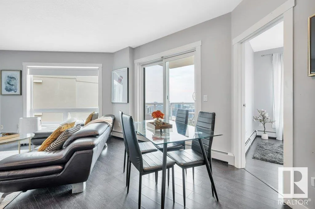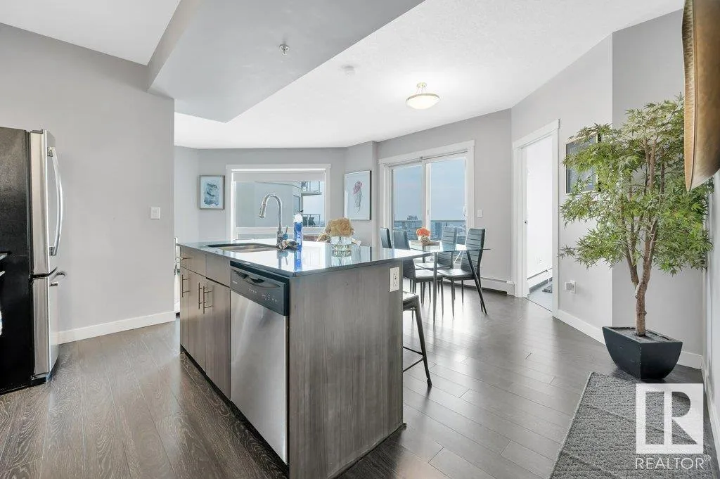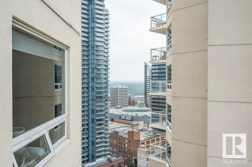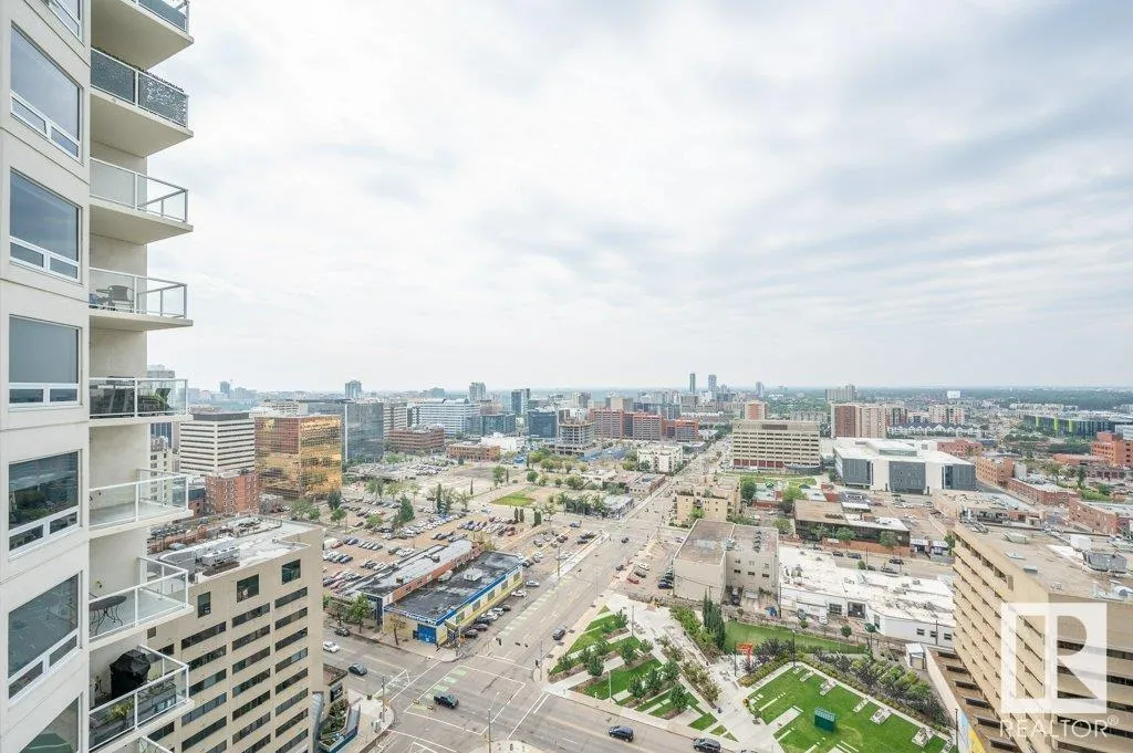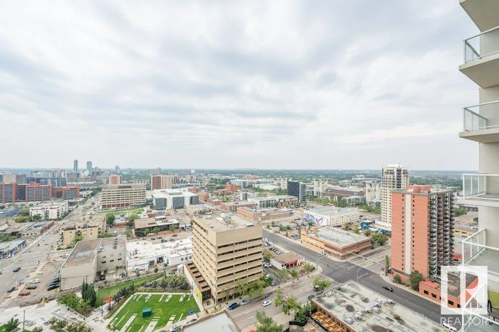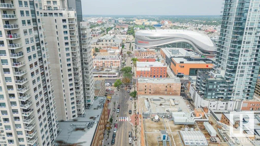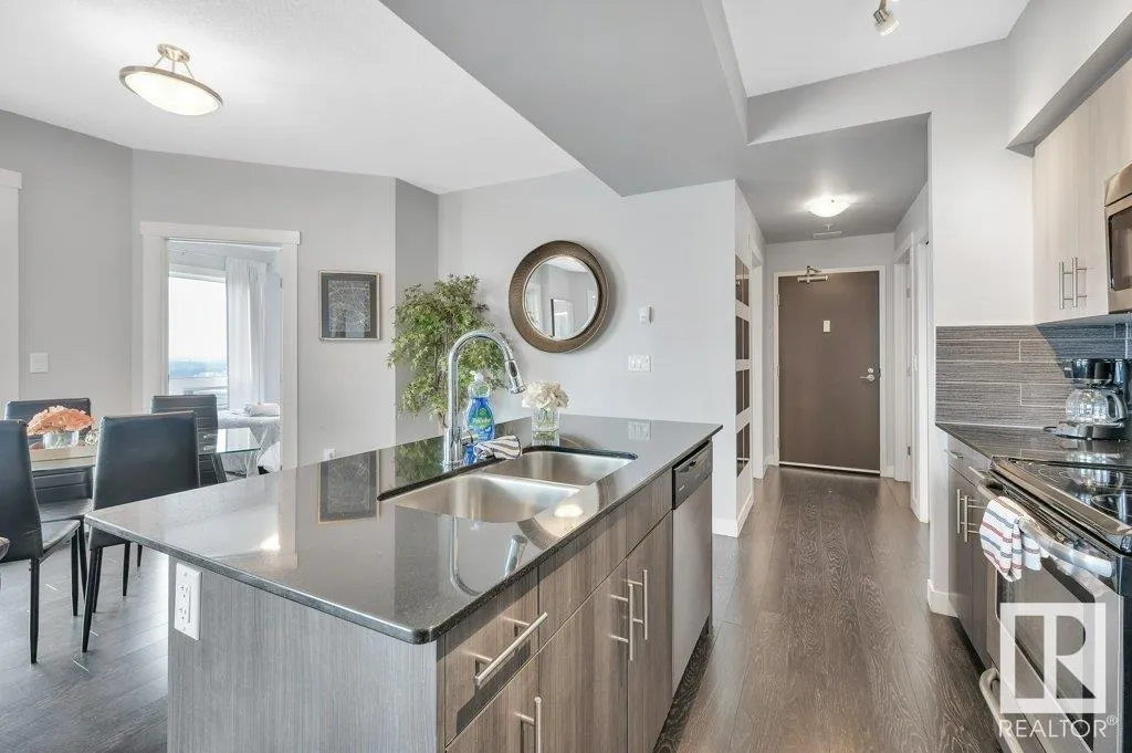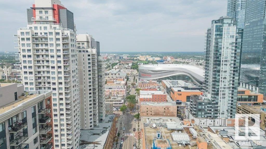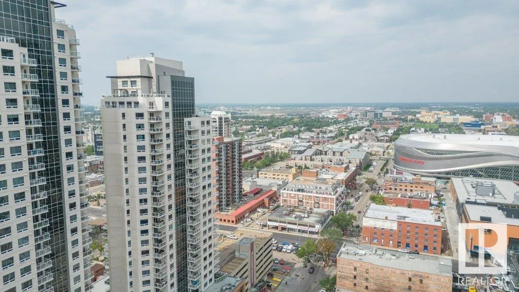 Spacious 2-bedroom, 2-bathroom condo in Fox One, just one block from Rogers Place! This modern unit features an open-concept layout with a bright living room, dining area, and a stylish kitchen with a large, functional island. The foyer is flanked by a 4-piece main bathroom and a convenient laundry room. The primary bedroom boasts a walk-in closet and a 4-piece ensuite, while the second bedroom is located just off the dining area. Enjoy plenty of natural light and breathtaking downtown views from your private 21st-floor balcony. This unit also includes a heated parking stall and heated visitor parking. With a dog park across the street and an array of restaurants and shops within walking distance, this is urban living at its finest! (id:27476)