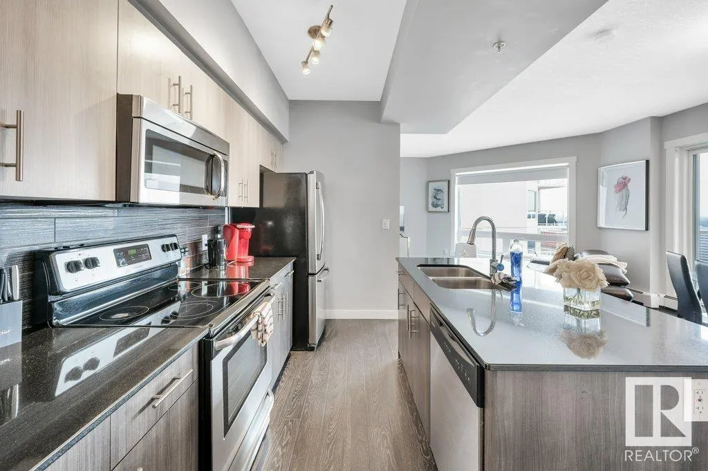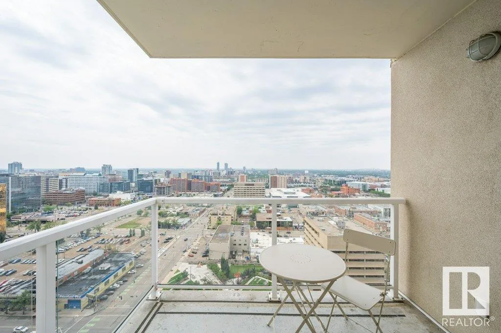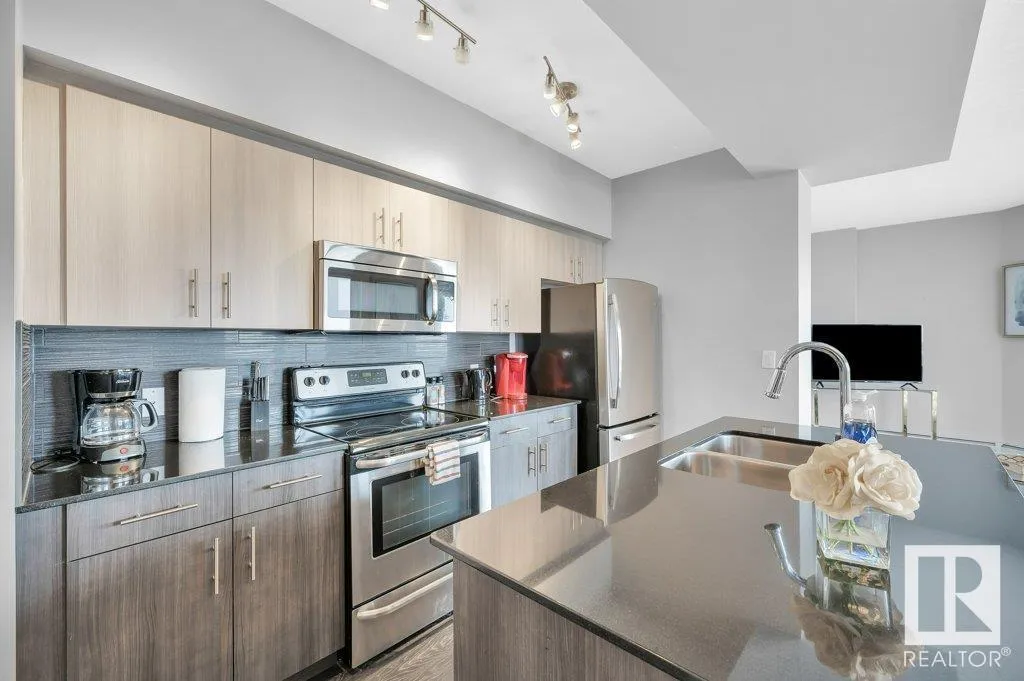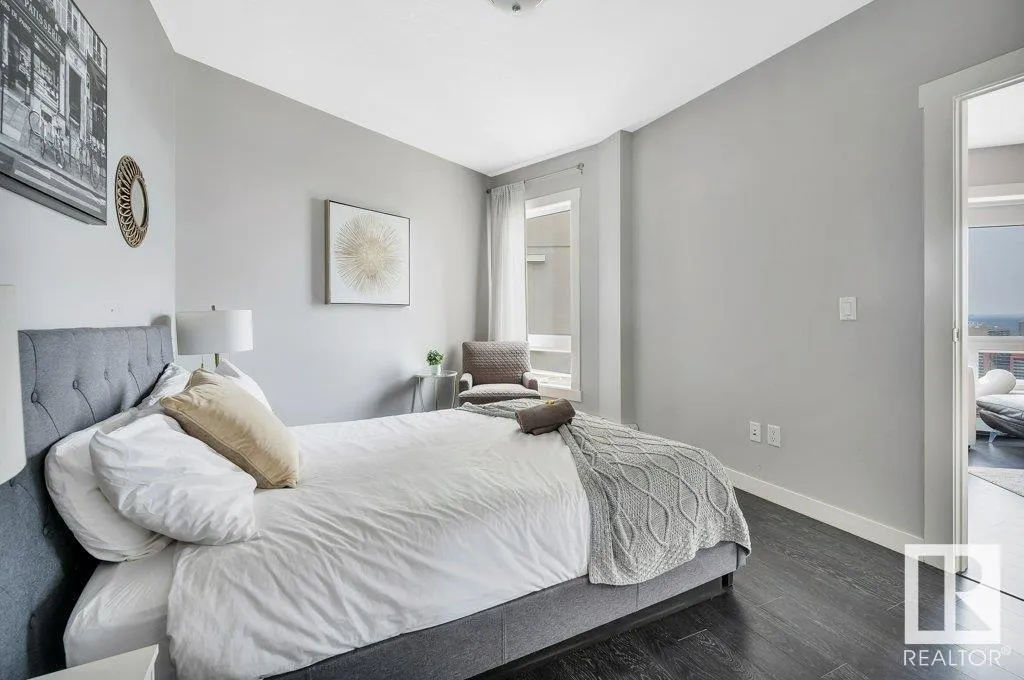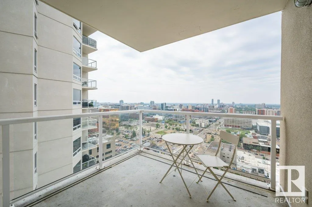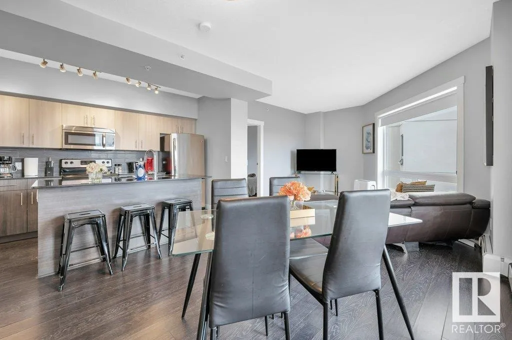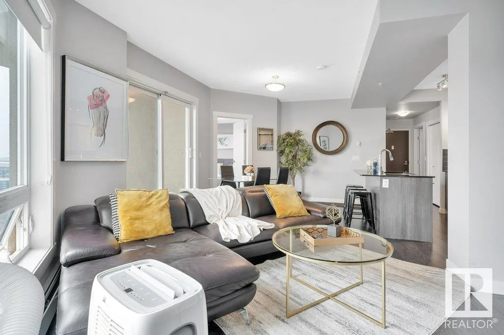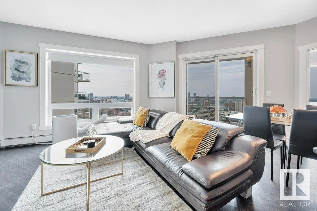 Spacious 2-bedroom, 2-bathroom condo in Fox One, just one block from Rogers Place! This modern unit features an open-concept layout with a bright living room, dining area, and a stylish kitchen with a large, functional island. The foyer is flanked by a 4-piece main bathroom and a convenient laundry room. The primary bedroom boasts a walk-in closet and a 4-piece ensuite, while the second bedroom is located just off the dining area. Enjoy plenty of natural light and breathtaking downtown views from your private 21st-floor balcony. This unit also includes a heated parking stall and heated visitor parking. With a dog park across the street and an array of restaurants and shops within walking distance, this is urban living at its finest! (id:27476)