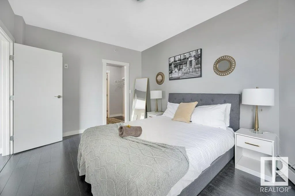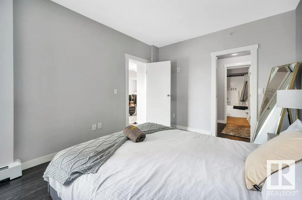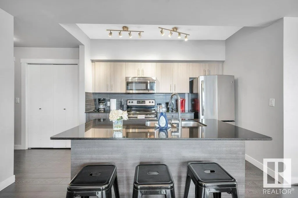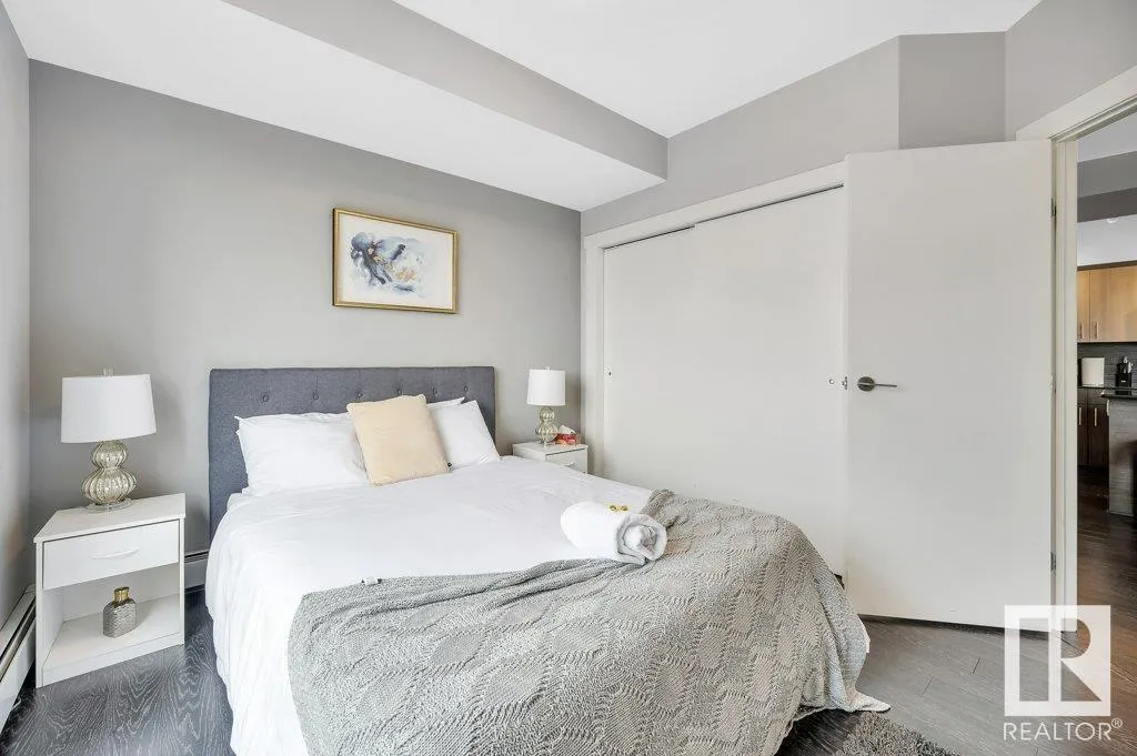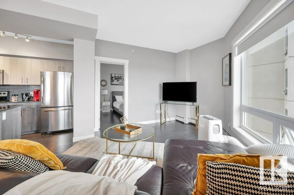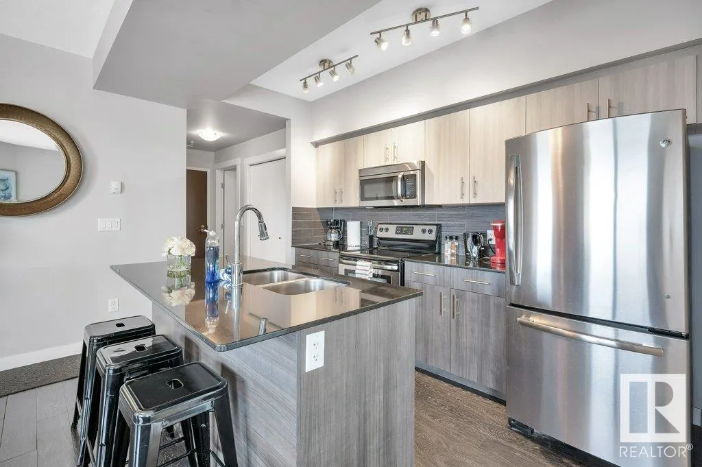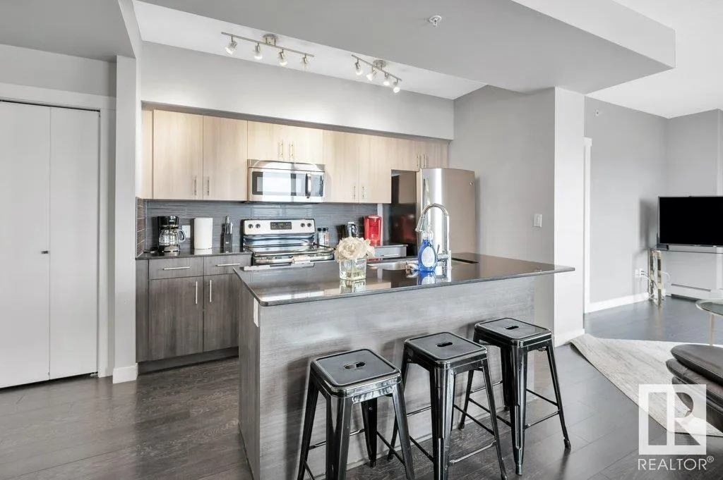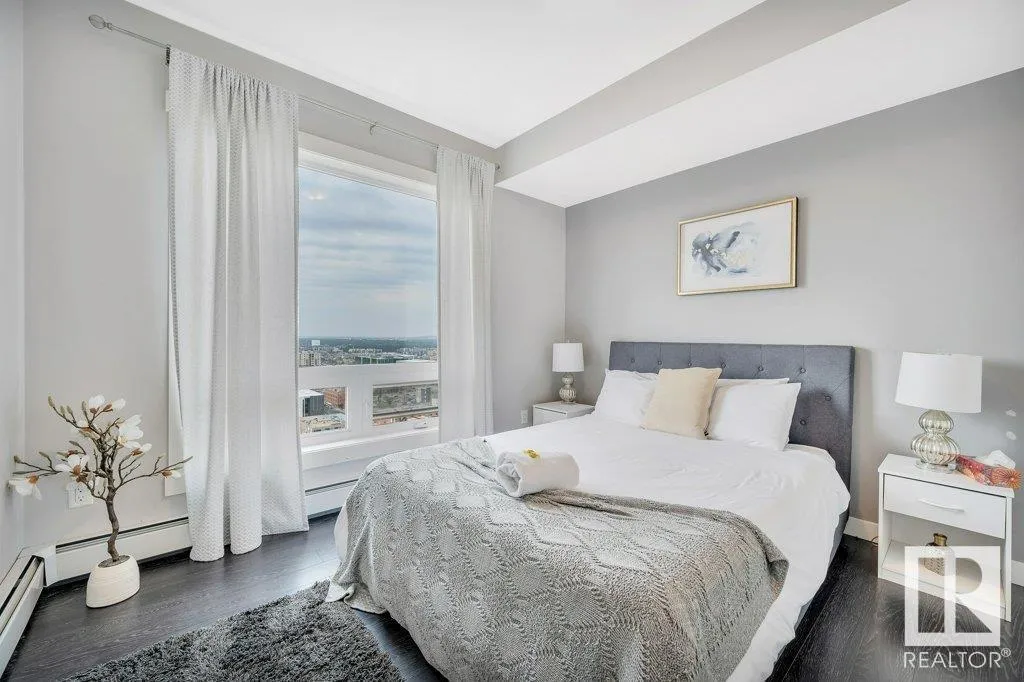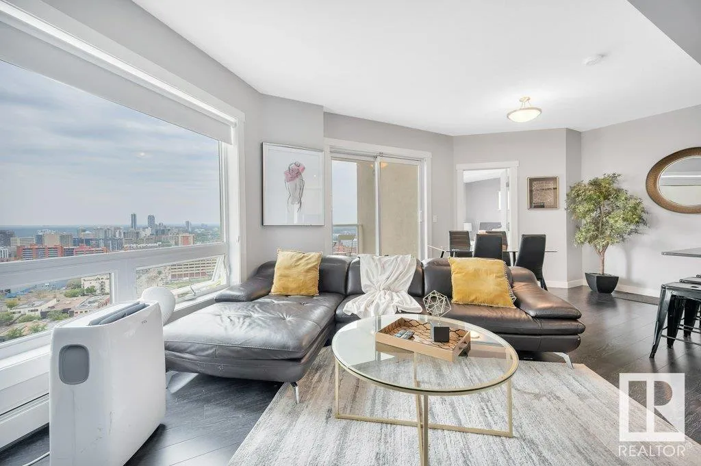 Spacious 2-bedroom, 2-bathroom condo in Fox One, just one block from Rogers Place! This modern unit features an open-concept layout with a bright living room, dining area, and a stylish kitchen with a large, functional island. The foyer is flanked by a 4-piece main bathroom and a convenient laundry room. The primary bedroom boasts a walk-in closet and a 4-piece ensuite, while the second bedroom is located just off the dining area. Enjoy plenty of natural light and breathtaking downtown views from your private 21st-floor balcony. This unit also includes a heated parking stall and heated visitor parking. With a dog park across the street and an array of restaurants and shops within walking distance, this is urban living at its finest! (id:27476)
