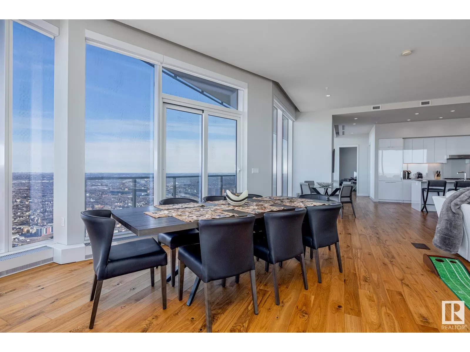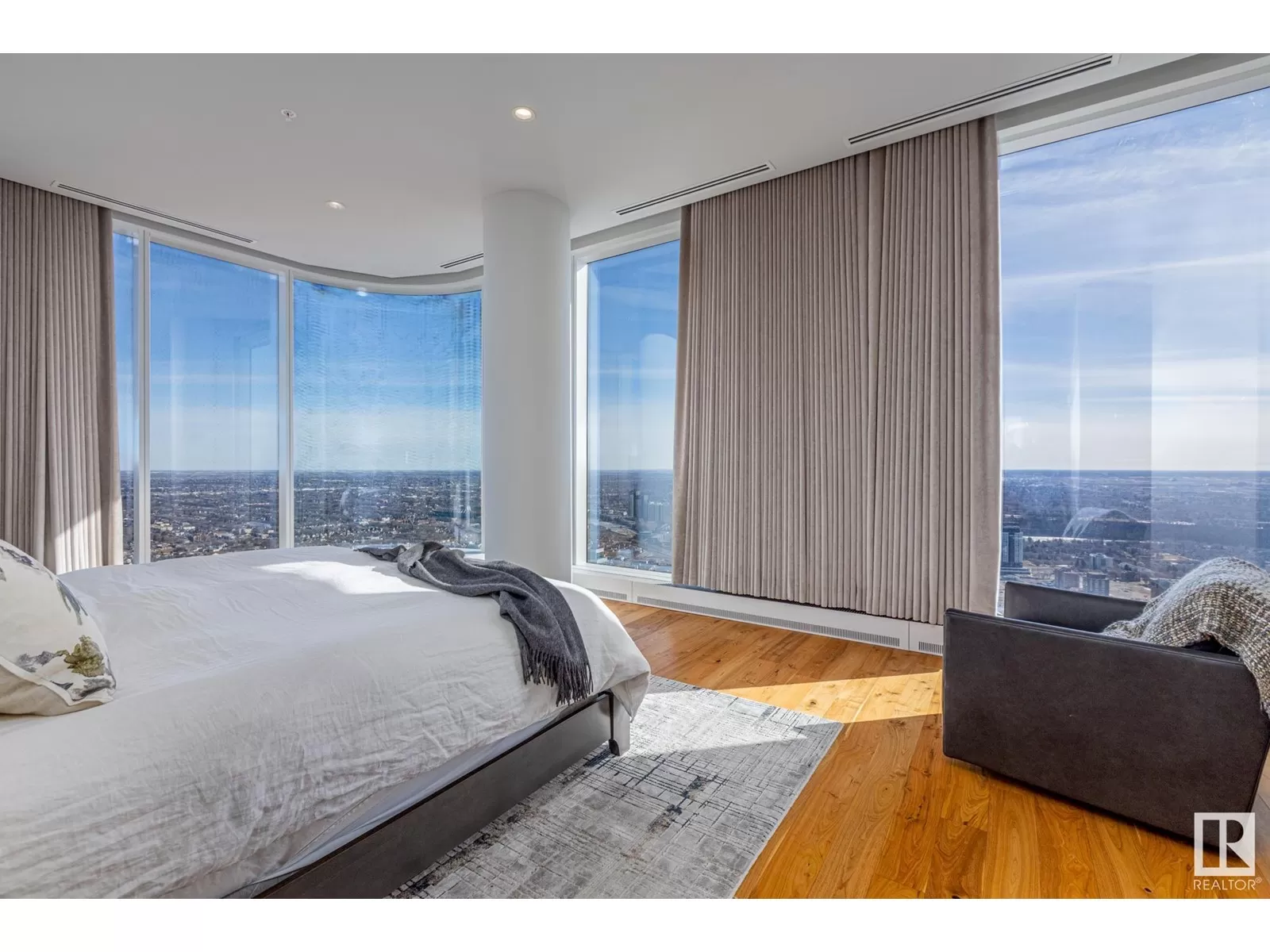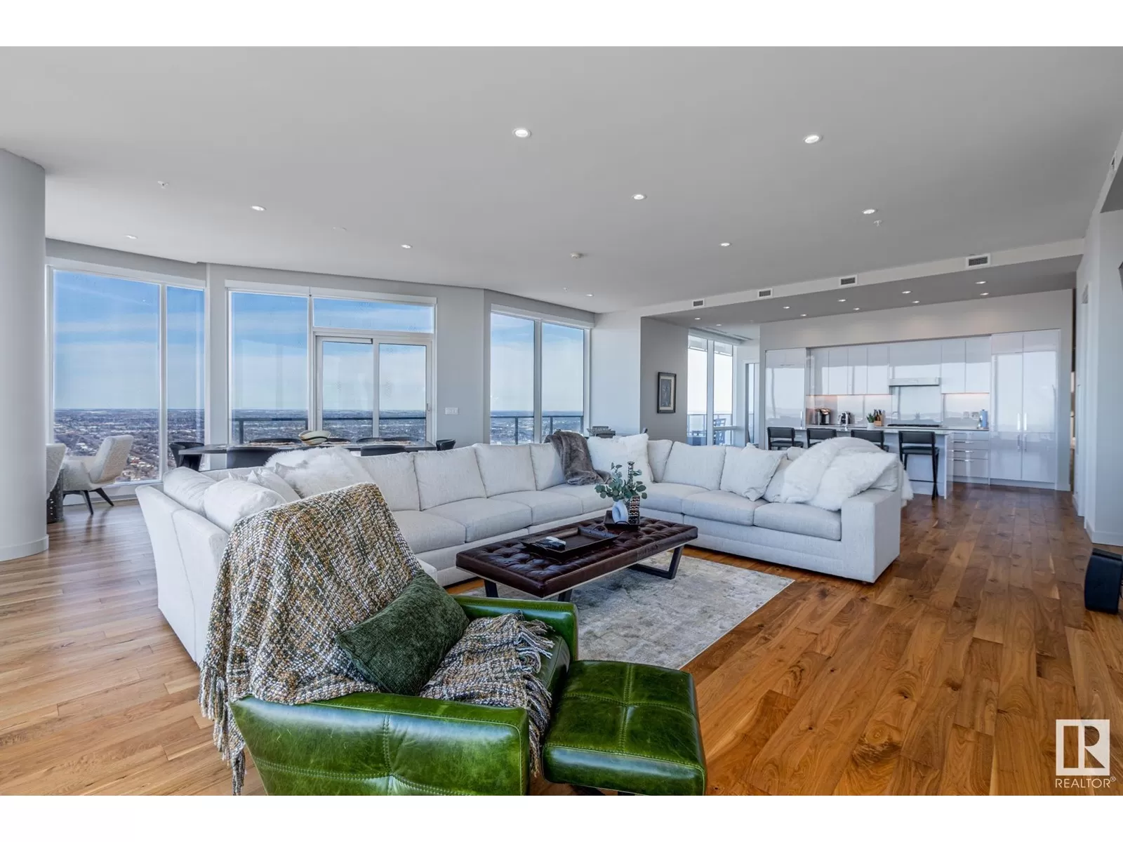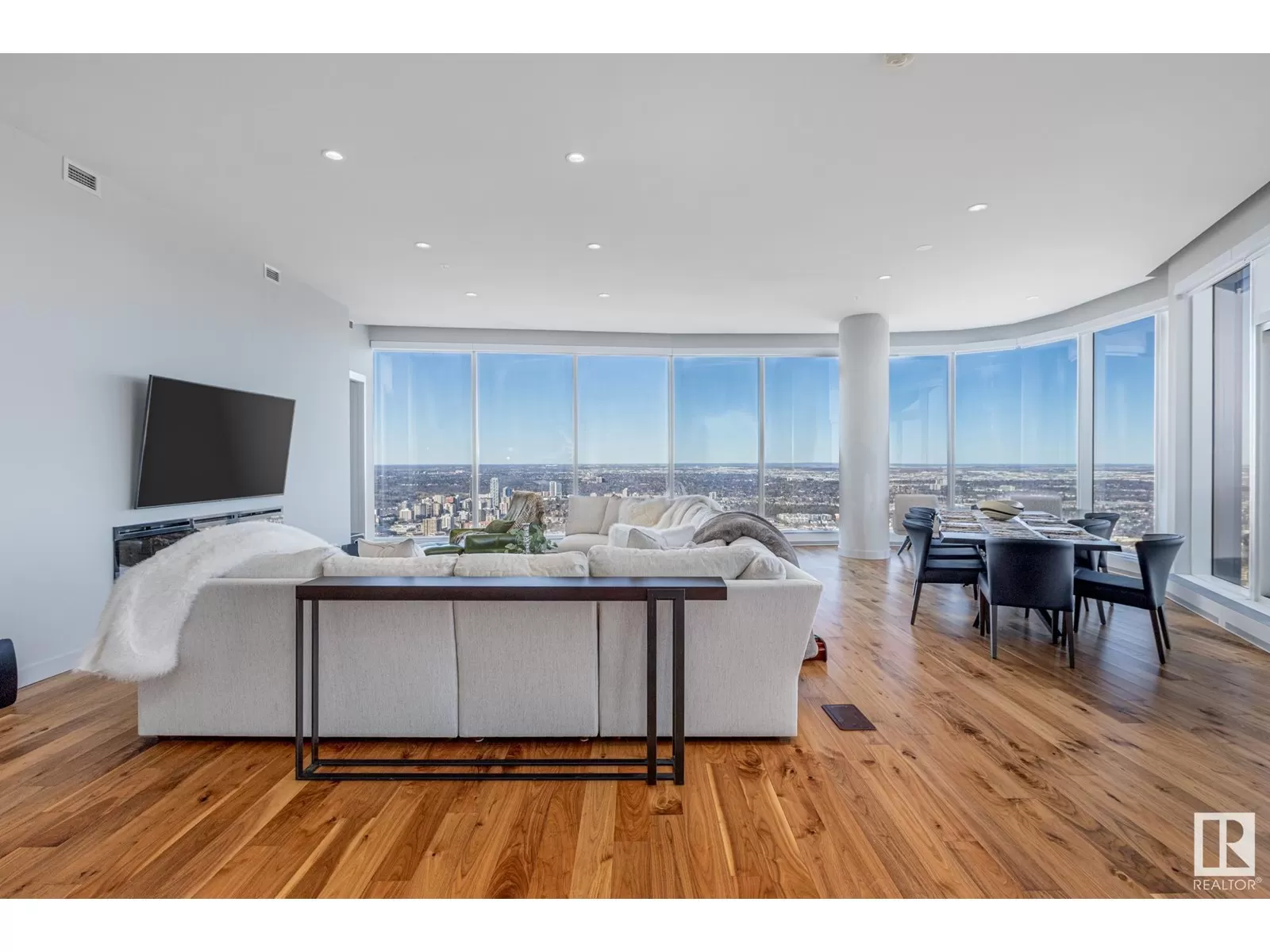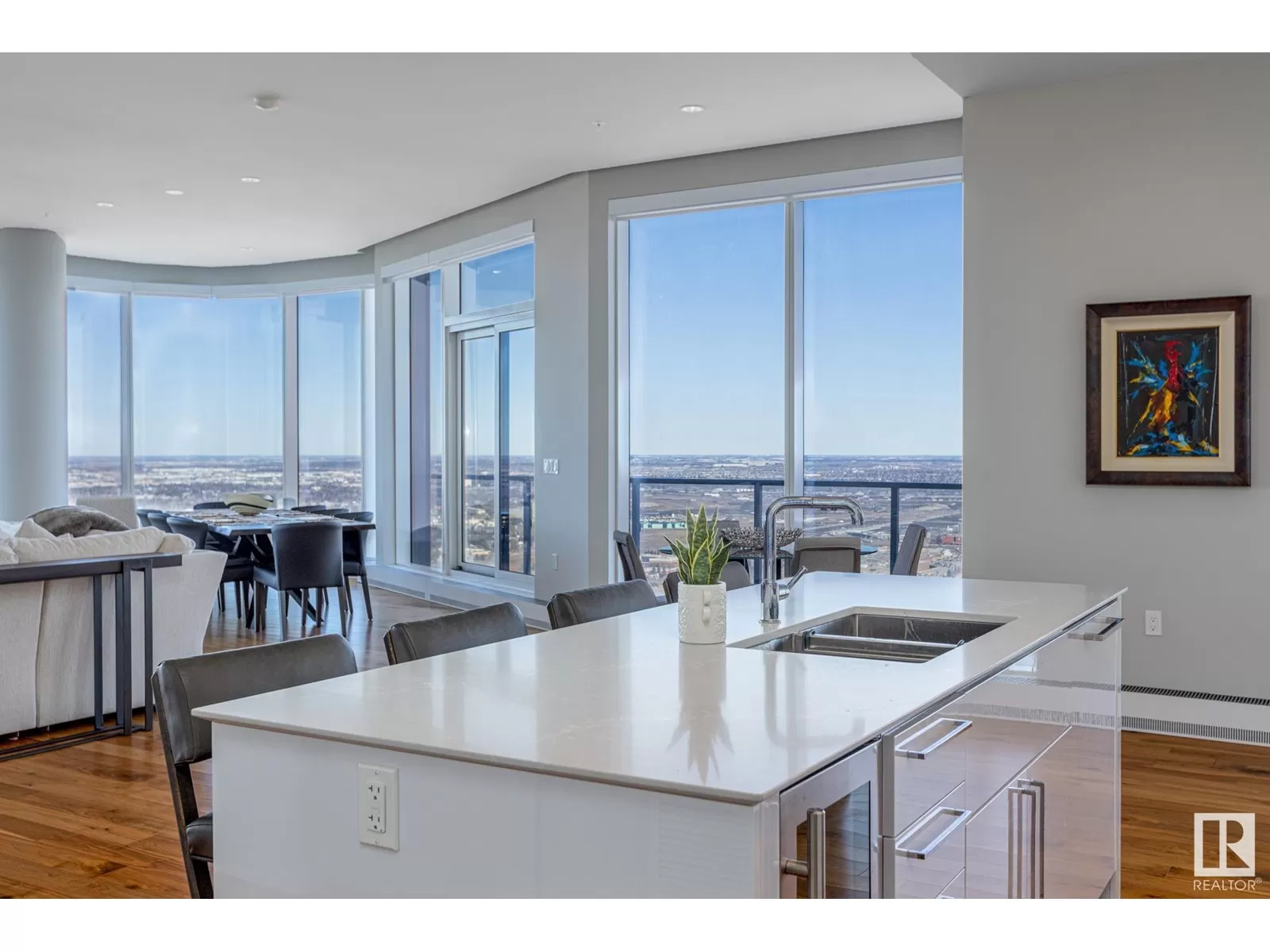 Amazing opportunity to own this fully furnished 52nd floor penthouse in Edmonton's most exclusive condo development, The Legends Private Residences. This spacious & well-designed floorplan has over 3,300 sf of living space which extends to a 730 sf covered terrace. Expansive window walls throughout allows light to cascade through this incredible suite. 270 degree view! Premium features include; 10 ft ceilings, hardwood flooring, 2 primary bedrooms with ensuites, spacious den with wet bar, roomy office space, 2 & 1/2 baths, premium appliance package, power window coverings and much more!! 3 underground parking stalls & storage space included! Located in the heart of ICE District with a walk-indoor experience pedway directly to Rogers Place. World class JW Marriott shared facilities include; relaxing spa with indoor pool & steam room, ARCHETYPE fitness membership, 24/7 concierge & security, valet and dining services available. Truly a living experience that is unmatched in the City of Edmonton! (id:27476)
