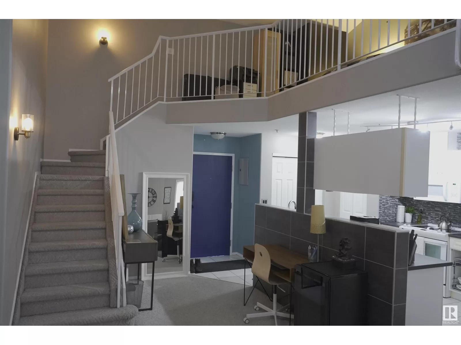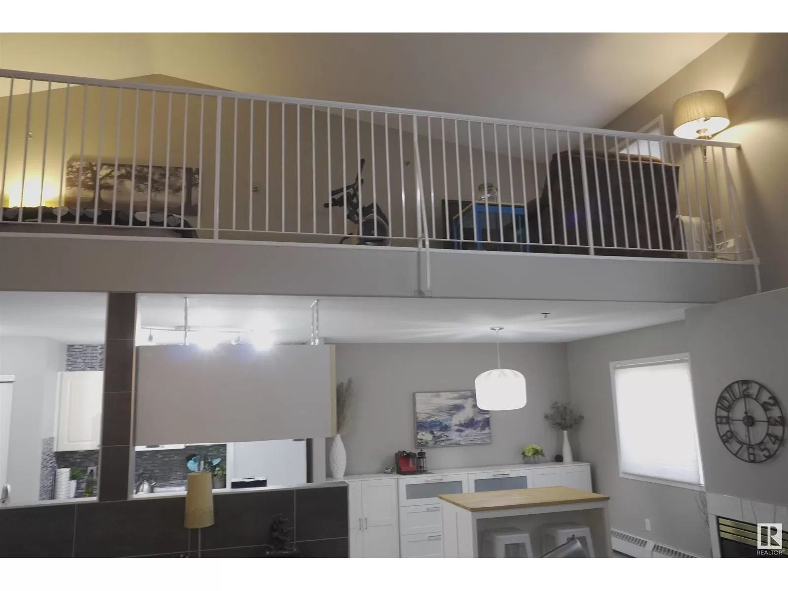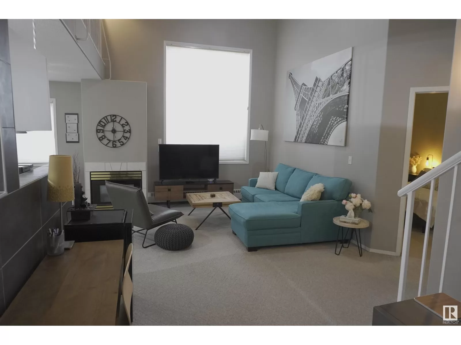 Welcome to this top floor Jefferson Lofts condo. A bright open loft with 17 ft ceilings. The living room features a natural gas fireplace, dining area offers extra built in shelving, and spacious open kitchen. Master bedroom has a massive walk thru closet and 4 piece ensuite. The loft area can be used as a second bedroom or versatile work/bonus space. You also have a second bathroom and in-suite laundry. One underground titled parking stall. Walking distance to Macewan, Rogers Arena and Ice District. You have to check this one out. (id:27476)