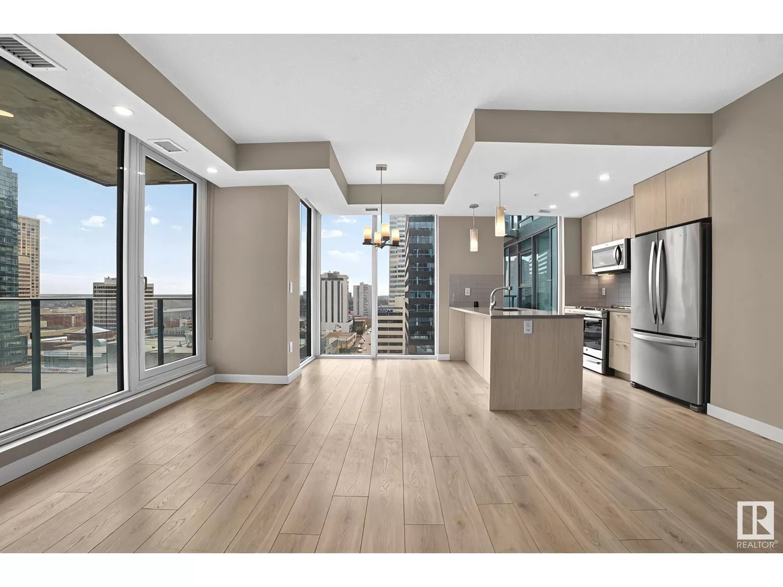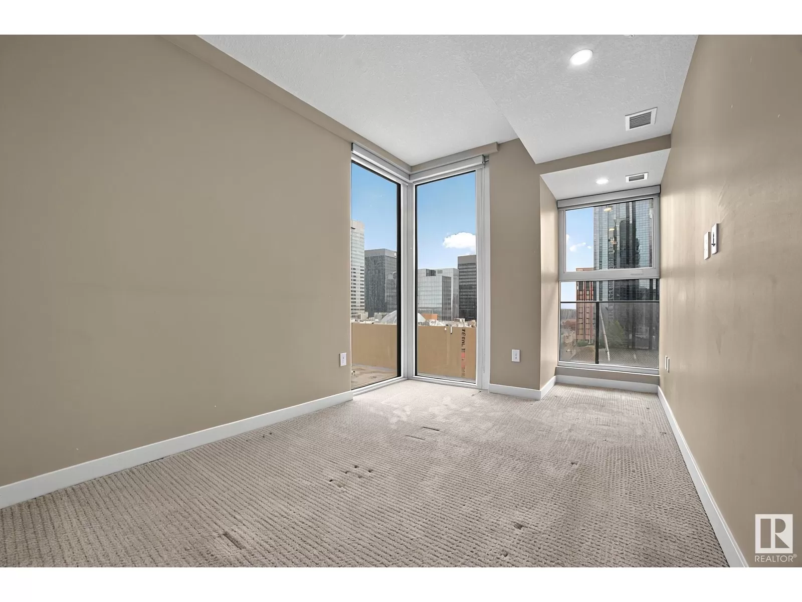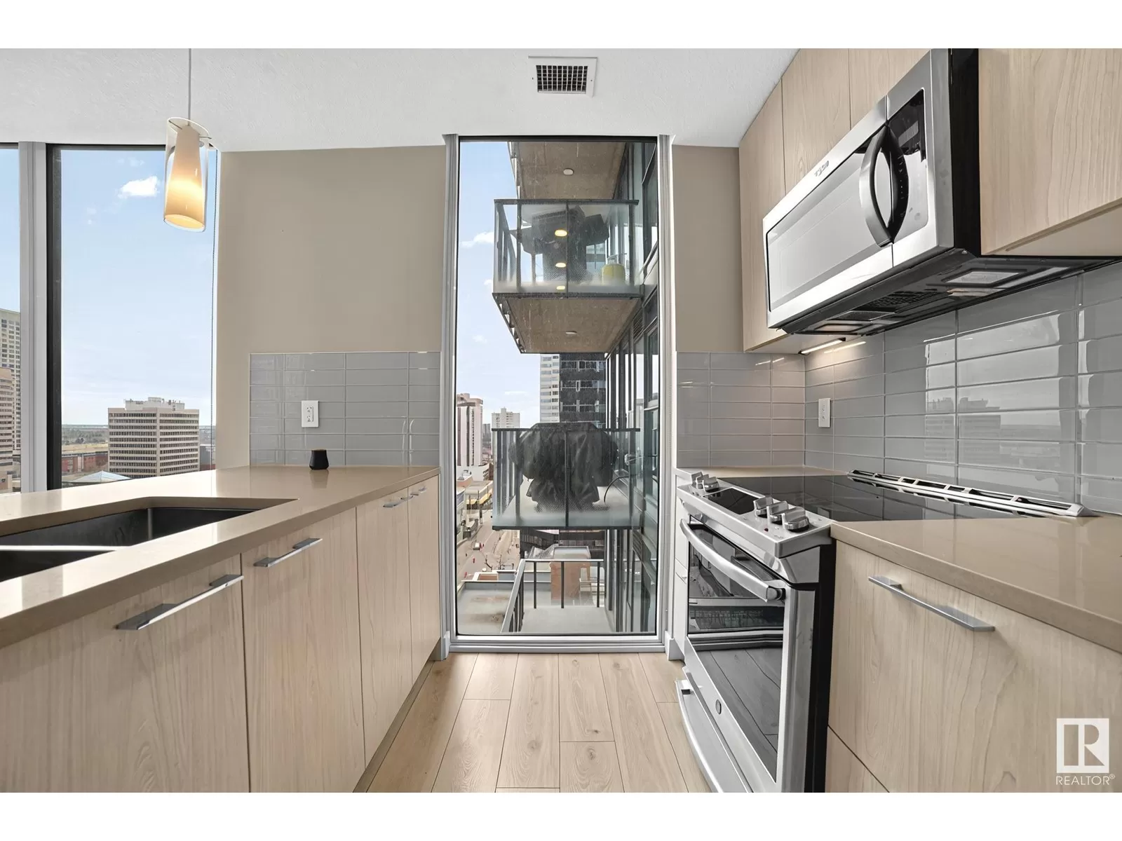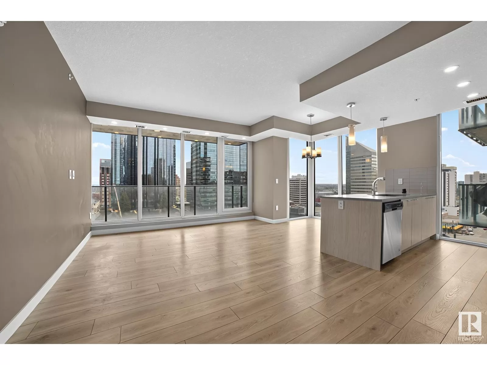 Experience unparalleled luxury in this exquisite residence located in the coveted Encore Tower. Situated in a Walker's Paradise, everything from dining, shopping, and Roger's Arena are just steps away. This suite features floor-to-ceiling windows offering an abundance of natural light, stunning views of downtown Edmonton, and a convenient grand 20-foot balcony. The modern kitchen features full-size Whirlpool appliances, and sleek quartz countertops, while the spacious interiors are designed for both comfort and style with elegant roller-shades and durable laminate flooring. Relax and enjoy premium amenities including a fitness center to maintain an active lifestyle, concierge service for personalized assistance, and both indoor and outdoor lounges complete with fireplace and an extended bar. Heated underground parking with dedicated storage adds convenience to daily living. Whether you're an investor or seeking vibrant downtown living,this property is the perfect urban retreat.Don't miss this opportunity! (id:27476)