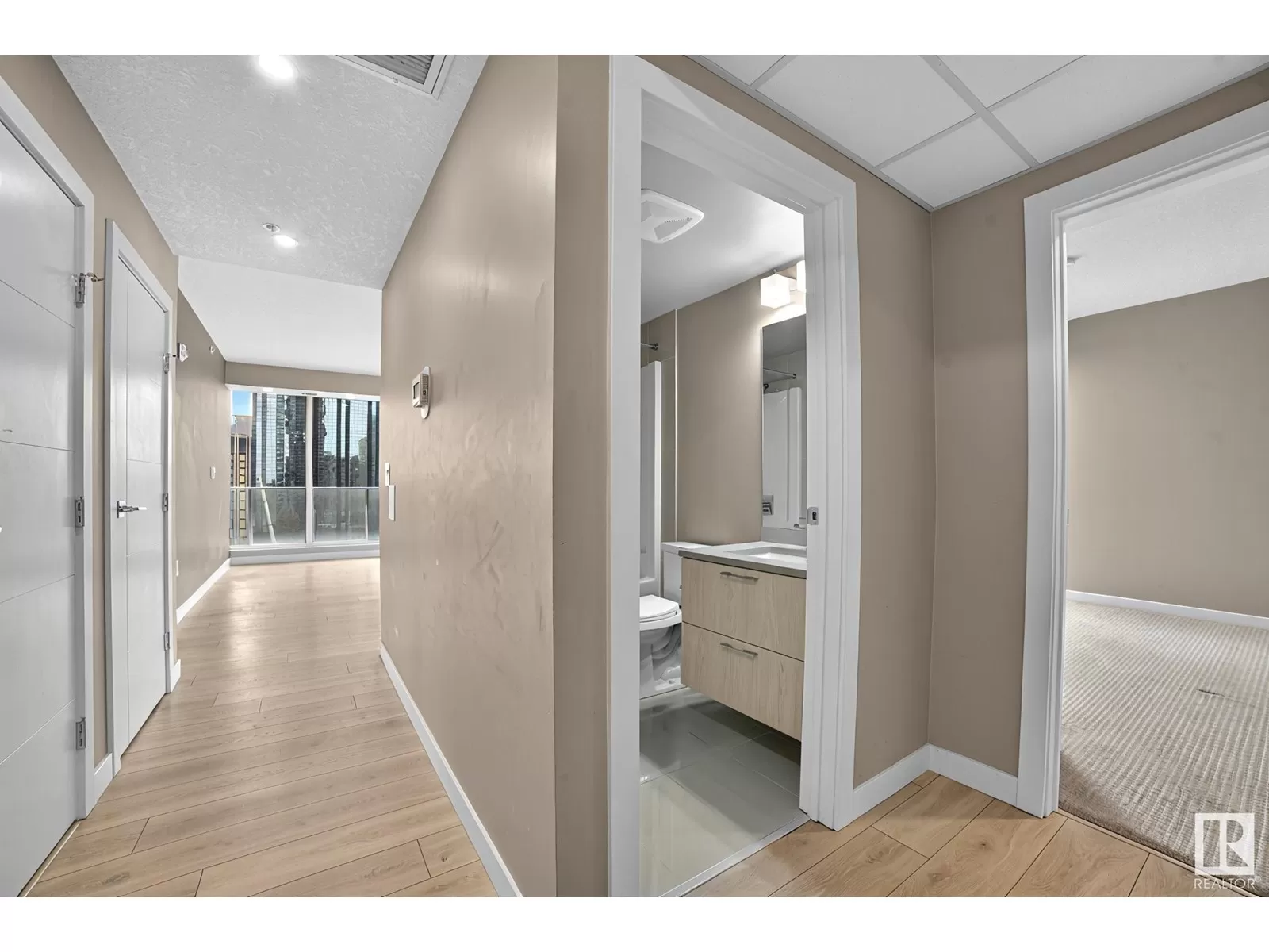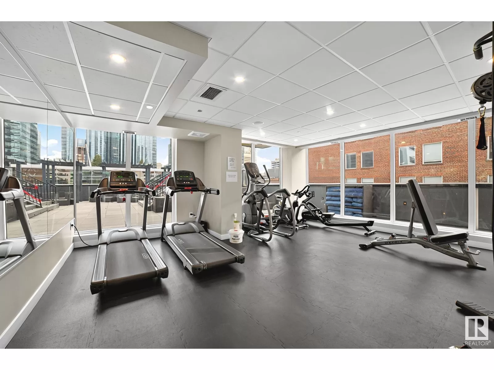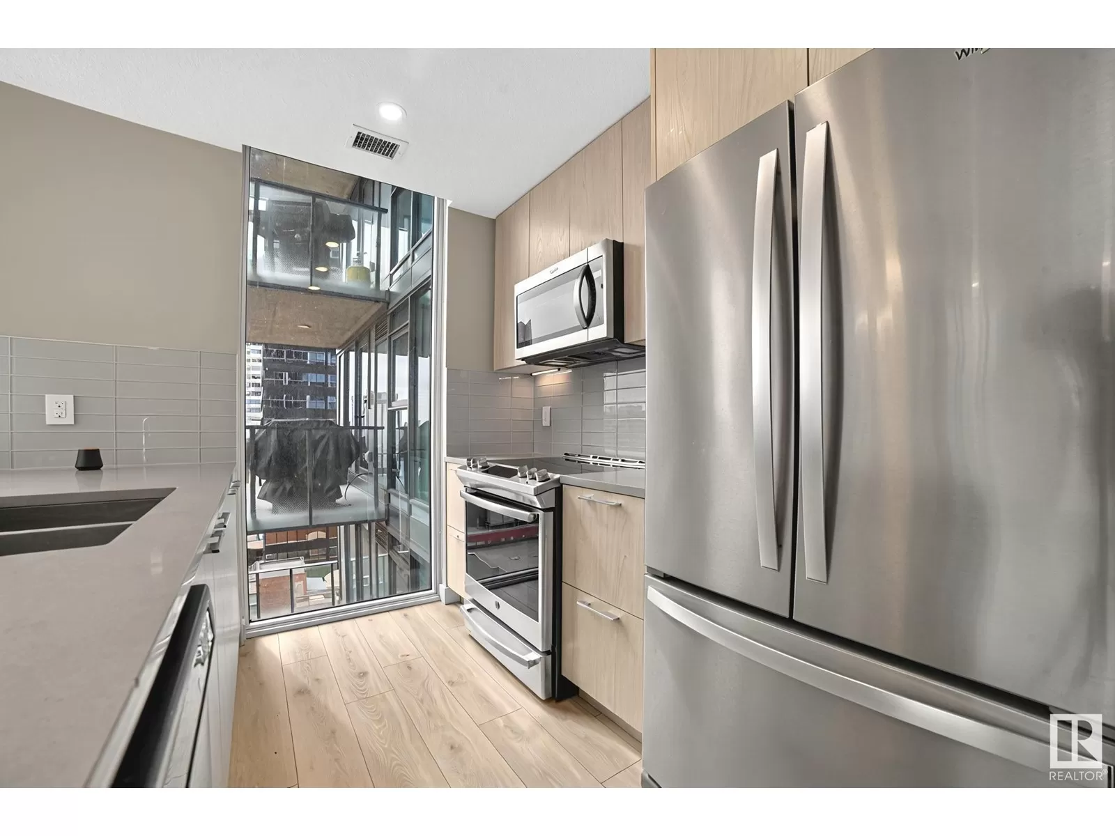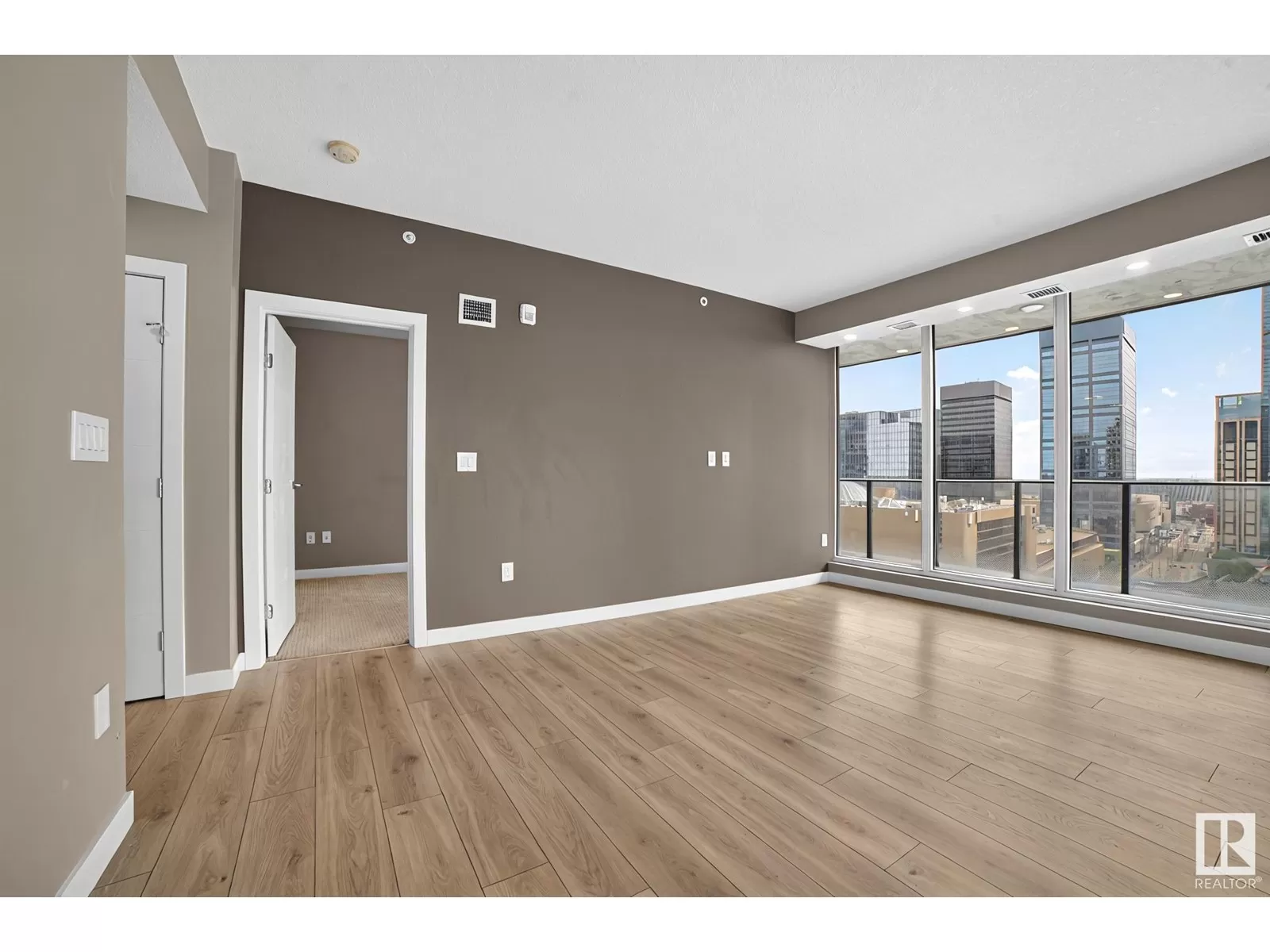 Experience unparalleled luxury in this exquisite residence located in the coveted Encore Tower. Situated in a Walker's Paradise, everything from dining, shopping, and Roger's Arena are just steps away. This suite features floor-to-ceiling windows offering an abundance of natural light, stunning views of downtown Edmonton, and a convenient grand 20-foot balcony. The modern kitchen features full-size Whirlpool appliances, and sleek quartz countertops, while the spacious interiors are designed for both comfort and style with elegant roller-shades and durable laminate flooring. Relax and enjoy premium amenities including a fitness center to maintain an active lifestyle, concierge service for personalized assistance, and both indoor and outdoor lounges complete with fireplace and an extended bar. Heated underground parking with dedicated storage adds convenience to daily living. Whether you're an investor or seeking vibrant downtown living,this property is the perfect urban retreat.Don't miss this opportunity! (id:27476)