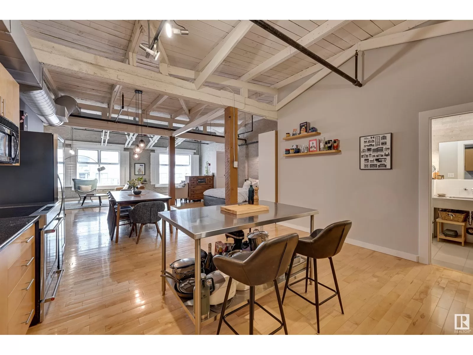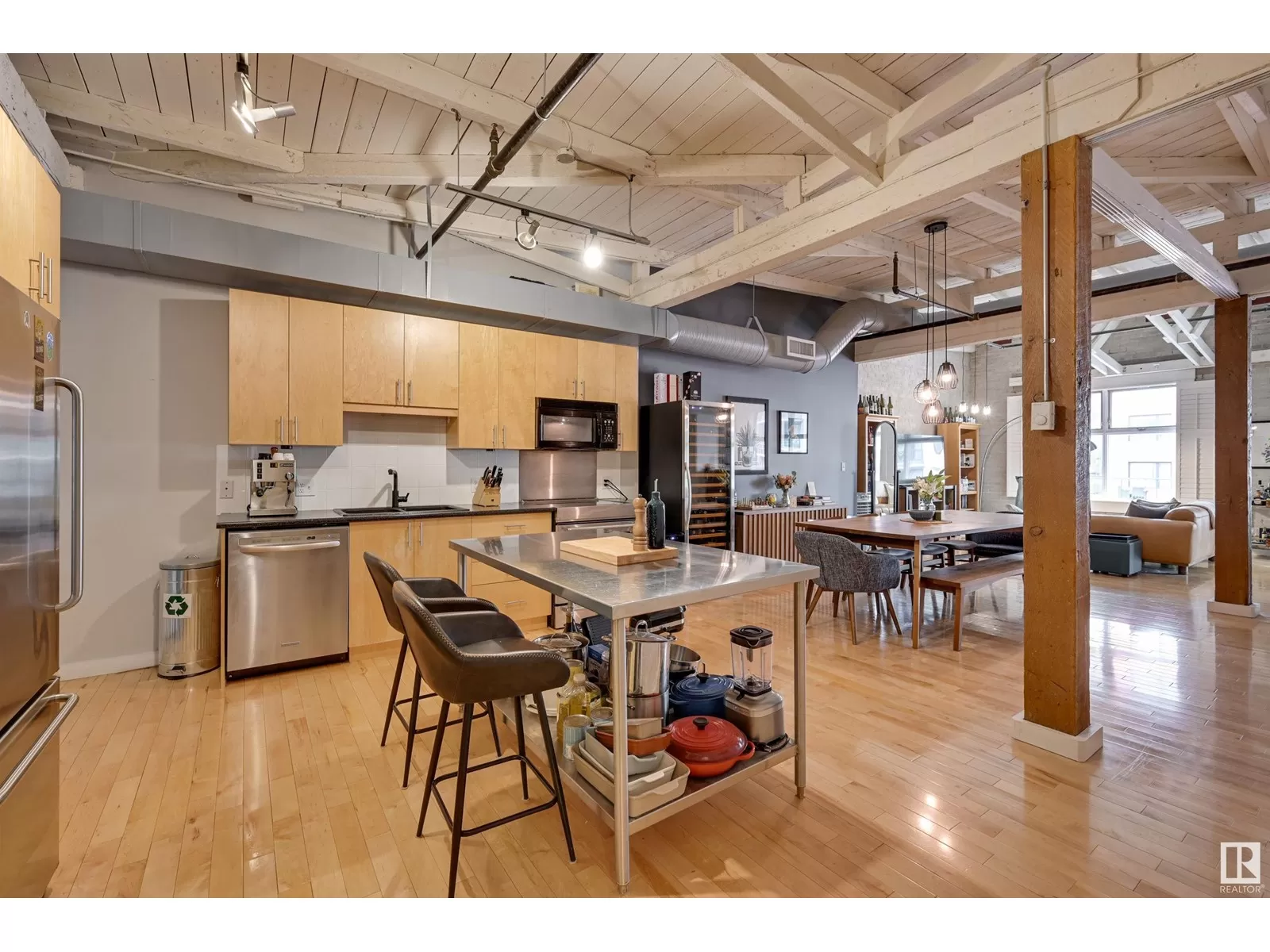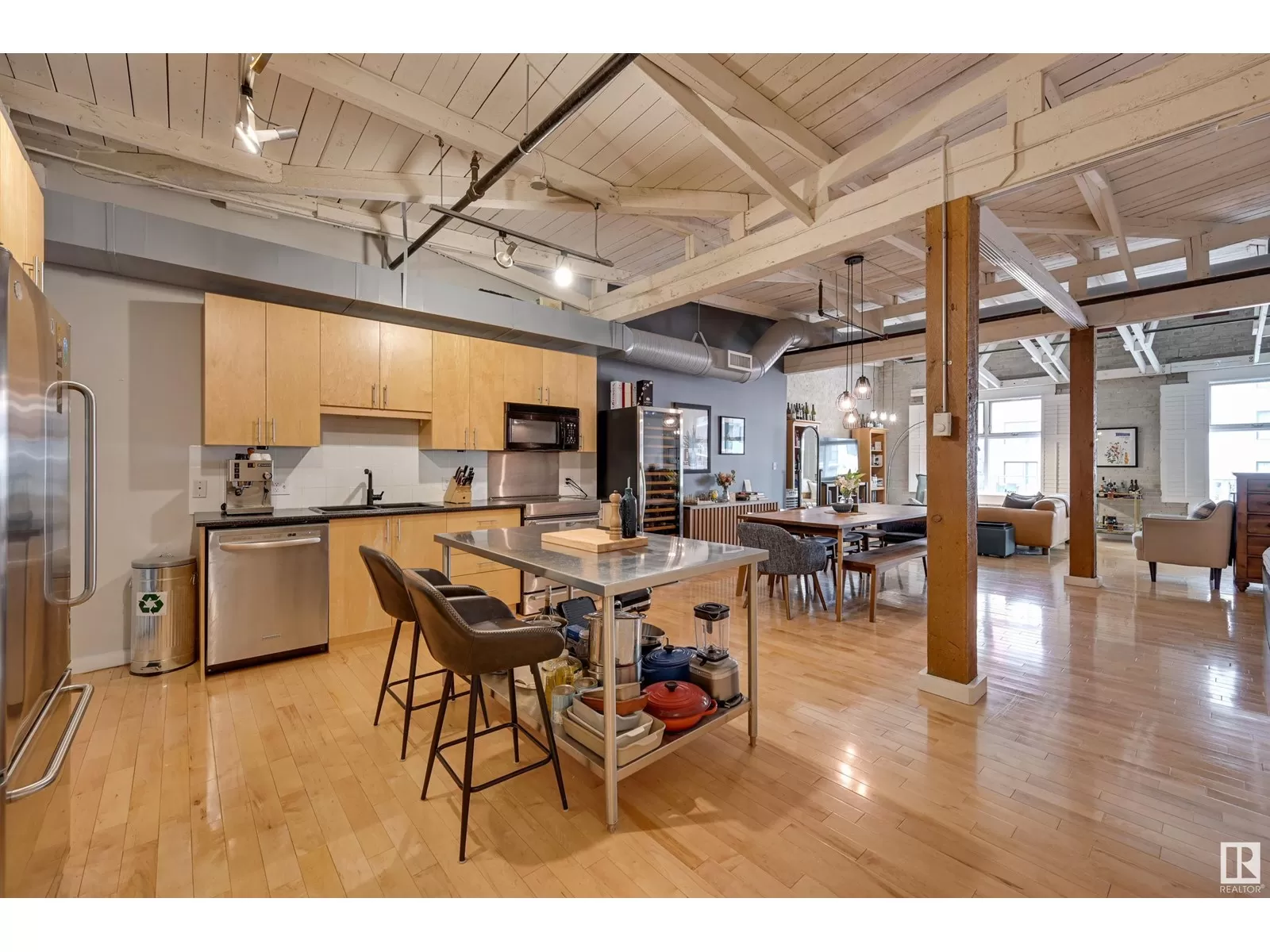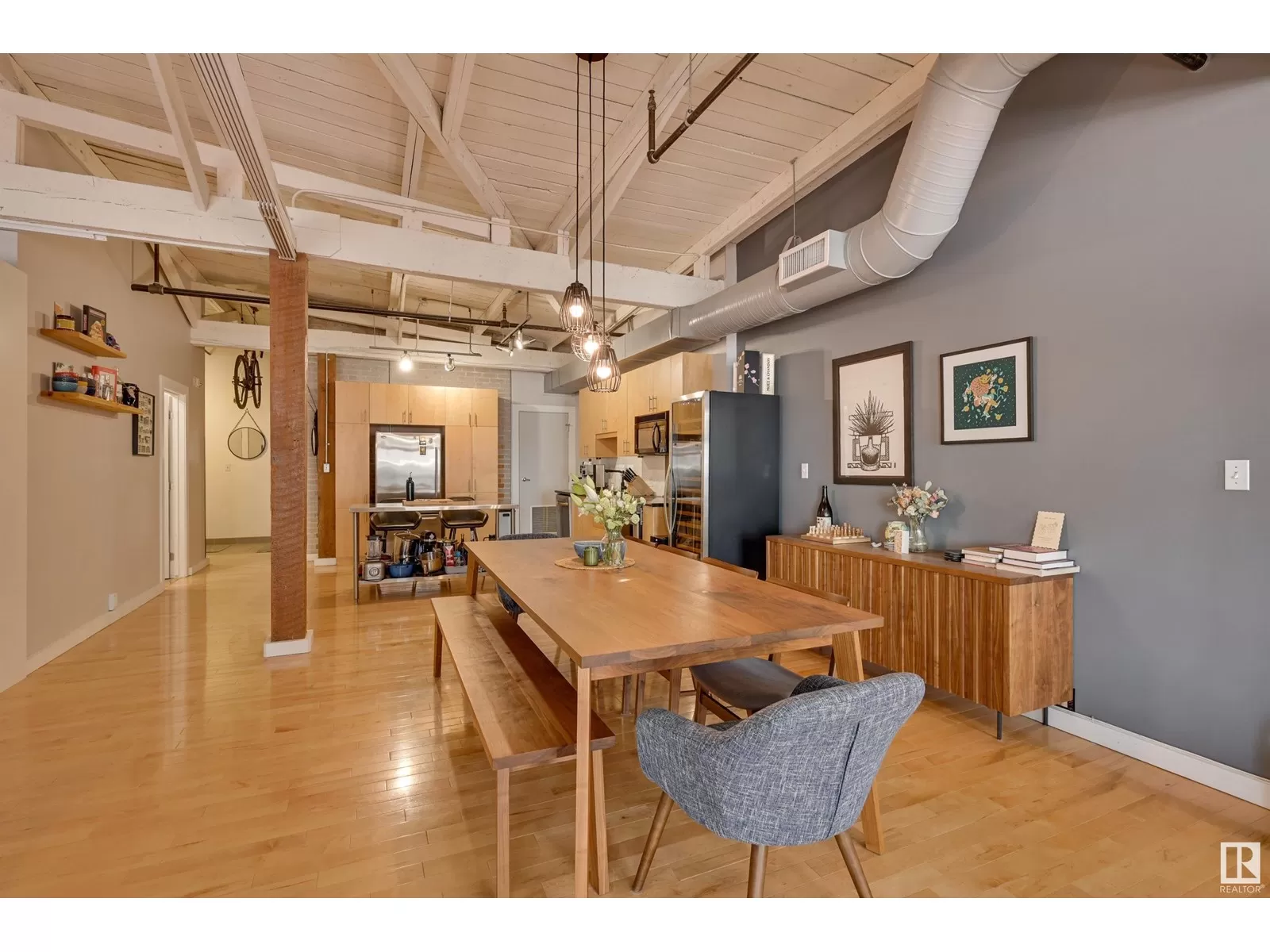 Penthouse Unit in One of Edmontonâs Most Iconic Buildings: Phillips Lofts! Located in the heart of downtown on the always-vibrant 104th Street Promenade, this loft delivers the ultimate urban lifestyleâjust steps from trendy bars, top restaurants, local markets, and the Ice District. This one-of-a-kind space features a private elevator entrance, open beam raised ceilings, and huge west-facing windows offering views of 104th and beyond. The expansive open-concept layout is perfect for entertaining, and the updated bathroom adds a touch of modern luxury. The open concept kitchen features a large stainless steel island, a generous amount of cabinetry and is open to a spacious dining area. The sprawling living room is a great place to curl up and watch a move - with space left over for an office! Stylish, spacious, and set in one of Edmontonâs most desirable downtown locationsâthis loft is not to be missed. In-suite laundry, roof top patio access with sweeping downtown view and underground parking included! (id:27476)