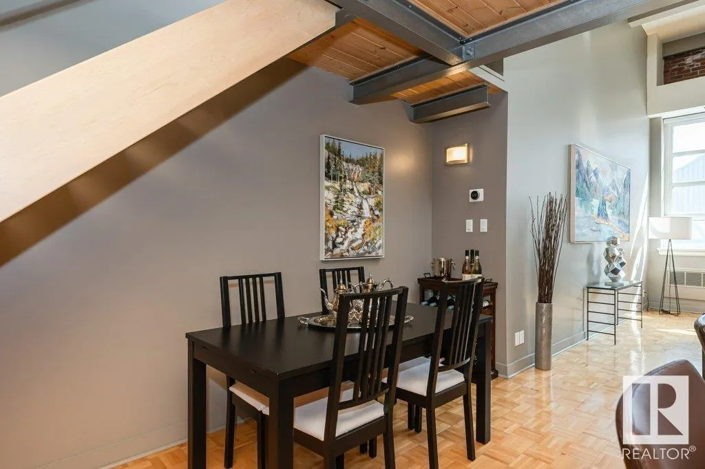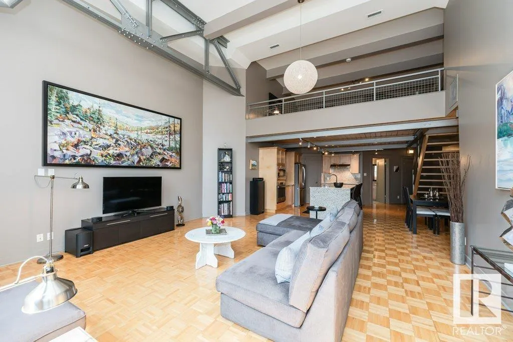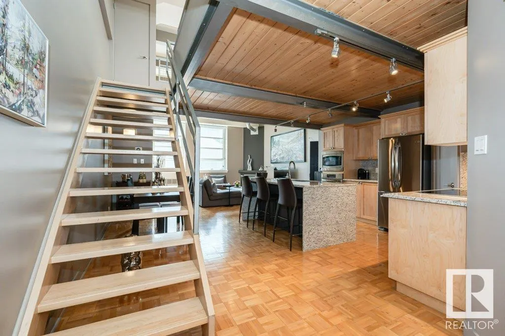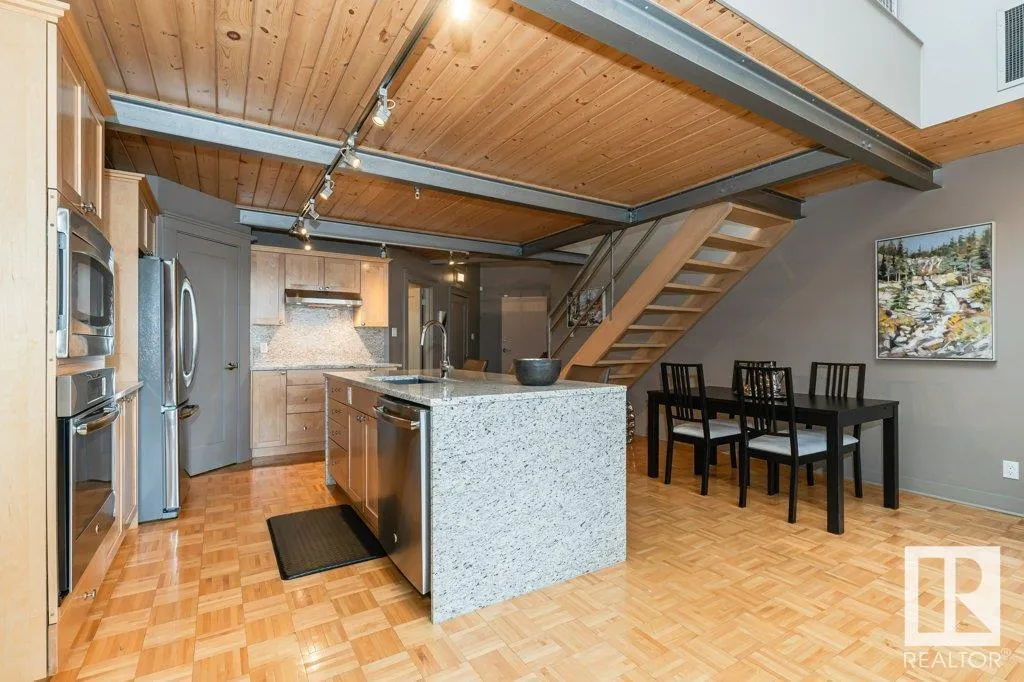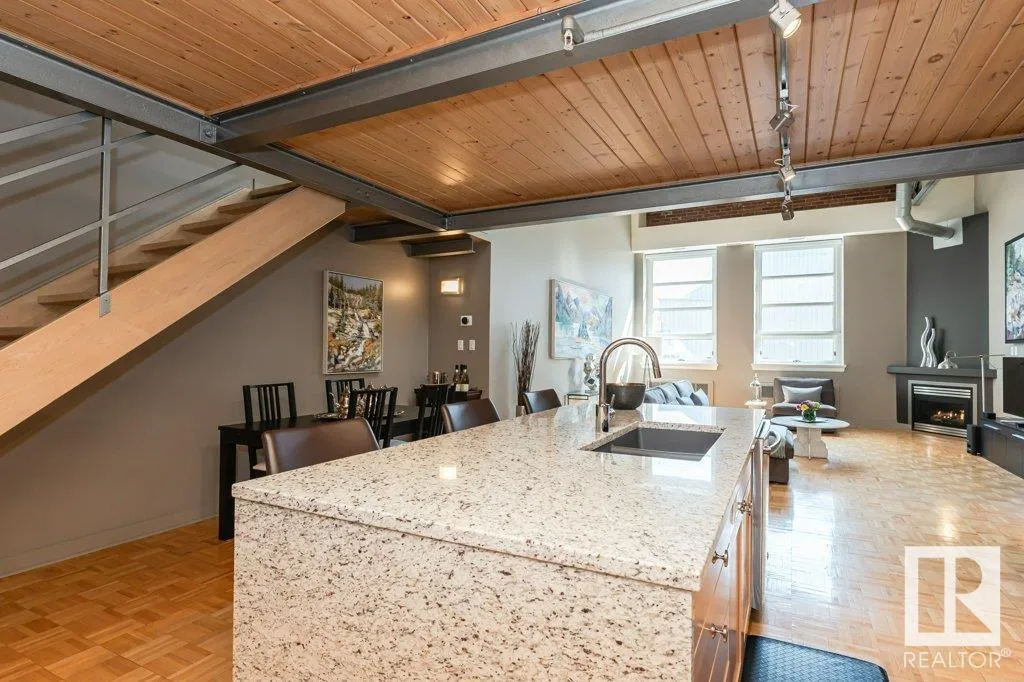 Magazine worthy! Featured in EDify magazine and on the Ballet Edmonton home tour! This home is a true hidden gem that provides peace, quiet and privacy in the epicenter of the downtown core. The Churchill Exchange. New York style loft. Stylish, contemporary and elegant. 1150 sqft 2 story loft. 1 bedroom, 1.5 baths. A wide-open space ideal for your creative genius. Soaring double-height ceilings. Large windows. Concrete & steel construction. Central A/C. Stunning walls ideal for art. Rare loft condo with lots of storage. Gorgeous island kitchen c/w stainless steel appliances and walk-in pantry. Upper loft suite features bedroom and lounge area open to below, ensuite and large walk-in closet. Large in-suite laundry. No upstairs neighbour. Heritage building with beautiful common areas. Shared rooftop deck. Titled u/g stall. Storage locker. Stroll to everything! A true urban hide-a-way, quiet, private, secluded. The ultimate downtown lifestyle. (id:27476)