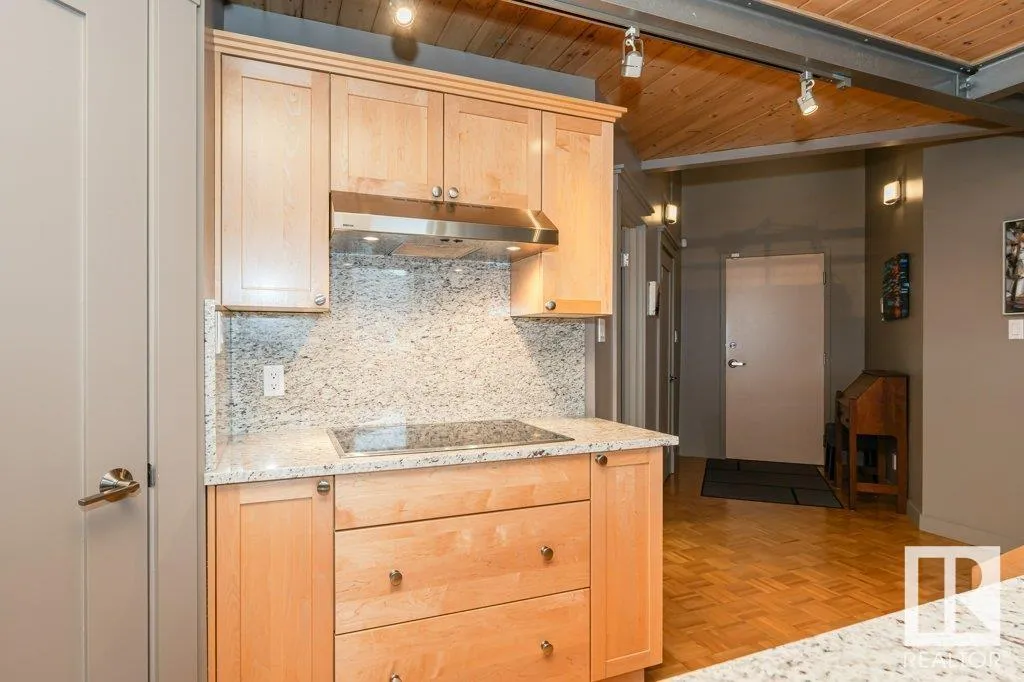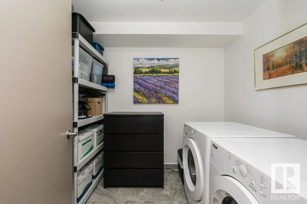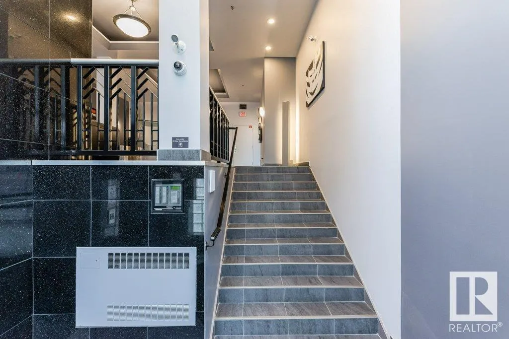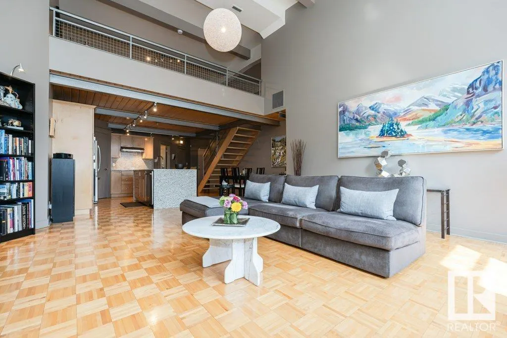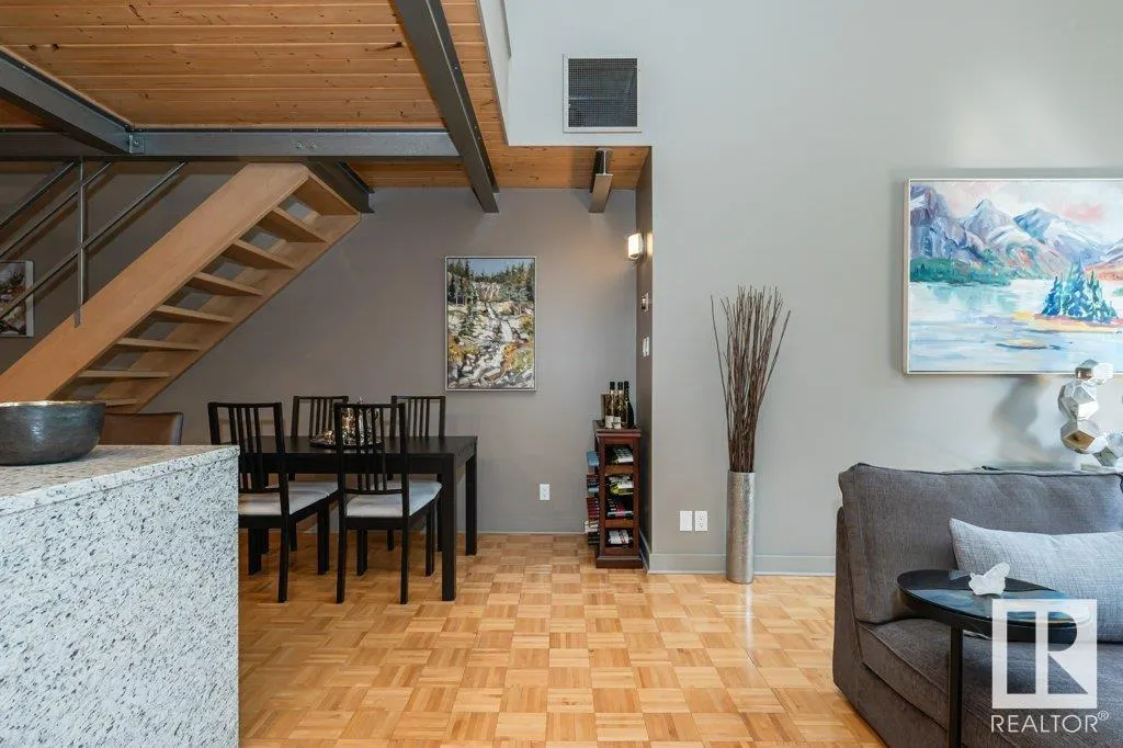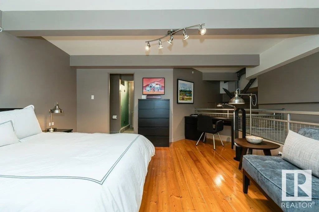 Magazine worthy! Featured in EDify magazine and on the Ballet Edmonton home tour! This home is a true hidden gem that provides peace, quiet and privacy in the epicenter of the downtown core. The Churchill Exchange. New York style loft. Stylish, contemporary and elegant. 1150 sqft 2 story loft. 1 bedroom, 1.5 baths. A wide-open space ideal for your creative genius. Soaring double-height ceilings. Large windows. Concrete & steel construction. Central A/C. Stunning walls ideal for art. Rare loft condo with lots of storage. Gorgeous island kitchen c/w stainless steel appliances and walk-in pantry. Upper loft suite features bedroom and lounge area open to below, ensuite and large walk-in closet. Large in-suite laundry. No upstairs neighbour. Heritage building with beautiful common areas. Shared rooftop deck. Titled u/g stall. Storage locker. Stroll to everything! A true urban hide-a-way, quiet, private, secluded. The ultimate downtown lifestyle. (id:27476)