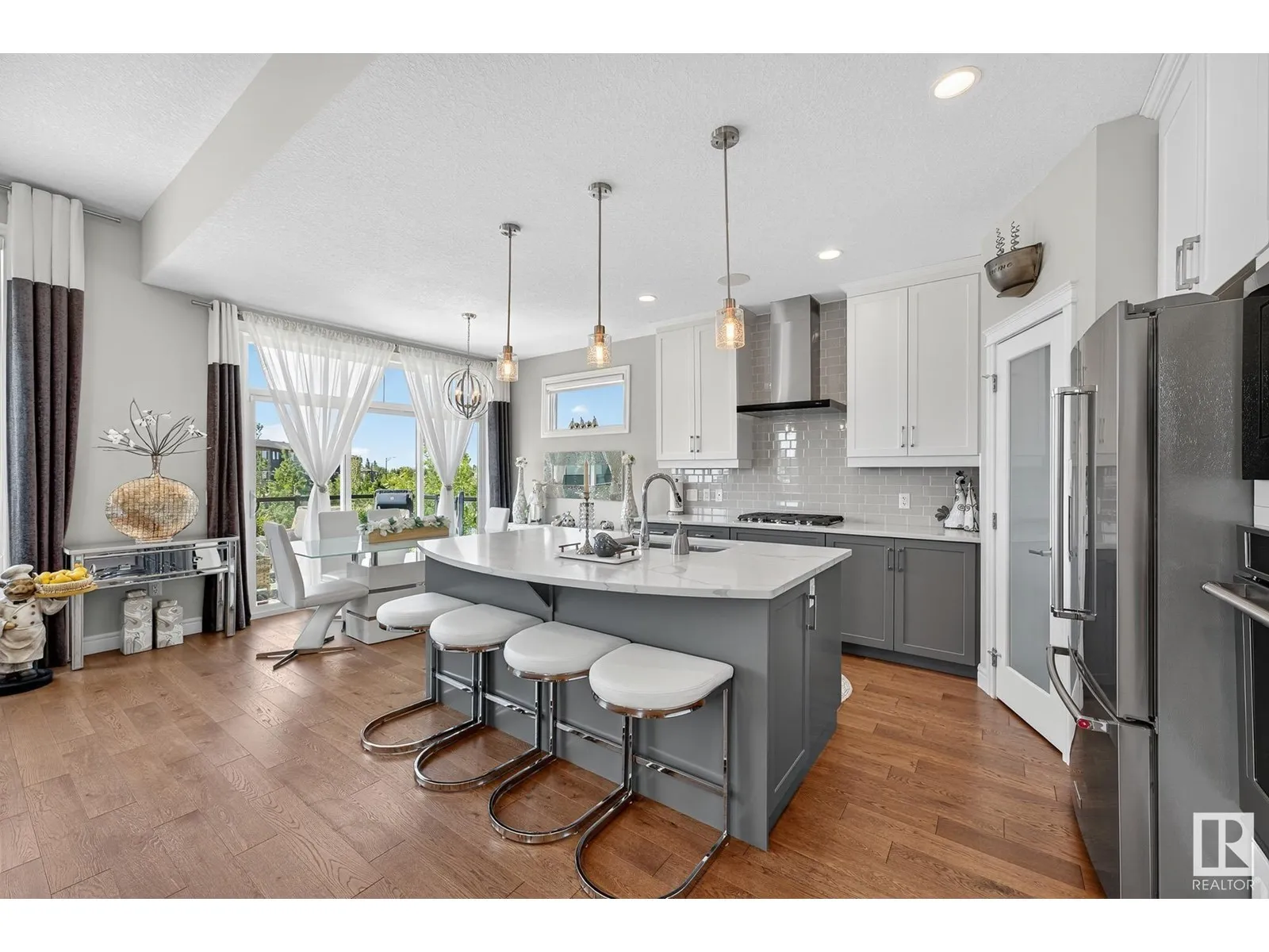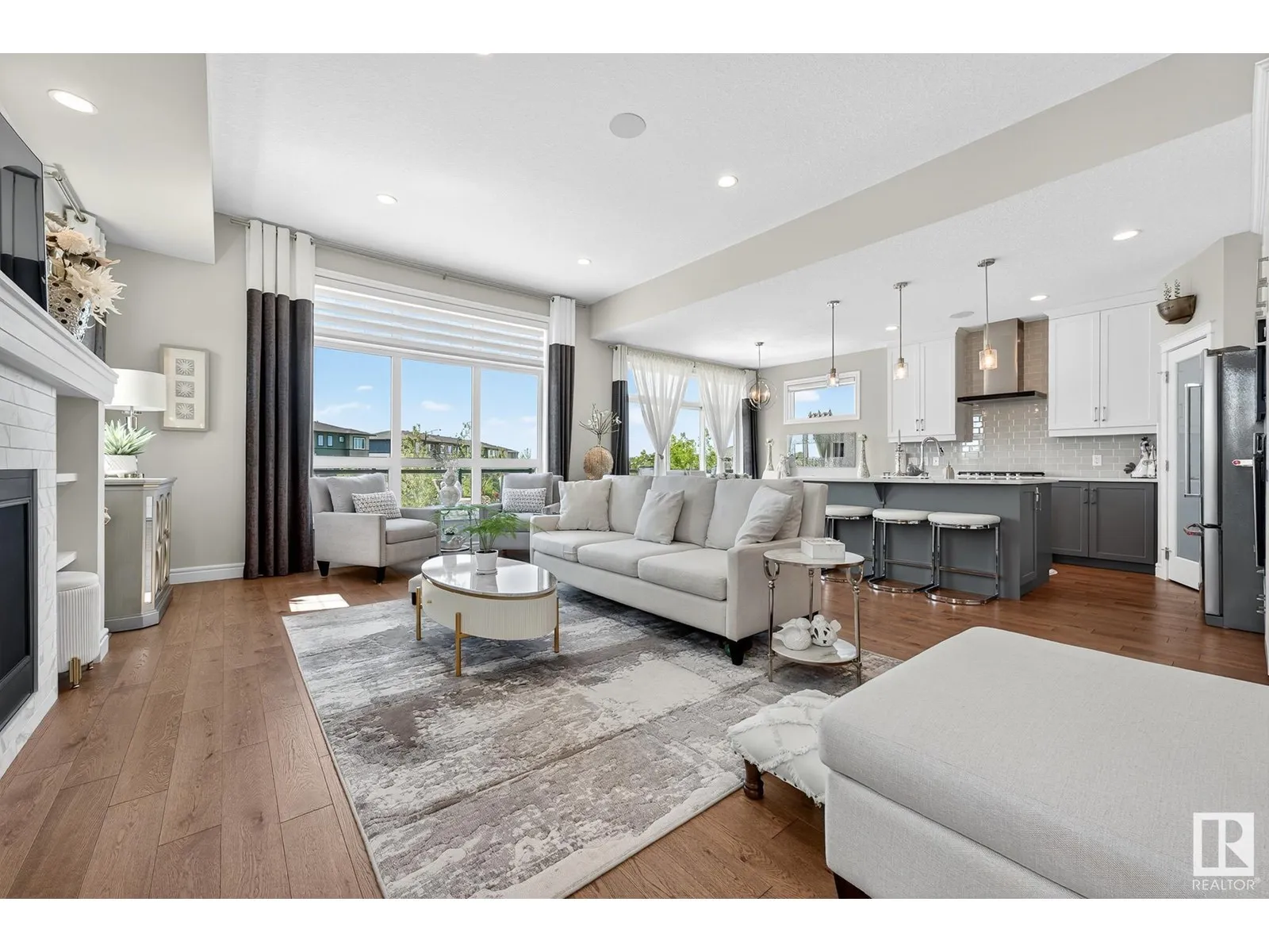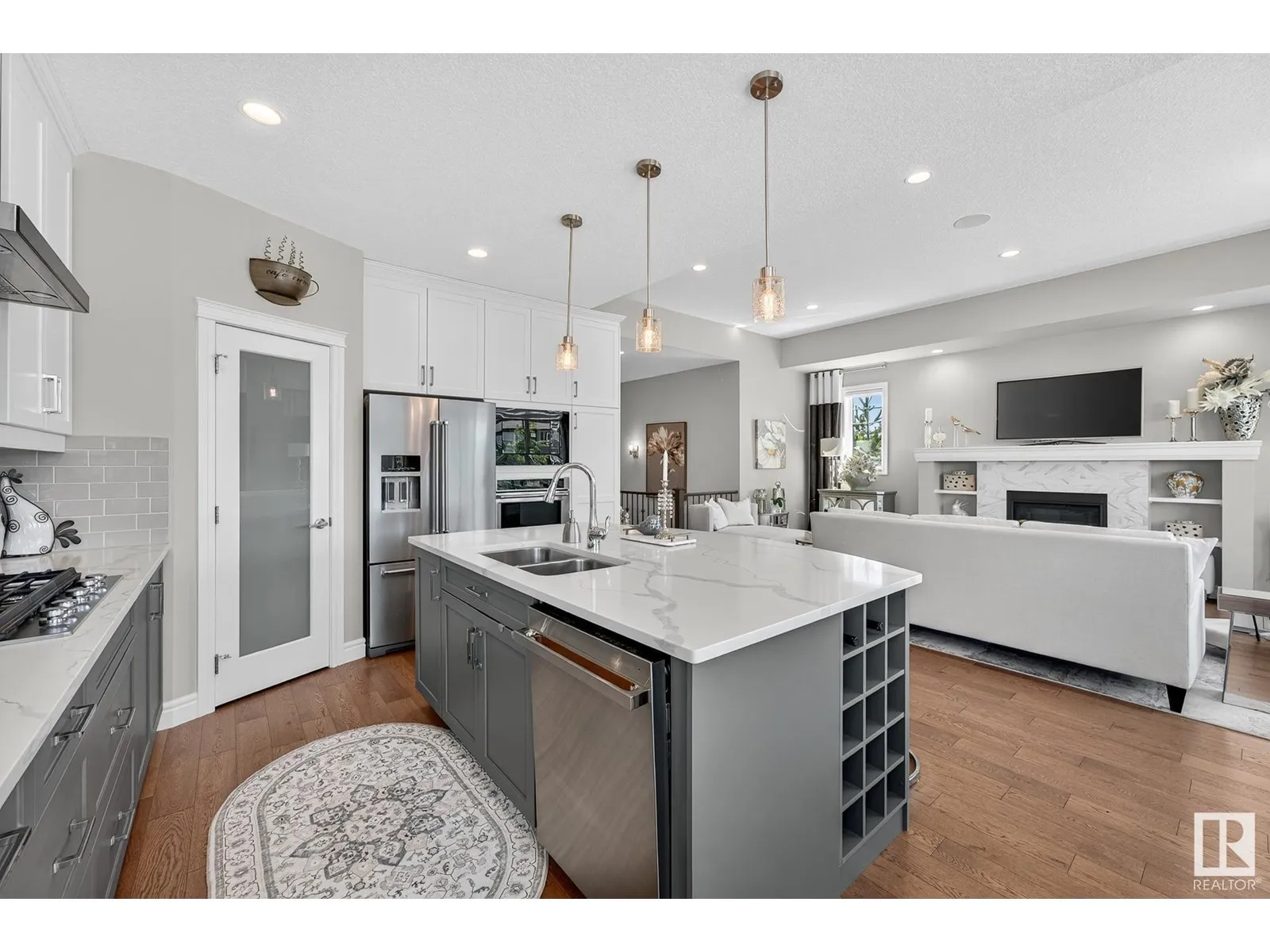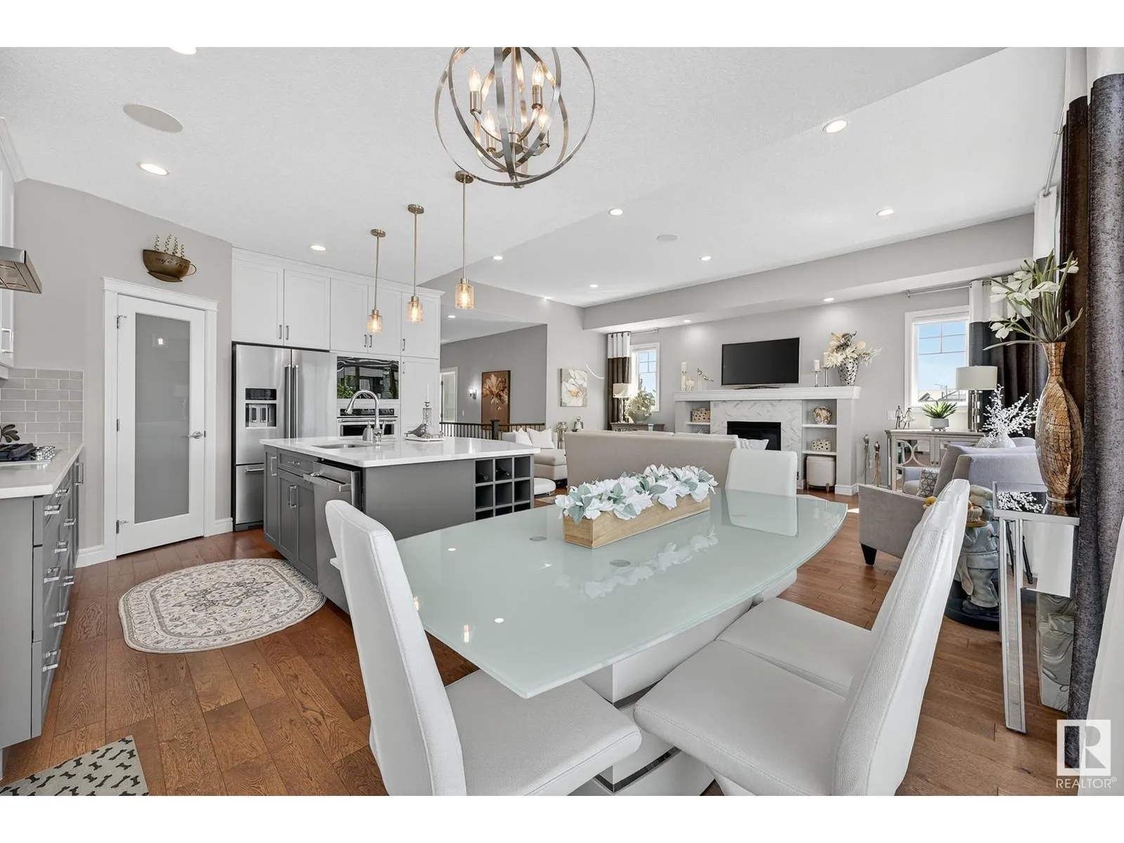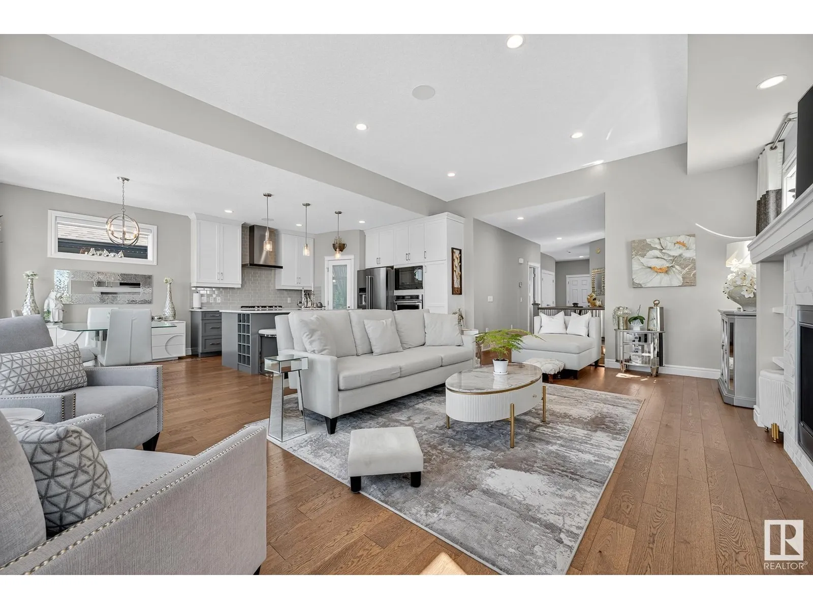 Experience elevated living in this exquisite former showhome in the Vistas at Orchardsâa rare walkout bungalow offering 2,600+sqft of designer-crafted space with private southwest exposure backing a scenic walking path. From the soaring entry to the rich engineered hardwood flooring, iron railings, and expansive triple-pane windows, every detail exudes sophistication. The chef-inspired kitchen features floor-to-ceiling cabinetry, quartz counters, and high-end built-in appliances. Relax by one of 2 elegant fireplaces or step onto the sun-drenched deck with glass railings. The luxurious primary suite offers a spa-like 5-pc ensuite and walk-in closet. The finished walkout basement includes 2 bedrooms, second den, rec room, bar area, and a full-width concrete patio. Complete w/Bose built-in speakers, air conditioning, custom drapes, heated double garage, and maintenance-free living. Enjoy exclusive access to trails, schools, parks & easy connectivity to shops and major routes to the city. (id:27476)