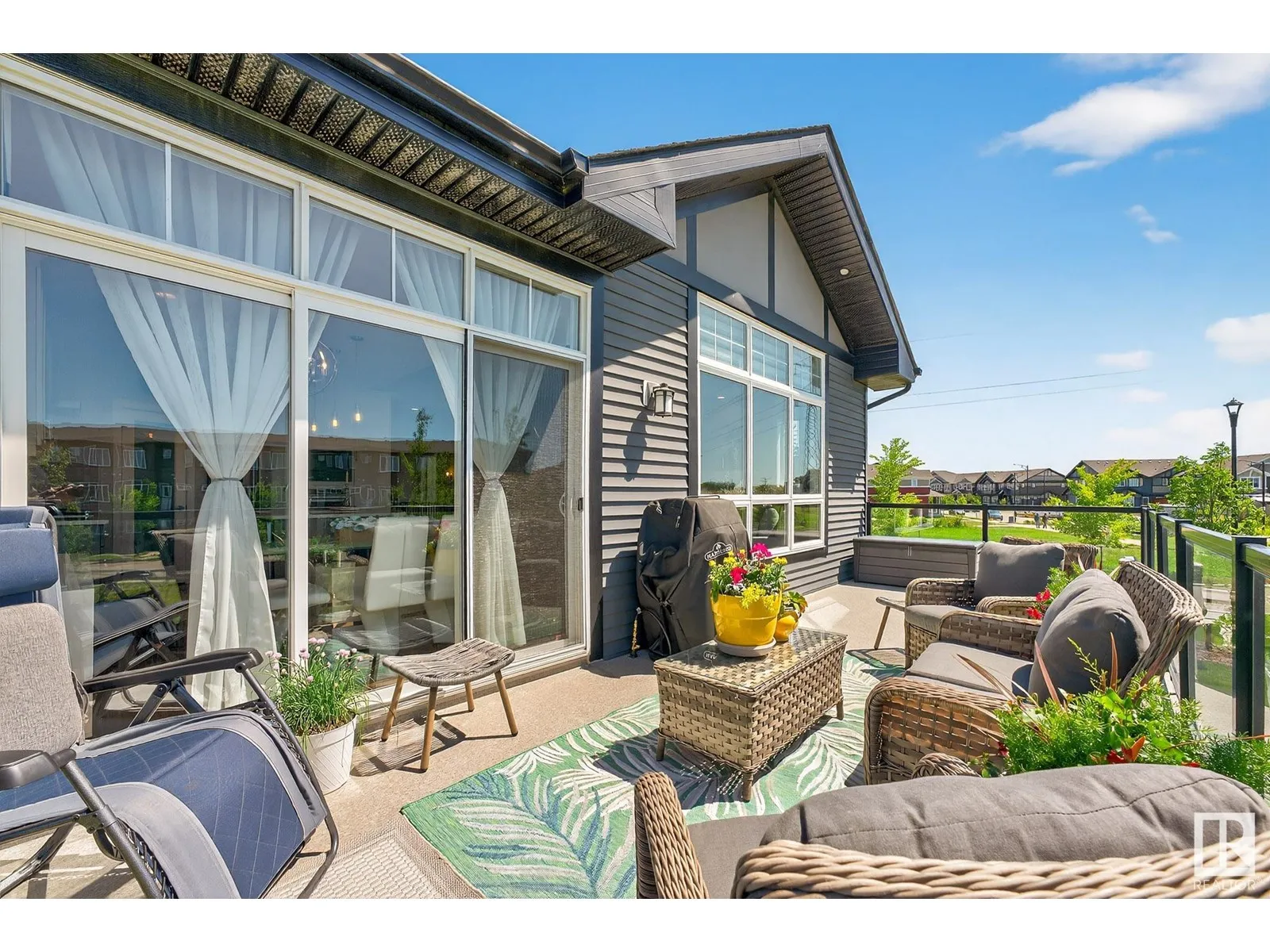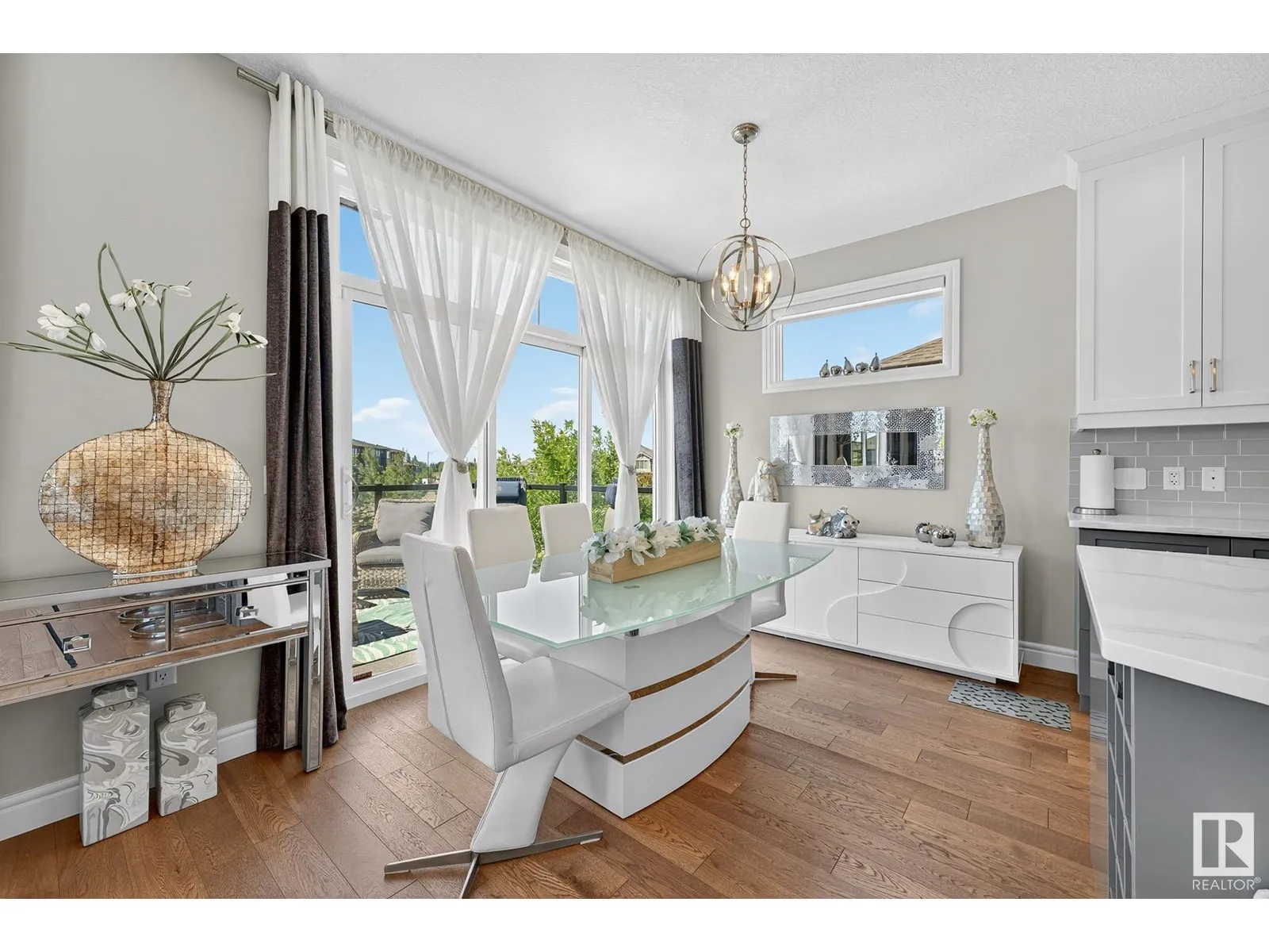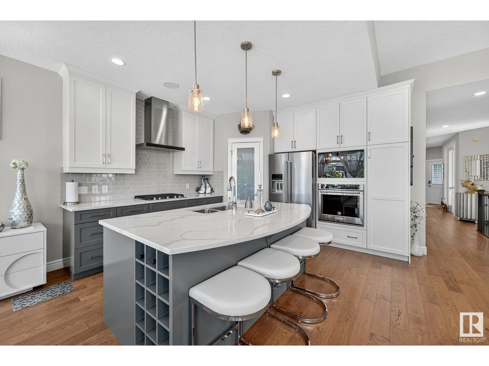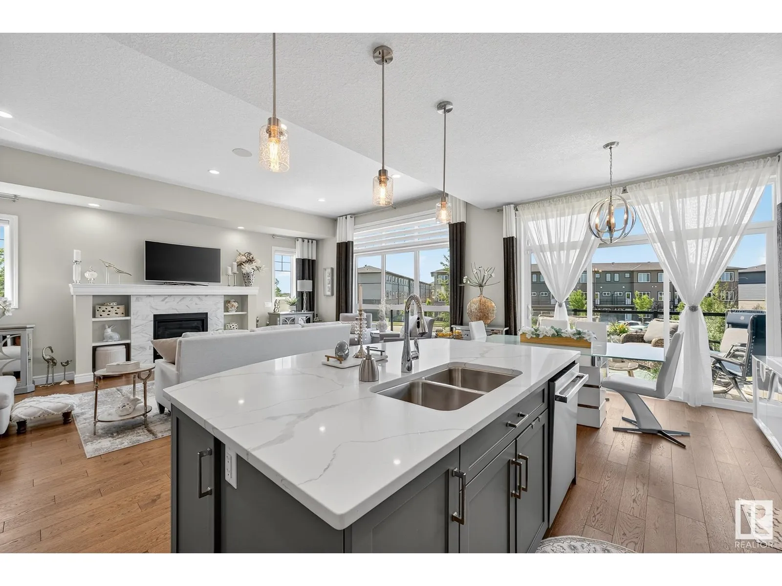 Experience elevated living in this exquisite former showhome in the Vistas at Orchardsâa rare walkout bungalow offering 2,600+sqft of designer-crafted space with private southwest exposure backing a scenic walking path. From the soaring entry to the rich engineered hardwood flooring, iron railings, and expansive triple-pane windows, every detail exudes sophistication. The chef-inspired kitchen features floor-to-ceiling cabinetry, quartz counters, and high-end built-in appliances. Relax by one of 2 elegant fireplaces or step onto the sun-drenched deck with glass railings. The luxurious primary suite offers a spa-like 5-pc ensuite and walk-in closet. The finished walkout basement includes 2 bedrooms, second den, rec room, bar area, and a full-width concrete patio. Complete w/Bose built-in speakers, air conditioning, custom drapes, heated double garage, and maintenance-free living. Enjoy exclusive access to trails, schools, parks & easy connectivity to shops and major routes to the city. (id:27476)