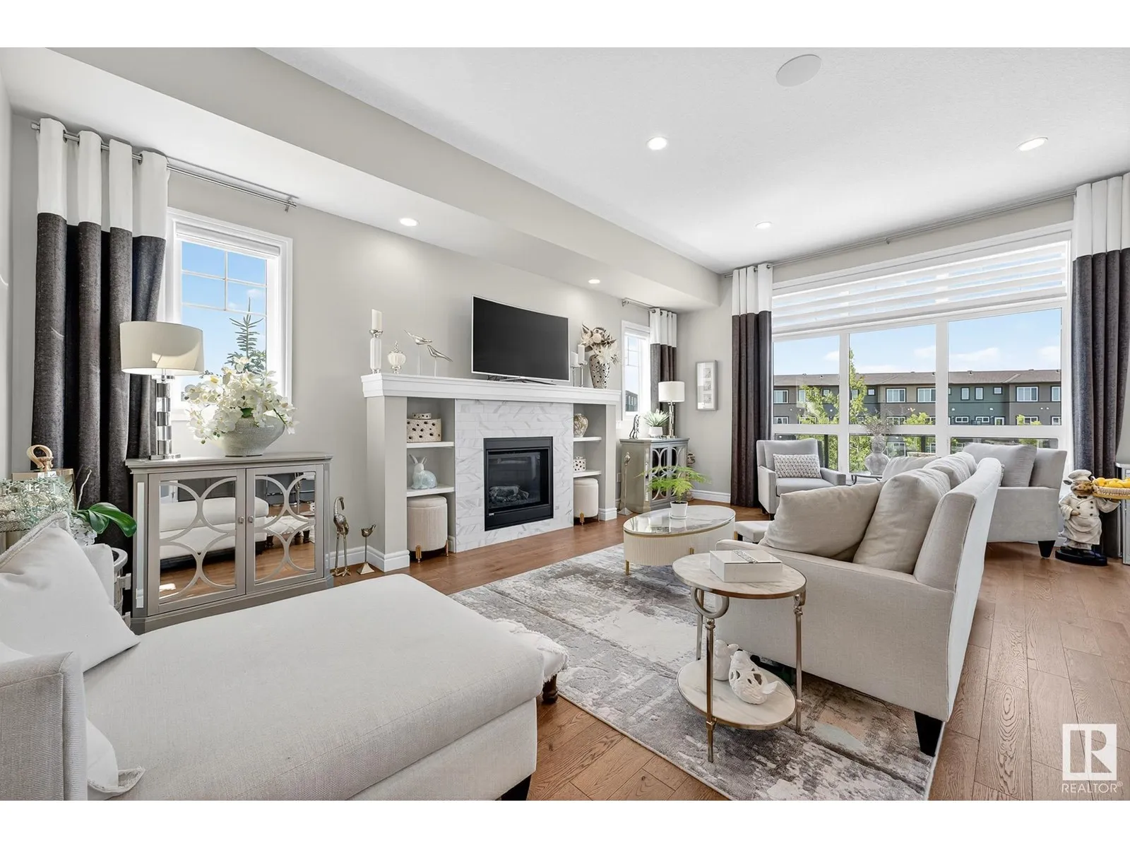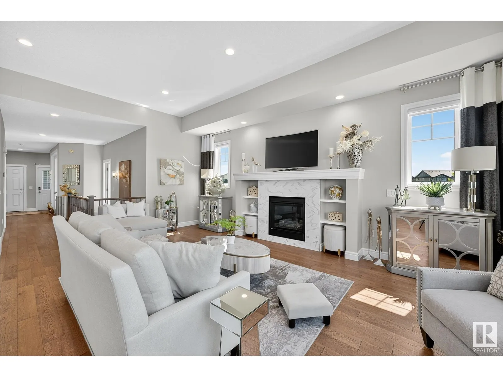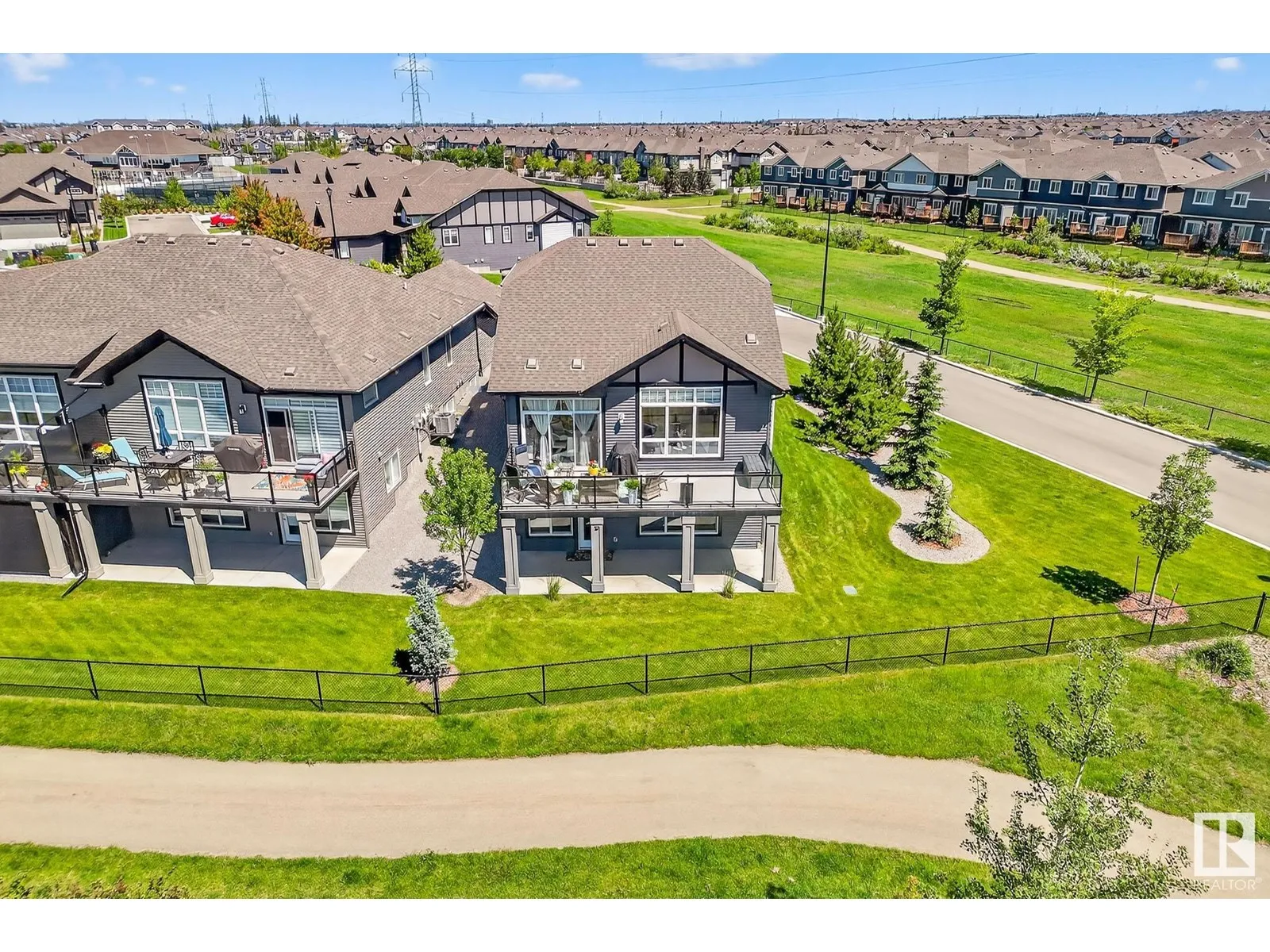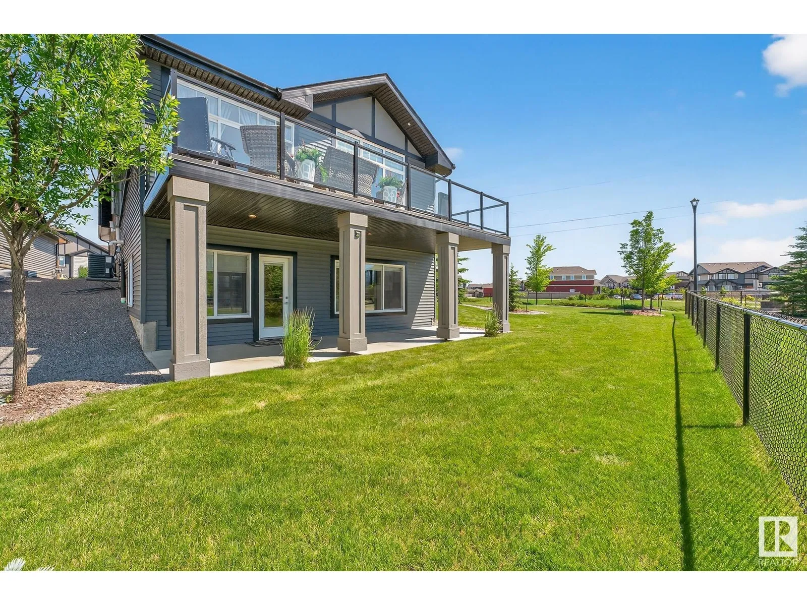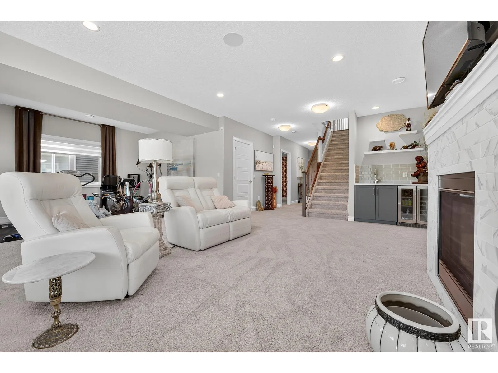 Experience elevated living in this exquisite former showhome in the Vistas at Orchardsâa rare walkout bungalow offering 2,600+sqft of designer-crafted space with private southwest exposure backing a scenic walking path. From the soaring entry to the rich engineered hardwood flooring, iron railings, and expansive triple-pane windows, every detail exudes sophistication. The chef-inspired kitchen features floor-to-ceiling cabinetry, quartz counters, and high-end built-in appliances. Relax by one of 2 elegant fireplaces or step onto the sun-drenched deck with glass railings. The luxurious primary suite offers a spa-like 5-pc ensuite and walk-in closet. The finished walkout basement includes 2 bedrooms, second den, rec room, bar area, and a full-width concrete patio. Complete w/Bose built-in speakers, air conditioning, custom drapes, heated double garage, and maintenance-free living. Enjoy exclusive access to trails, schools, parks & easy connectivity to shops and major routes to the city. (id:27476)
