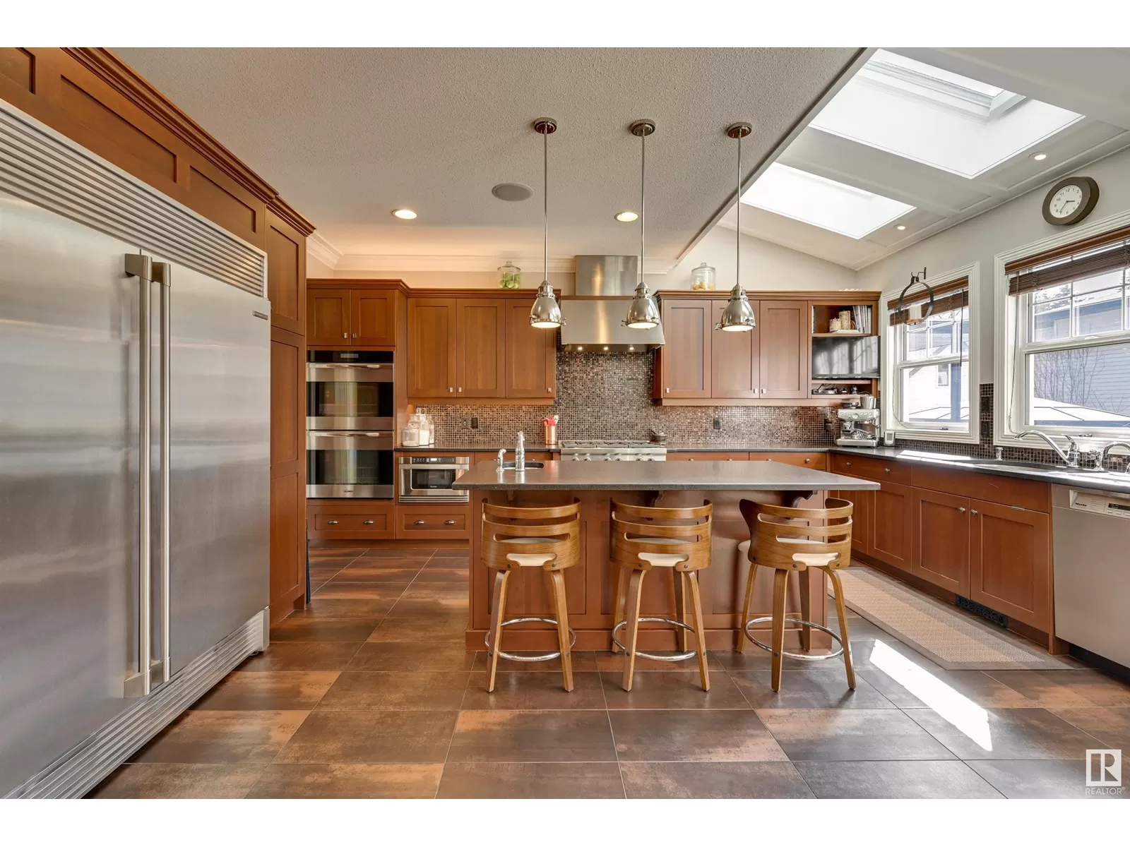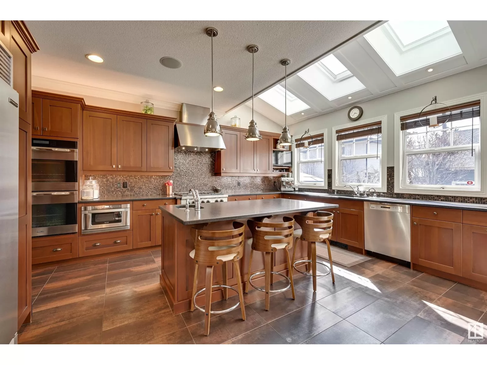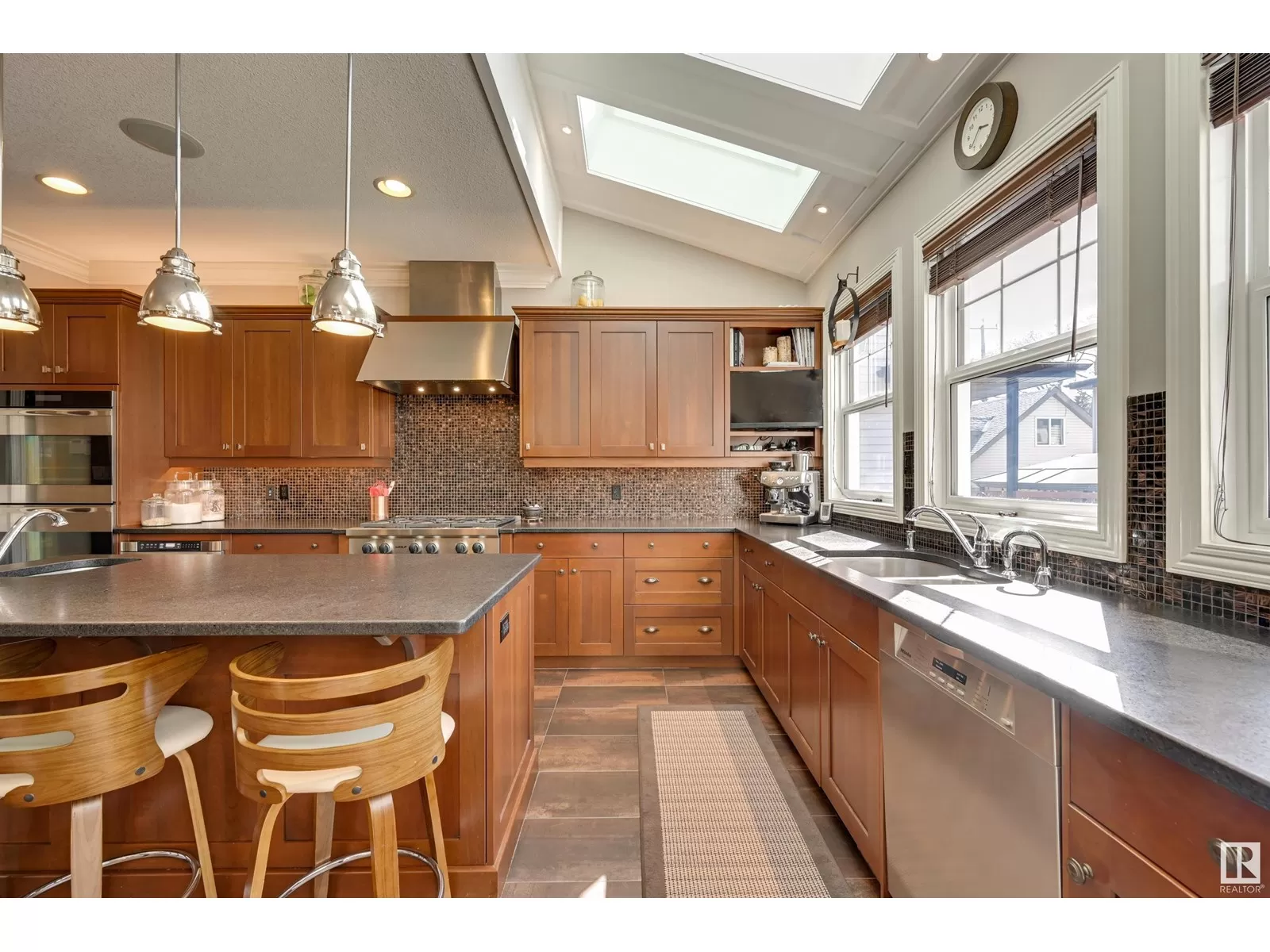 Pristine Executive Craftsman Style Two Storey in Glenora! Situated on a large lot on a quiet, tree-lined street is this Award Winning Infill, featuring nearly 4,300 sqft of living space. No expense was spared in the custom build process - feel the quality of high end materials used throughout: imported Italian tile, luxurious hardware, custom cabinetry & more. Through the front door is a beautiful two storey front foyer. Then, the space opens beautifully w/ a large chefs kitchen with Towne and Countree Cabinets, Decore / Icon / Miele appliances, a large island with honed granite counters. The kitchen overlooks the perfectly landscaped backyard and enjoys tons of natural sunlight from high end windows & skylights. Next is the dining area - perfect for entertaining. Then the living room & family room each with a fireplace. Main floor is complete with a powder room & office / den. Upstairs: a full bath & three bedrooms including the primary with walk-in closet and spa-like en-suite. Fully finished Basement! (id:27476)