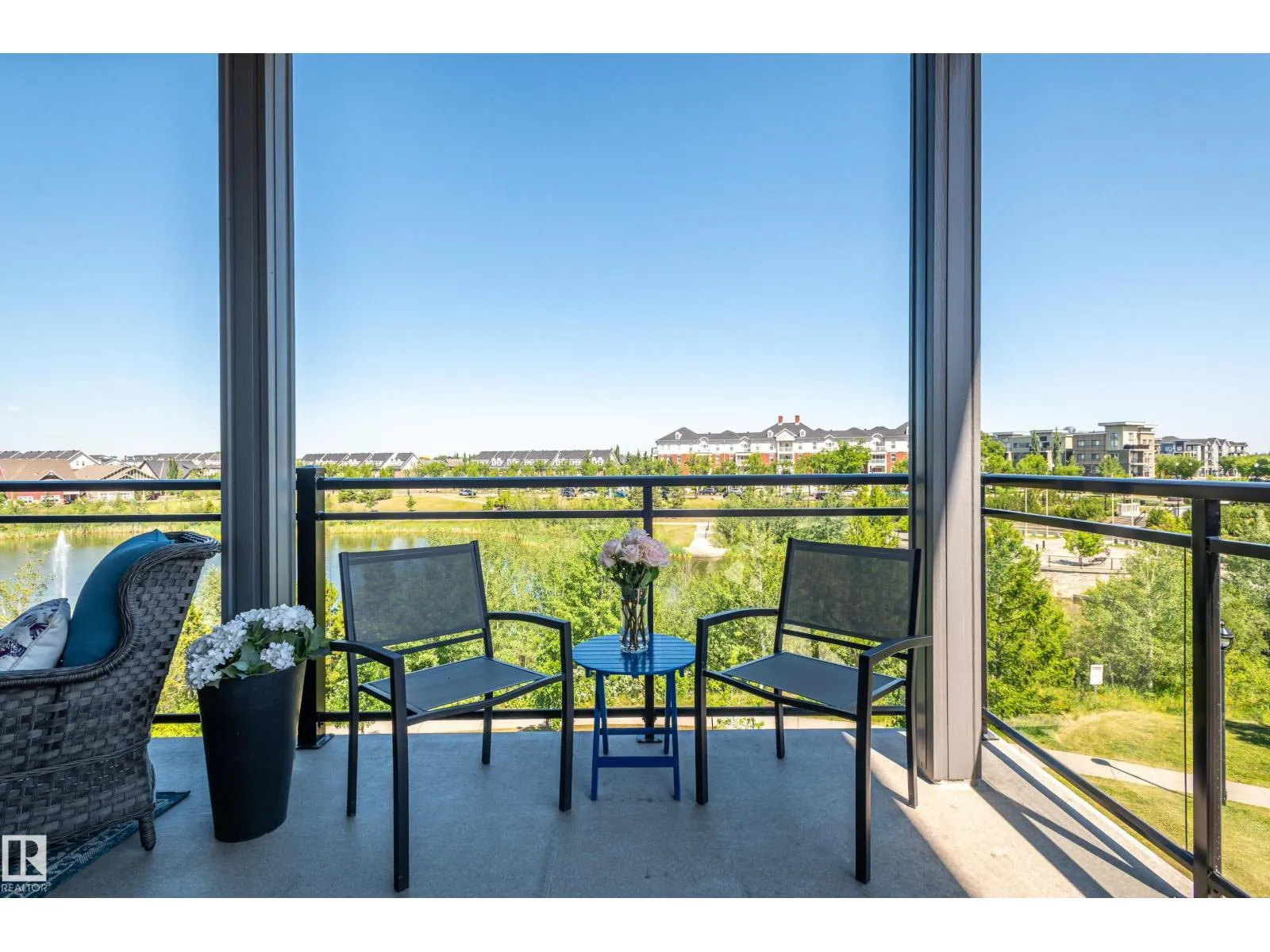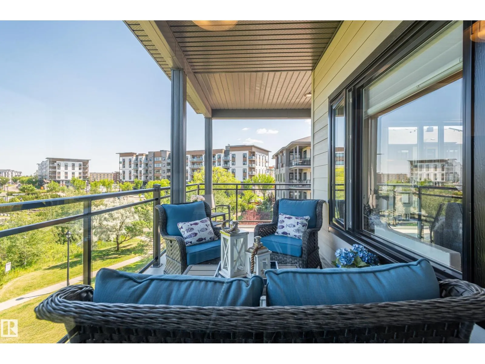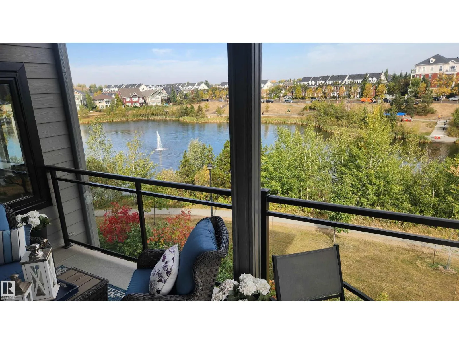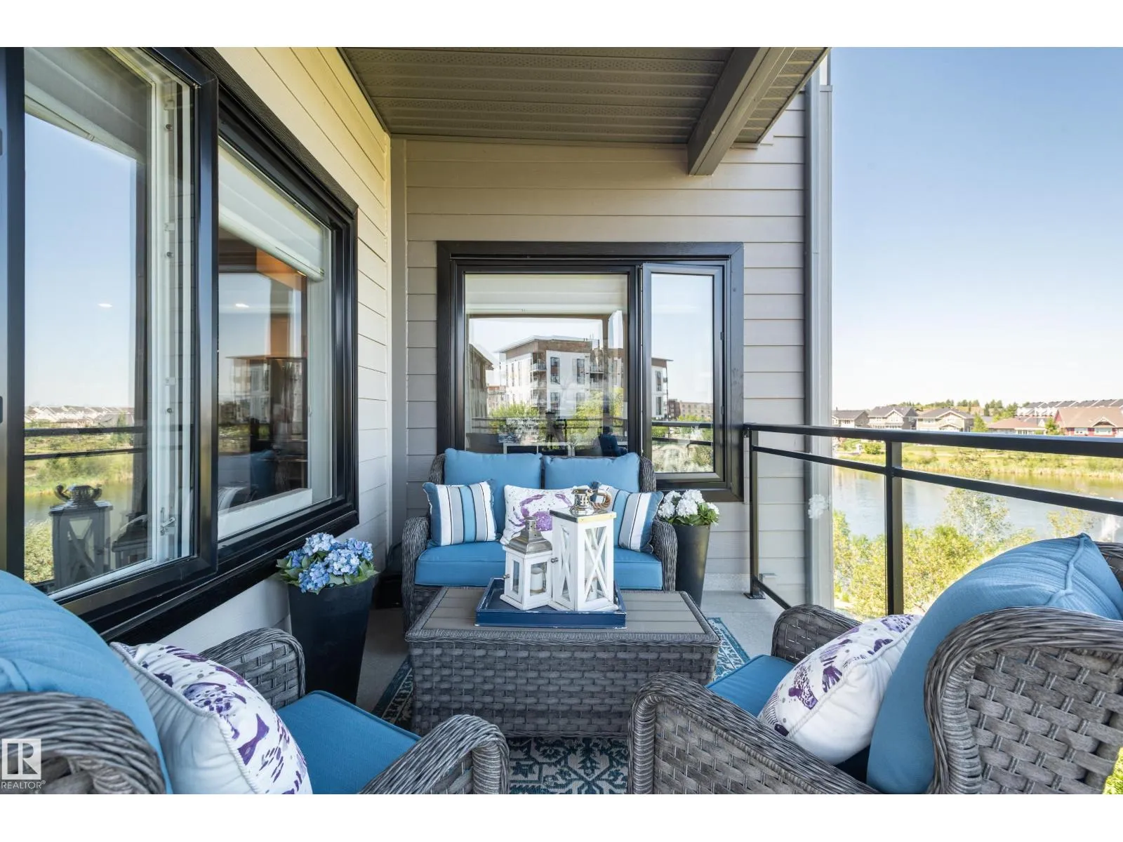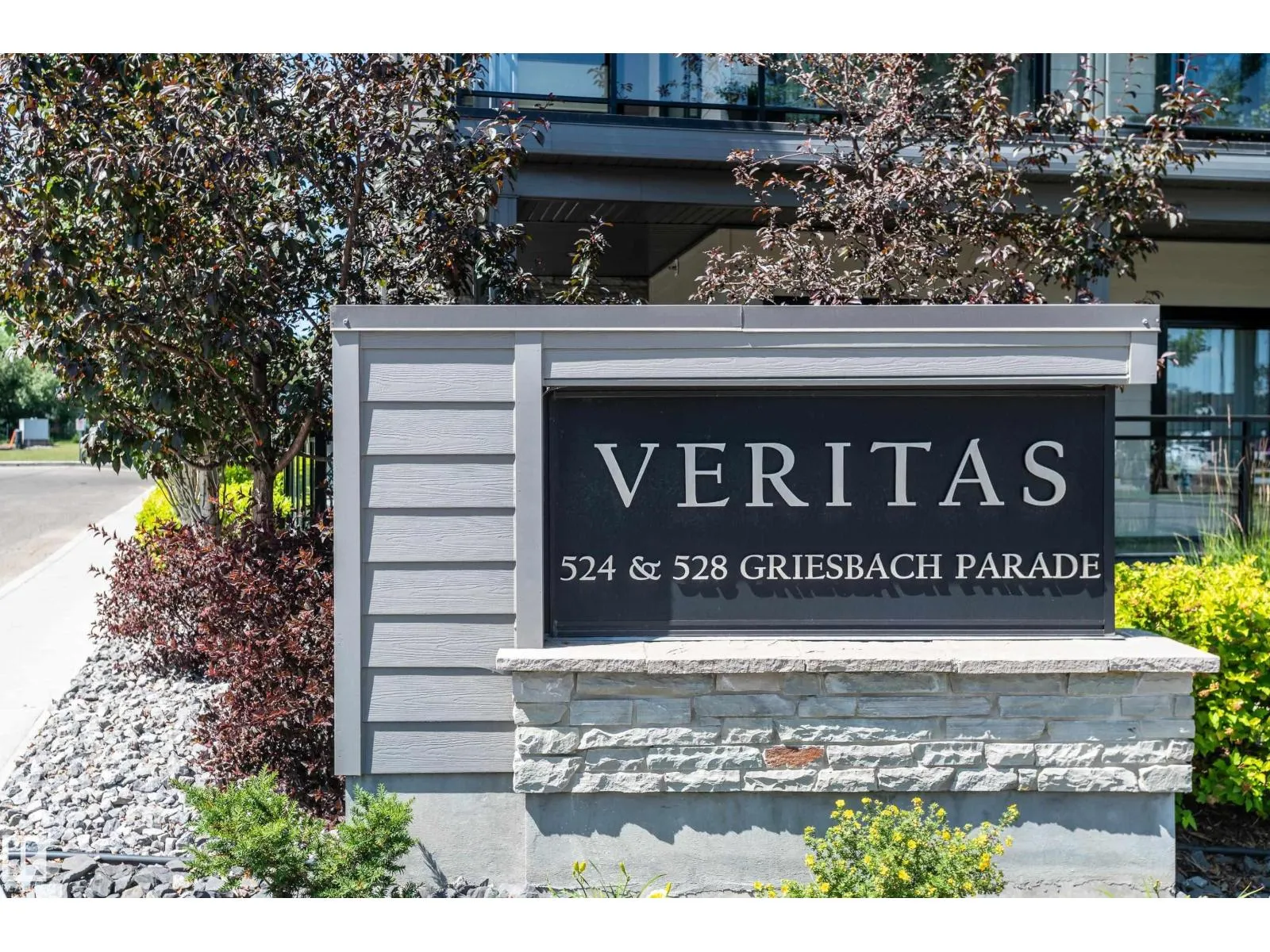 Extensively upgraded lake-facing corner unit in sought-after Veritas, offering awe-inspiring views from every angle. This immaculate one-owner home features 2 spacious bdrms, 2 baths, & a bright den. Enjoy sunny mornings & shady evenings on wrap-around deck. The two-tone kitchen is a standout with upgraded appliances, a tile backsplash, & a 6â extended island with added cabinetry on both sides. Designer lighting, magazine-worthy layout & décor, & a spa-inspired ensuite. A/C. Over $25,000 in thoughtful upgrades also include barn doors, premium flooring, custom shower tile, additional quartz countertops, blinds, hardware, & a second (surface) parking stall that adds everyday convenience, plus a heated stall with secure storage. Pride of ownership shines throughoutâclean, cozy, and stylish. Located steps from countless amenities in one of Edmontonâs most desirable communities, this home offers a seamless blend of comfort, elegance, and breathtaking views. Style meets serenity in this Griesbach gem! (id:27476)