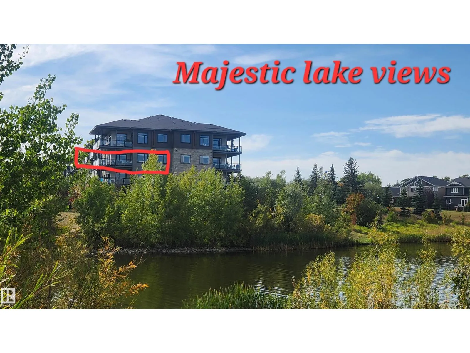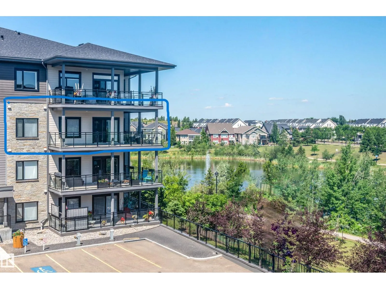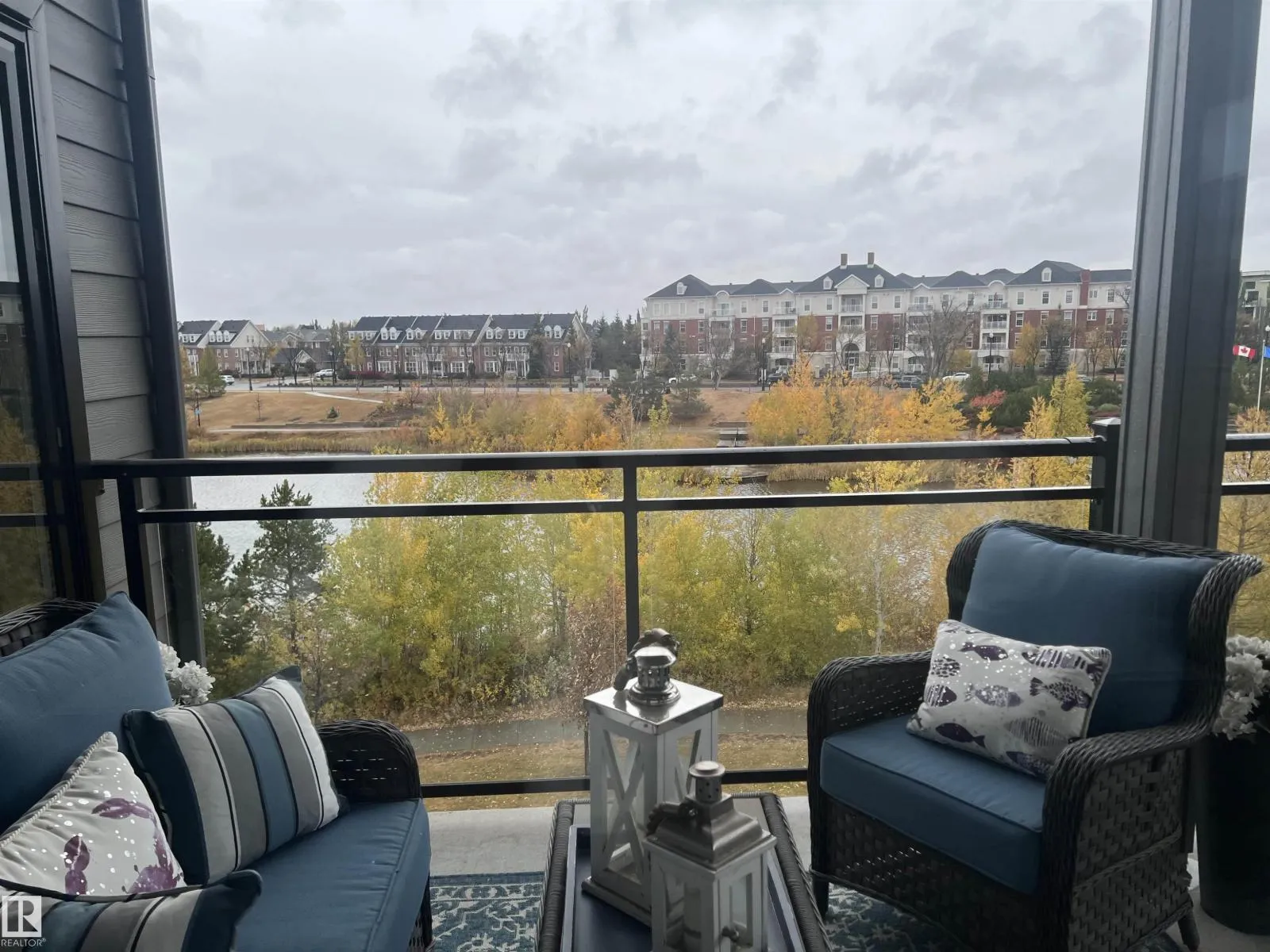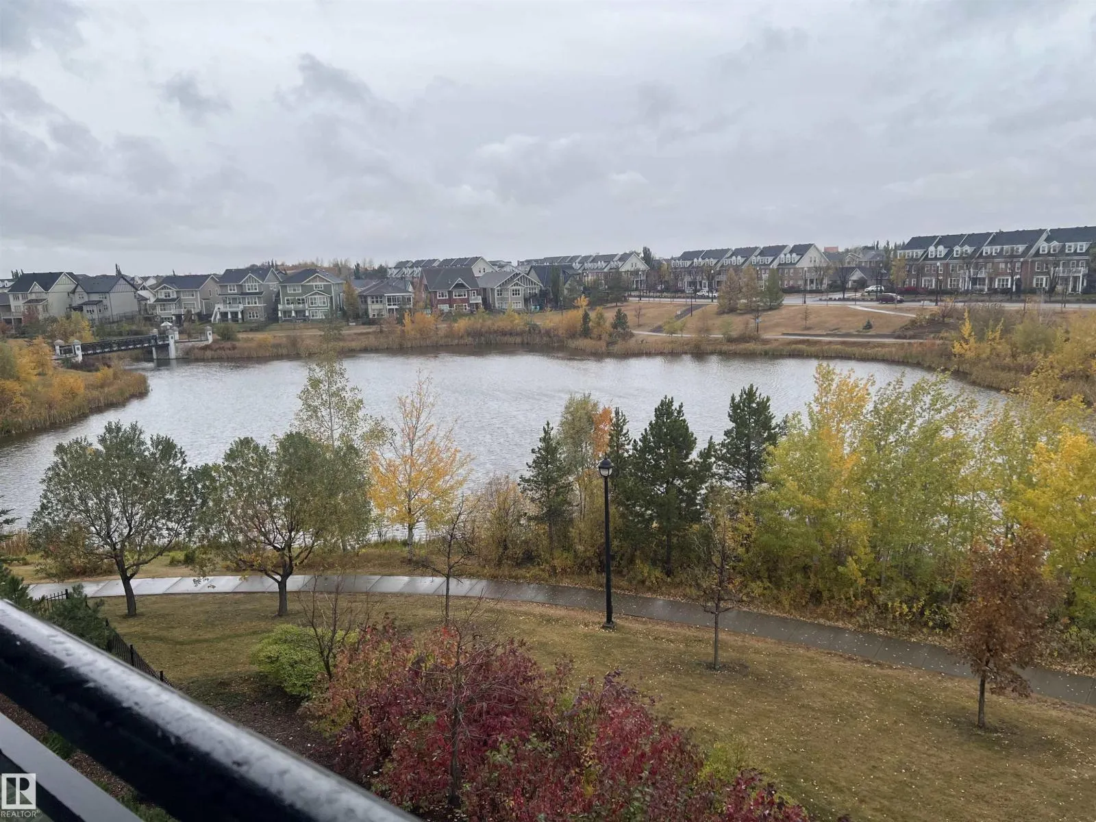 Extensively upgraded lake-facing corner unit in sought-after Veritas, offering awe-inspiring views from every angle. This immaculate one-owner home features 2 spacious bdrms, 2 baths, & a bright den. Enjoy sunny mornings & shady evenings on wrap-around deck. The two-tone kitchen is a standout with upgraded appliances, a tile backsplash, & a 6â extended island with added cabinetry on both sides. Designer lighting, magazine-worthy layout & décor, & a spa-inspired ensuite. A/C. Over $25,000 in thoughtful upgrades also include barn doors, premium flooring, custom shower tile, additional quartz countertops, blinds, hardware, & a second (surface) parking stall that adds everyday convenience, plus a heated stall with secure storage. Pride of ownership shines throughoutâclean, cozy, and stylish. Located steps from countless amenities in one of Edmontonâs most desirable communities, this home offers a seamless blend of comfort, elegance, and breathtaking views. Style meets serenity in this Griesbach gem! (id:27476)