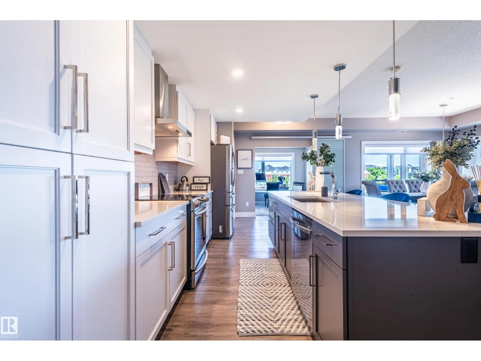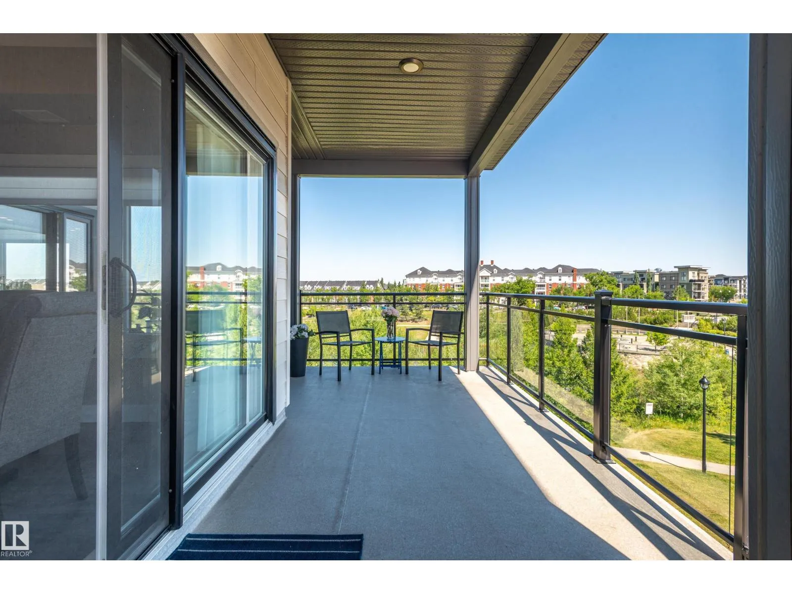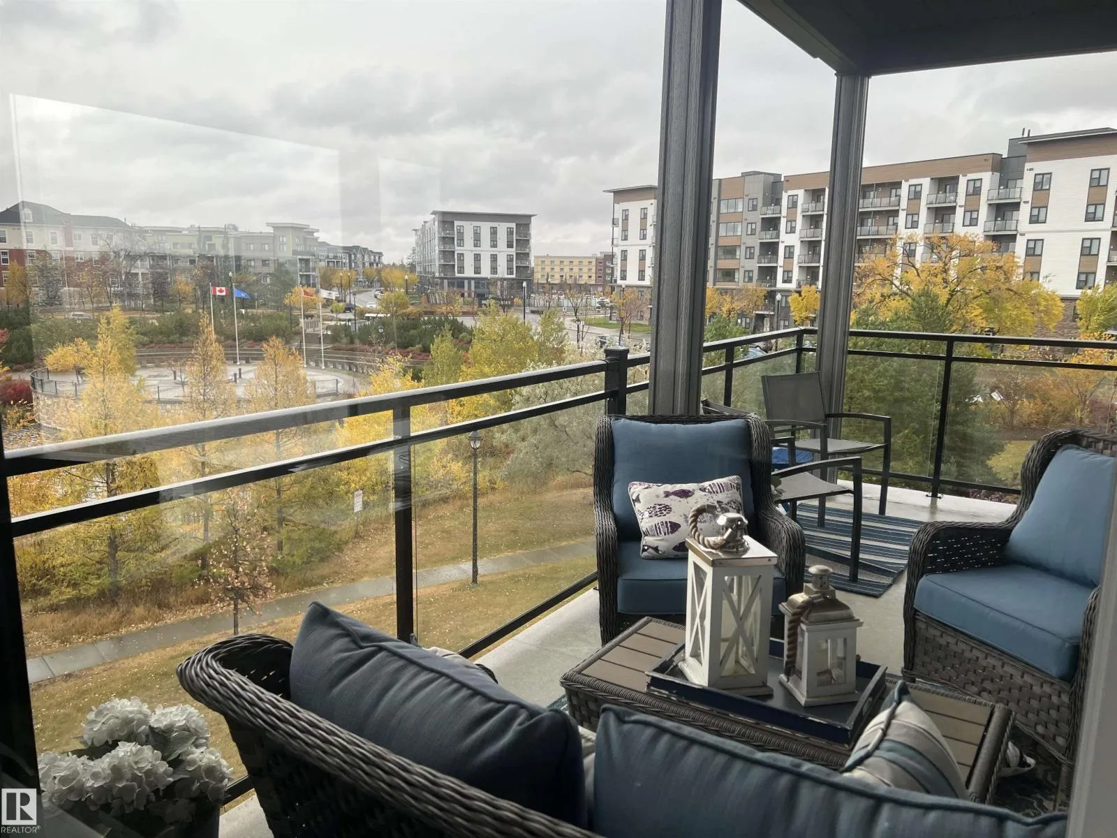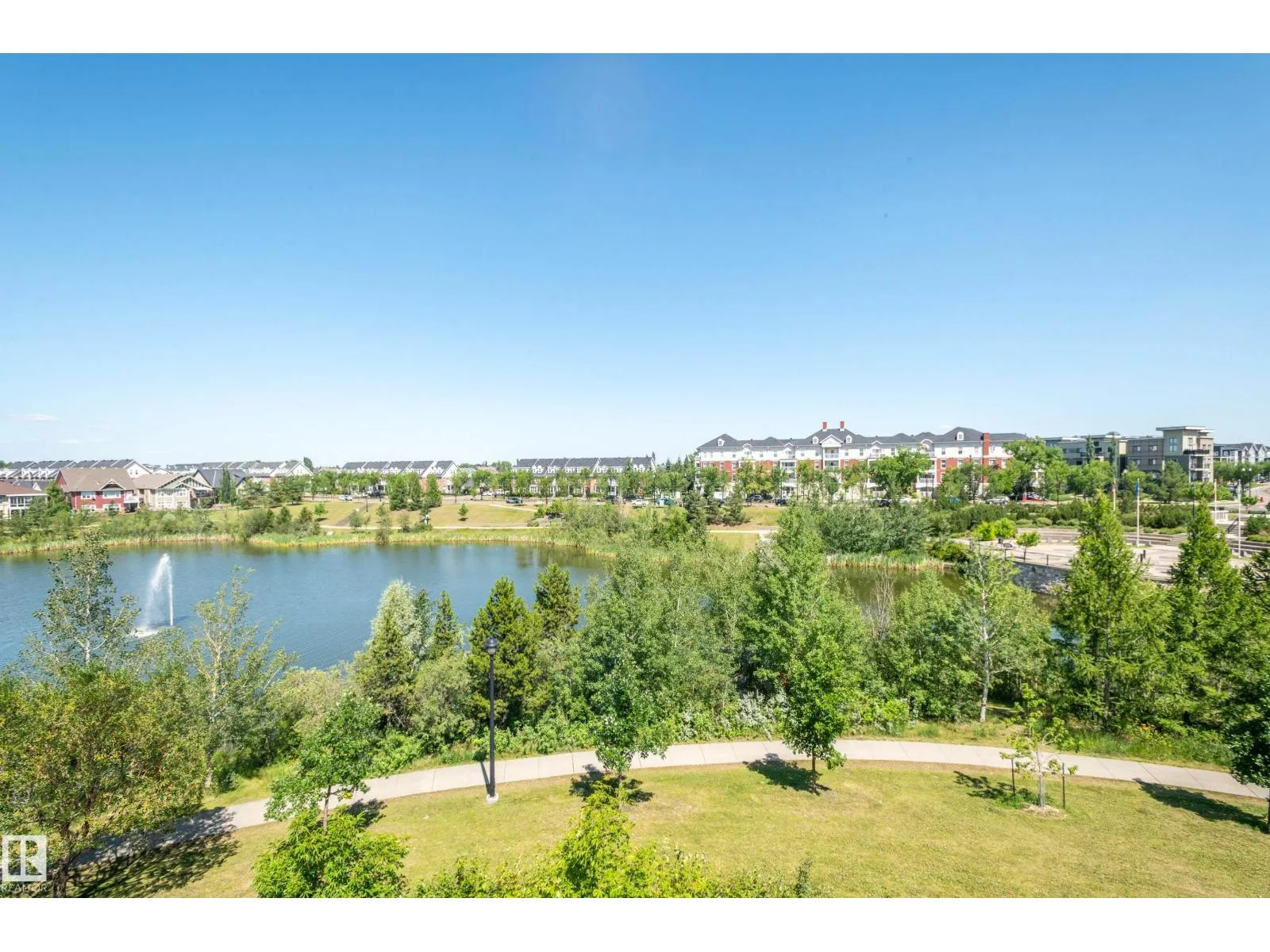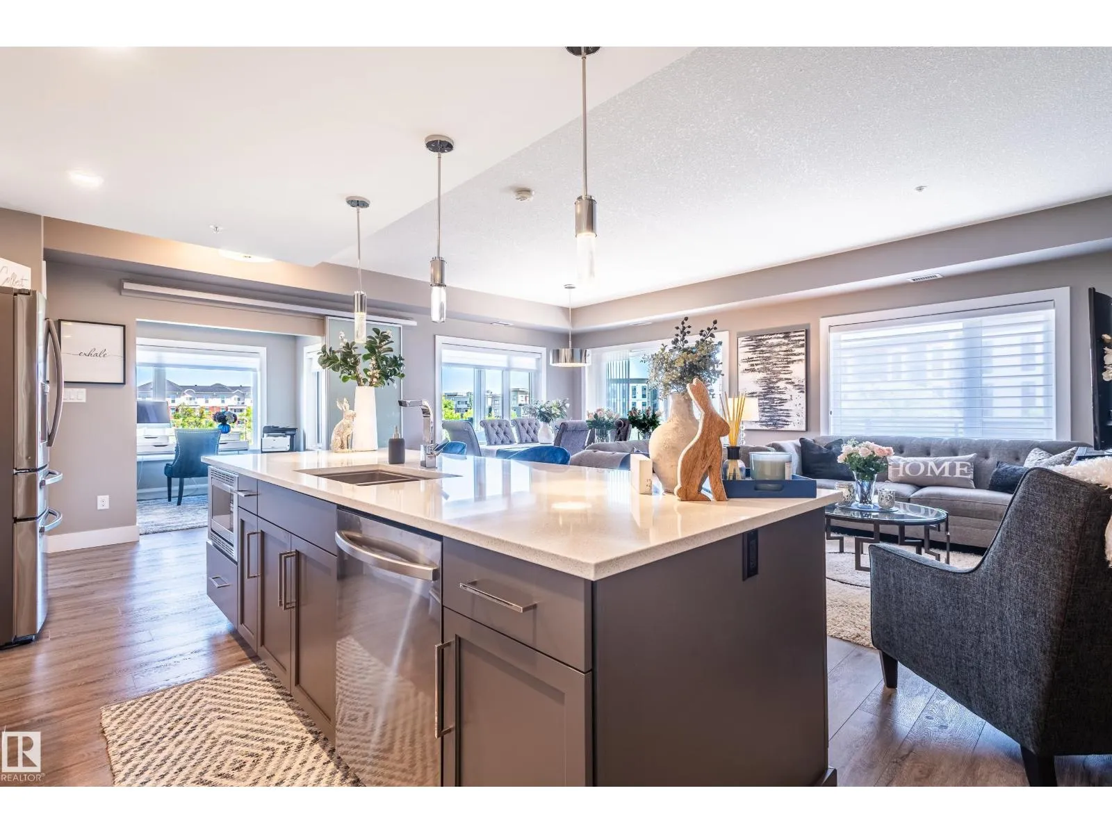 Extensively upgraded lake-facing corner unit in sought-after Veritas, offering awe-inspiring views from every angle. This immaculate one-owner home features 2 spacious bdrms, 2 baths, & a bright den. Enjoy sunny mornings & shady evenings on wrap-around deck. The two-tone kitchen is a standout with upgraded appliances, a tile backsplash, & a 6â extended island with added cabinetry on both sides. Designer lighting, magazine-worthy layout & décor, & a spa-inspired ensuite. A/C. Over $25,000 in thoughtful upgrades also include barn doors, premium flooring, custom shower tile, additional quartz countertops, blinds, hardware, & a second (surface) parking stall that adds everyday convenience, plus a heated stall with secure storage. Pride of ownership shines throughoutâclean, cozy, and stylish. Located steps from countless amenities in one of Edmontonâs most desirable communities, this home offers a seamless blend of comfort, elegance, and breathtaking views. Style meets serenity in this Griesbach gem! (id:27476)