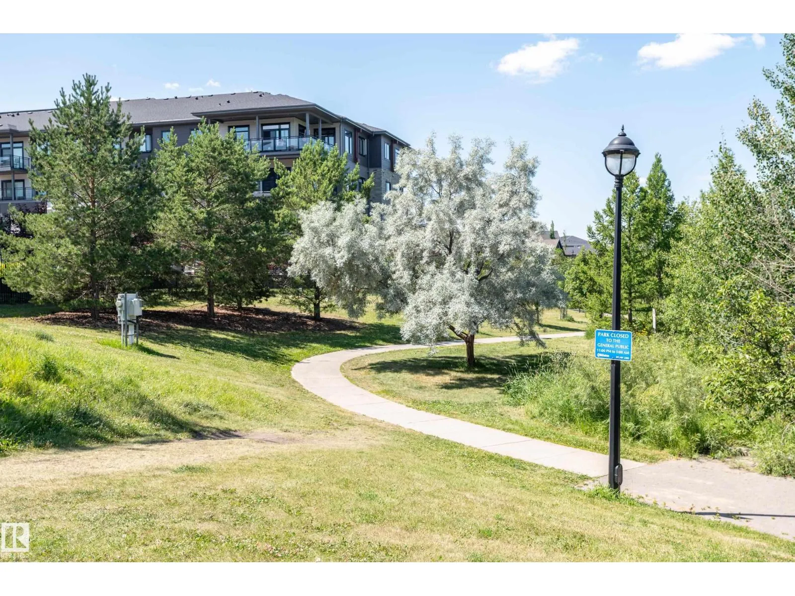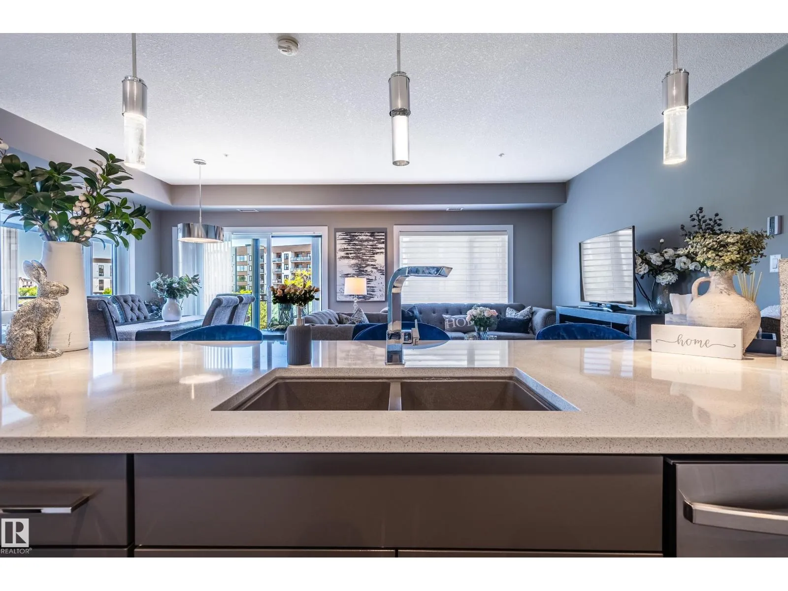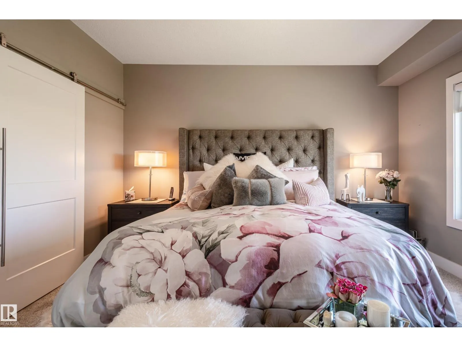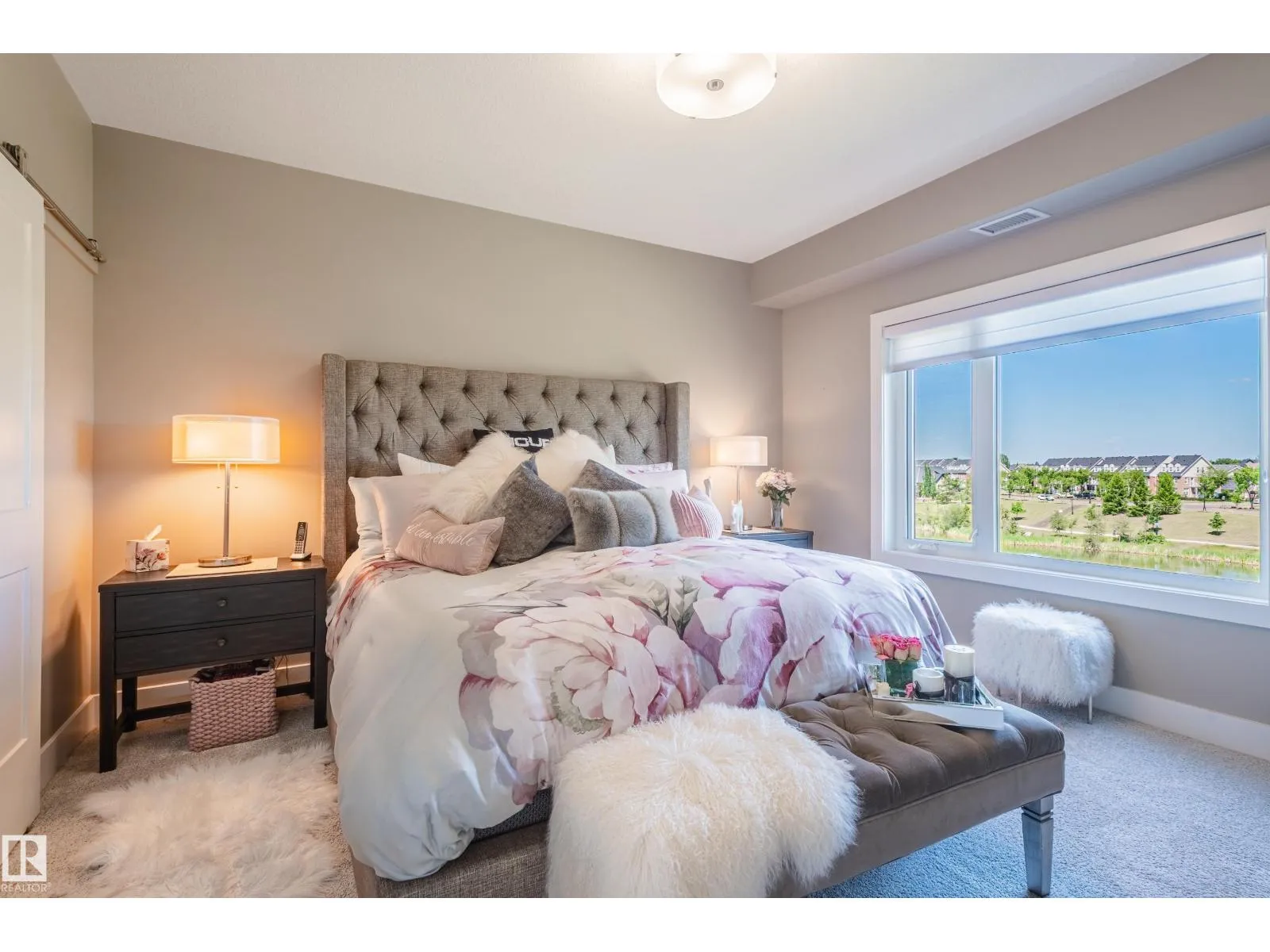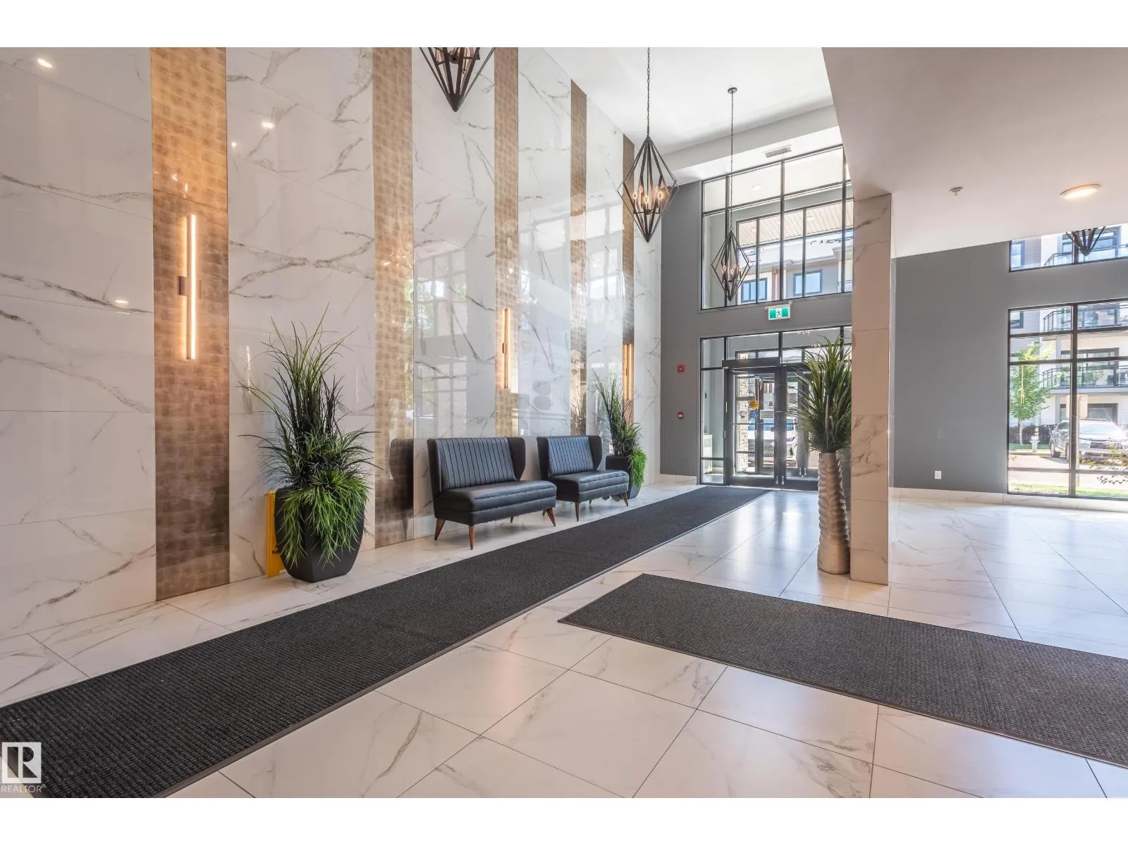 Extensively upgraded lake-facing corner unit in sought-after Veritas, offering awe-inspiring views from every angle. This immaculate one-owner home features 2 spacious bdrms, 2 baths, & a bright den. Enjoy sunny mornings & shady evenings on wrap-around deck. The two-tone kitchen is a standout with upgraded appliances, a tile backsplash, & a 6â extended island with added cabinetry on both sides. Designer lighting, magazine-worthy layout & décor, & a spa-inspired ensuite. A/C. Over $25,000 in thoughtful upgrades also include barn doors, premium flooring, custom shower tile, additional quartz countertops, blinds, hardware, & a second (surface) parking stall that adds everyday convenience, plus a heated stall with secure storage. Pride of ownership shines throughoutâclean, cozy, and stylish. Located steps from countless amenities in one of Edmontonâs most desirable communities, this home offers a seamless blend of comfort, elegance, and breathtaking views. Style meets serenity in this Griesbach gem! (id:27476)