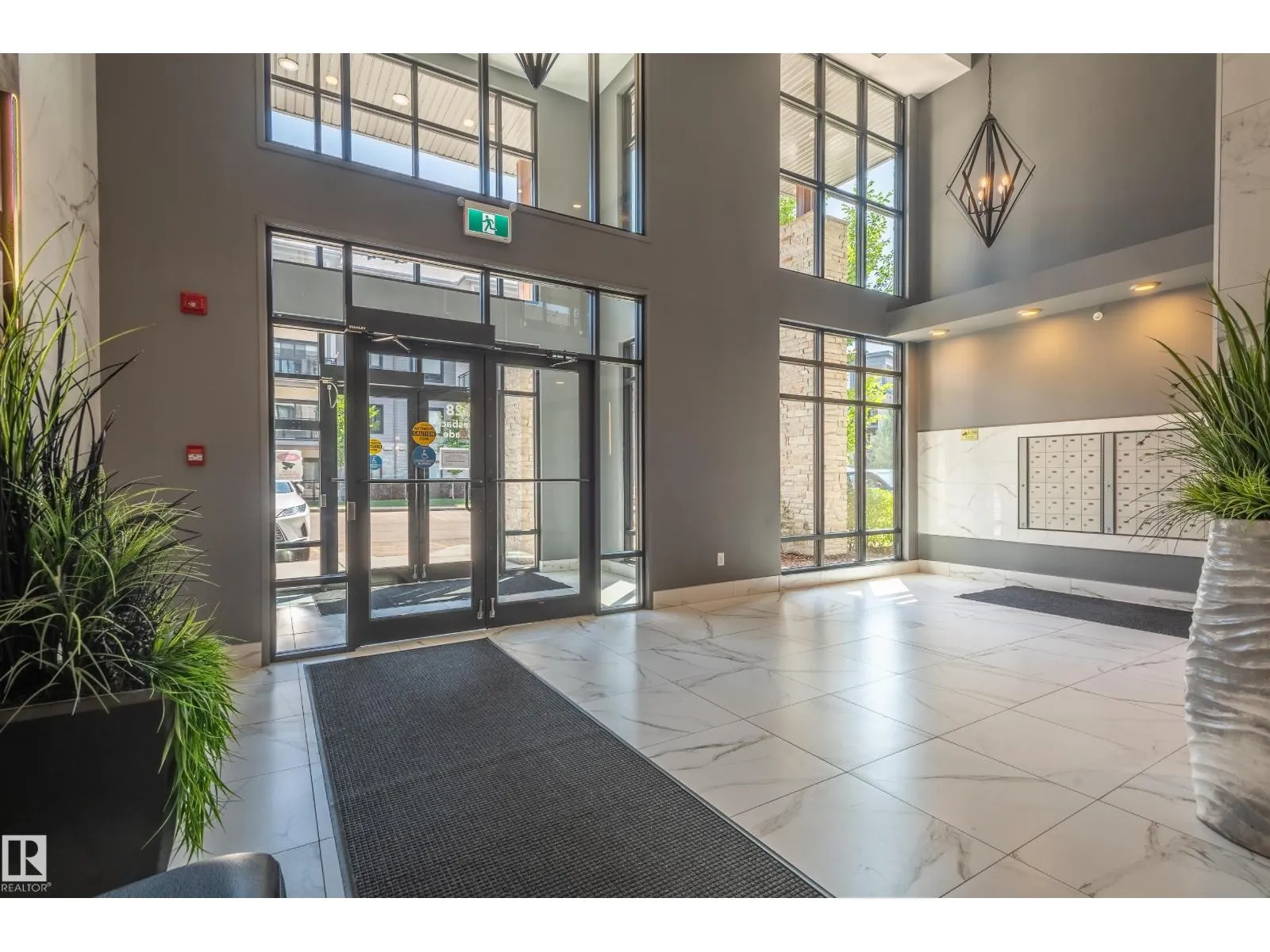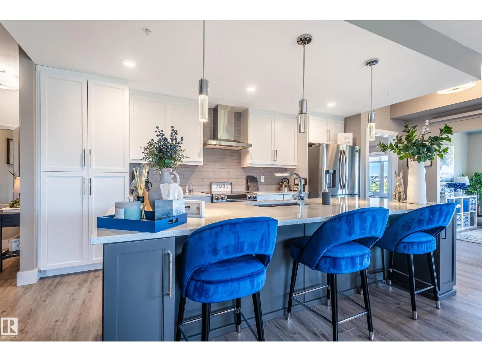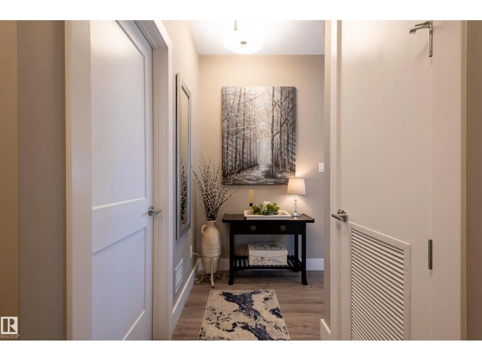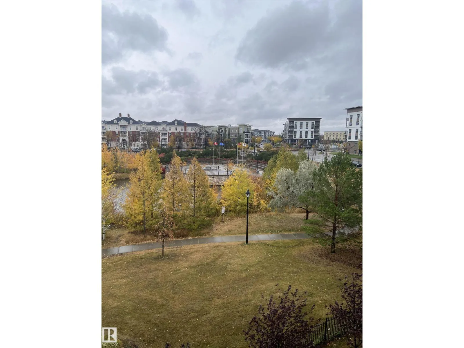 Extensively upgraded lake-facing corner unit in sought-after Veritas, offering awe-inspiring views from every angle. This immaculate one-owner home features 2 spacious bdrms, 2 baths, & a bright den. Enjoy sunny mornings & shady evenings on wrap-around deck. The two-tone kitchen is a standout with upgraded appliances, a tile backsplash, & a 6â extended island with added cabinetry on both sides. Designer lighting, magazine-worthy layout & décor, & a spa-inspired ensuite. A/C. Over $25,000 in thoughtful upgrades also include barn doors, premium flooring, custom shower tile, additional quartz countertops, blinds, hardware, & a second (surface) parking stall that adds everyday convenience, plus a heated stall with secure storage. Pride of ownership shines throughoutâclean, cozy, and stylish. Located steps from countless amenities in one of Edmontonâs most desirable communities, this home offers a seamless blend of comfort, elegance, and breathtaking views. Style meets serenity in this Griesbach gem! (id:27476)