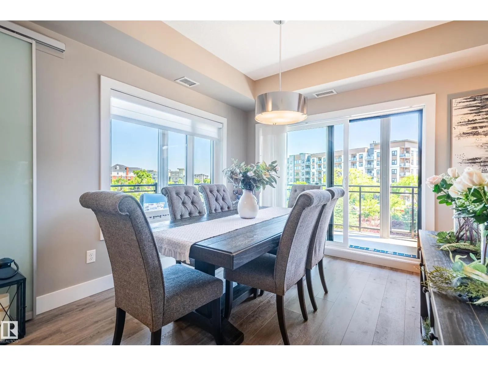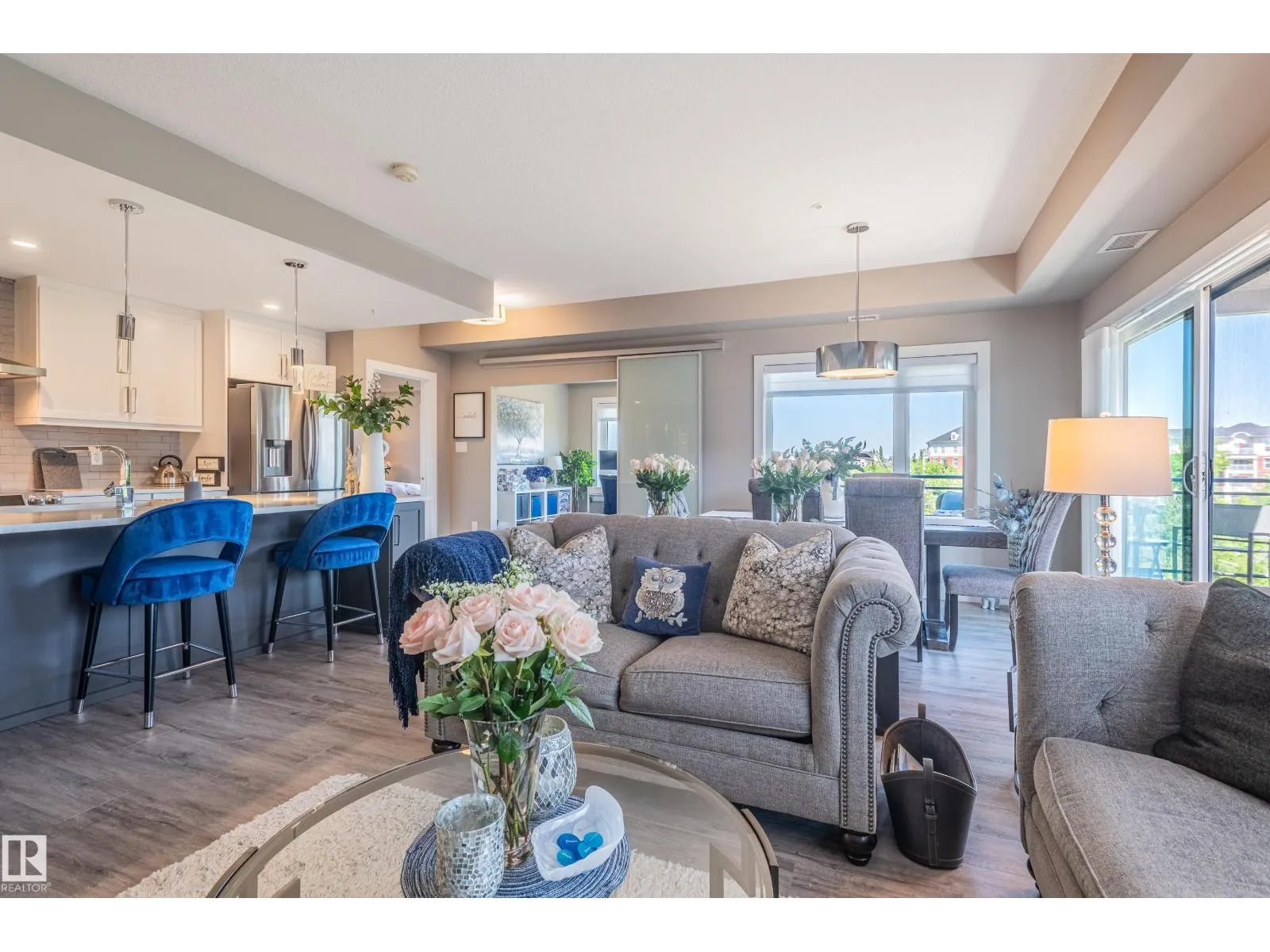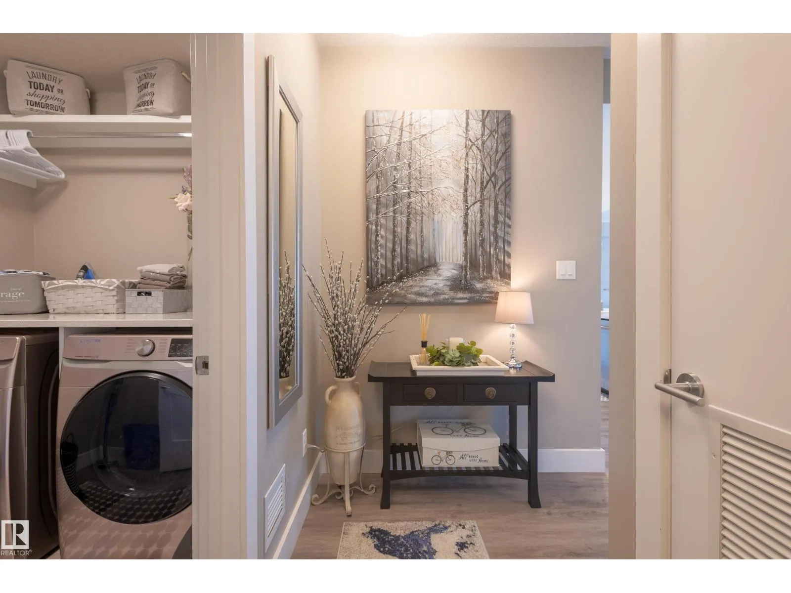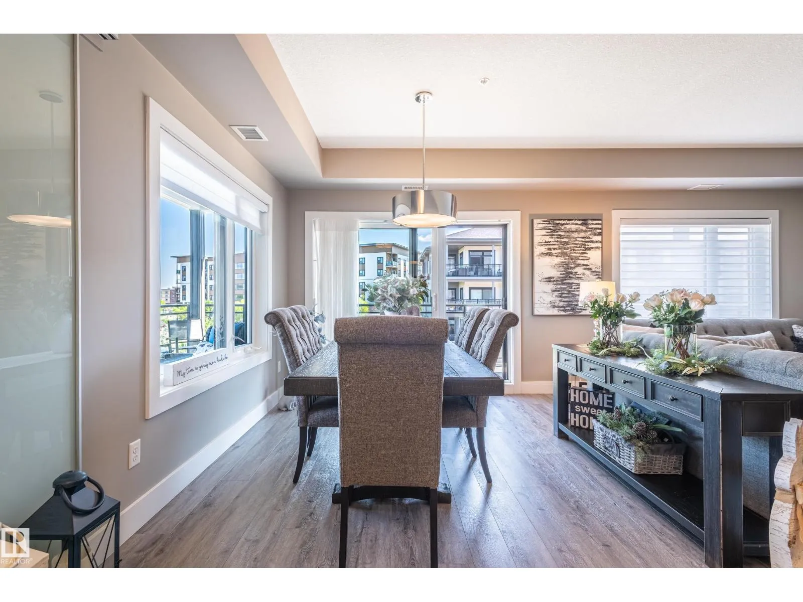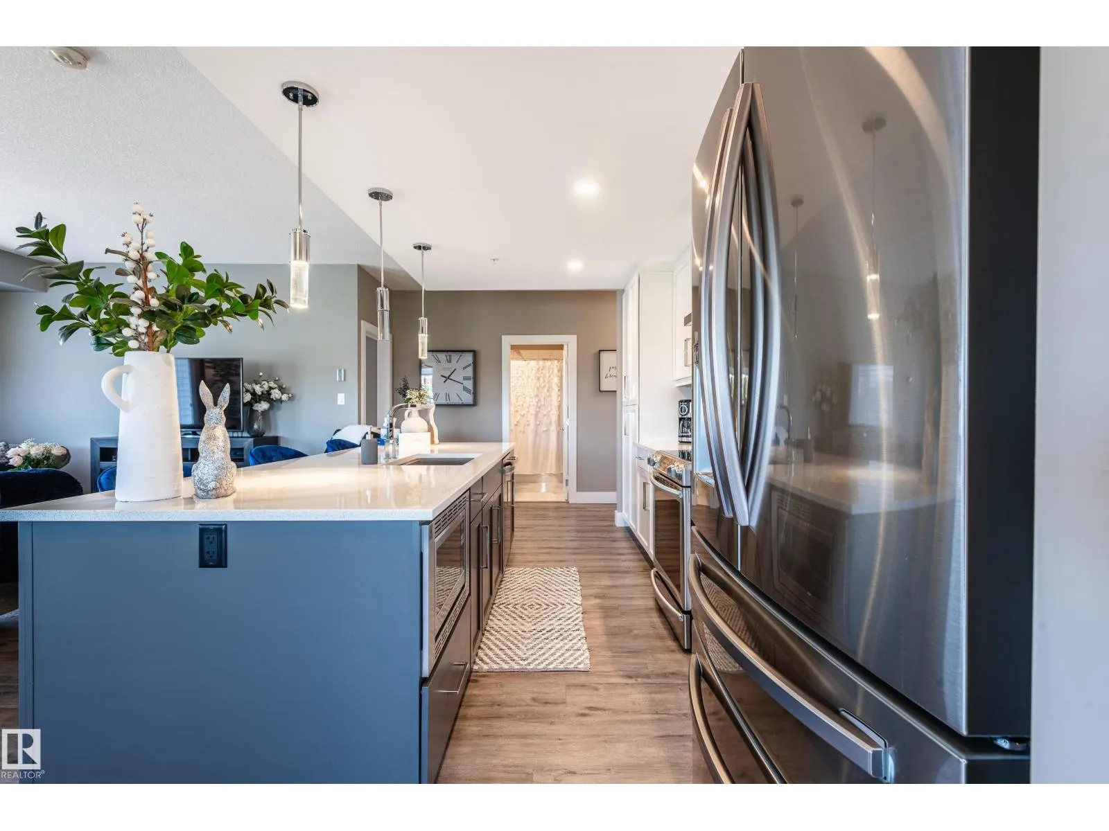Extensively upgraded lake-facing corner unit in sought-after Veritas, offering awe-inspiring views from every angle. This immaculate one-owner home features 2 spacious bdrms, 2 baths, & a bright den. Enjoy sunny mornings & shady evenings on wrap-around deck. The two-tone kitchen is a standout with upgraded appliances, a tile backsplash, & a 6â extended island with added cabinetry on both sides. Designer lighting, magazine-worthy layout & décor, & a spa-inspired ensuite. A/C. Over $25,000 in thoughtful upgrades also include barn doors, premium flooring, custom shower tile, additional quartz countertops, blinds, hardware, & a second (surface) parking stall that adds everyday convenience, plus a heated stall with secure storage. Pride of ownership shines throughoutâclean, cozy, and stylish. Located steps from countless amenities in one of Edmontonâs most desirable communities, this home offers a seamless blend of comfort, elegance, and breathtaking views. Style meets serenity in this Griesbach gem! (id:27476)