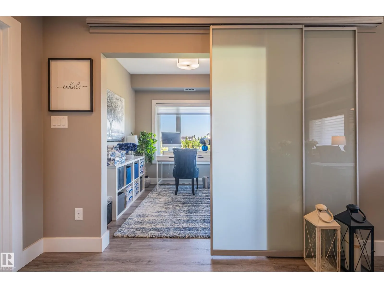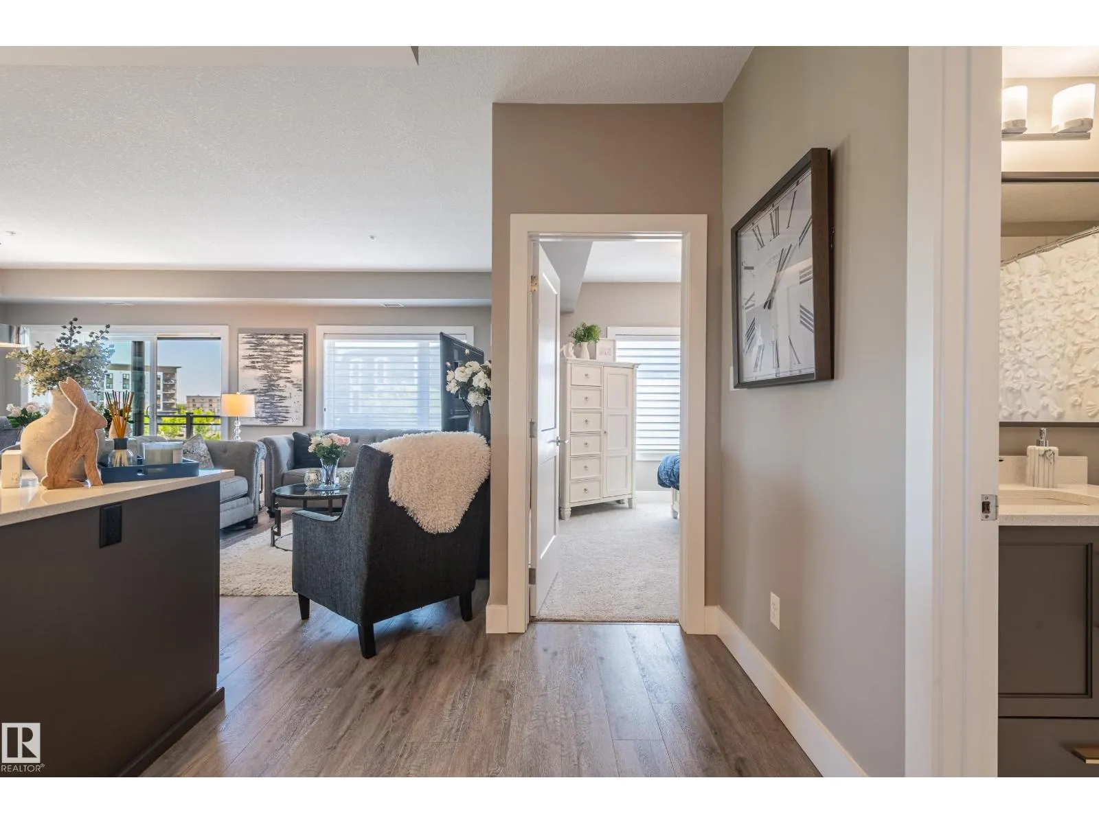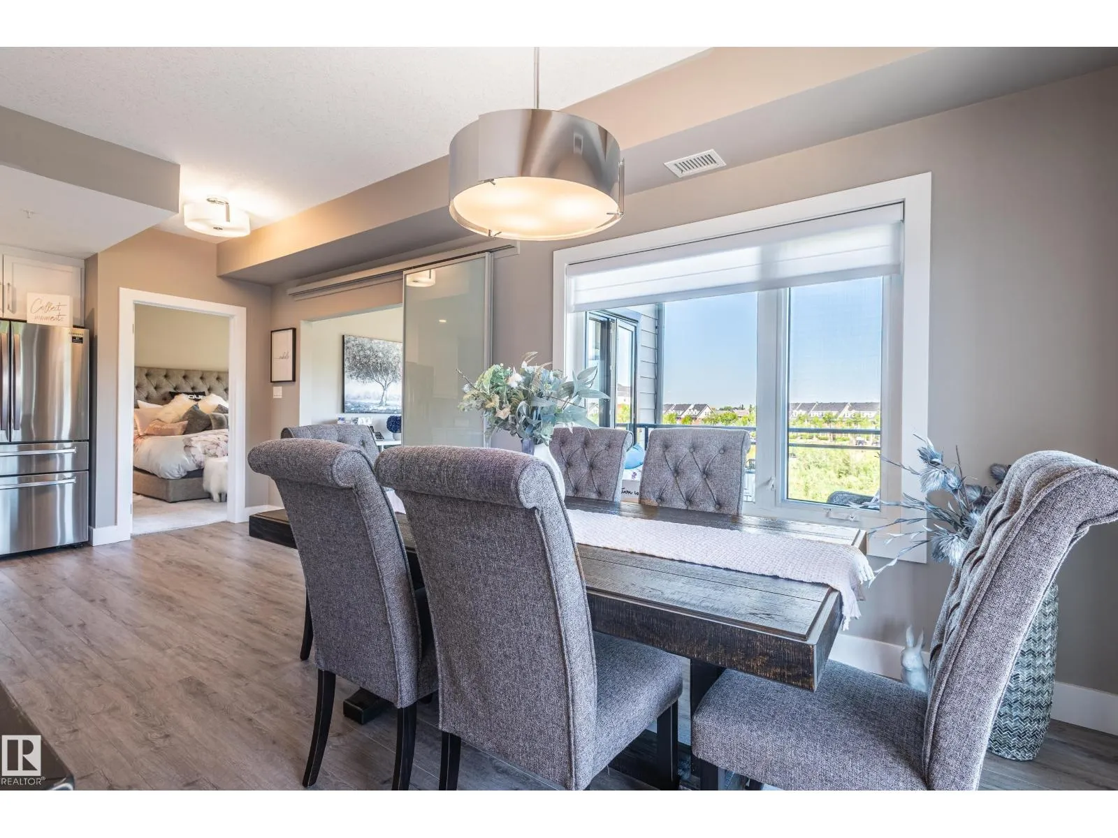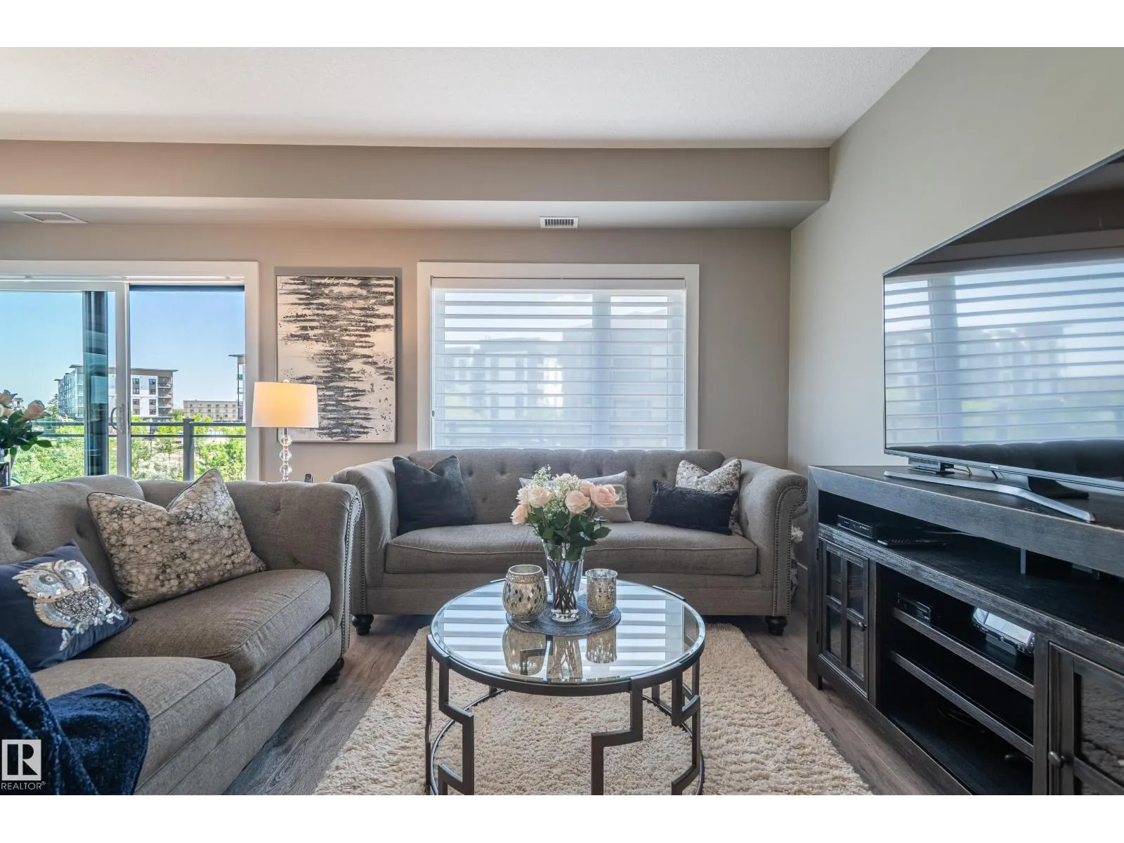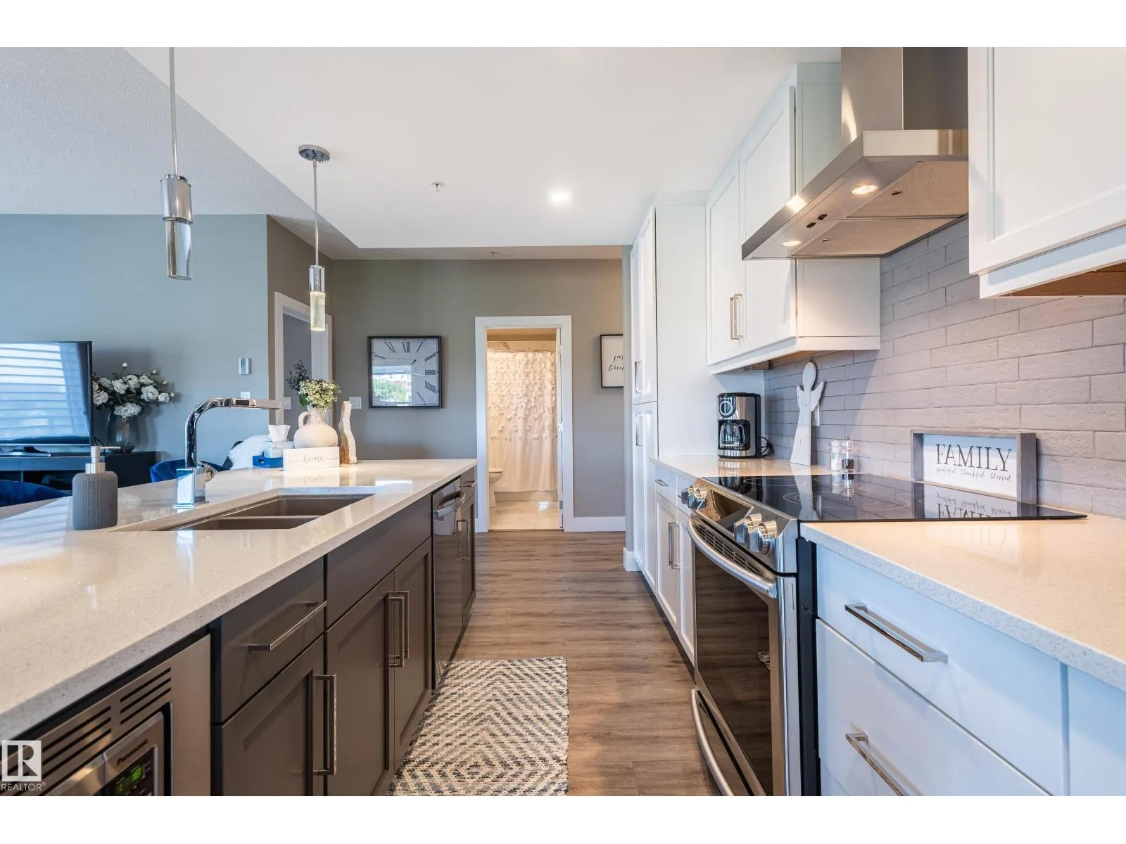 Extensively upgraded lake-facing corner unit in sought-after Veritas, offering awe-inspiring views from every angle. This immaculate one-owner home features 2 spacious bdrms, 2 baths, & a bright den. Enjoy sunny mornings & shady evenings on wrap-around deck. The two-tone kitchen is a standout with upgraded appliances, a tile backsplash, & a 6â extended island with added cabinetry on both sides. Designer lighting, magazine-worthy layout & décor, & a spa-inspired ensuite. A/C. Over $25,000 in thoughtful upgrades also include barn doors, premium flooring, custom shower tile, additional quartz countertops, blinds, hardware, & a second (surface) parking stall that adds everyday convenience, plus a heated stall with secure storage. Pride of ownership shines throughoutâclean, cozy, and stylish. Located steps from countless amenities in one of Edmontonâs most desirable communities, this home offers a seamless blend of comfort, elegance, and breathtaking views. Style meets serenity in this Griesbach gem! (id:27476)