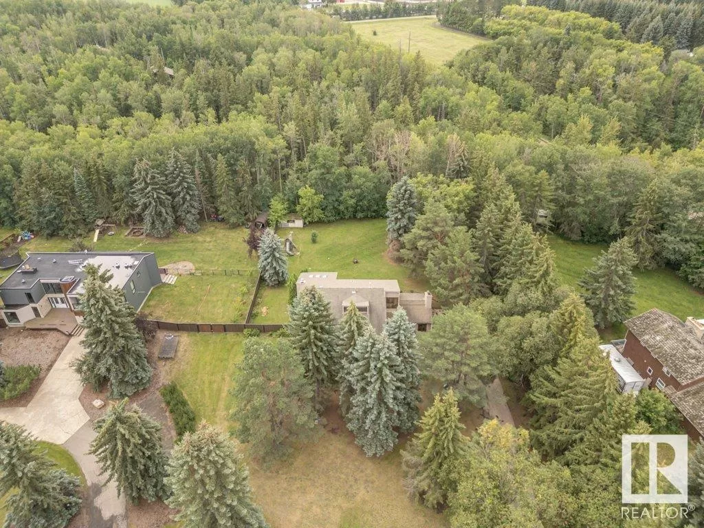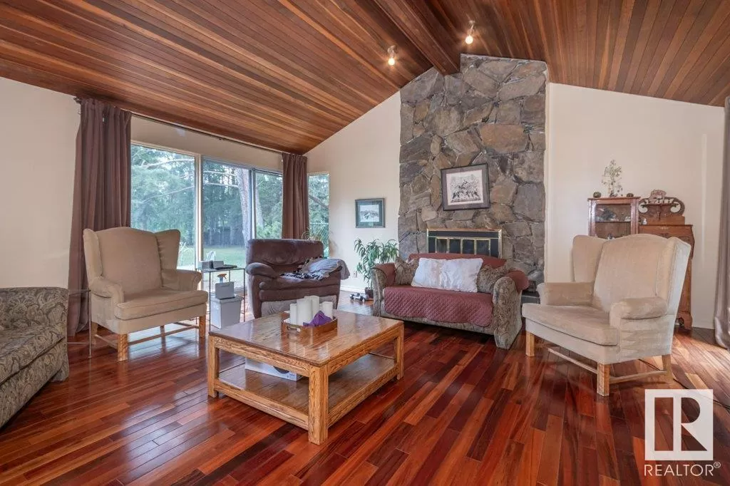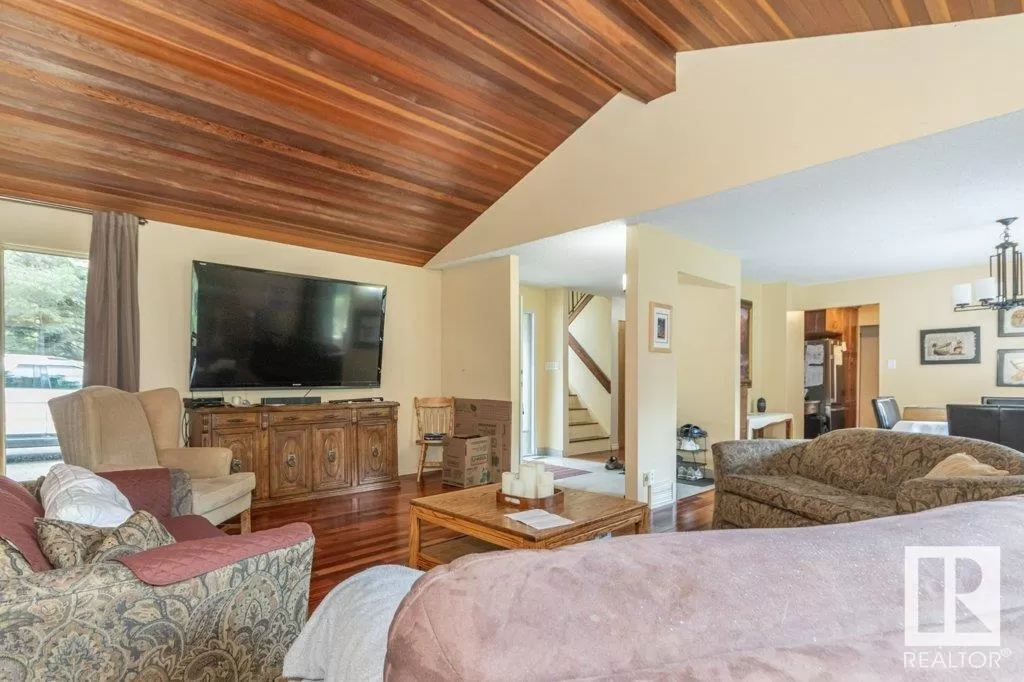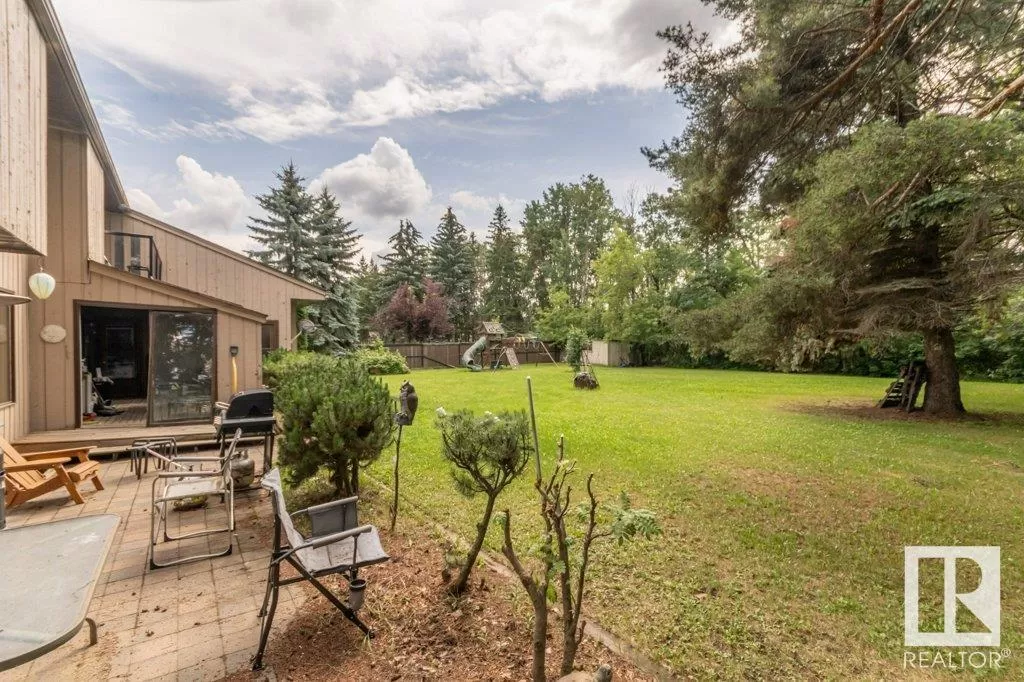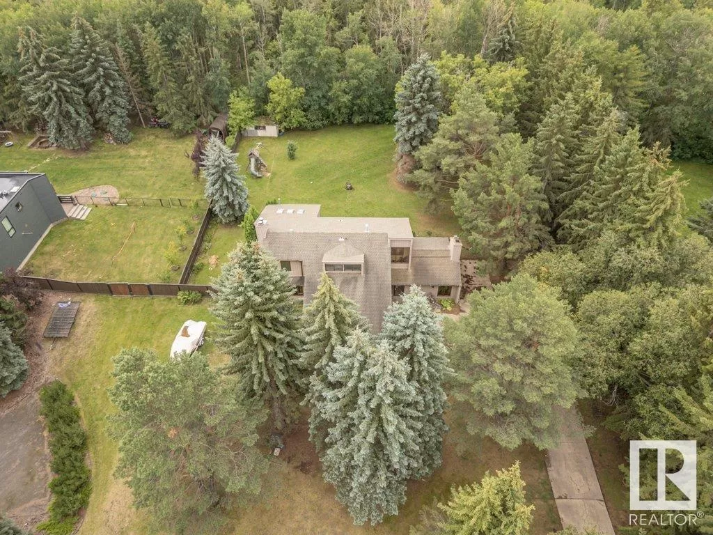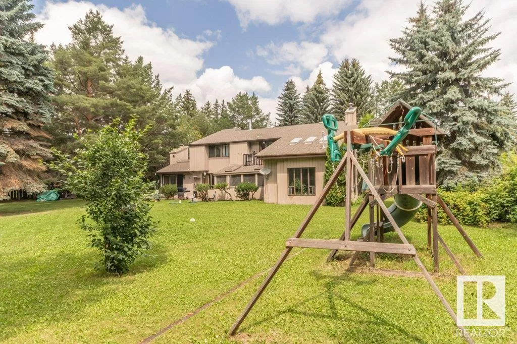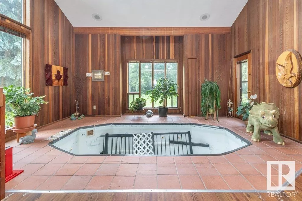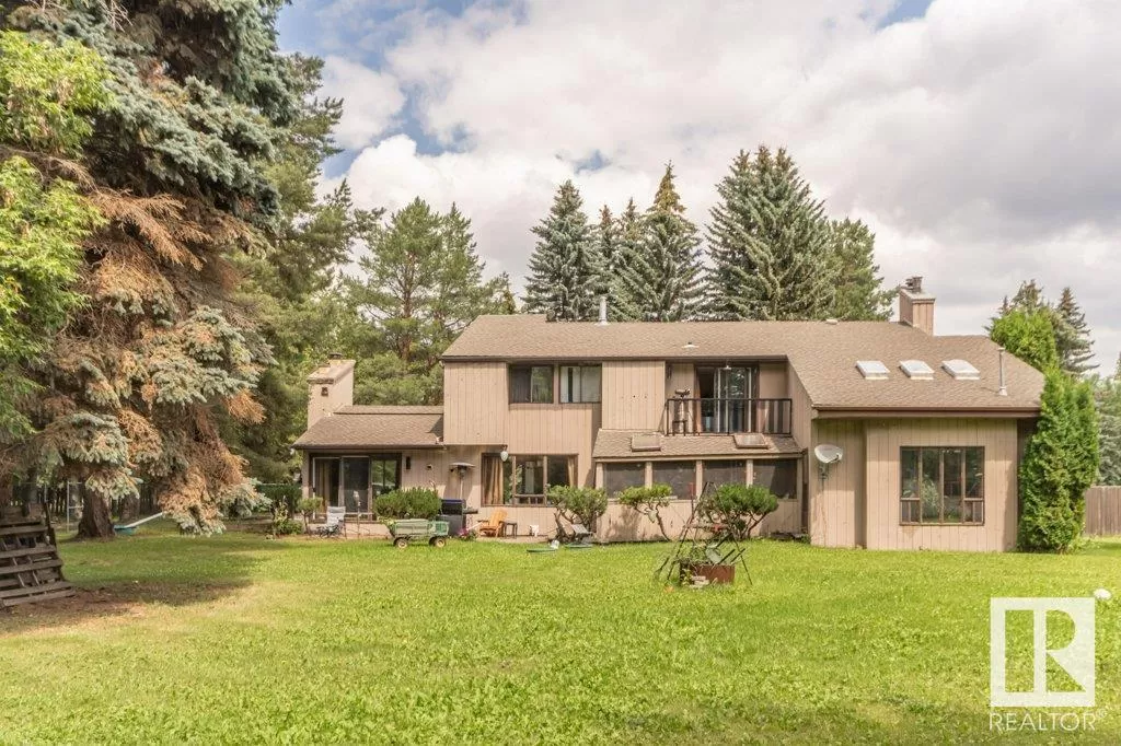 Beautiful setting on the 1.03 acre lot in the City of Edmonton. This home is over 3000 sq ft and features three wood burning fireplaces. Large living area with vaulted ceilings galley kitchen family room with view into lap pool area. Large master bedroom with library area and fireplace and two additional bedrooms on the upper level. The basement is unspoiled and ready for development. Time to renovated or hold for future estate. (id:27476)