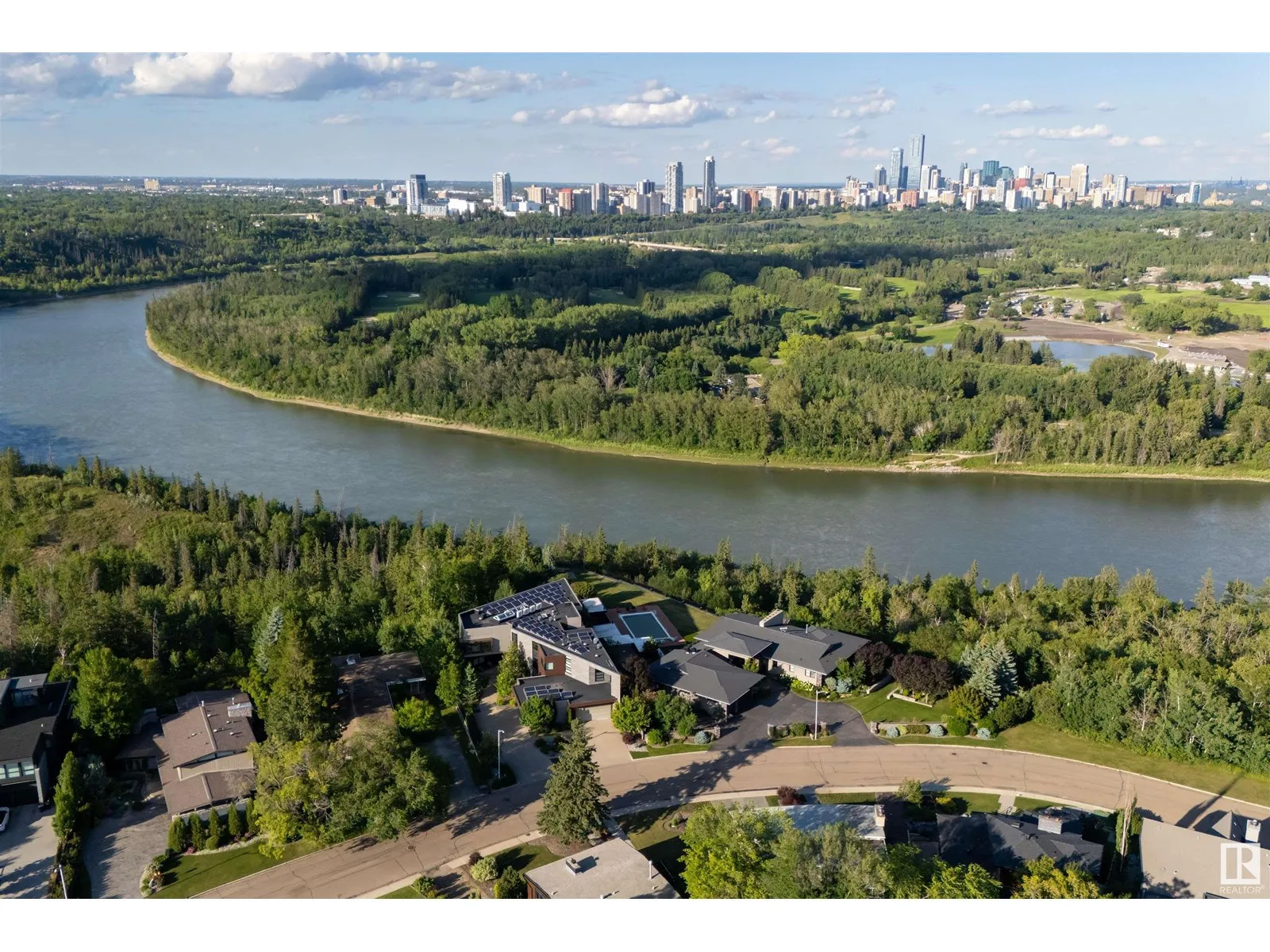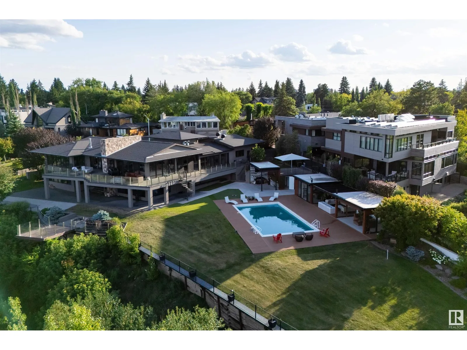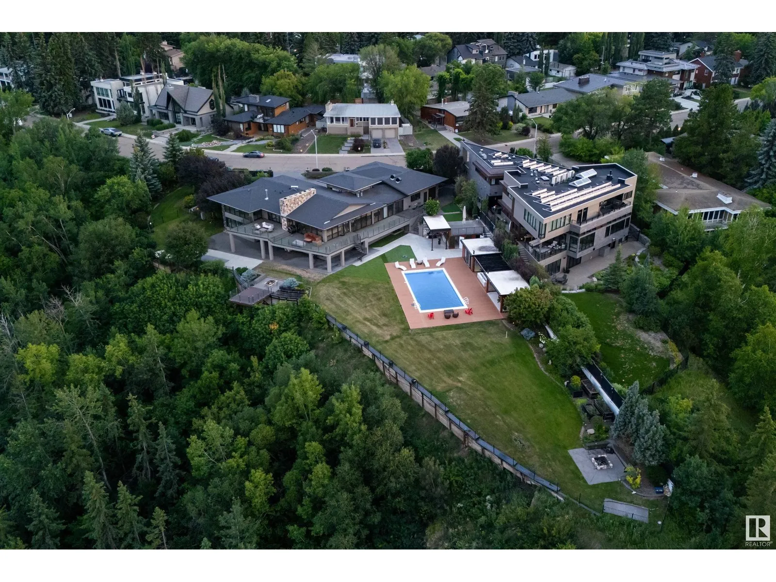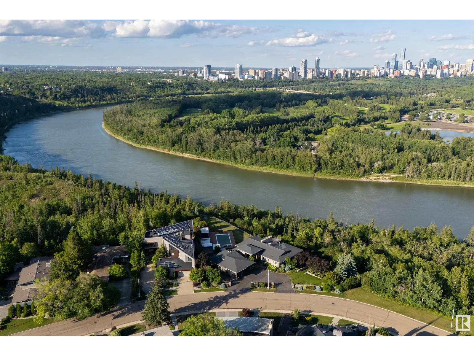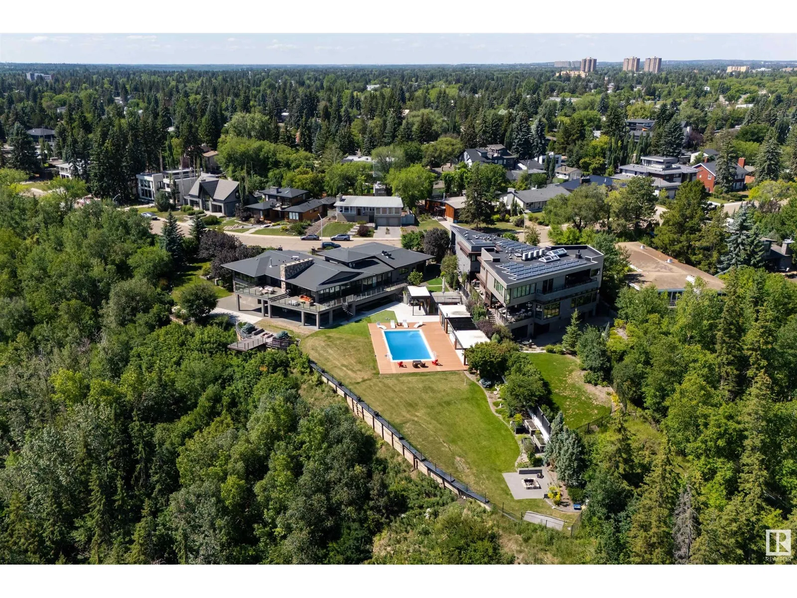 An iconic address with world-class views. Welcome to 13758 Valleyview Drive. Set on an extraordinary 49,000+ sq ft lot with unobstructed panoramic views of downtown Edmonton and the river valley, this custom-built estate offers over 6,500 sq ft of elevated living. Every detail has been crafted for luxury, from the grand chefâs kitchen and open-concept living spaces to the expansive main deck designed for upscale entertaining. Nearly every room captures breathtaking vistas. The upper level is anchored by a lavish primary retreat with spa-like ensuite, boutique-style walk-in closet, sitting lounge, and wet bar. The walkout basement features a private theatre, billiards room, wet bar, office, and guest suite. Step outside to your resort-style backyard with a spectacular in-ground pool and mature landscaping. A rare opportunity on one of Edmontonâs most prestigious streets. (id:27476)