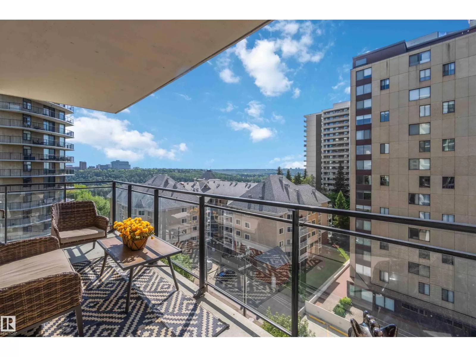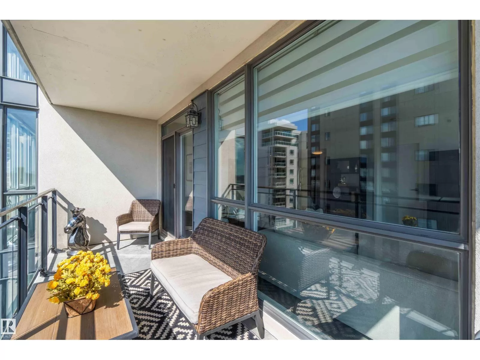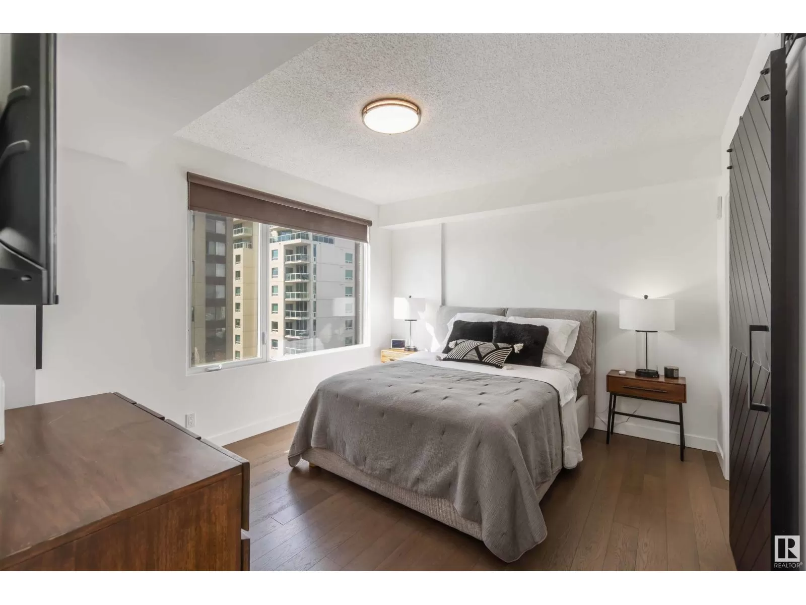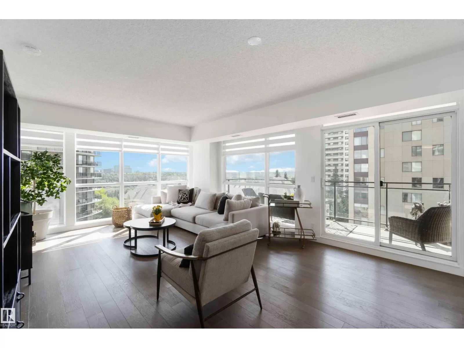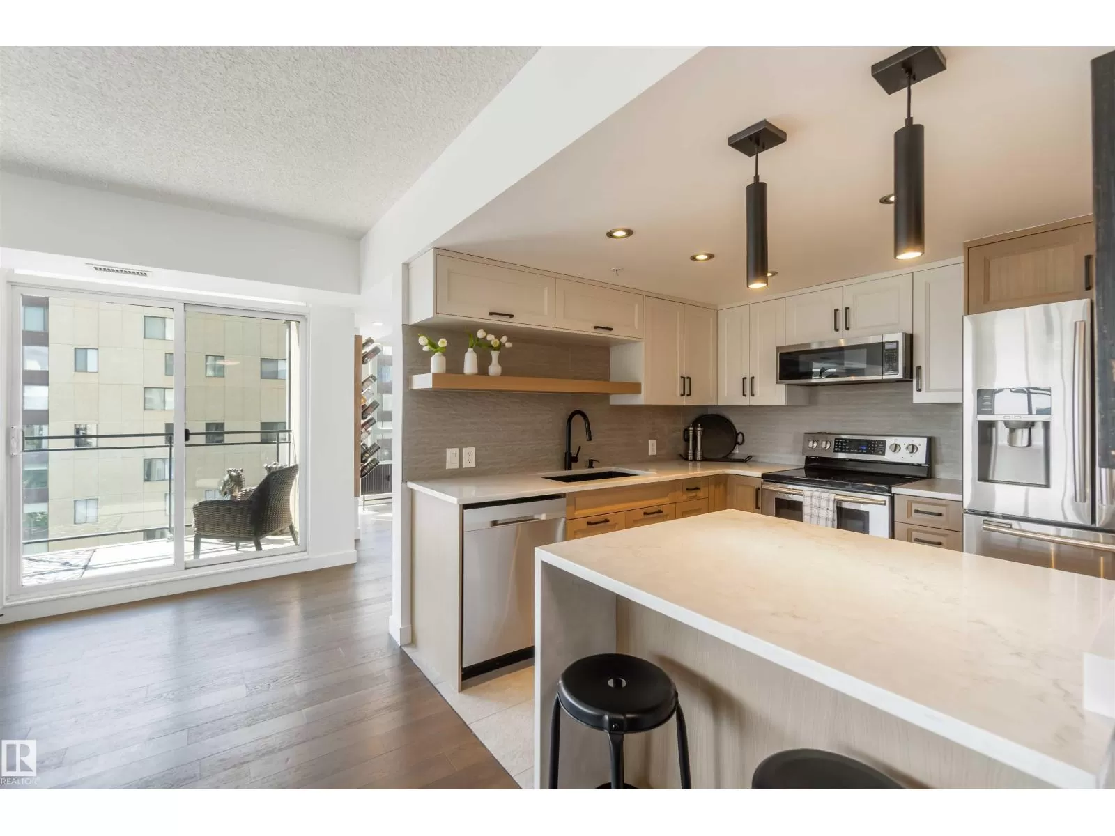 TOTALLY UPGRADED! CONCRETE BUILDING! RIVER VALLEY VIEW! WELCOME TO ONE OF DOWNTOWN EDMONTON'S BEST; 802, 10046 117 STREET. THIS 8TH FLOOR UPTOWN ESTATES UNIT HAS ALMOST 1100 SQ FT OF LIVING SPACE, 2 BEDROOMS, 2 BATHS, AND TITLED PARKING. THE UPGRADED CUSTOM KITCHEN HAS A BREATHTAKING WATERFALL STYLE ISLAND WITH QUARTZ COUNTERTOPS, SOFT-CLOSE 2 TONED CABINETRY WITH BLACK-PEARL HARDWARE, NEW APPLIANCES, TILE FLOORS, AND NEW BACKSPLASH. UNIT HAS UPGRADED PARK-LIGHTING THROUGHOUT AND ELECTRIC BLINDS. LIVING AREA HAS ENGINEERED FLOORS. DINING AREA HAS EXTERIOR DECK ACCESS. PRIMARY BEDROOM IS MASSIVE WITH A LARGE WALK-IN CLOSET AND BARN DOOR ENSUITE ACCESS. ENSUITE OFFERS AN OVAL STAND-ALONE TUB, DOUBLE SINKS, AND A GLASS SHOWER. SECONDARY BEDROOM IS SPACIOUS WITH DOUBLE CLOSETS. UNIT ALSO HAS A FLEX AREA/STUDY, LAUNDRY, MAIN BATH WITH SHOWER, AND CENTRAL AIR CONDITIONING. BUILDING HAS A SHARED GYM, SOCIAL ROOM, AND SECURED UNDERGROUND PARKING. LOCATED STEPS FROM THE RIVER. (id:27476)