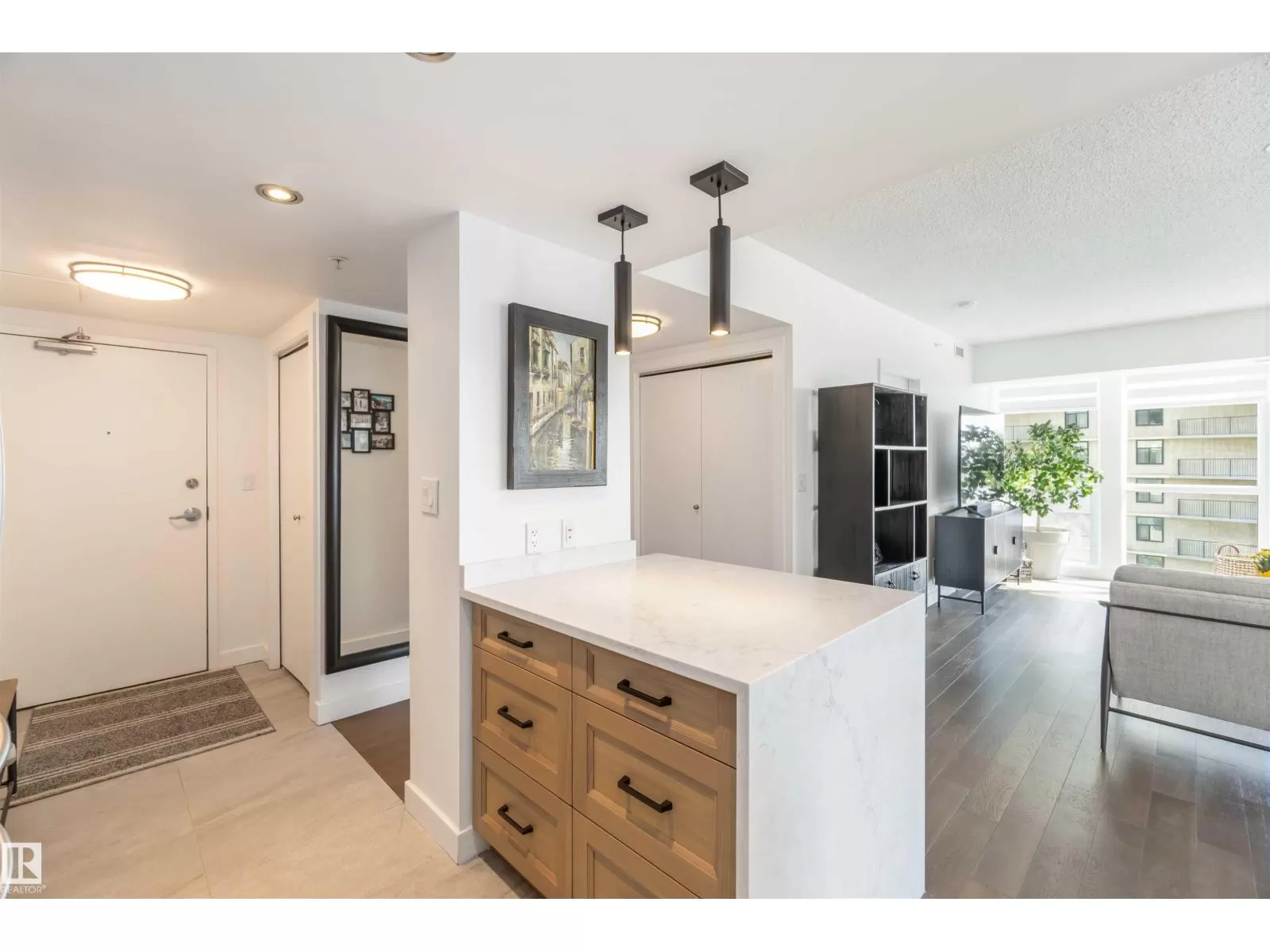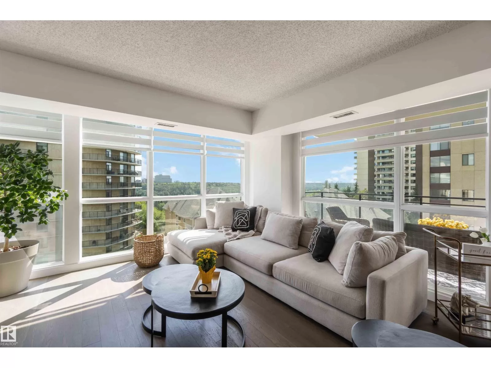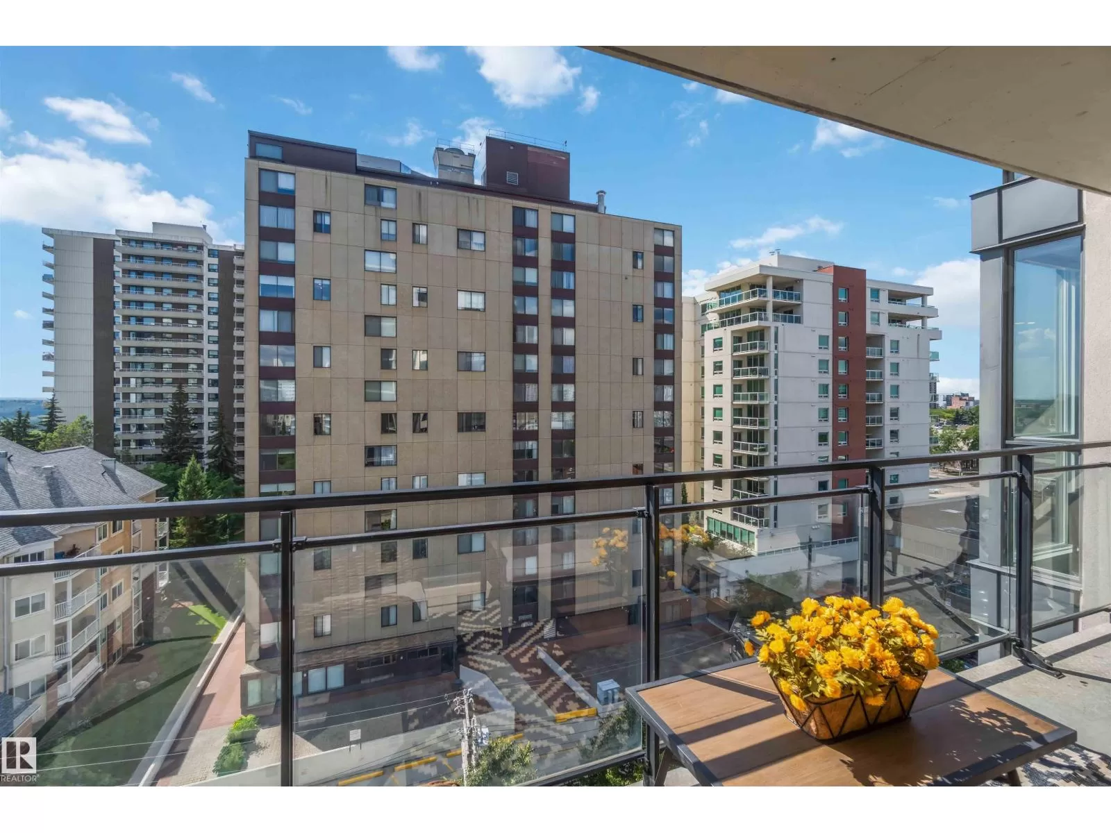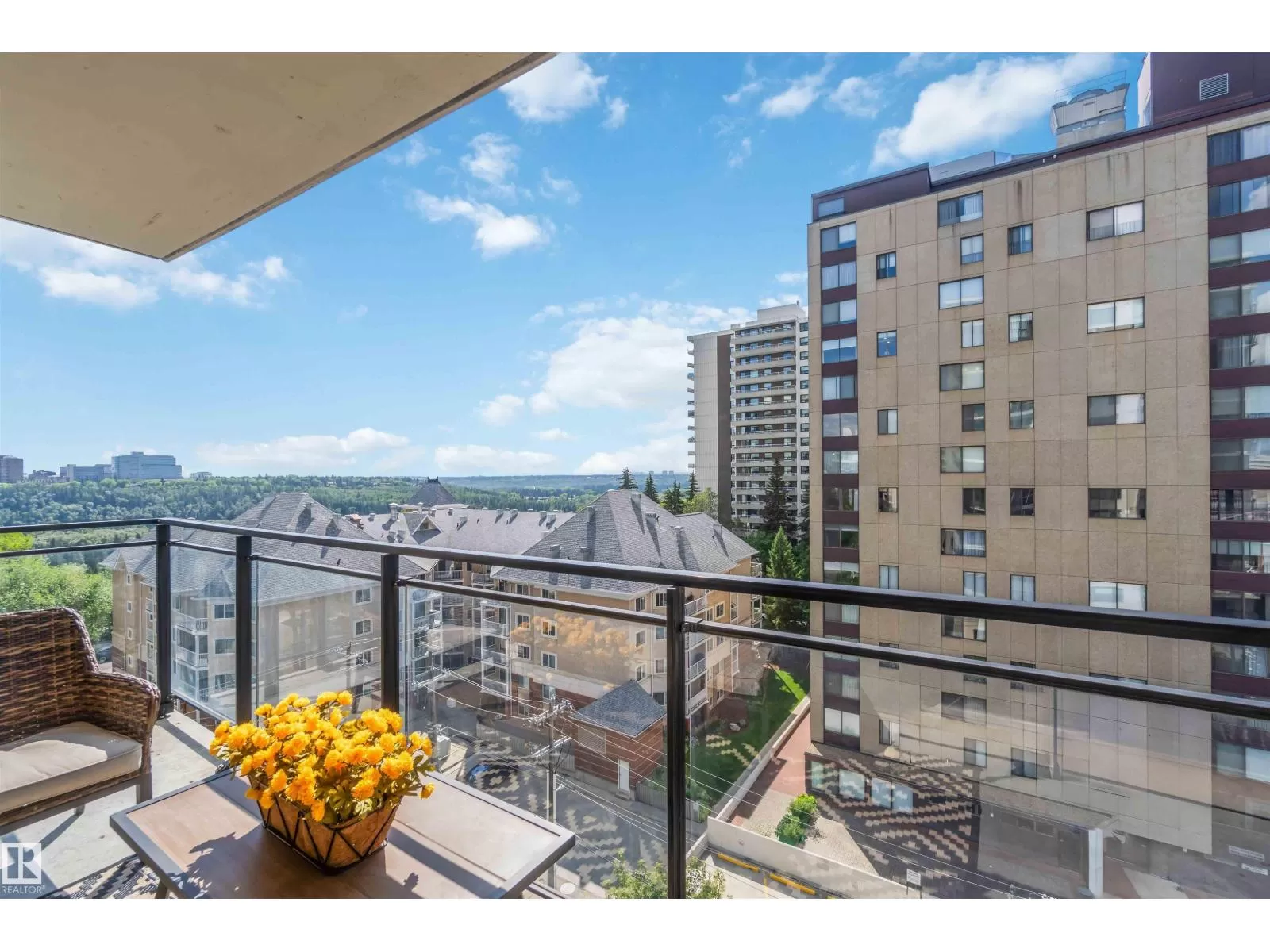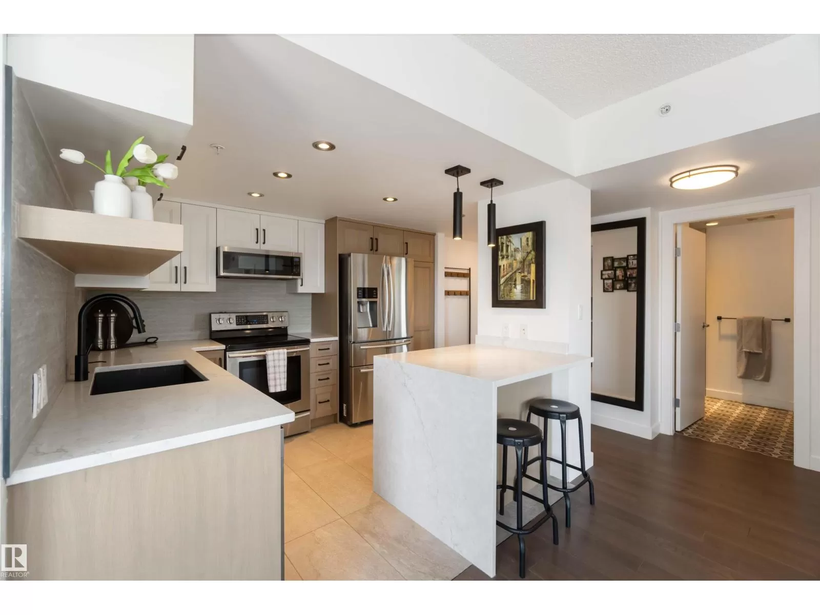 TOTALLY UPGRADED! CONCRETE BUILDING! RIVER VALLEY VIEW! WELCOME TO ONE OF DOWNTOWN EDMONTON'S BEST; 802, 10046 117 STREET. THIS 8TH FLOOR UPTOWN ESTATES UNIT HAS ALMOST 1100 SQ FT OF LIVING SPACE, 2 BEDROOMS, 2 BATHS, AND TITLED PARKING. THE UPGRADED CUSTOM KITCHEN HAS A BREATHTAKING WATERFALL STYLE ISLAND WITH QUARTZ COUNTERTOPS, SOFT-CLOSE 2 TONED CABINETRY WITH BLACK-PEARL HARDWARE, NEW APPLIANCES, TILE FLOORS, AND NEW BACKSPLASH. UNIT HAS UPGRADED PARK-LIGHTING THROUGHOUT AND ELECTRIC BLINDS. LIVING AREA HAS ENGINEERED FLOORS. DINING AREA HAS EXTERIOR DECK ACCESS. PRIMARY BEDROOM IS MASSIVE WITH A LARGE WALK-IN CLOSET AND BARN DOOR ENSUITE ACCESS. ENSUITE OFFERS AN OVAL STAND-ALONE TUB, DOUBLE SINKS, AND A GLASS SHOWER. SECONDARY BEDROOM IS SPACIOUS WITH DOUBLE CLOSETS. UNIT ALSO HAS A FLEX AREA/STUDY, LAUNDRY, MAIN BATH WITH SHOWER, AND CENTRAL AIR CONDITIONING. BUILDING HAS A SHARED GYM, SOCIAL ROOM, AND SECURED UNDERGROUND PARKING. LOCATED STEPS FROM THE RIVER. (id:27476)