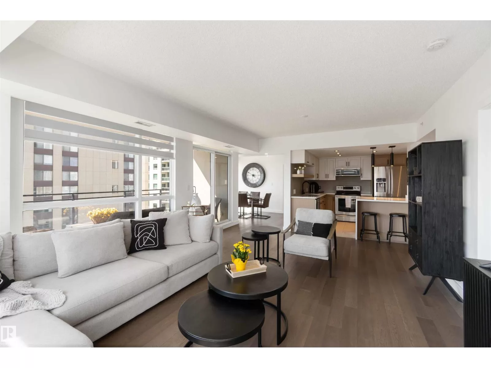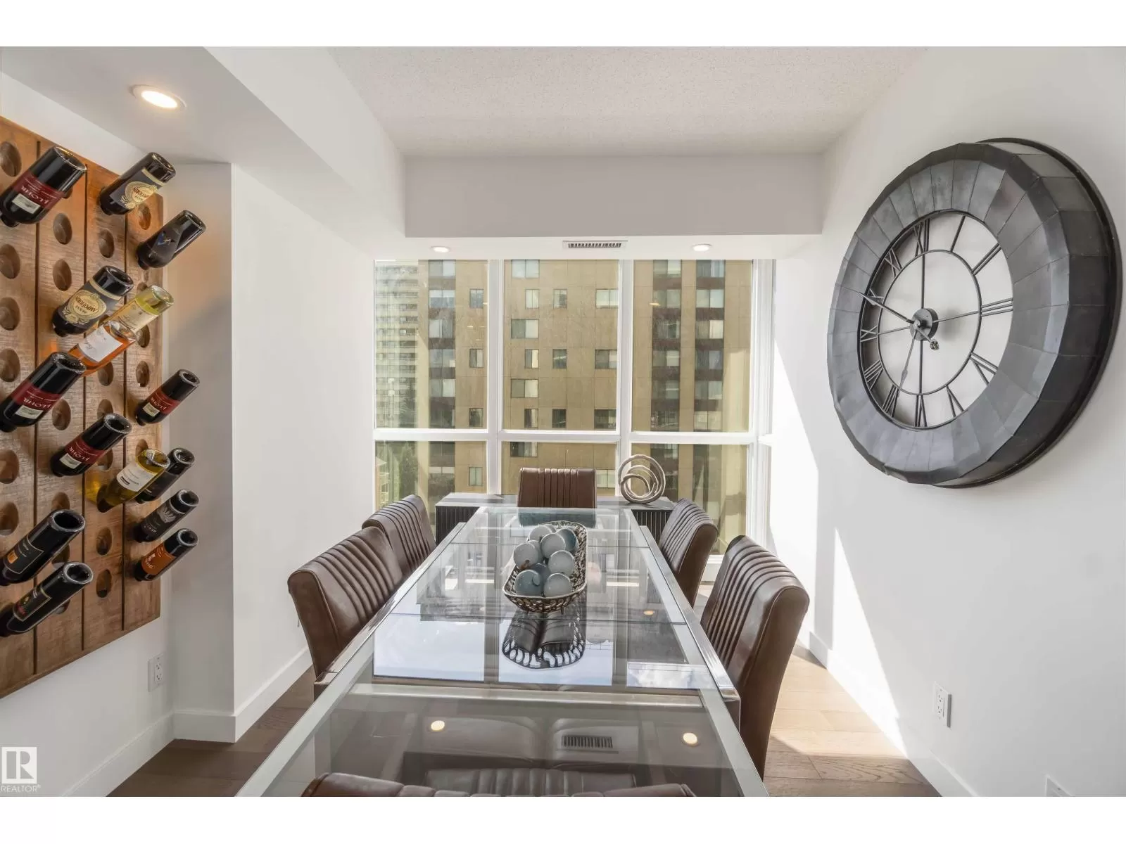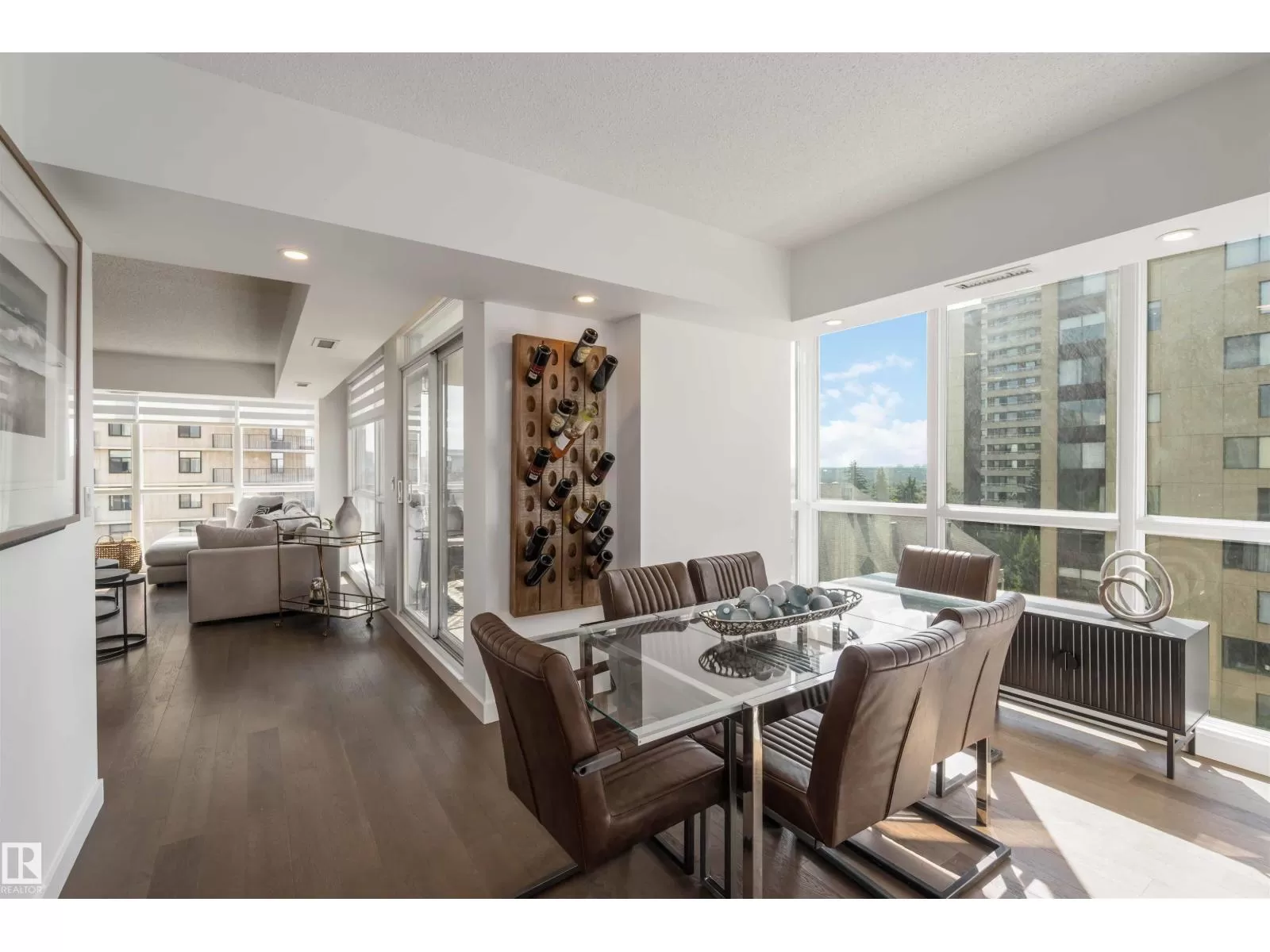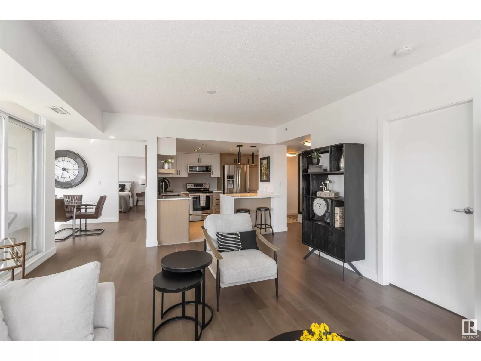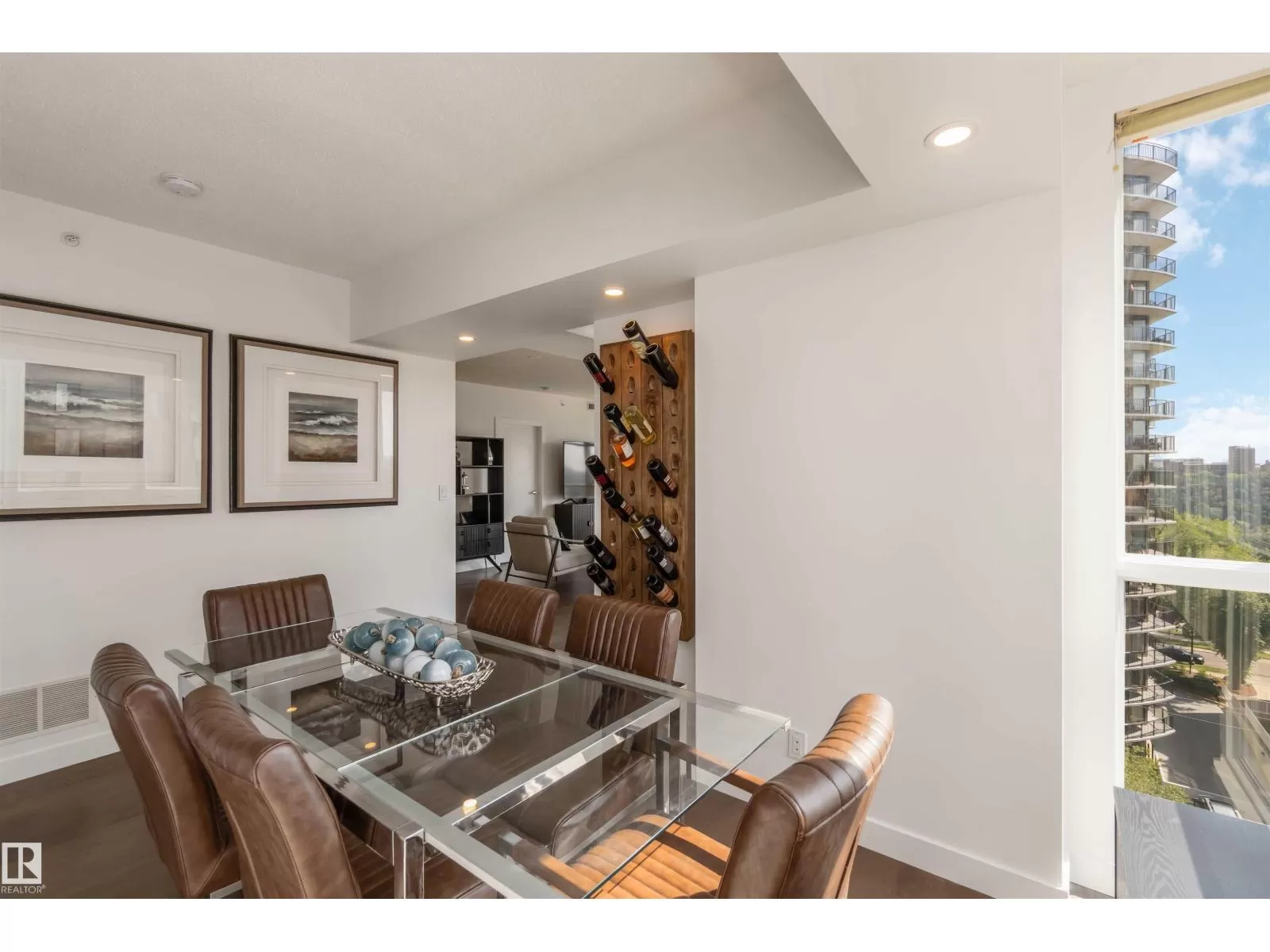 TOTALLY UPGRADED! CONCRETE BUILDING! RIVER VALLEY VIEW! WELCOME TO ONE OF DOWNTOWN EDMONTON'S BEST; 802, 10046 117 STREET. THIS 8TH FLOOR UPTOWN ESTATES UNIT HAS ALMOST 1100 SQ FT OF LIVING SPACE, 2 BEDROOMS, 2 BATHS, AND TITLED PARKING. THE UPGRADED CUSTOM KITCHEN HAS A BREATHTAKING WATERFALL STYLE ISLAND WITH QUARTZ COUNTERTOPS, SOFT-CLOSE 2 TONED CABINETRY WITH BLACK-PEARL HARDWARE, NEW APPLIANCES, TILE FLOORS, AND NEW BACKSPLASH. UNIT HAS UPGRADED PARK-LIGHTING THROUGHOUT AND ELECTRIC BLINDS. LIVING AREA HAS ENGINEERED FLOORS. DINING AREA HAS EXTERIOR DECK ACCESS. PRIMARY BEDROOM IS MASSIVE WITH A LARGE WALK-IN CLOSET AND BARN DOOR ENSUITE ACCESS. ENSUITE OFFERS AN OVAL STAND-ALONE TUB, DOUBLE SINKS, AND A GLASS SHOWER. SECONDARY BEDROOM IS SPACIOUS WITH DOUBLE CLOSETS. UNIT ALSO HAS A FLEX AREA/STUDY, LAUNDRY, MAIN BATH WITH SHOWER, AND CENTRAL AIR CONDITIONING. BUILDING HAS A SHARED GYM, SOCIAL ROOM, AND SECURED UNDERGROUND PARKING. LOCATED STEPS FROM THE RIVER. (id:27476)