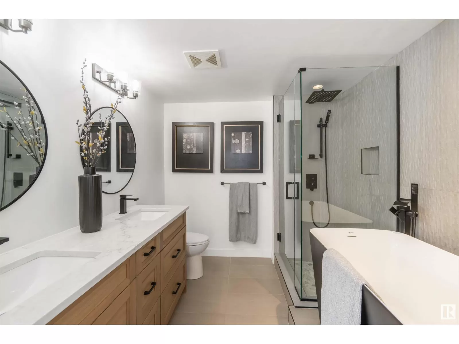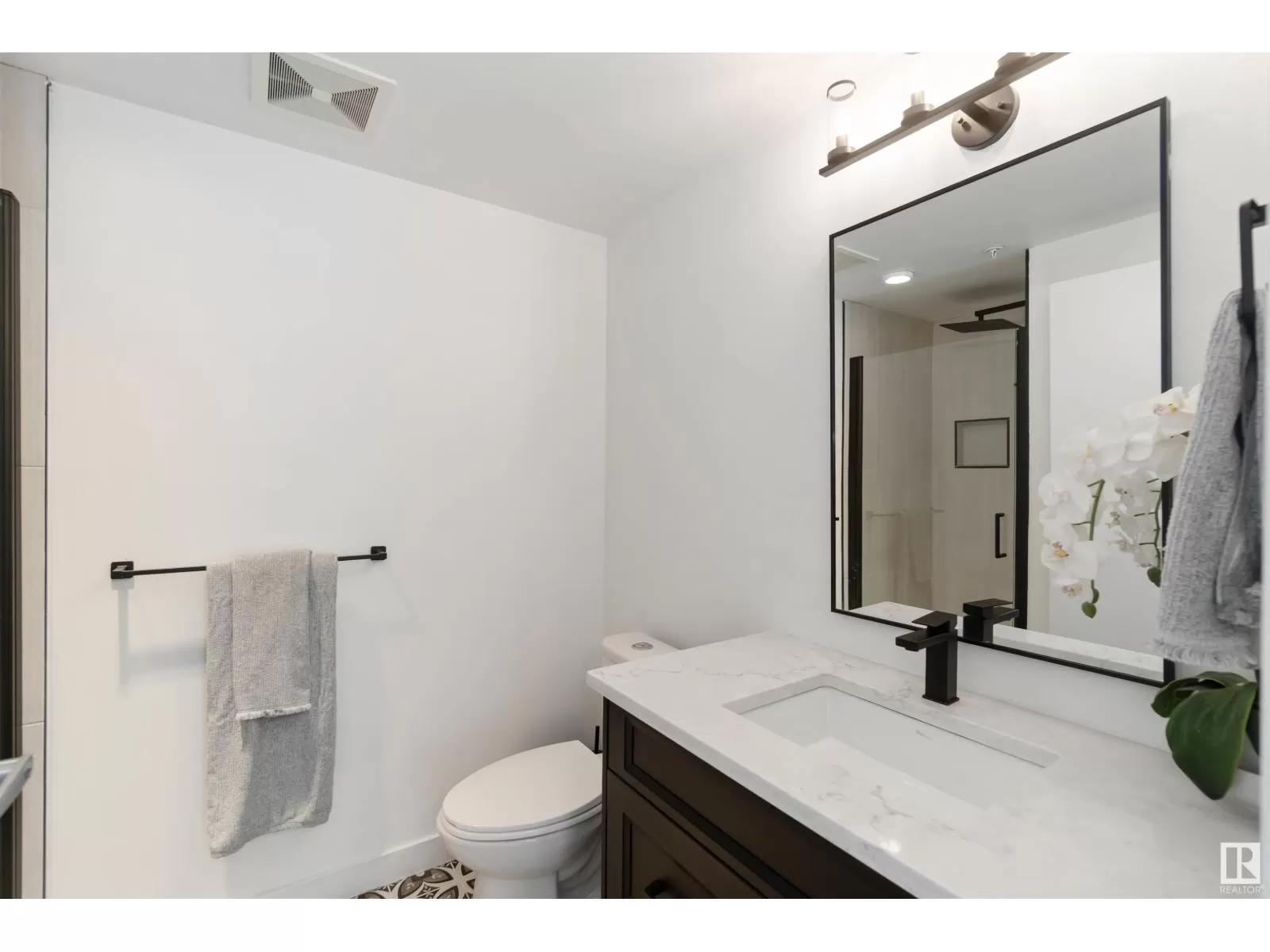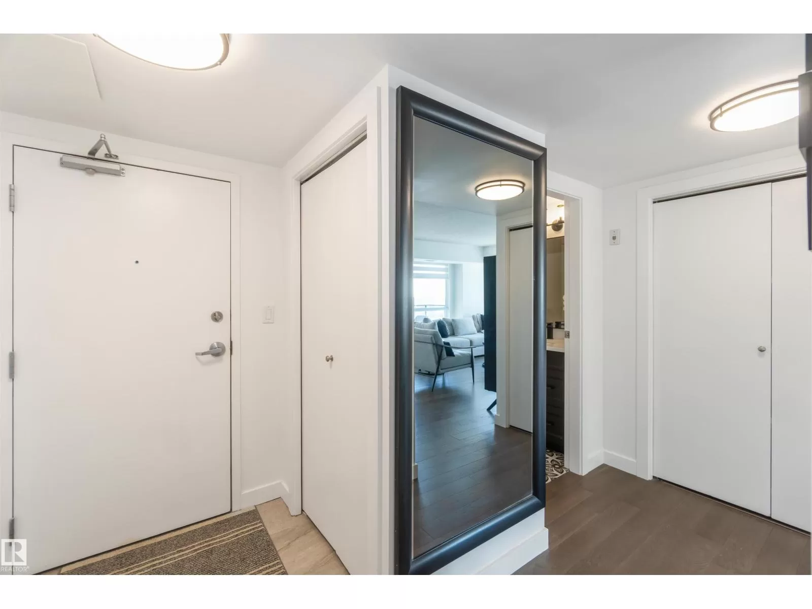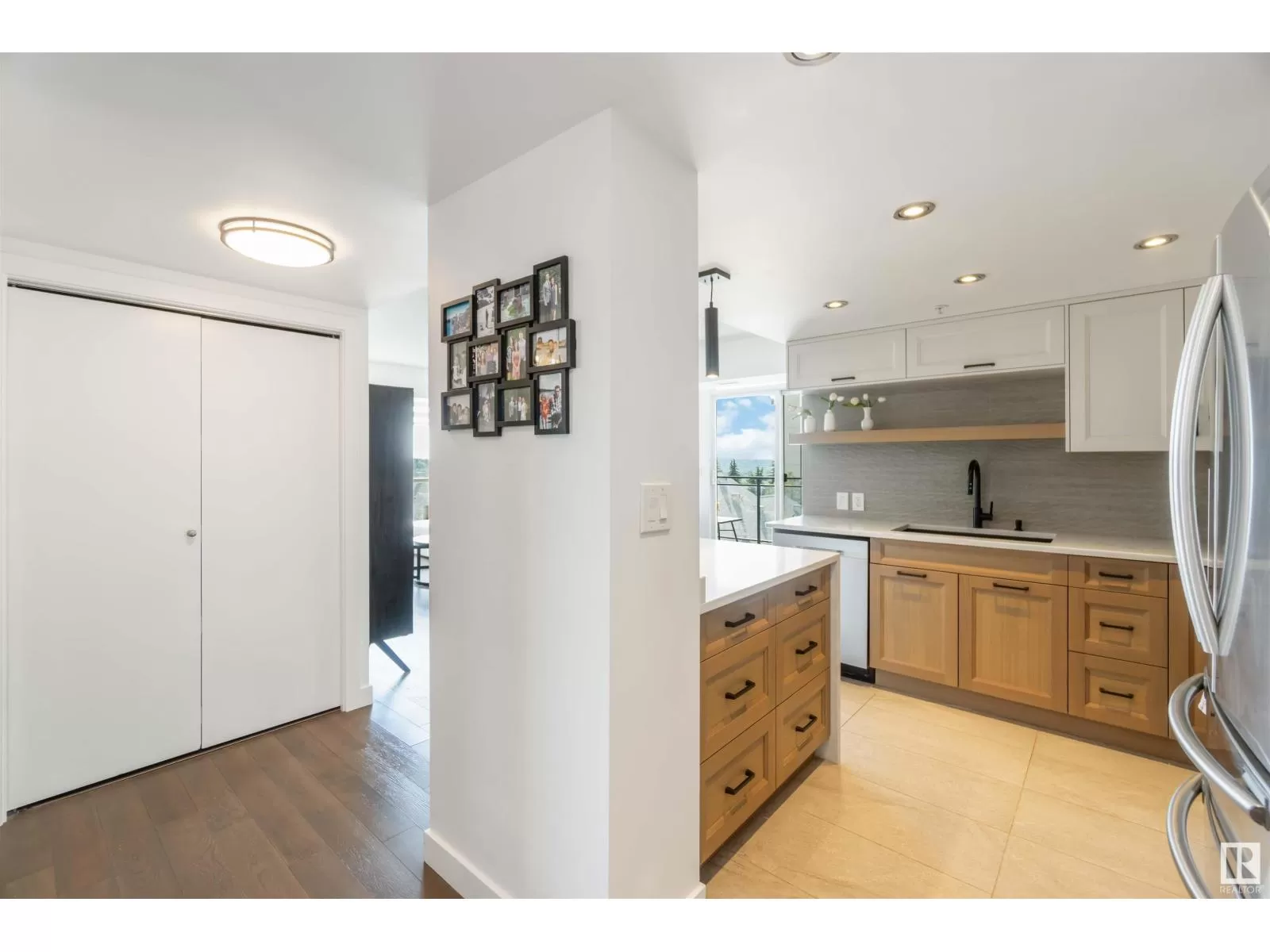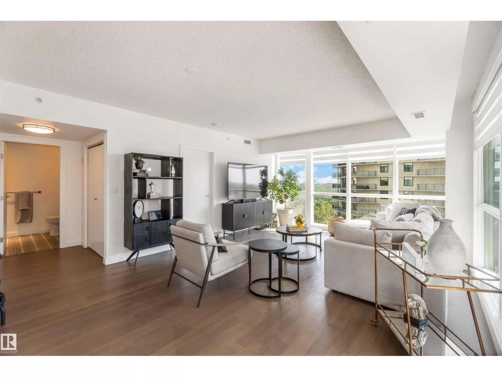 TOTALLY UPGRADED! CONCRETE BUILDING! RIVER VALLEY VIEW! WELCOME TO ONE OF DOWNTOWN EDMONTON'S BEST; 802, 10046 117 STREET. THIS 8TH FLOOR UPTOWN ESTATES UNIT HAS ALMOST 1100 SQ FT OF LIVING SPACE, 2 BEDROOMS, 2 BATHS, AND TITLED PARKING. THE UPGRADED CUSTOM KITCHEN HAS A BREATHTAKING WATERFALL STYLE ISLAND WITH QUARTZ COUNTERTOPS, SOFT-CLOSE 2 TONED CABINETRY WITH BLACK-PEARL HARDWARE, NEW APPLIANCES, TILE FLOORS, AND NEW BACKSPLASH. UNIT HAS UPGRADED PARK-LIGHTING THROUGHOUT AND ELECTRIC BLINDS. LIVING AREA HAS ENGINEERED FLOORS. DINING AREA HAS EXTERIOR DECK ACCESS. PRIMARY BEDROOM IS MASSIVE WITH A LARGE WALK-IN CLOSET AND BARN DOOR ENSUITE ACCESS. ENSUITE OFFERS AN OVAL STAND-ALONE TUB, DOUBLE SINKS, AND A GLASS SHOWER. SECONDARY BEDROOM IS SPACIOUS WITH DOUBLE CLOSETS. UNIT ALSO HAS A FLEX AREA/STUDY, LAUNDRY, MAIN BATH WITH SHOWER, AND CENTRAL AIR CONDITIONING. BUILDING HAS A SHARED GYM, SOCIAL ROOM, AND SECURED UNDERGROUND PARKING. LOCATED STEPS FROM THE RIVER. (id:27476)