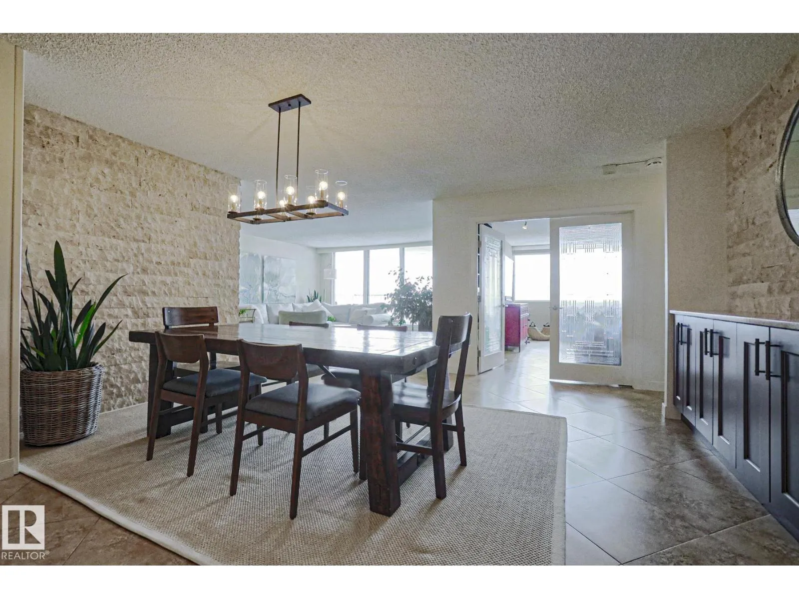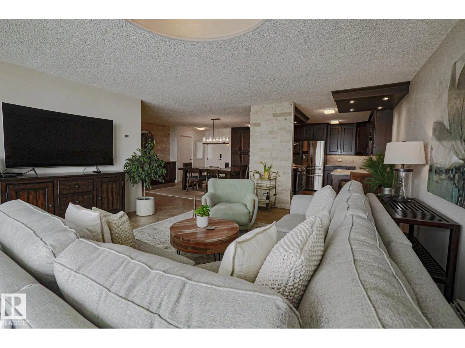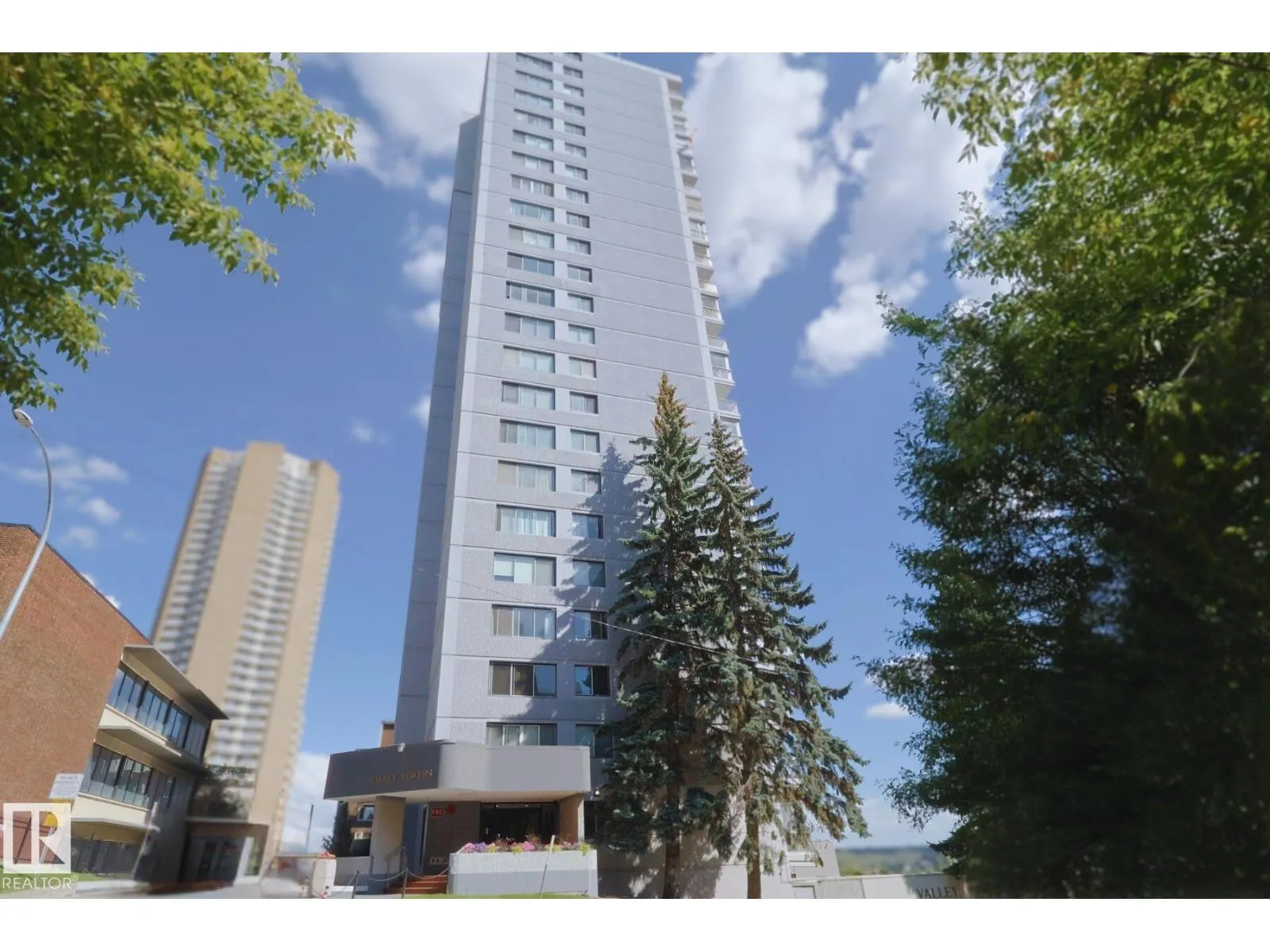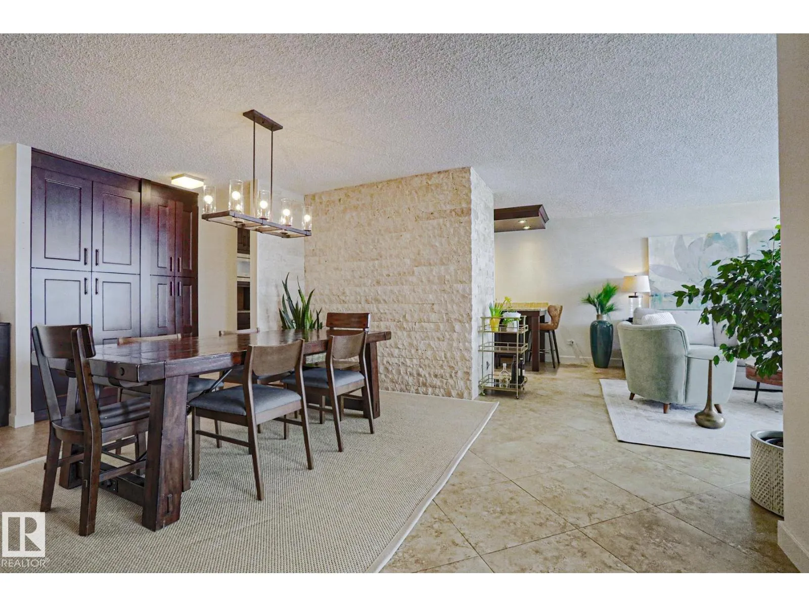 Gorgeous fully renovated condo in the prestigious Valley Towers. With over 1,300 sq ft this 2 bedroom, 2 full bath condo boasts both luxury and functionality. The open dining area features two stone feature walls and flows into the spacious living room with TWO south-facing balconies offering gorgeous RIVER VALLEY VIEWS. The primary bedroom includes double closets and a full ensuite with a separate vanity area. The second bedroom/den has French doors and built-in shelving. Italian porcelain tile flows throughout, including both balconies. Valley Towers offers only 3 units per floor and unmatched amenities: indoor pool, sauna, steam room, gym, social and hobby rooms, private gardens, gated visitor parking, and titled heated U/G parking with storage. Condo fees cover all amenities and ALL UTILITIES including TV. WALK to LRT, Rogers Place, and more! This home shows 10/10 with NEW PAINT THROUGHOUT! (id:27476)