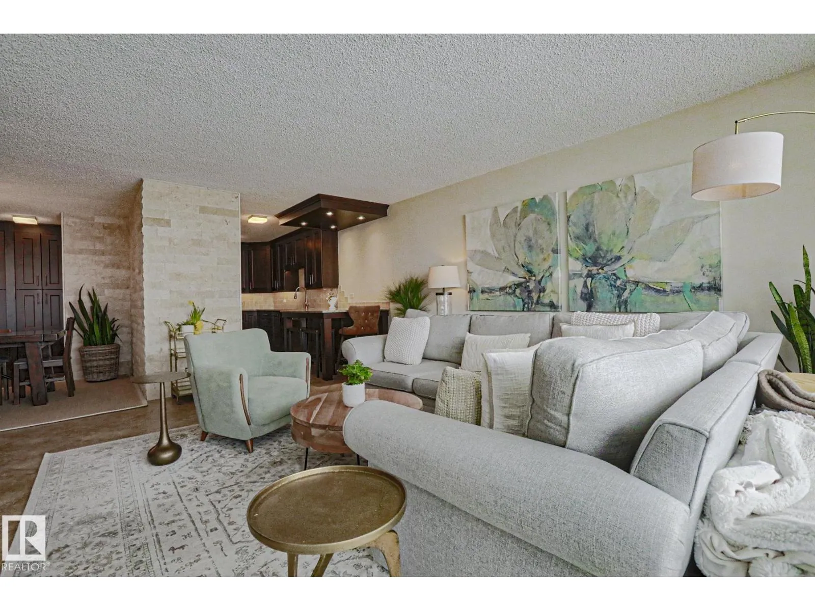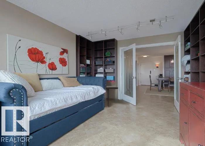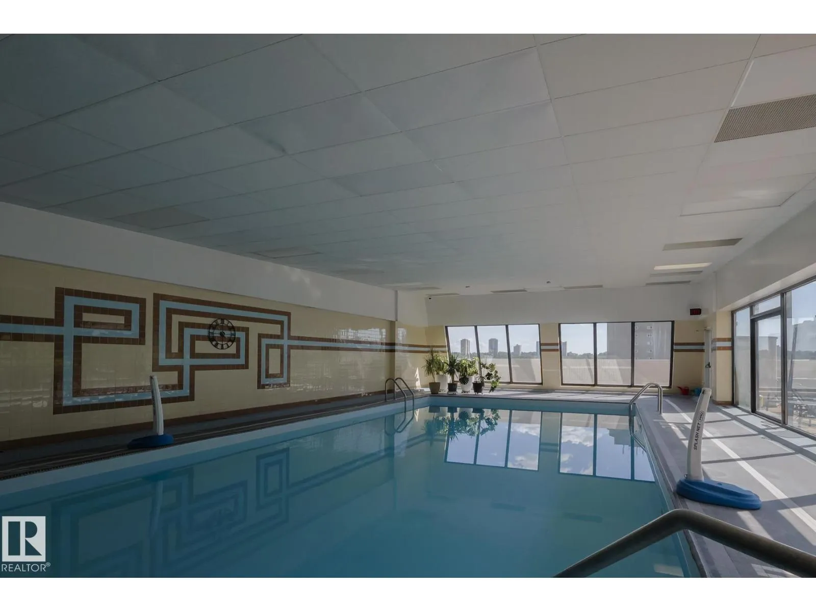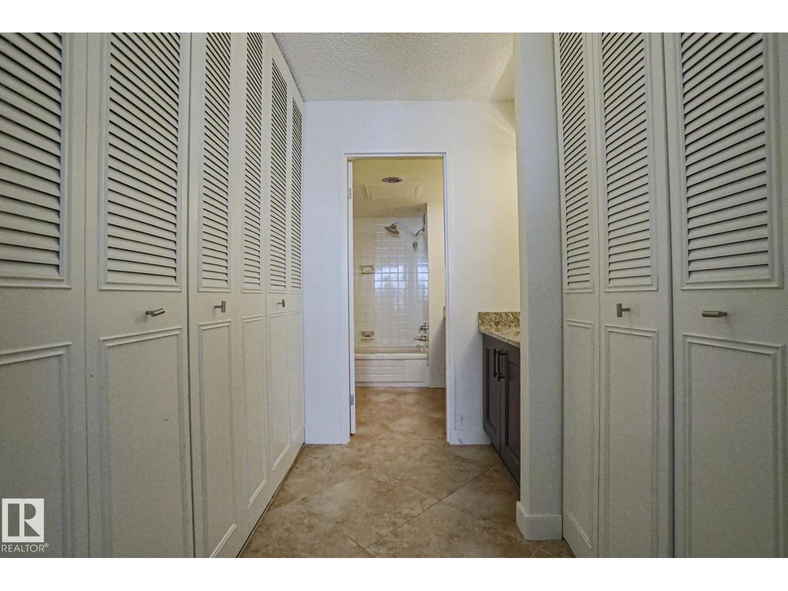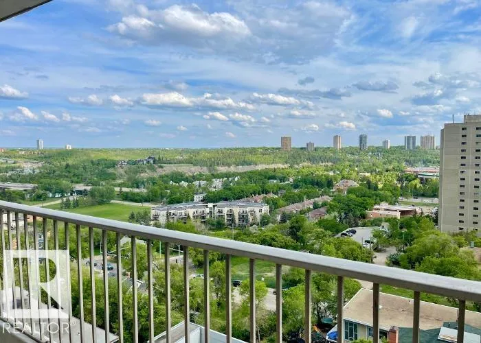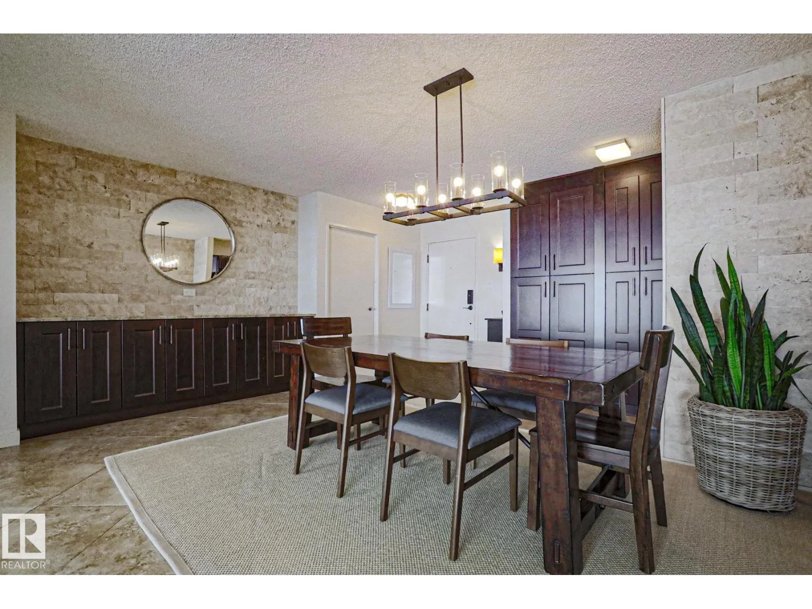 Gorgeous fully renovated condo in the prestigious Valley Towers. With over 1,300 sq ft this 2 bedroom, 2 full bath condo boasts both luxury and functionality. The open dining area features two stone feature walls and flows into the spacious living room with TWO south-facing balconies offering gorgeous RIVER VALLEY VIEWS. The primary bedroom includes double closets and a full ensuite with a separate vanity area. The second bedroom/den has French doors and built-in shelving. Italian porcelain tile flows throughout, including both balconies. Valley Towers offers only 3 units per floor and unmatched amenities: indoor pool, sauna, steam room, gym, social and hobby rooms, private gardens, gated visitor parking, and titled heated U/G parking with storage. Condo fees cover all amenities and ALL UTILITIES including TV. WALK to LRT, Rogers Place, and more! This home shows 10/10 with NEW PAINT THROUGHOUT! (id:27476)