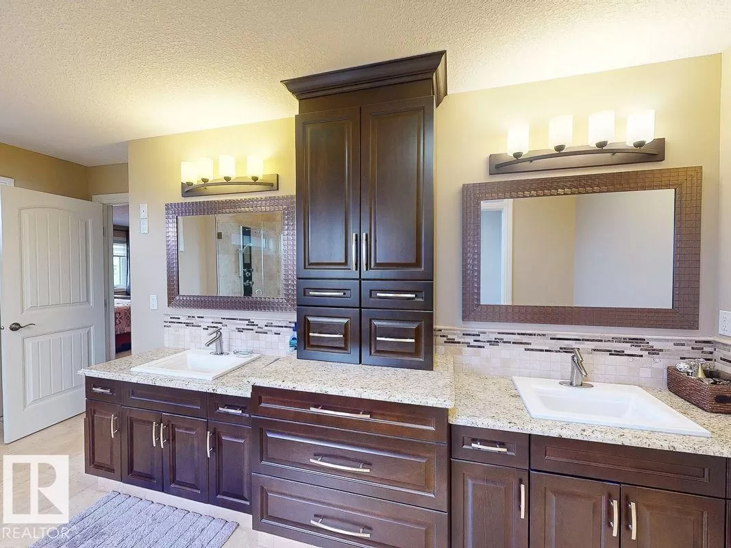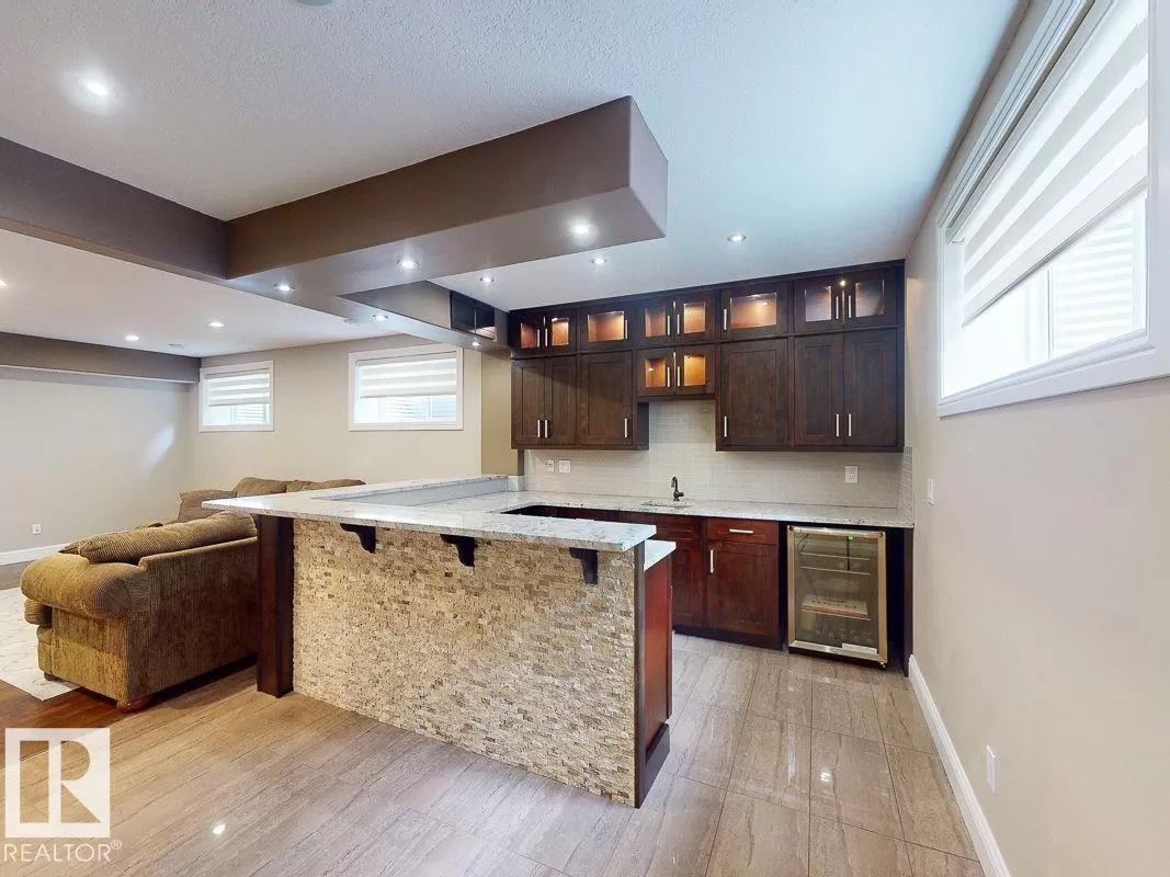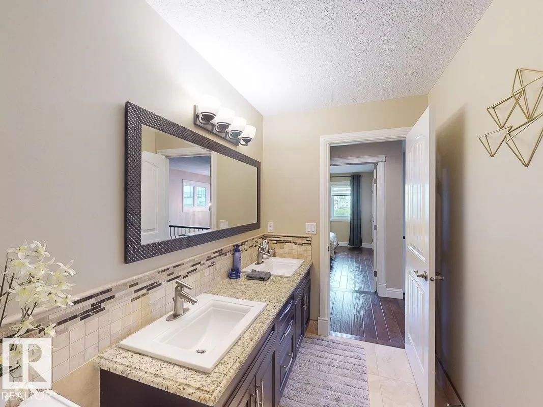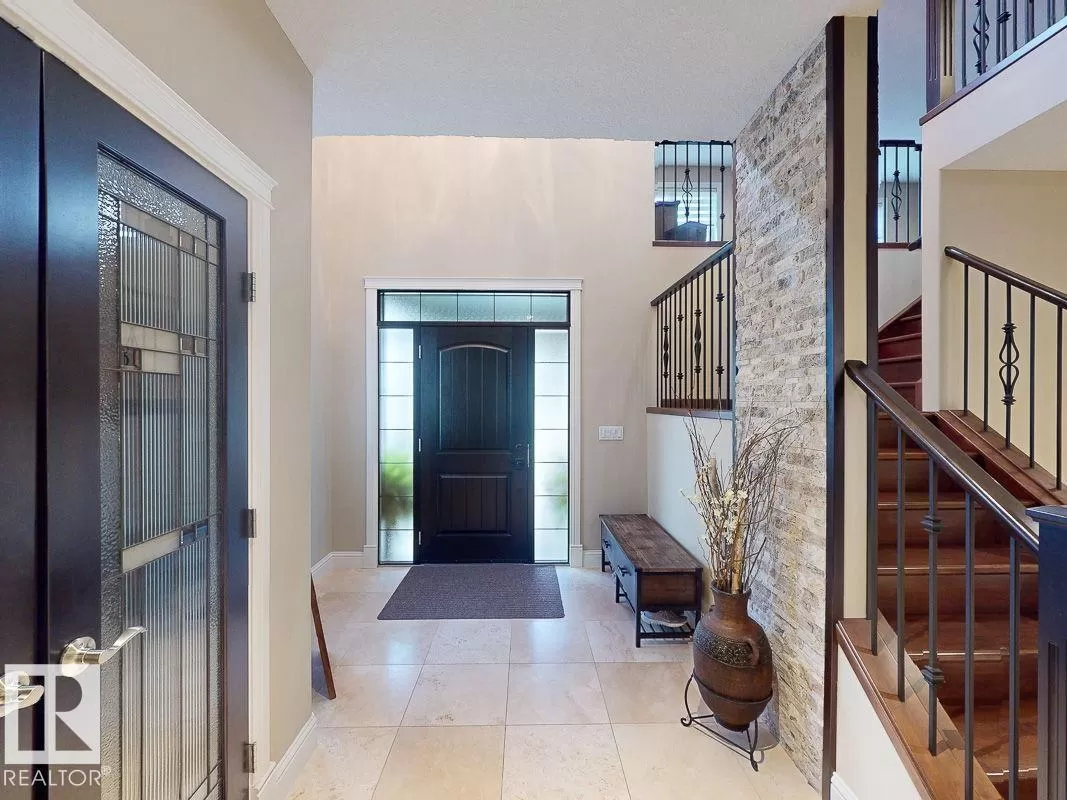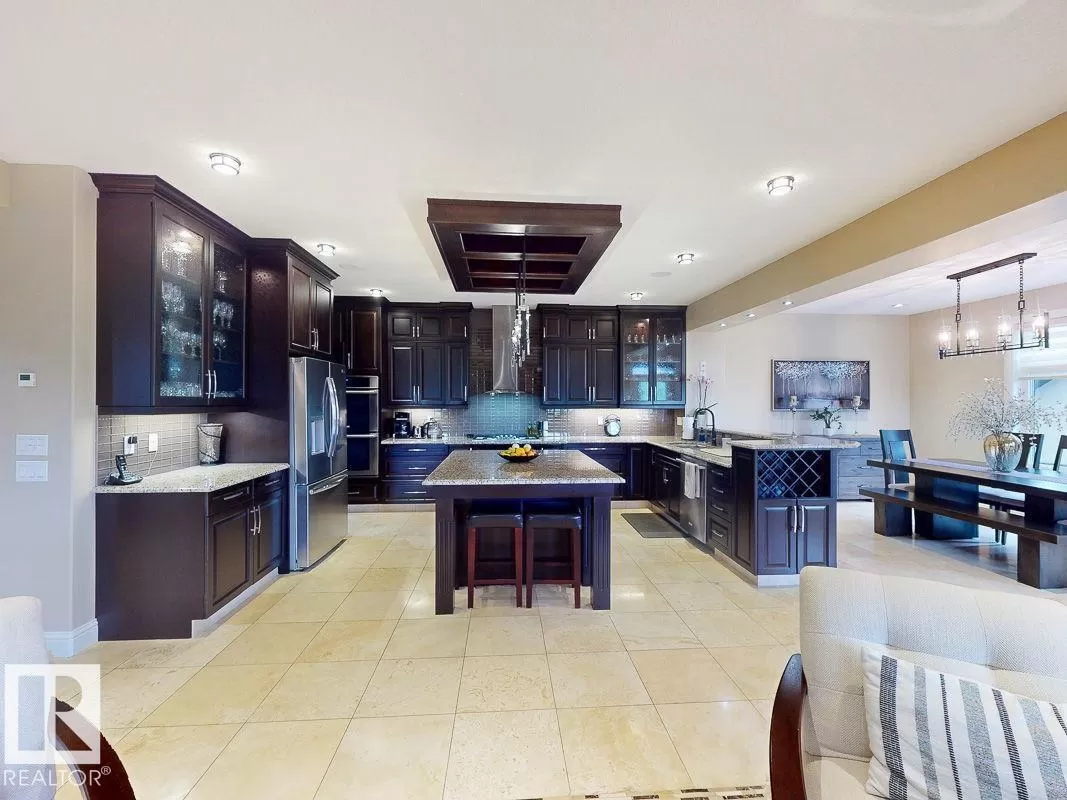 This exquisite home is a true showcase of luxury, craftsmanship, and thoughtful design. Privately situated across from a tranquil lake and surrounded by beautiful landscaping, it feels like a brand new home inside & out. The upper floor offers 3 spacious bedrooms + a bright bonus room. The primary suite is a private retreat with a spa-inspired 5 pc. ensuite featuring a jacuzzi tub, while the second bathroom upstairs is also a 5 pc. for extra comfort. A convenient 2nd floor laundry room adds everyday ease. Every tiled area and the fully finished basement enjoy the benefit of in-floor heating. The chefâs kitchen impresses with a massive island, granite countertops, double ovens, gas stove, and ceiling-height cabinetry, opening to the great room with elegant gas fireplace. Downstairs you will find a 4th bedroom, full wet bar, 4pc. bath, cold room & storage. Engineered hardwood, surround sound, A/C, a heated finished garage, covered deck, fruit trees, and a boiler system complete this one-of-a-kind property! (id:27476)
