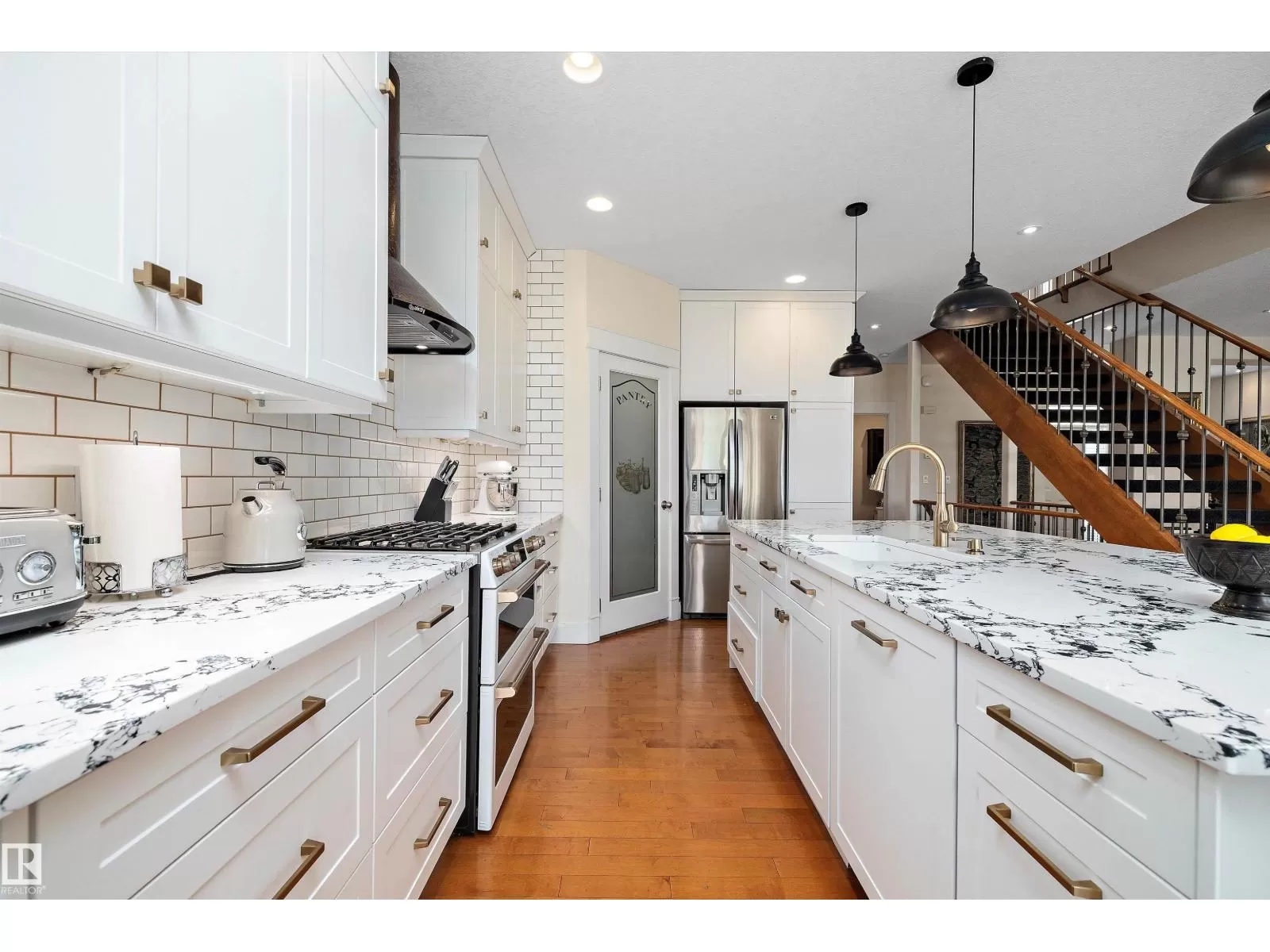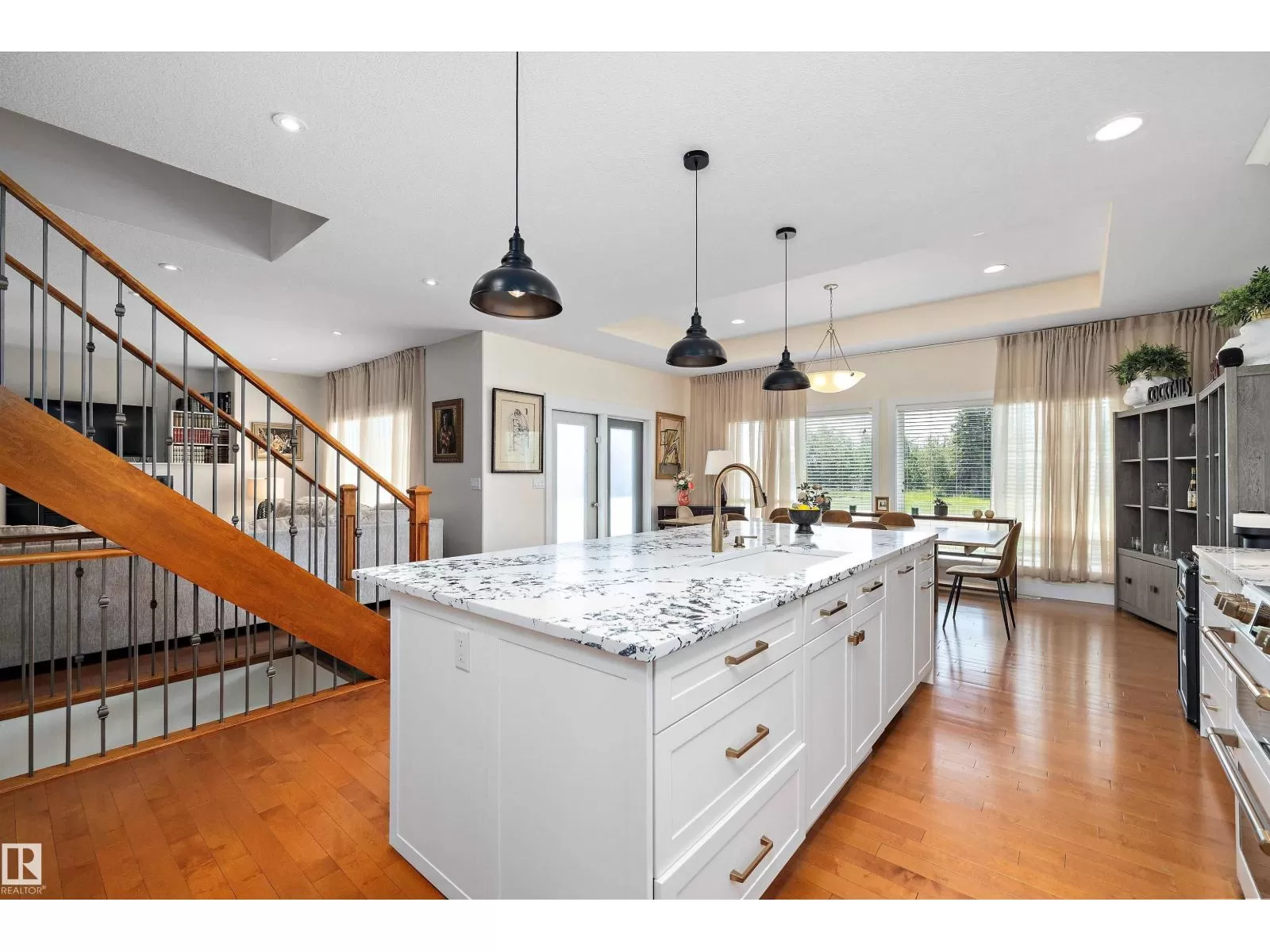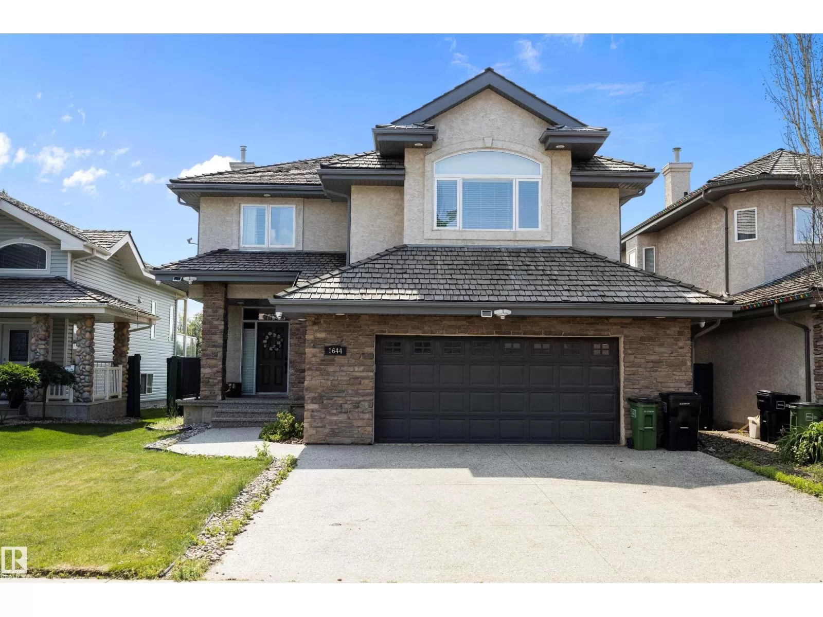 This executive 2-storey blends elegance with functional family living. Step inside to an open, spacious layout with green space views with no neighbour behind. The warm, inviting living room features a fireplace and an open staircase to the upper level. The main floor showcases a new chefâs kitchen with white cabinetry, granite countertops, a new dishwasher and stove, stainless steel appliances, and an oversized island perfect for entertaining. A walk-through pantry leads to the beautifully renovated laundry with a new washer and dryer, then to the oversized heated garage. Upstairs offers 4 bedrooms, including the primary suite with a 5-piece ensuite. The finished basement adds 2 more bedrooms, a full bath, a recreation room, and a mini-suite with fridge, sink, and extra cabinetry ideal for guests. New carpets throughout. Incredible backyard for gatherings. Close to shopping, schools, parks, transit, and Anthony Henday. (id:27476)