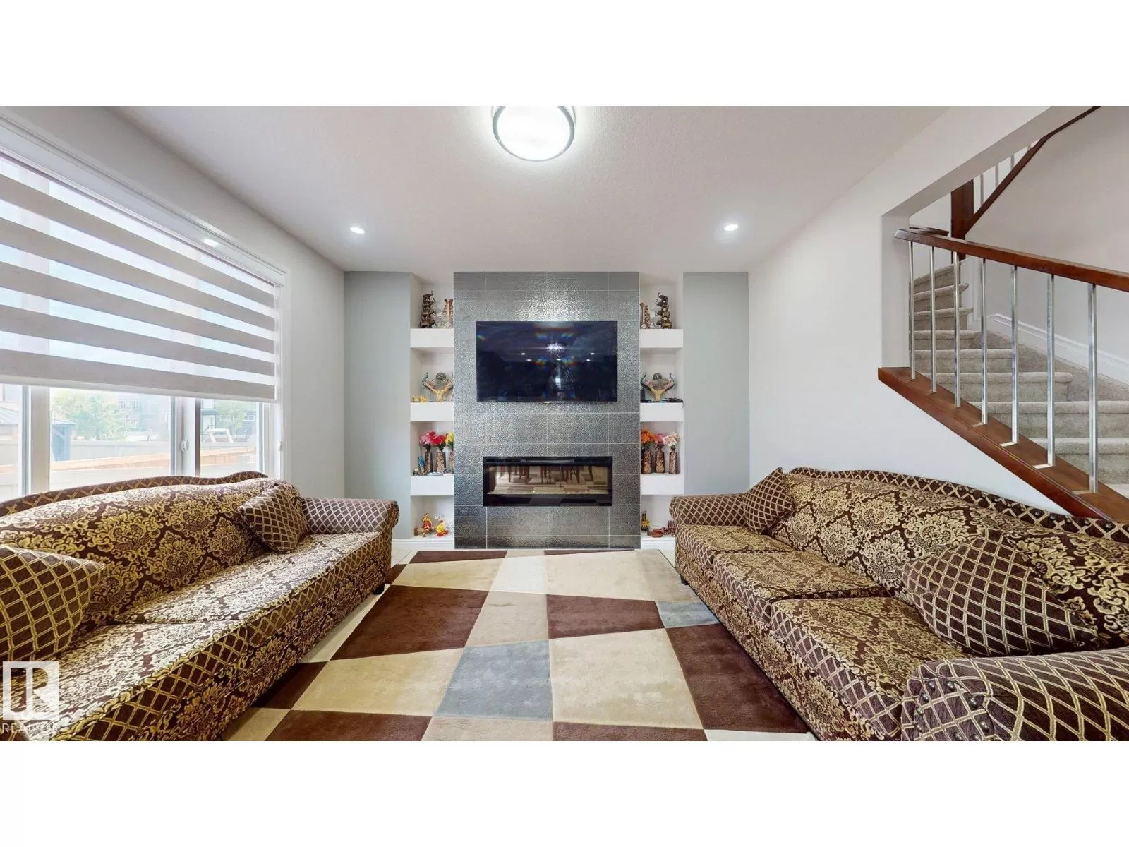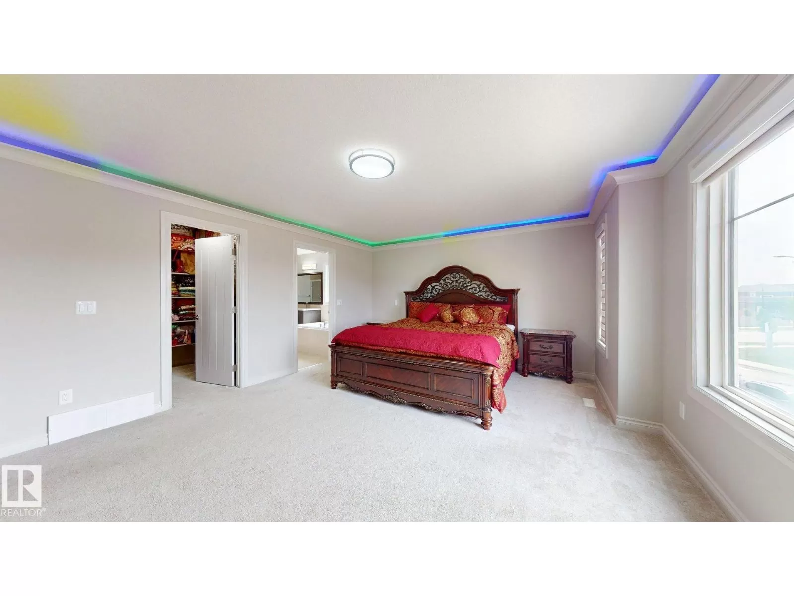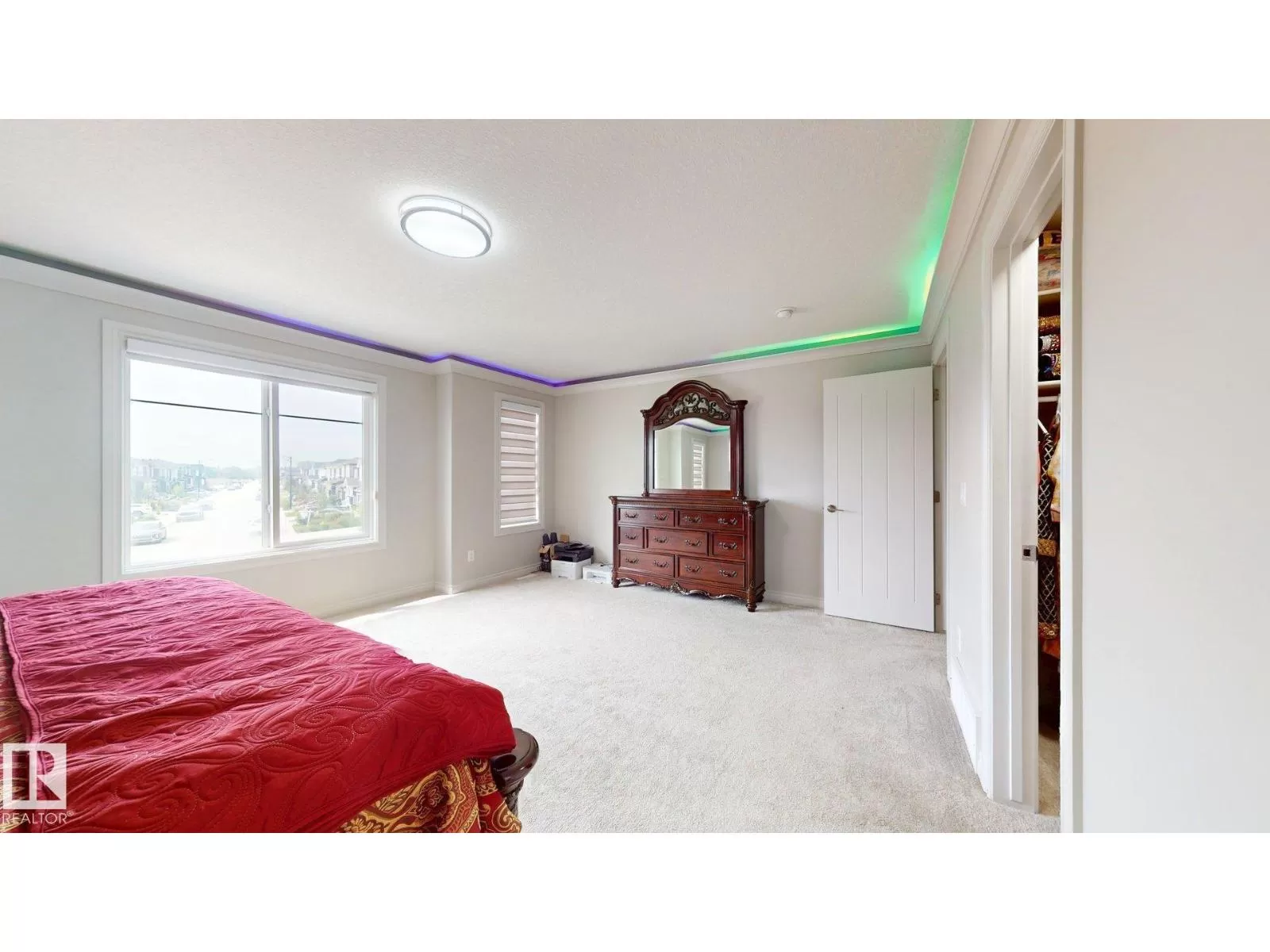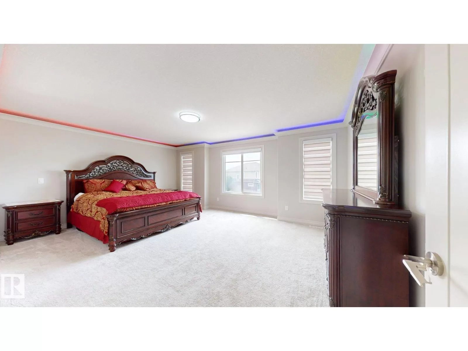 This beautiful double-attached garage home is located in a highly desirable Edmonton neighborhood, offering easy access to amenities and major roadways like 91 Street, Ellerslie Road, and Anthony Henday. The main floor boasts a spacious living room with open-to-above ceilings, a cozy family room with an electric fireplace, a BEDROOM ON MAIN with a full 3-piece bath for elderly family members, and a chefâs kitchen with an oversized island, spice kitchen with gas stove, and built-in pantry. The dining area leads to a deck for entertaining. Upstairs, you'll find a bonus room, three bedrooms, two full bathrooms, and a laundry room. The master bedroom features coffered ceilings, a walk-in closet, and a luxurious 5-piece ensuite with a jacuzzi tub. Large windows throughout the house make it bright and spacious, with every corner architecturally utilized. The BASEMENT WITH SEPARATE ENTRANCE and 9' ceilings. This home truly adds comfort to convenience. (id:27476)